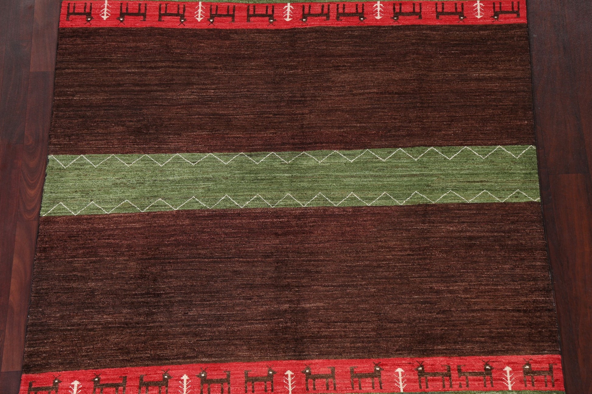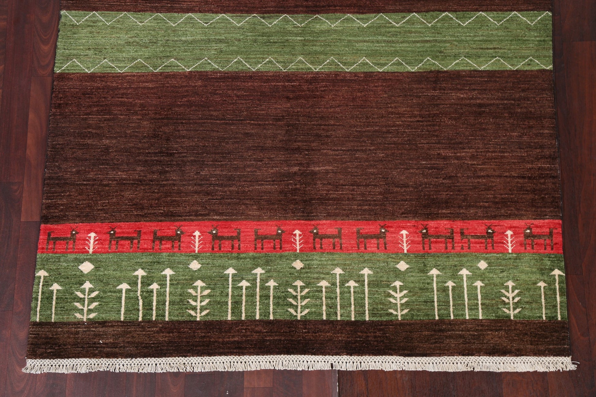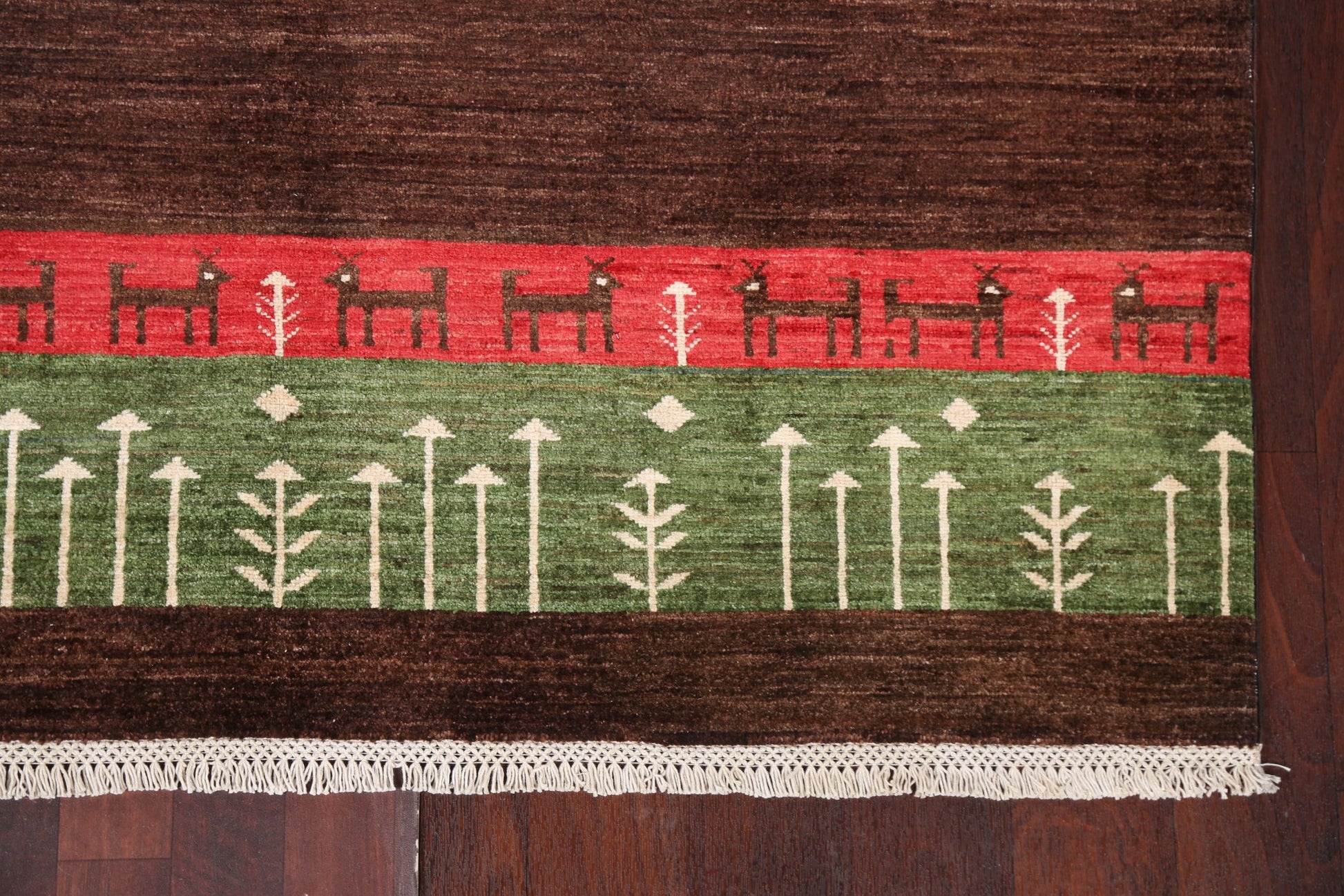 A Beautiful Genuine Persia ( Persia ) Gabbeh rug is Hand Knotted by skillful weavers in Persia ( Persia ) with 100% Wool Material. This rug is in New, First Quality condition. dimensions are 6' 7'' X 5' 0'' in foot and 201 X 152 in centimeter. the primary color is Brown.