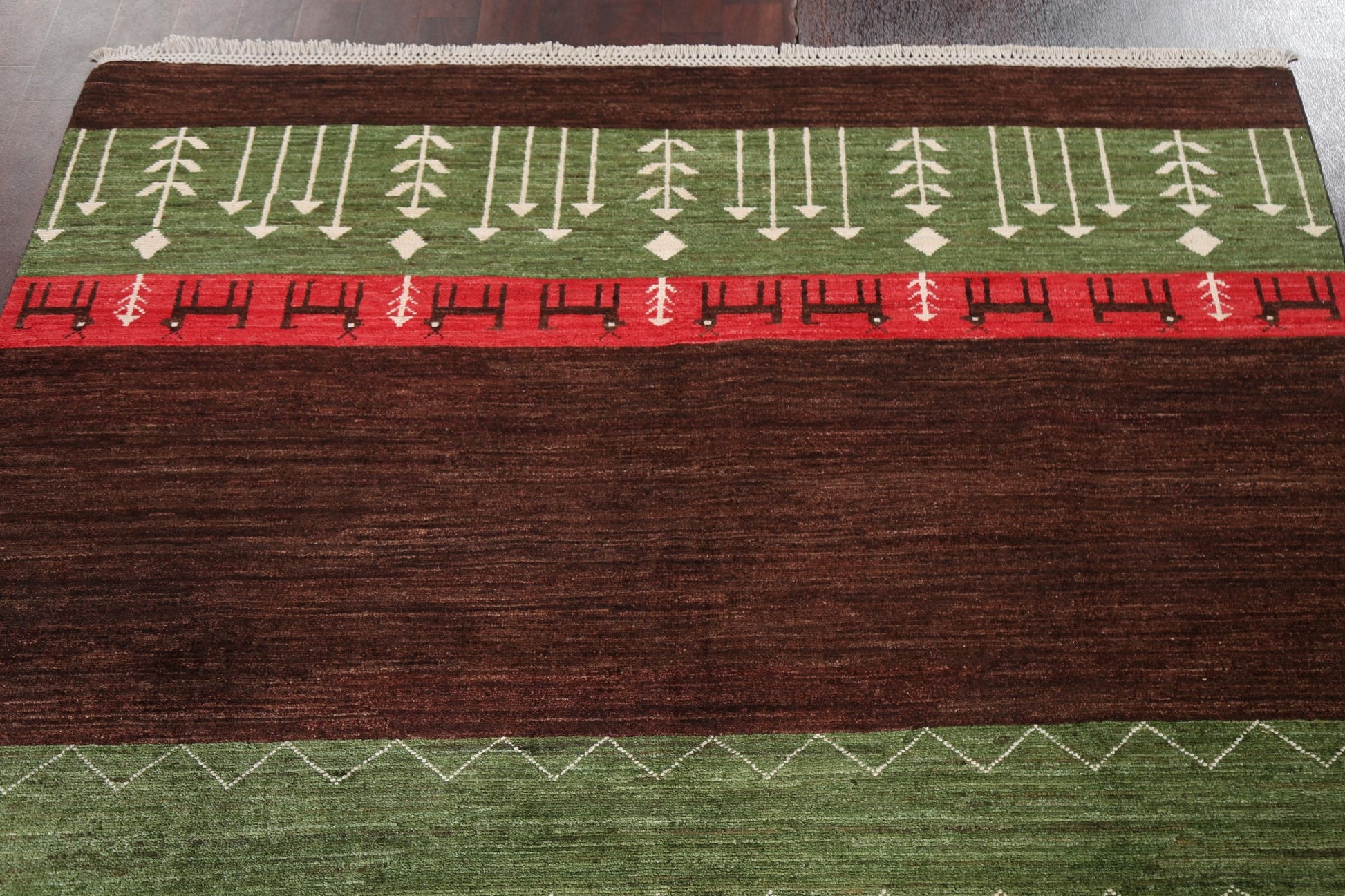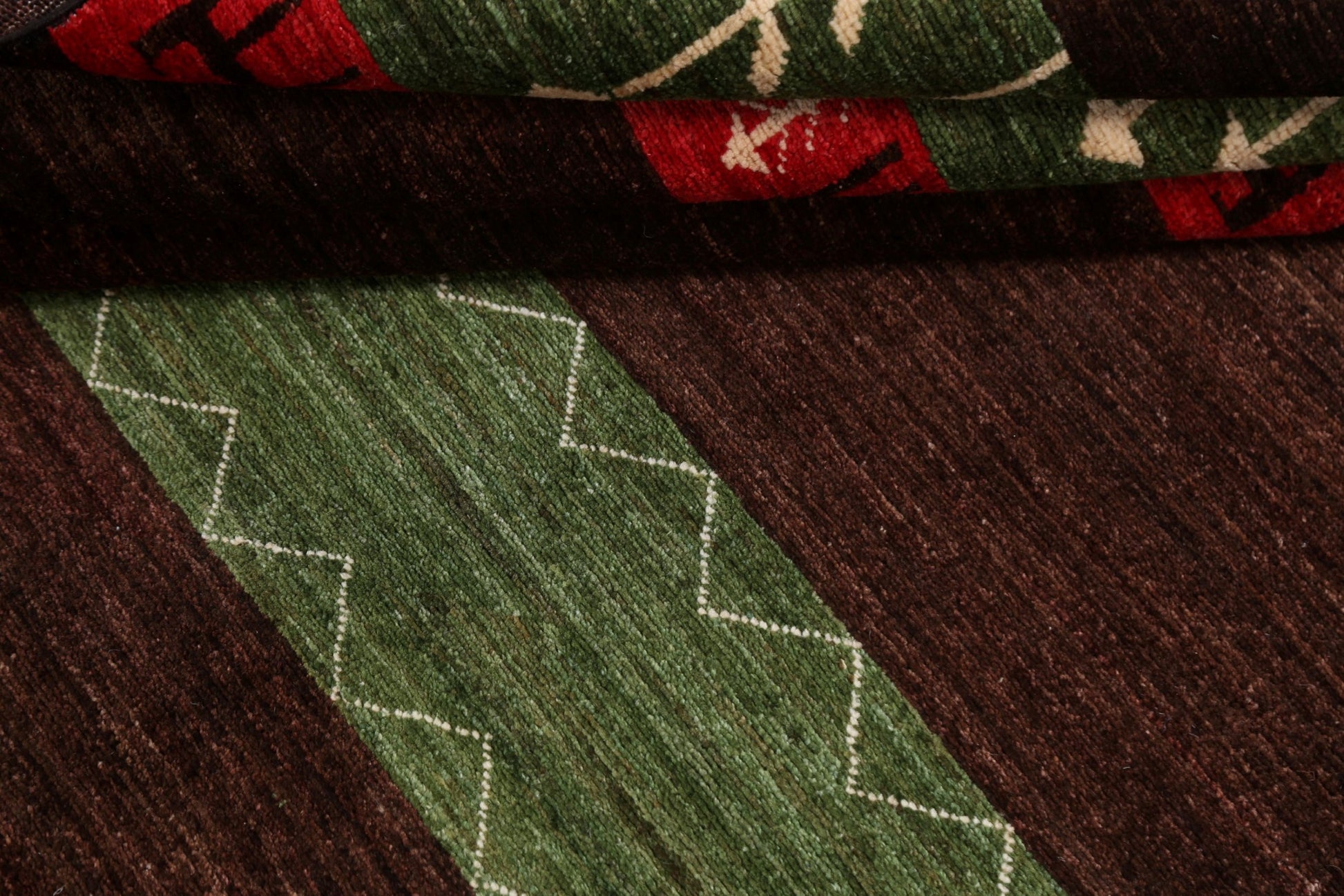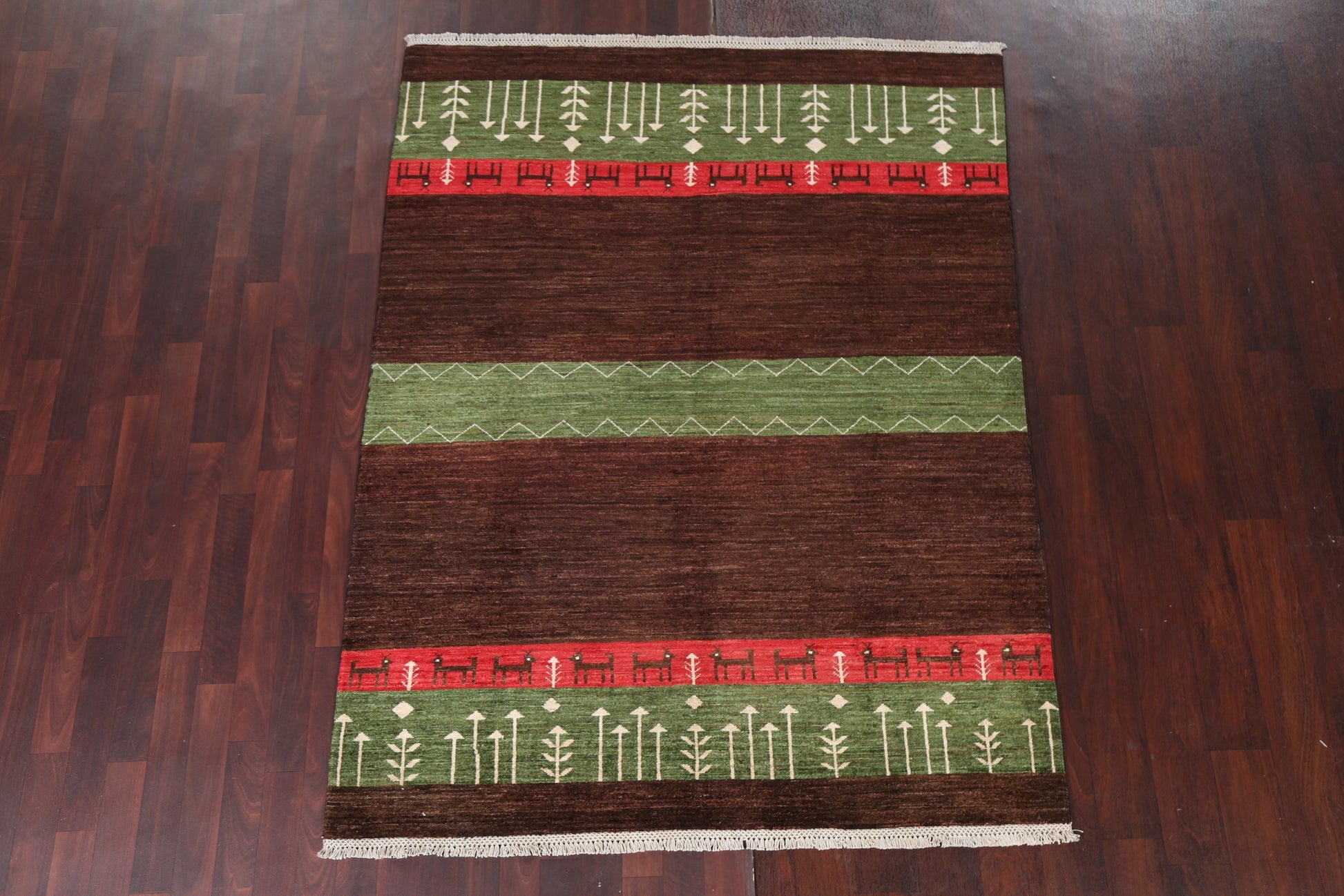 A Beautiful Genuine Persia ( Persia ) Gabbeh rug is Hand Knotted by skillful weavers in Persia ( Persia ) with 100% Wool Material. This rug is in New, First Quality condition. dimensions are 6' 7'' X 5' 0'' in foot and 201 X 152 in centimeter. the primary color is Brown.