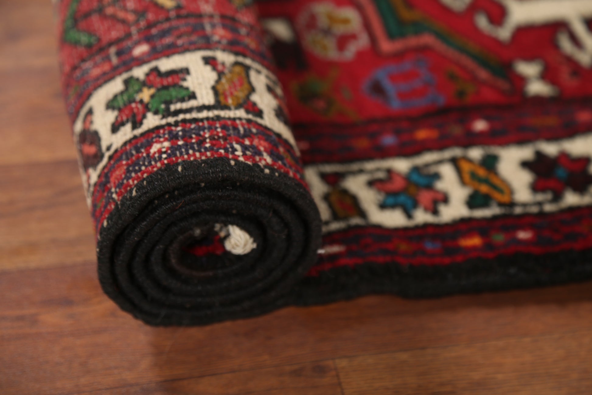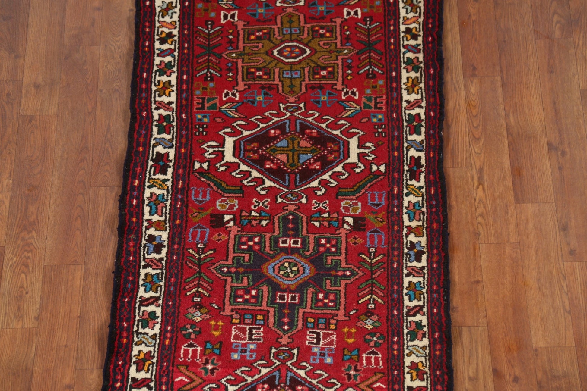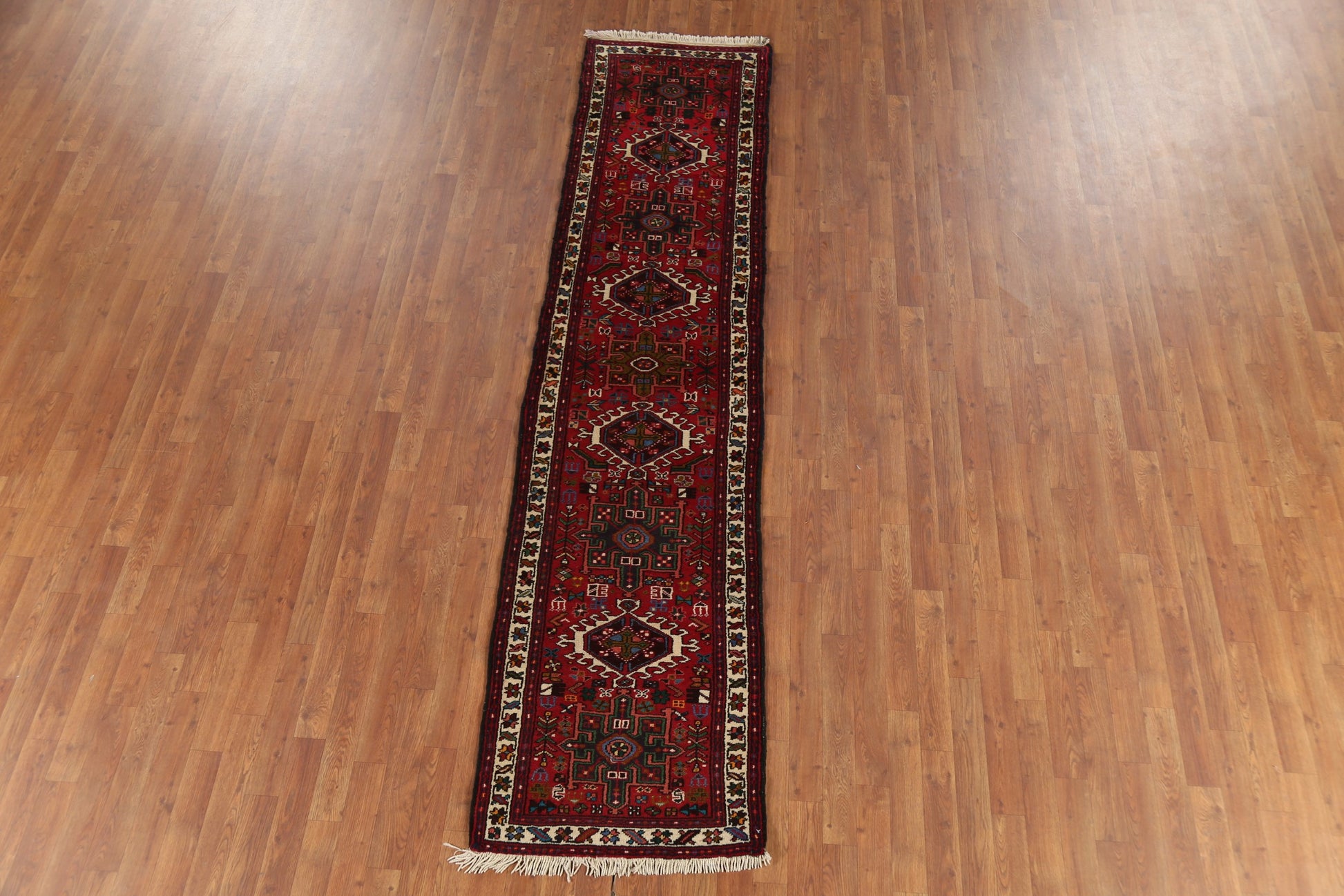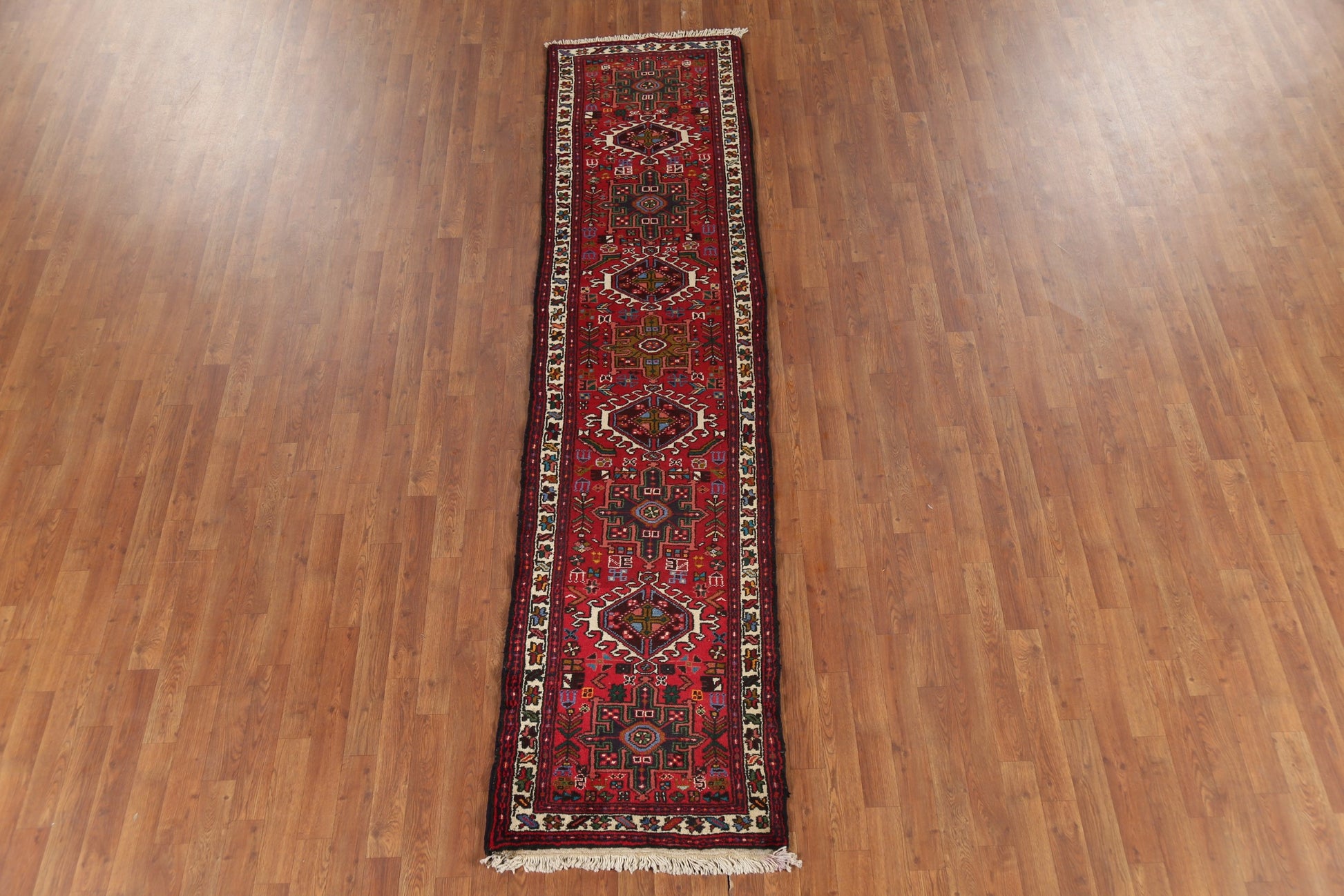 A Beautiful Genuine Persia ( Persia ) Gharajeh rug is Hand Knotted by skillful weavers in Persia ( Persia ) with 100% Wool Material. This rug is in New, First Quality condition. dimensions are 9' 10'' X 2' 4'' in foot and 300 X 71 in centimeter. the primary color is Red.
