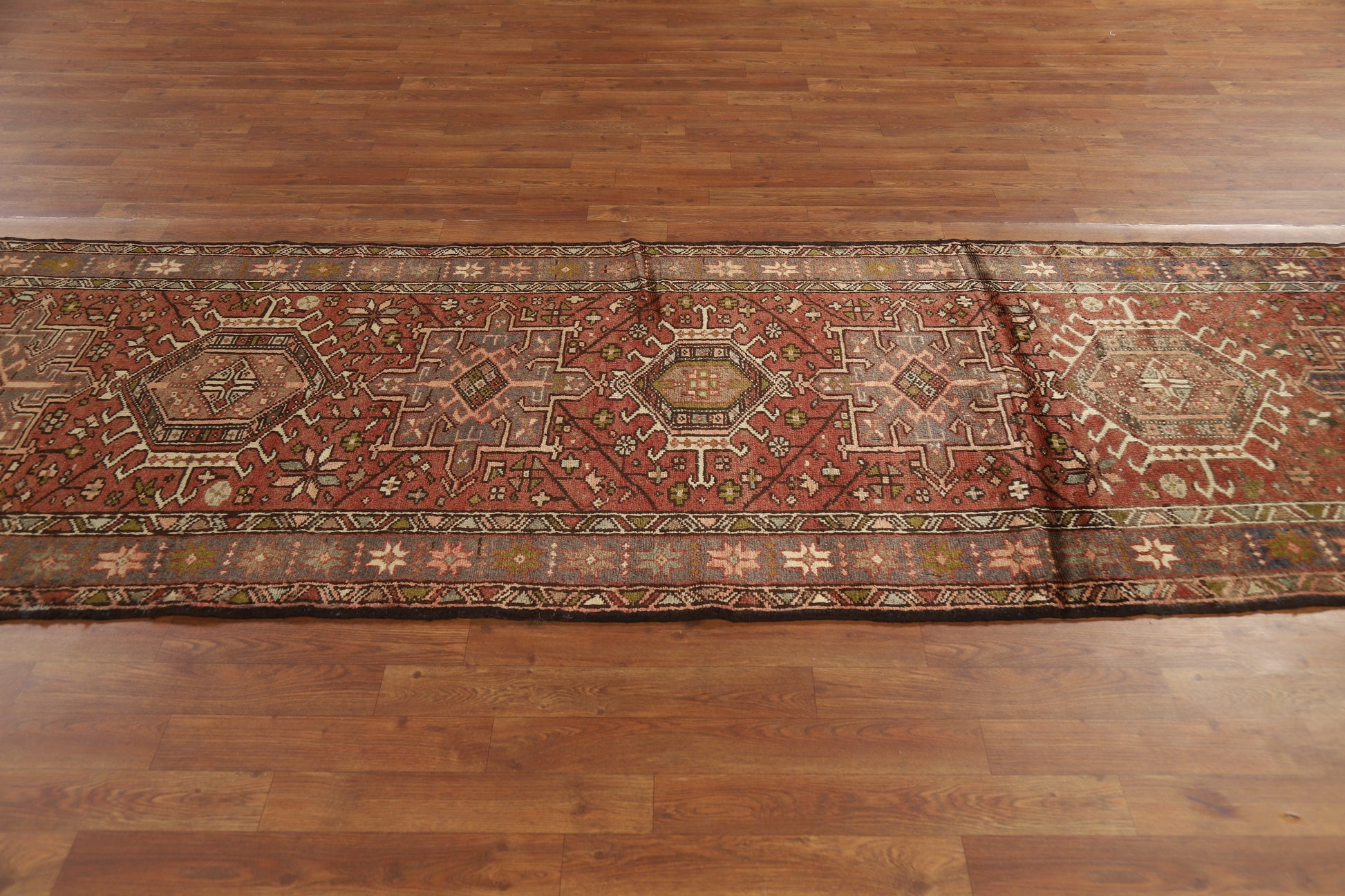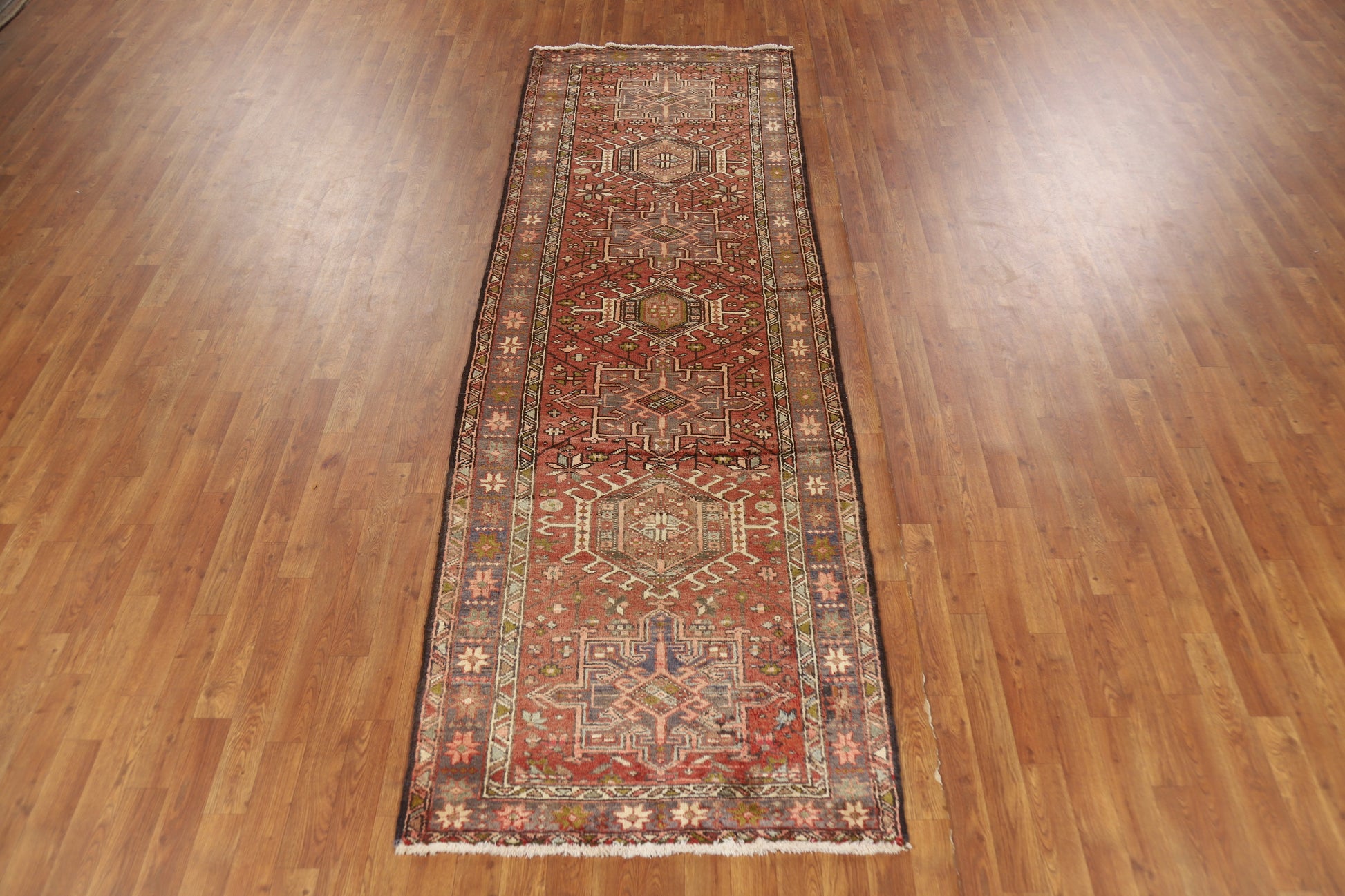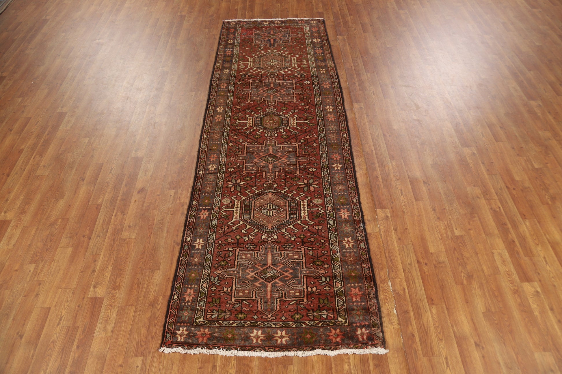 A Beautiful Genuine Persia ( Persia ) Gharajeh rug is Hand Knotted by skillful weavers in Persia ( Persia ) with 100% Wool Material. This rug is in Very Good condition. dimensions are 10' 3'' X 3' 3'' in foot and 312 X 99 in centimeter. the primary color is Oranges & Rust.