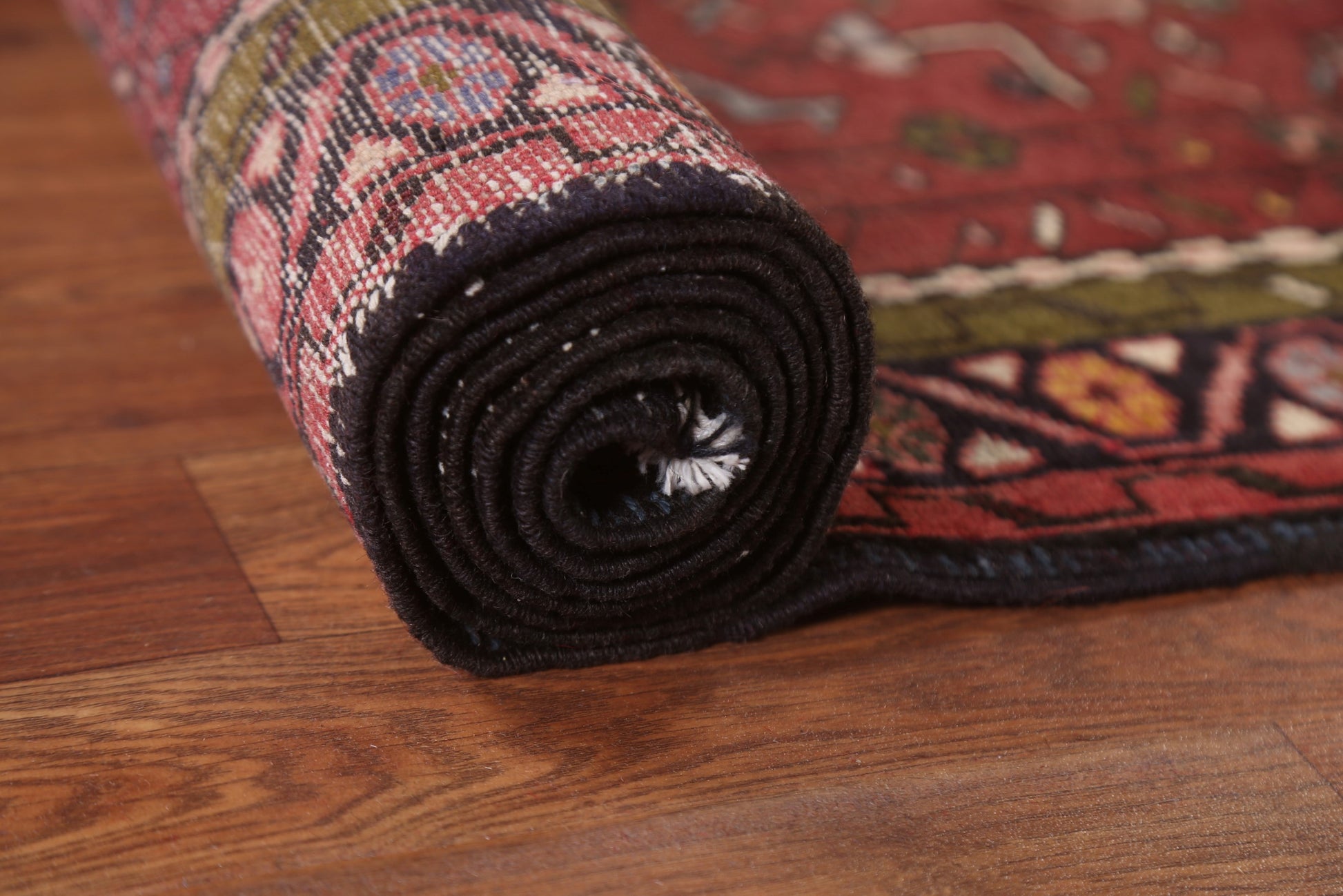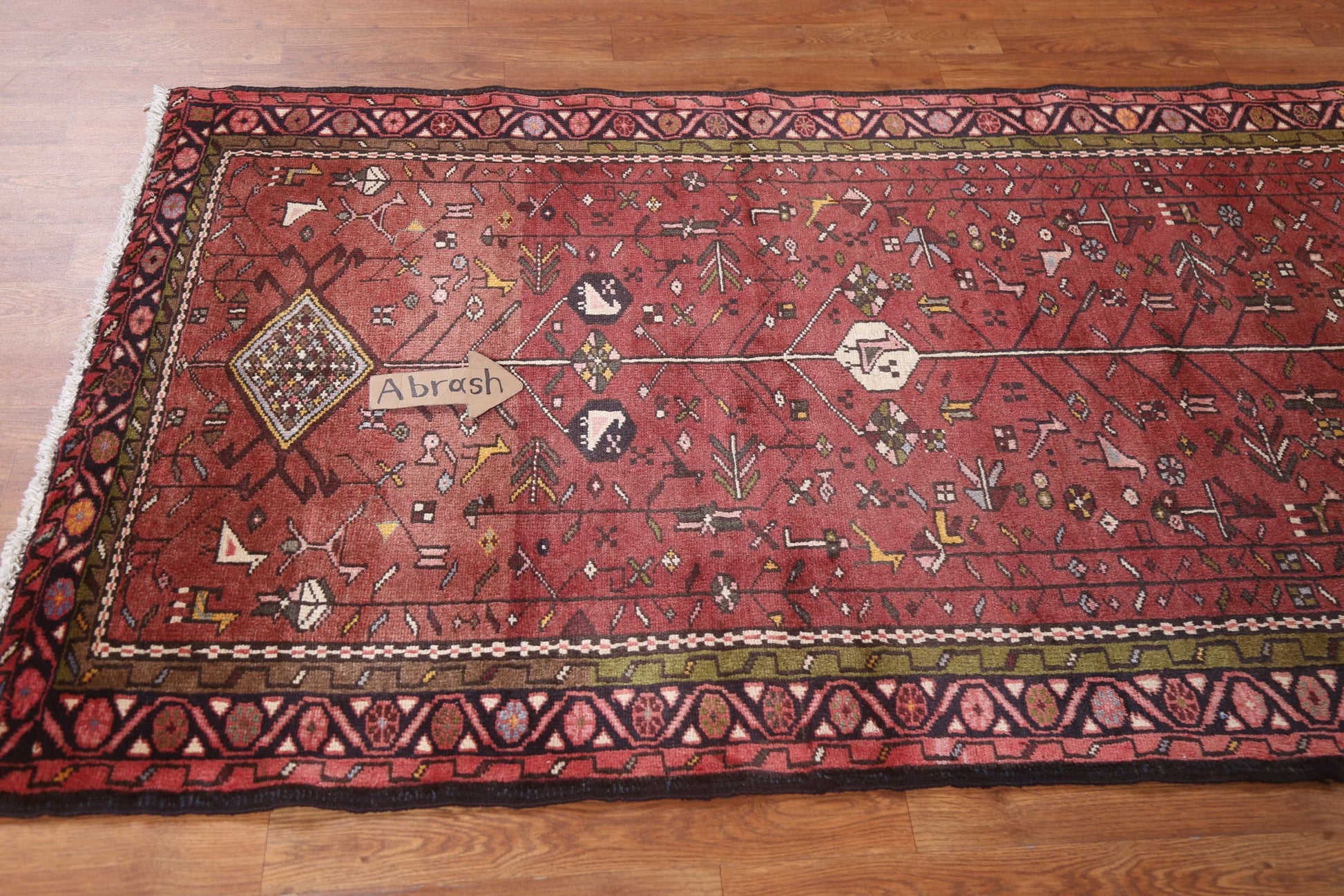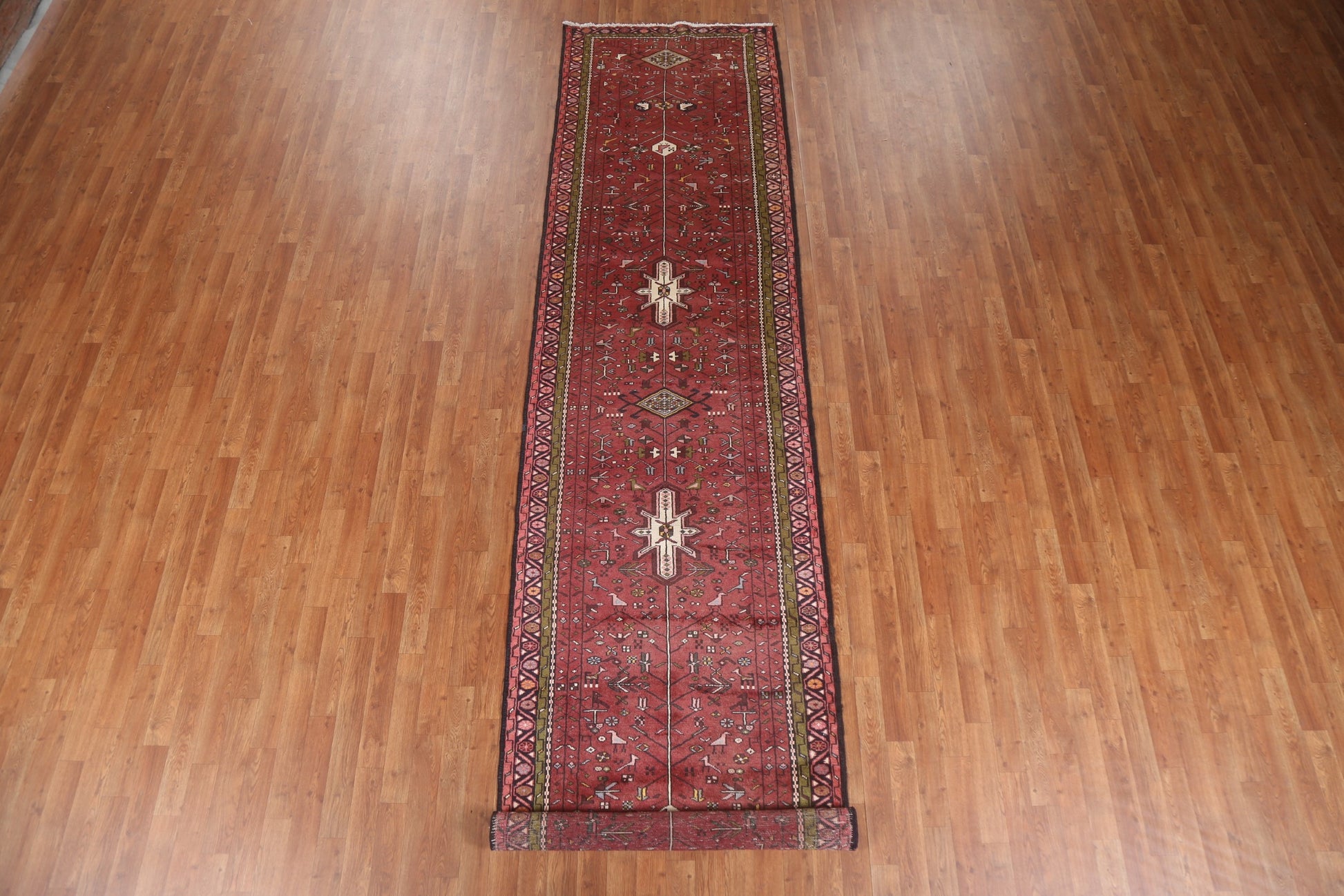 A Beautiful Genuine Persia ( Persia ) Gharajeh rug is Hand Knotted by skillful weavers in Persia ( Persia ) with 100% Wool Material. This rug is in Very Good (Abrash) condition. dimensions are 14' 7'' X 3' 5'' in foot and 445 X 104 in centimeter. the primary color is Red.