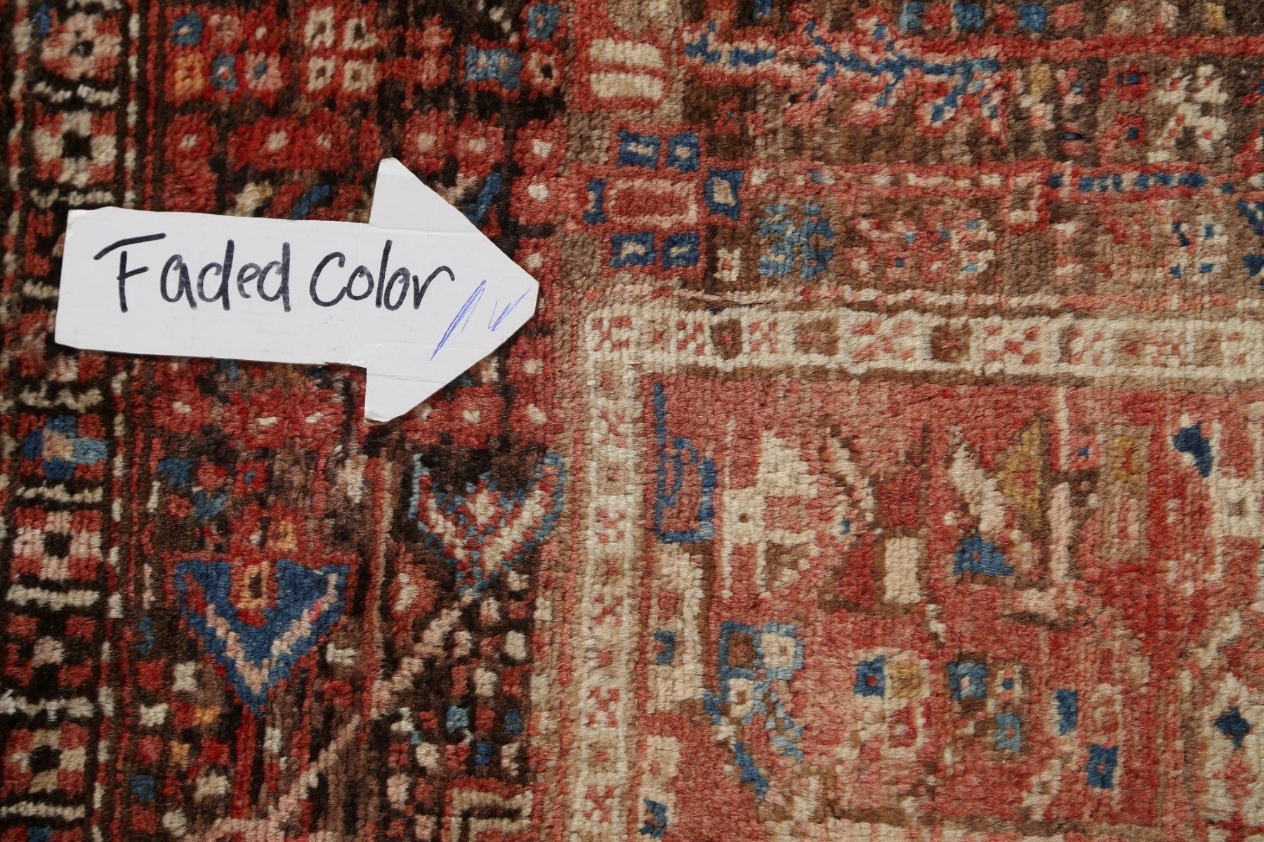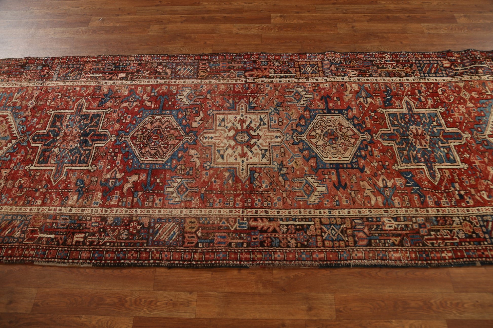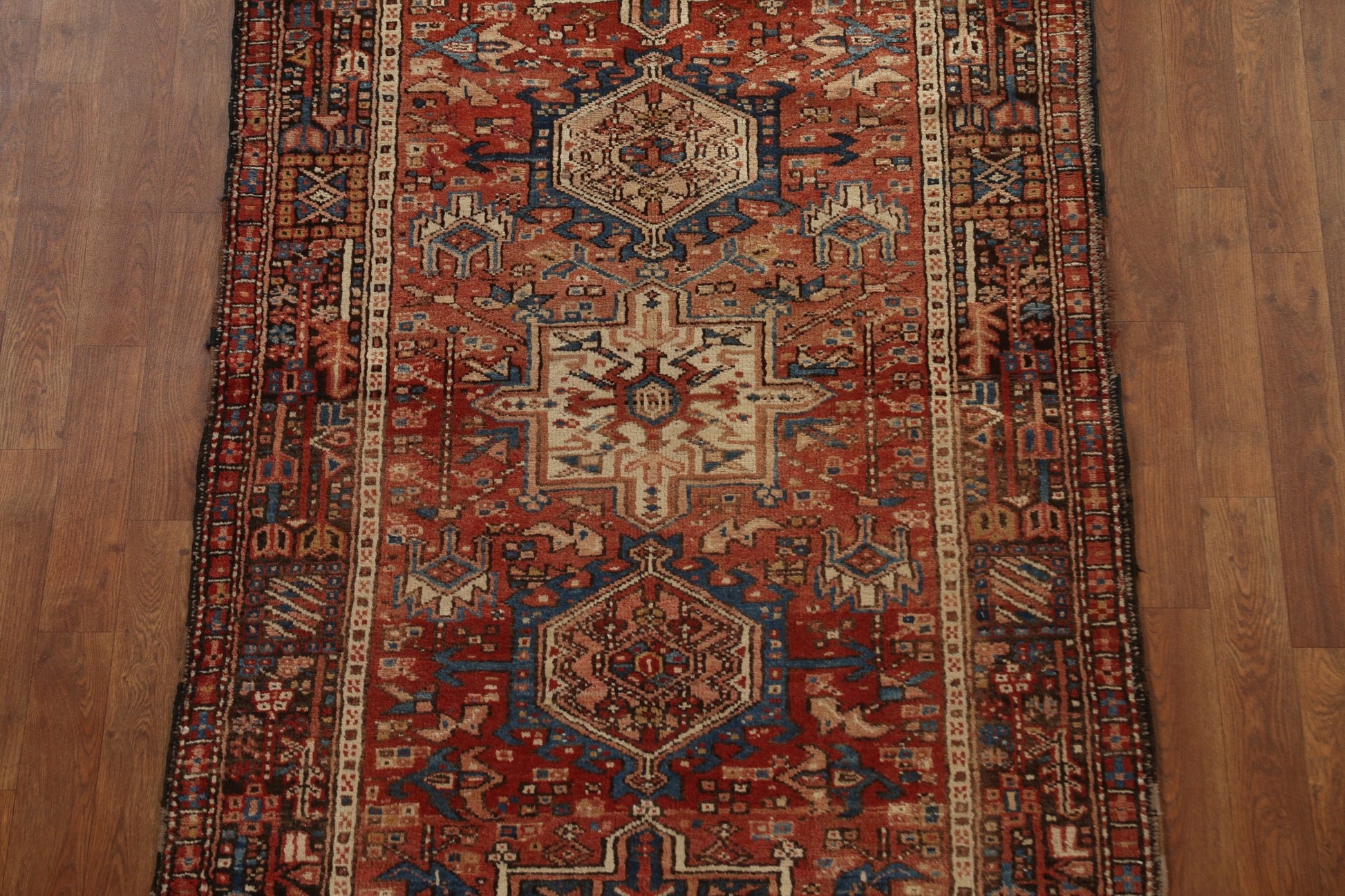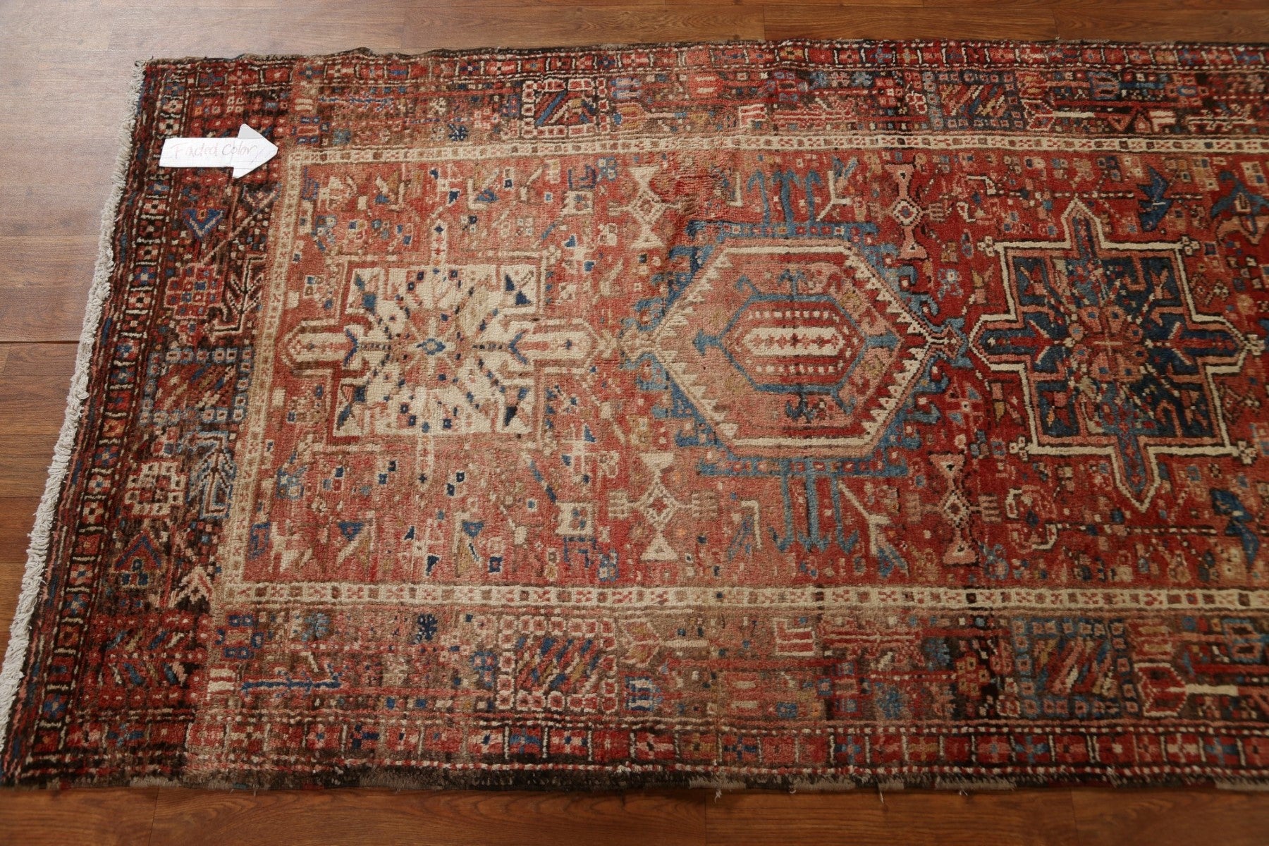 A Beautiful Genuine Persia ( Persia ) Gharajeh rug is Hand Knotted by skillful weavers in Persia ( Persia ) with 100% Wool Material. This rug is in Very Good (Faded Color) condition. dimensions are 13' 11'' X 3' 6'' in foot and 424 X 107 in centimeter. the primary color is Red.