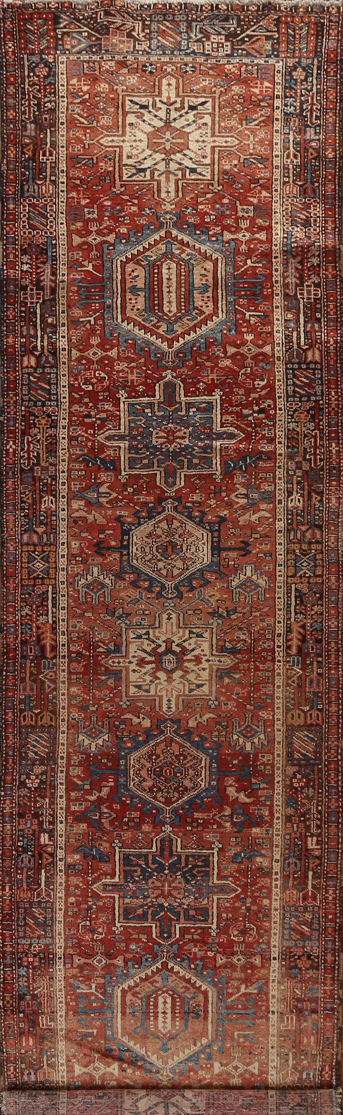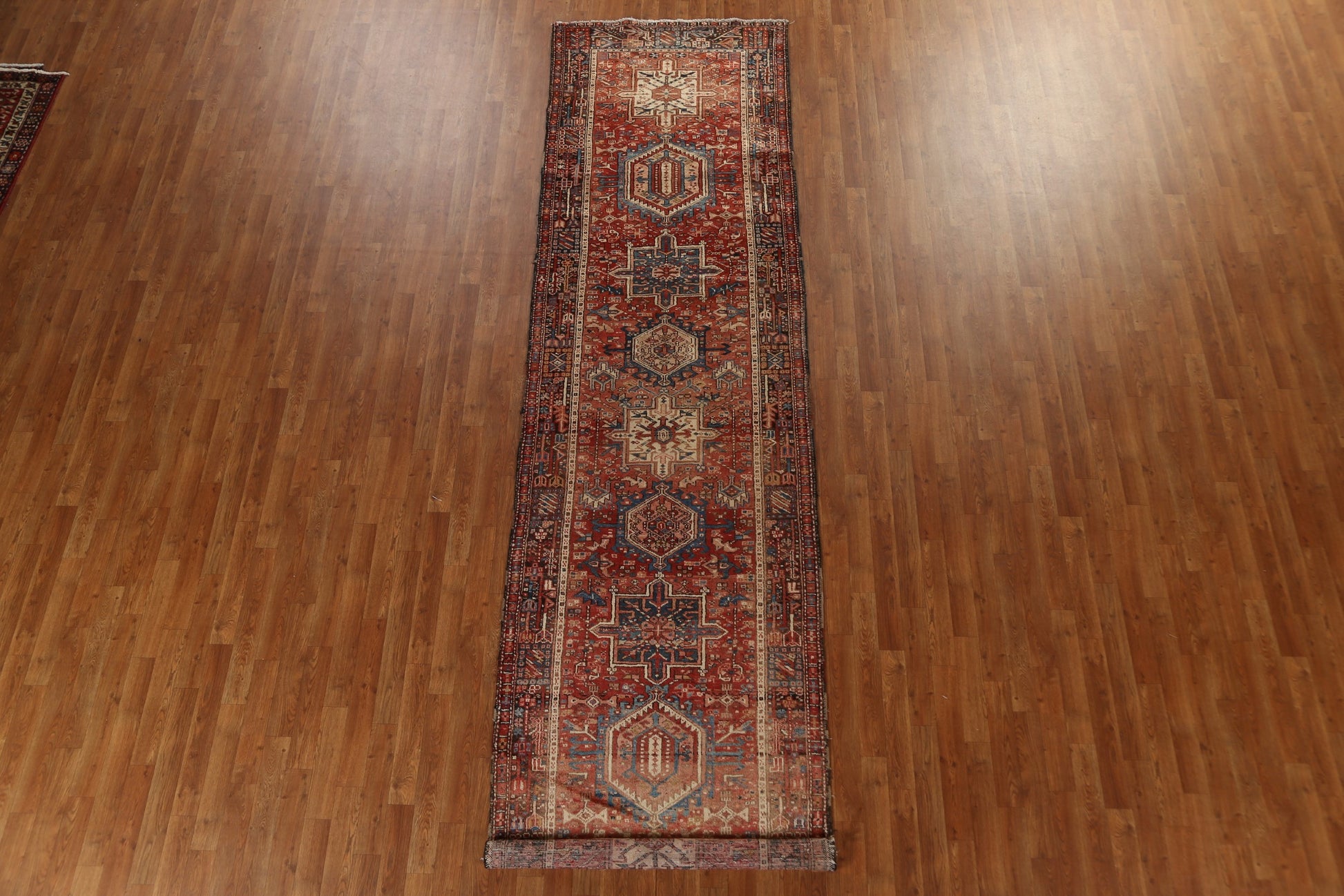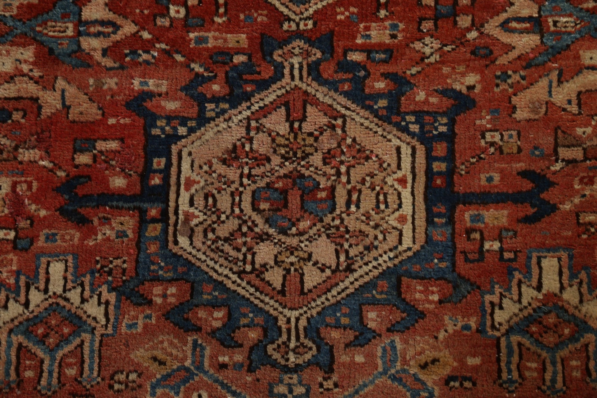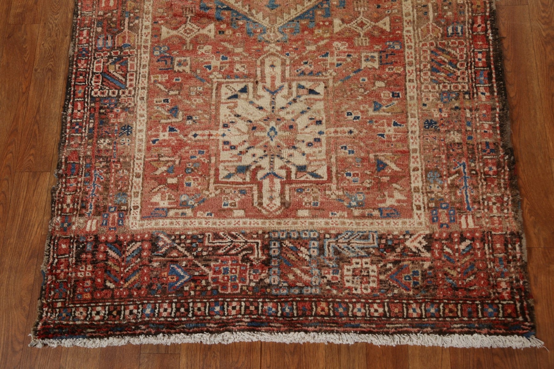 A Beautiful Genuine Persia ( Persia ) Gharajeh rug is Hand Knotted by skillful weavers in Persia ( Persia ) with 100% Wool Material. This rug is in Very Good (Faded Color) condition. dimensions are 13' 11'' X 3' 6'' in foot and 424 X 107 in centimeter. the primary color is Red.