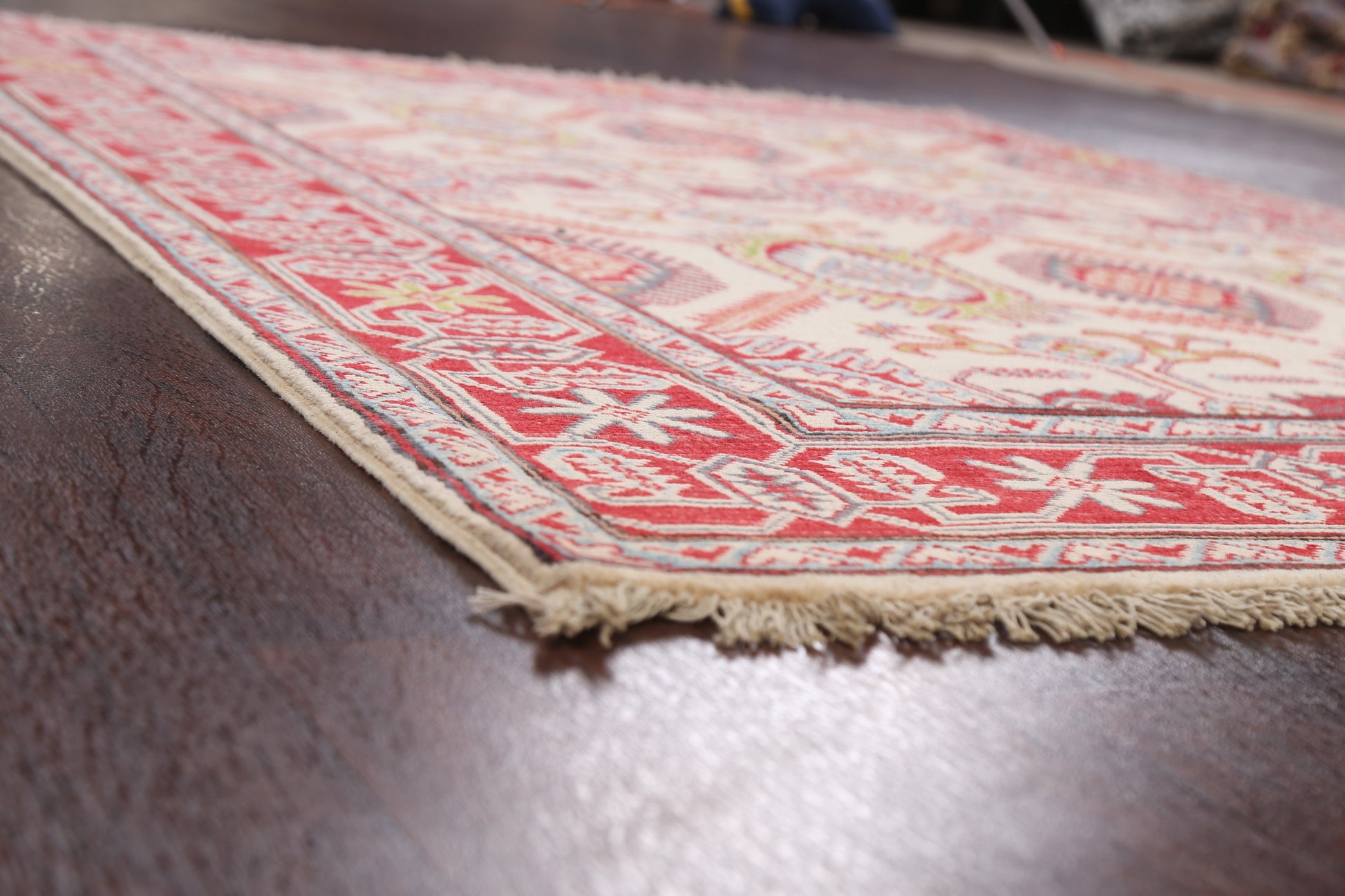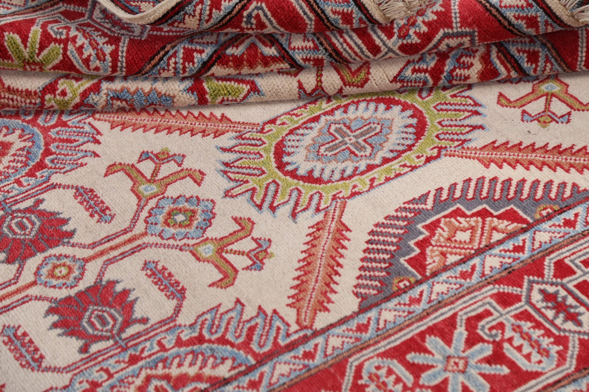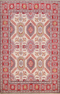 A Beautiful Genuine Pakistan Kazak rug is Hand Knotted by skillful weavers in Pakistan with 100% Wool Material. This rug is in New, First Quality condition. dimensions are 6' 9'' X 4' 11'' in foot and 206 X 150 in centimeter. the primary color is Beige & Ivories.