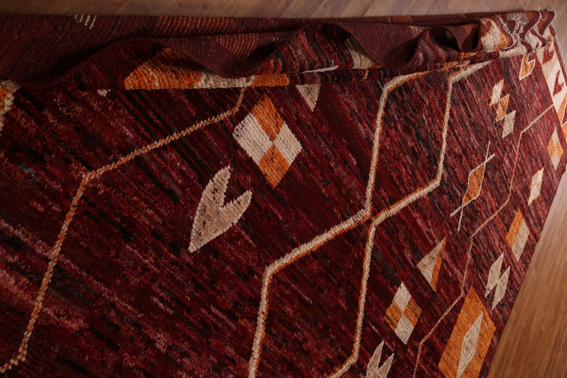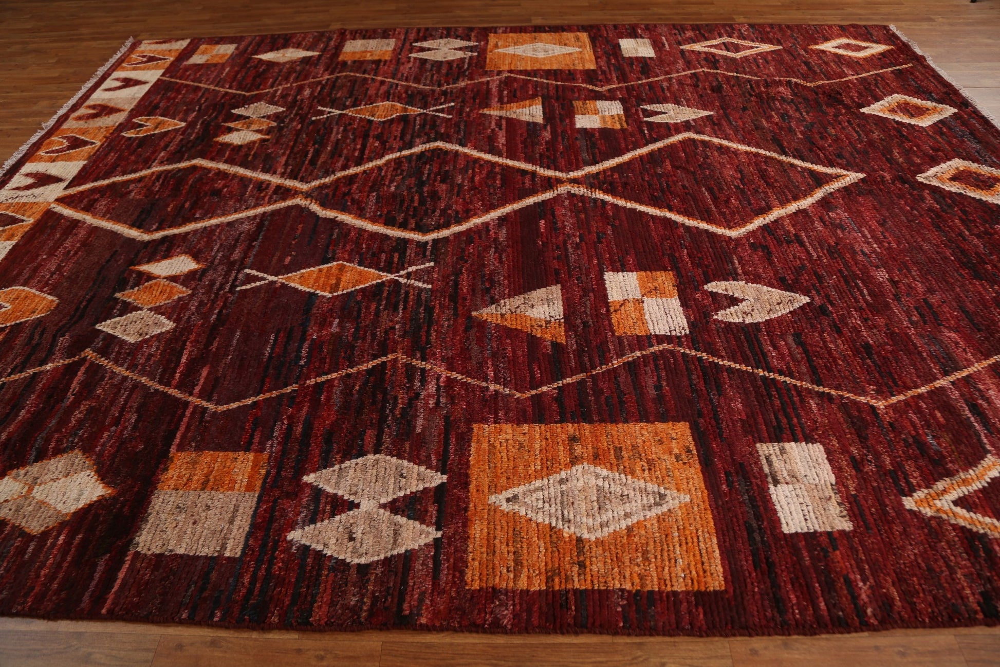 A Beautiful Genuine Pakistan Moroccan rug is Hand Knotted by skillful weavers in Pakistan with 100% Wool Material. This rug is in condition. dimensions are 12' 0'' X 9' 4'' in foot and 366 X 284 in centimeter. the primary color is Red.