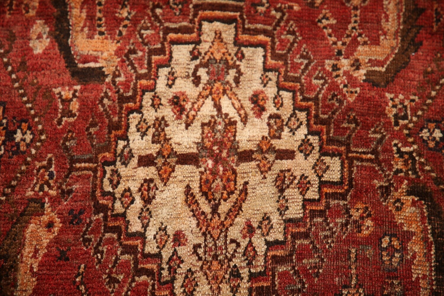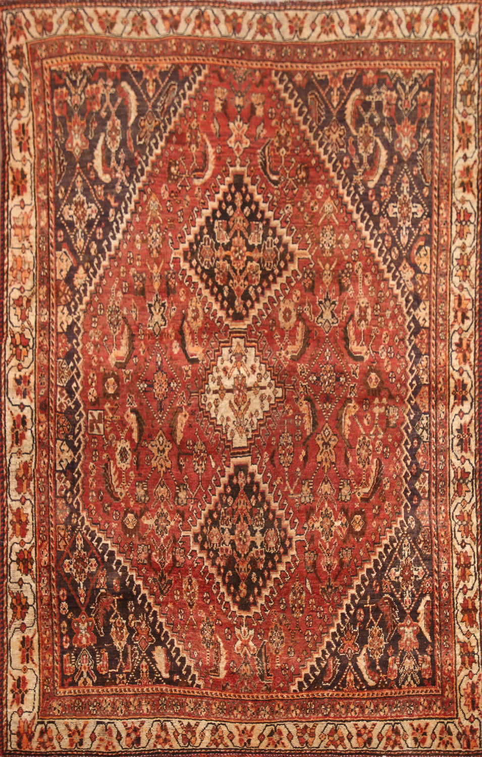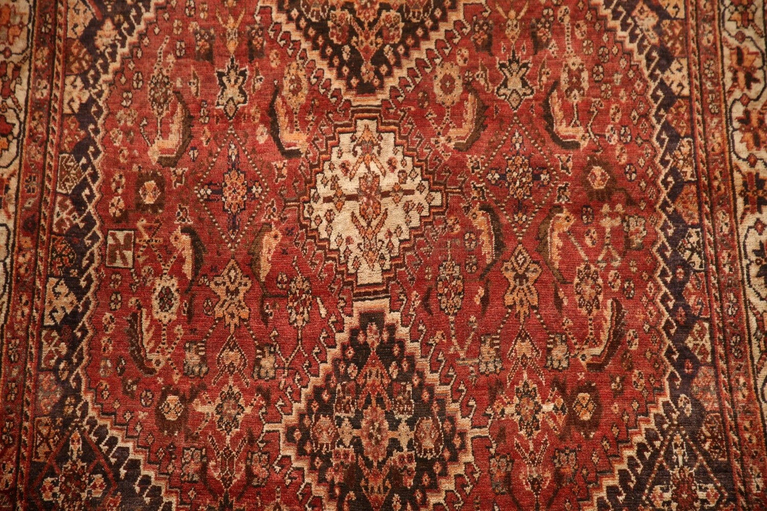 A Beautiful Genuine Persia ( Persia ) Qashqai rug is Hand Knotted by skillful weavers in Persia ( Persia ) with 100% Wool Material. This rug is in Very Good (Evenly Low Pile) condition. dimensions are 7' 4'' X 4' 8'' in foot and 224 X 142 in centimeter. the primary color is Red.