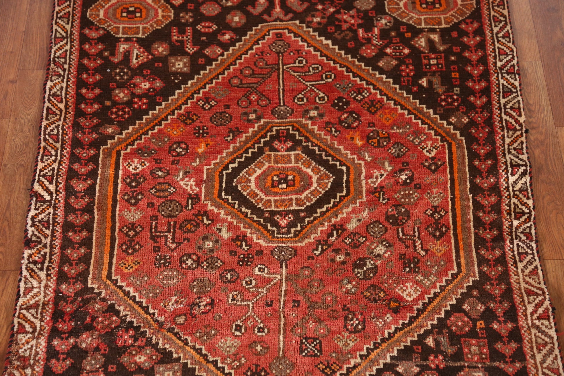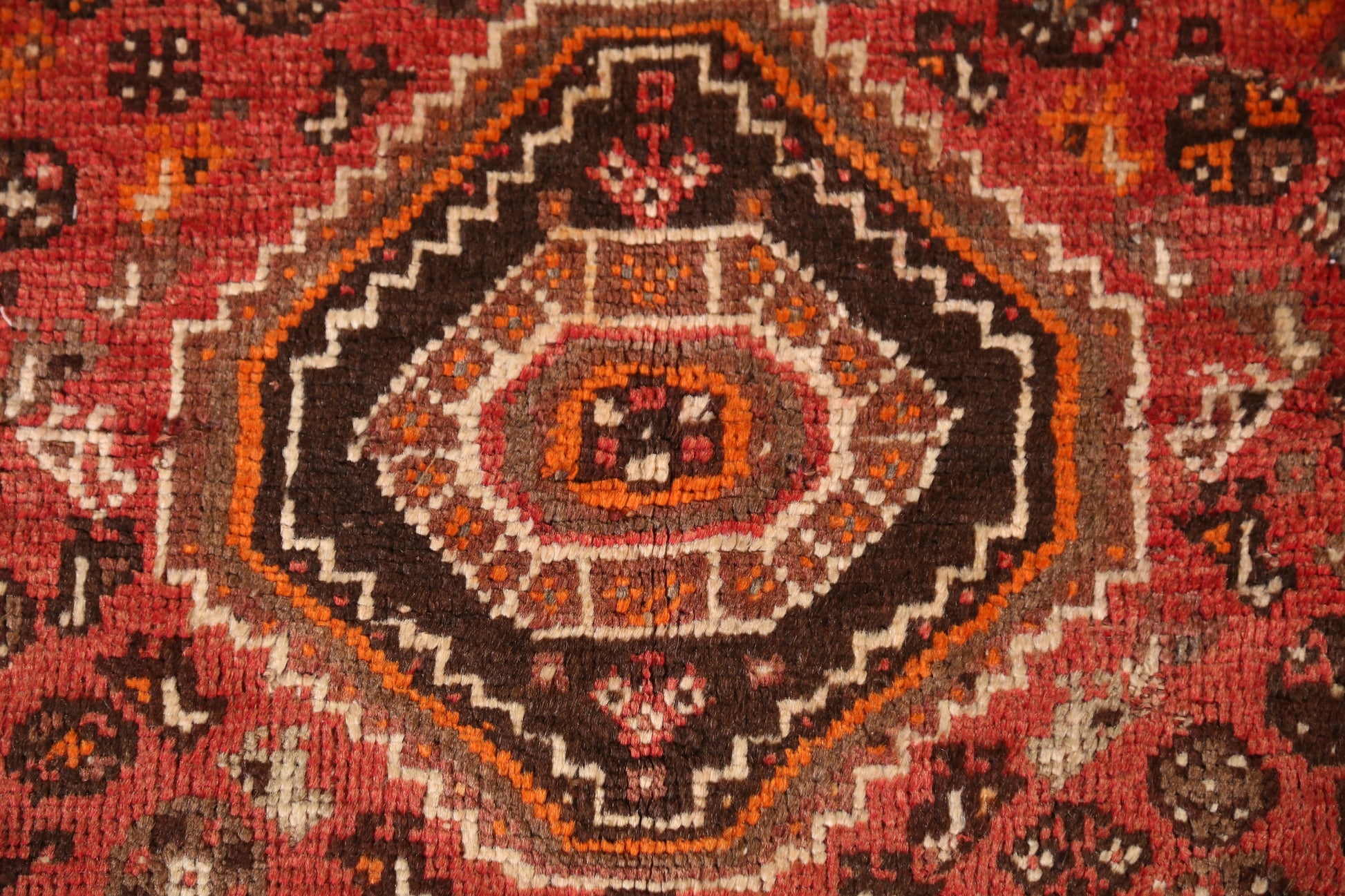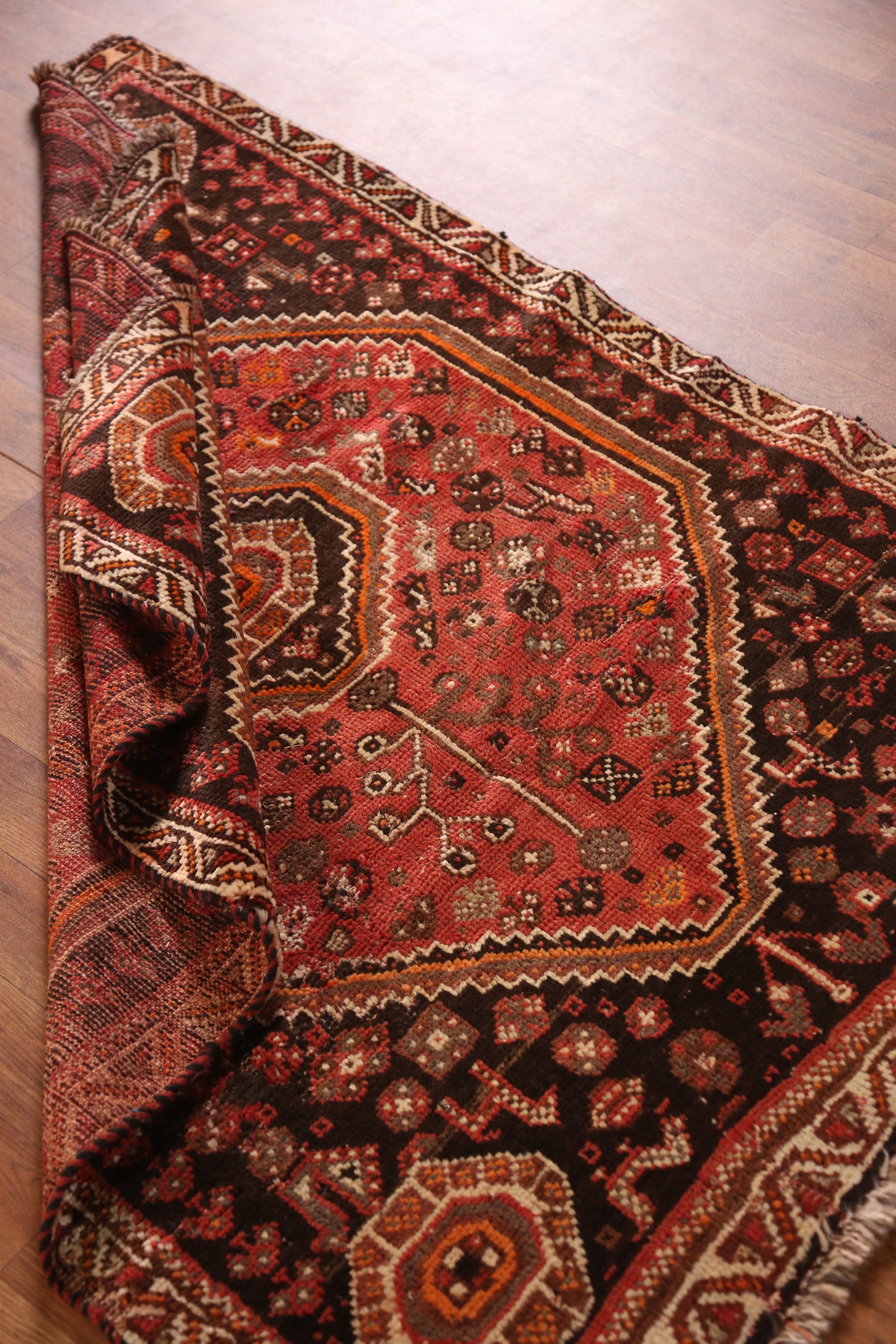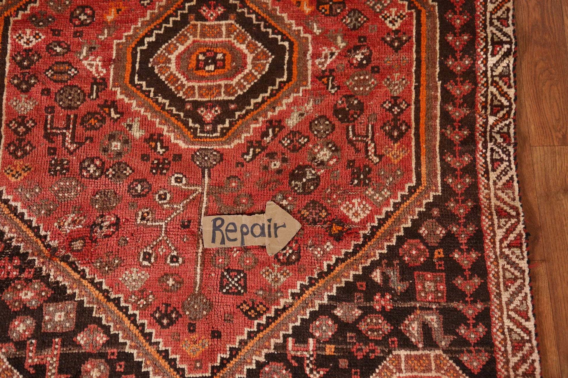 A Beautiful Genuine Persia ( Persia ) Qashqai rug is Hand Knotted by skillful weavers in Persia ( Persia ) with 100% Wool Material. This rug is in Very Good ( Evenly Low Pile-Repair) condition. dimensions are 4' 10'' X 3' 7'' in foot and 147 X 109 in centimeter. the primary color is Oranges & Rust.