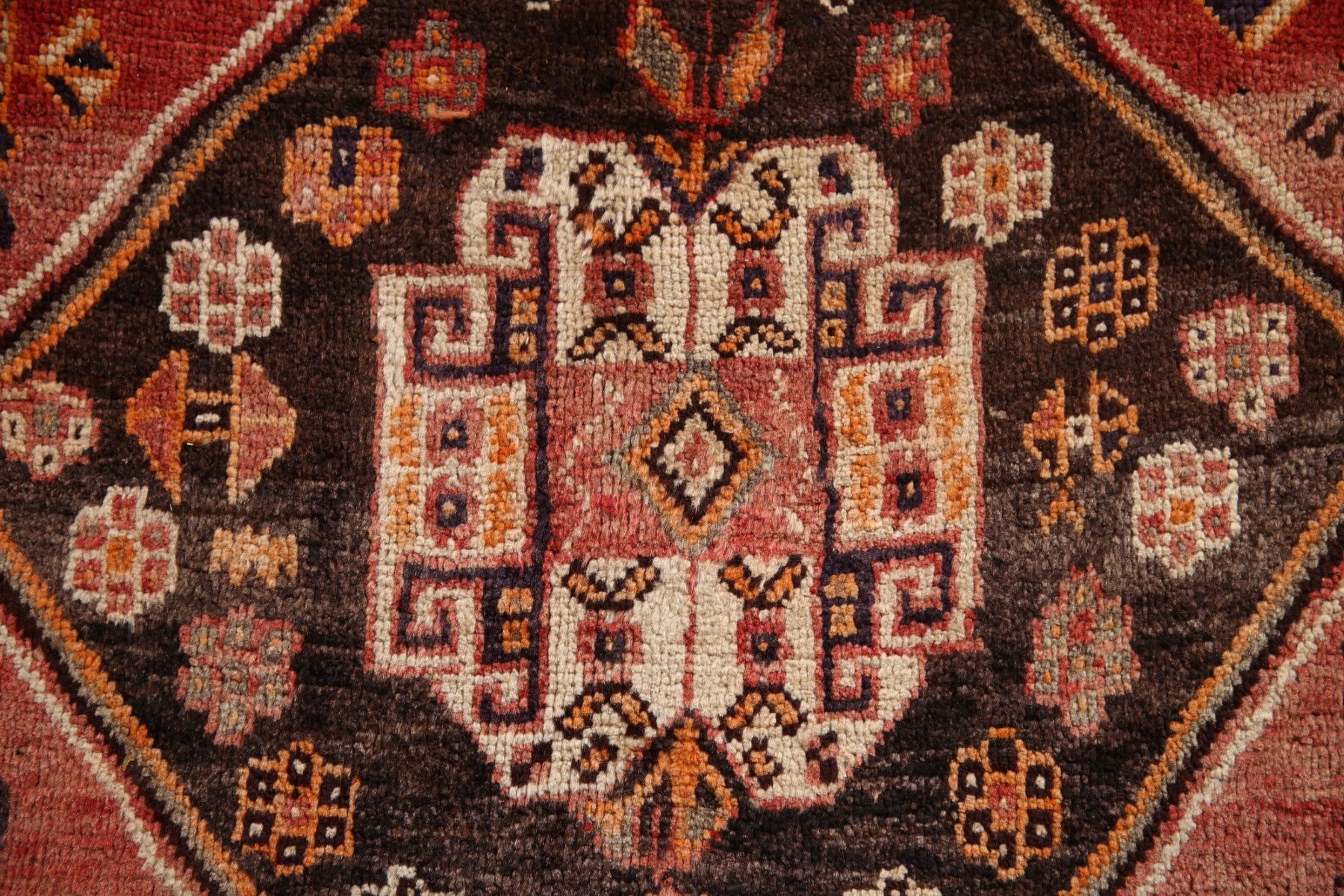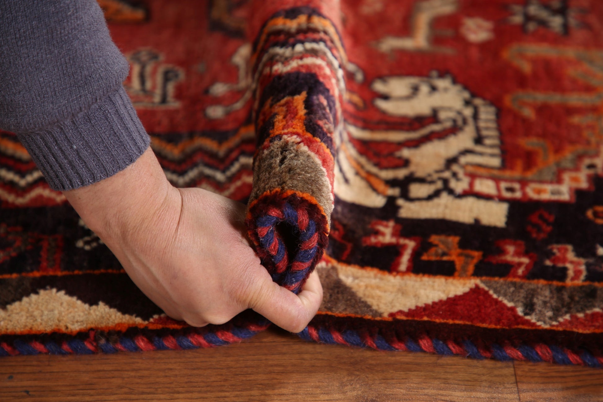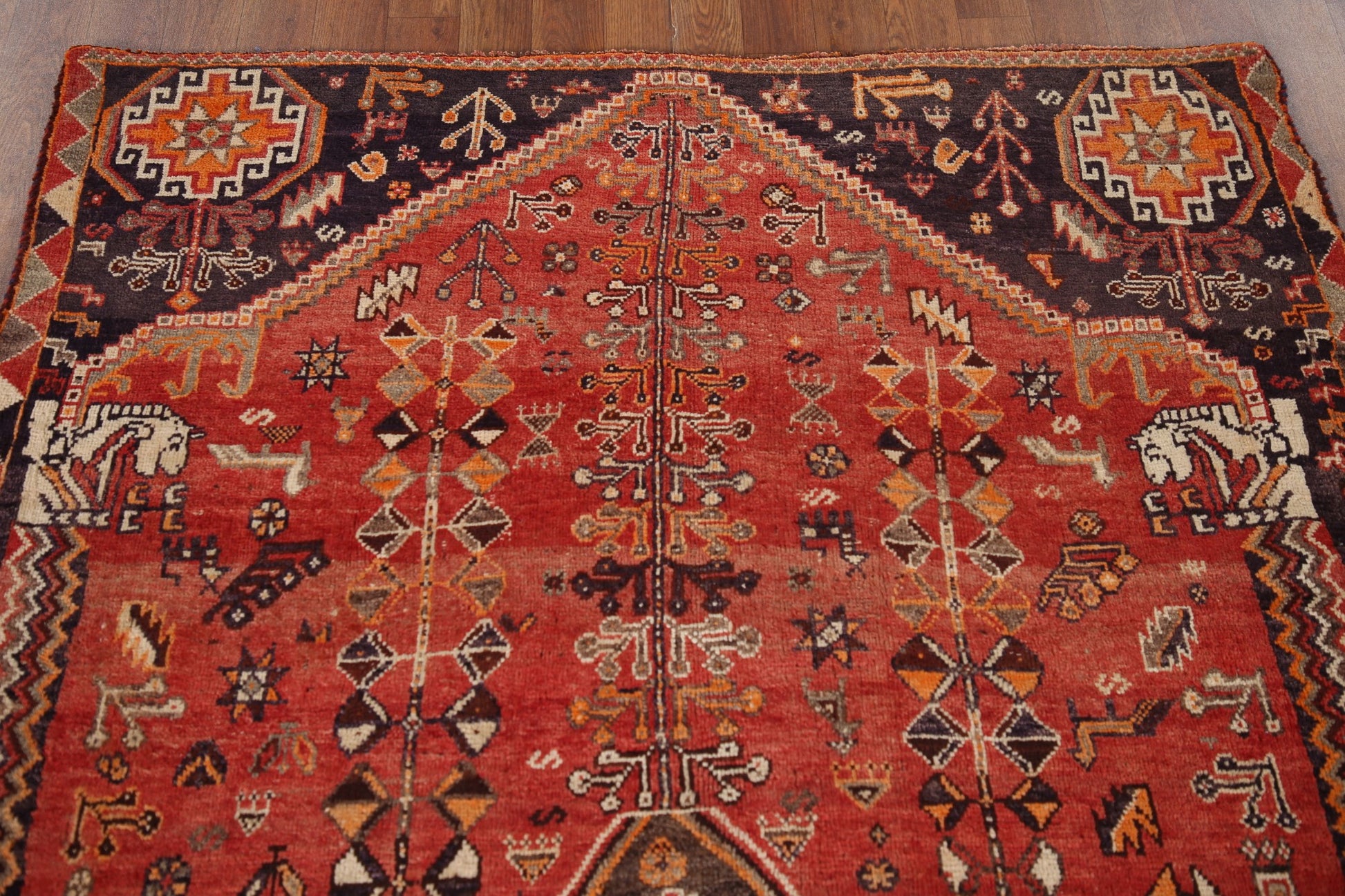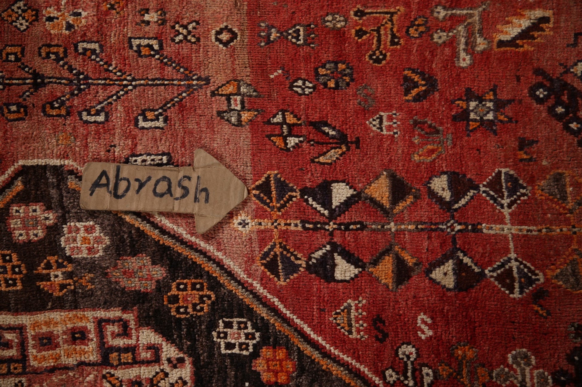 A Beautiful Genuine Persia ( Persia ) Shiraz rug is Hand Knotted by skillful weavers in Persia ( Persia ) with 100% Wool Material. This rug is in Very Good (Abrash-Low Pile) condition. dimensions are 8' 0'' X 4' 6'' in foot and 244 X 137 in centimeter. the primary color is Red.