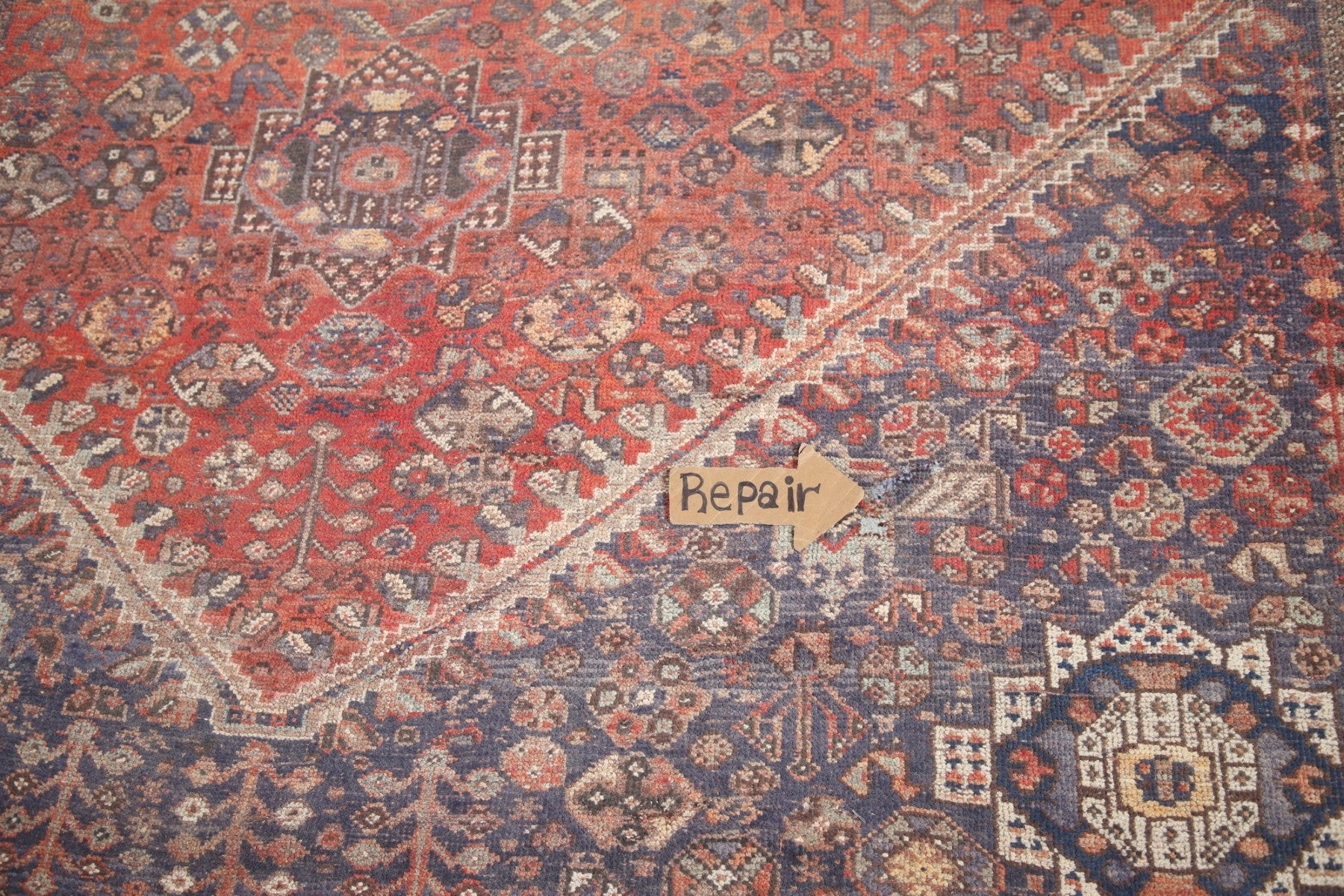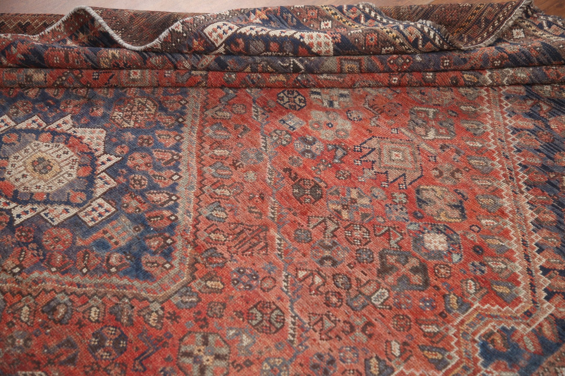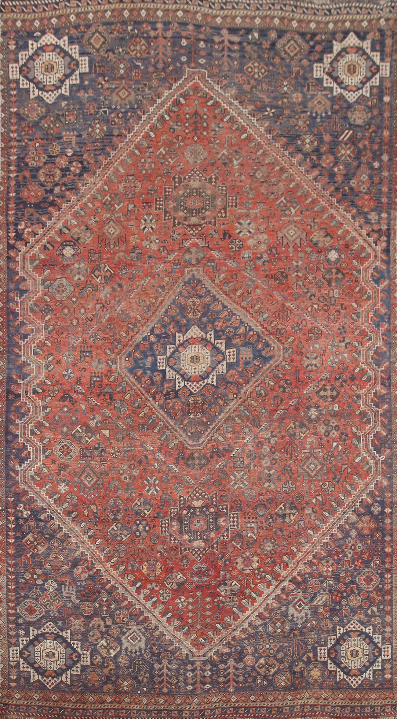 A Beautiful Genuine Persia ( Persia ) Shiraz rug is Hand Knotted by skillful weavers in Persia ( Persia ) with 100% Wool Material. This rug is in Very Good (Evenly Low Pile-Repair) condition. dimensions are 9' 11'' X 5' 10'' in foot and 302 X 178 in centimeter. the primary color is Red.