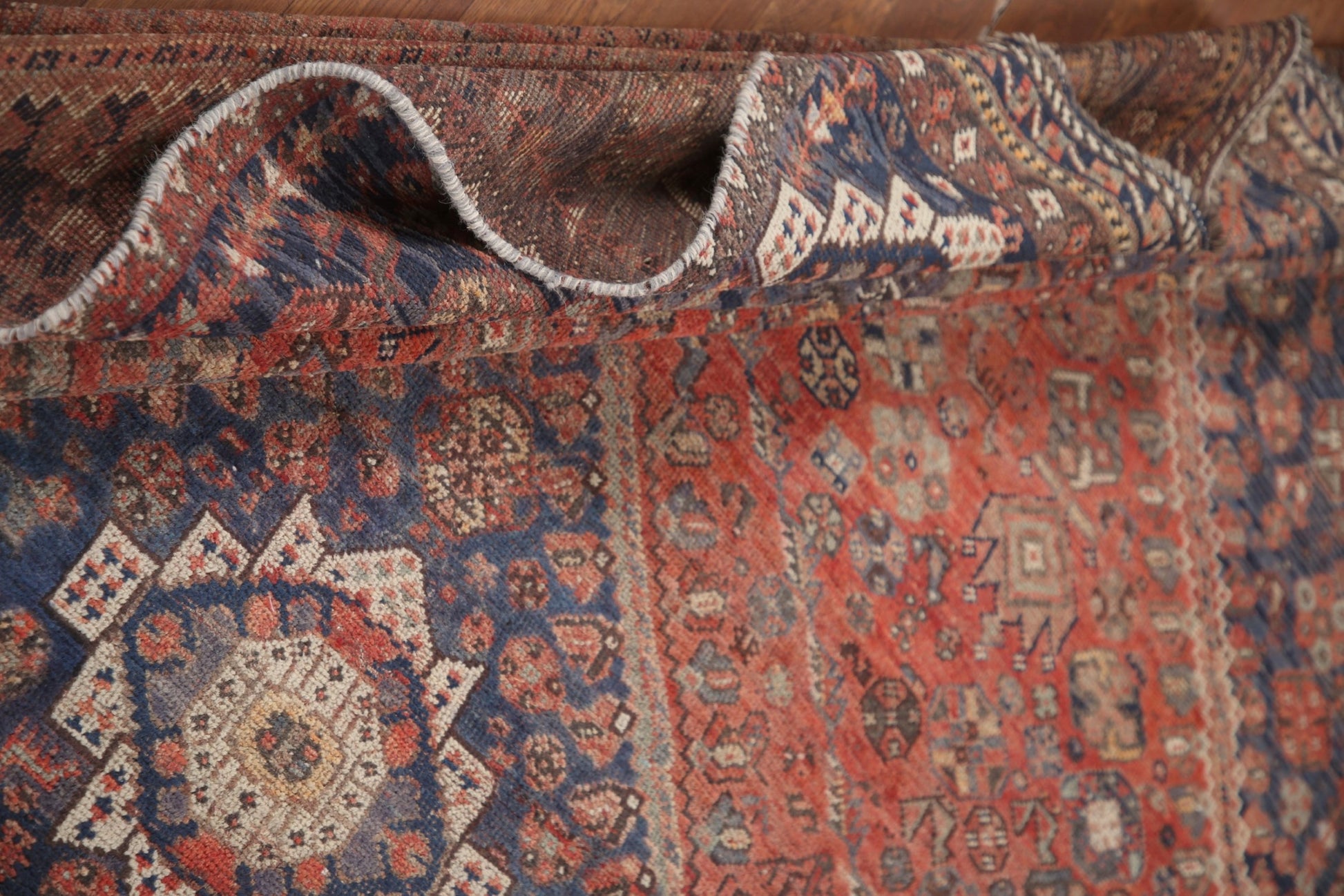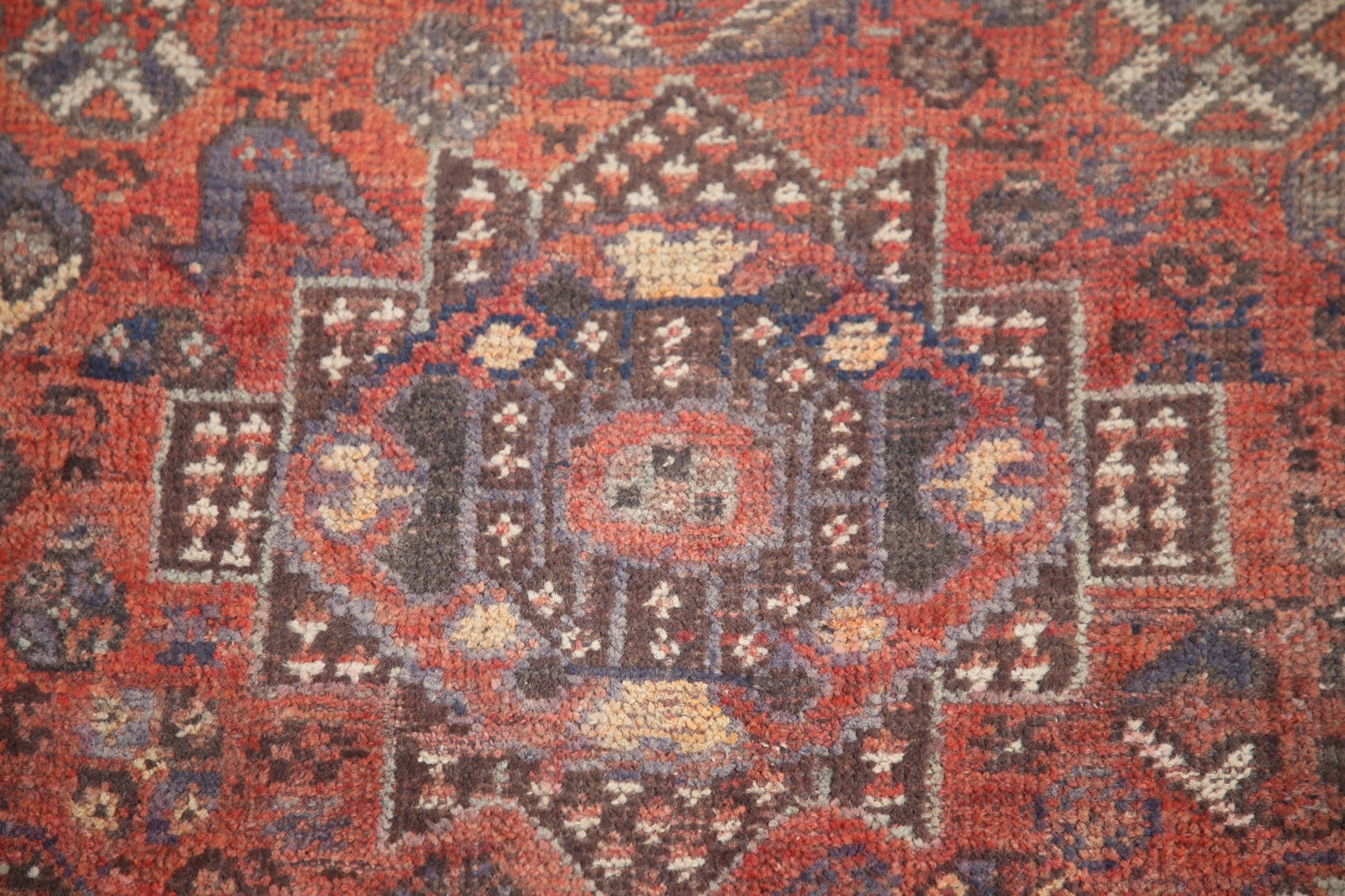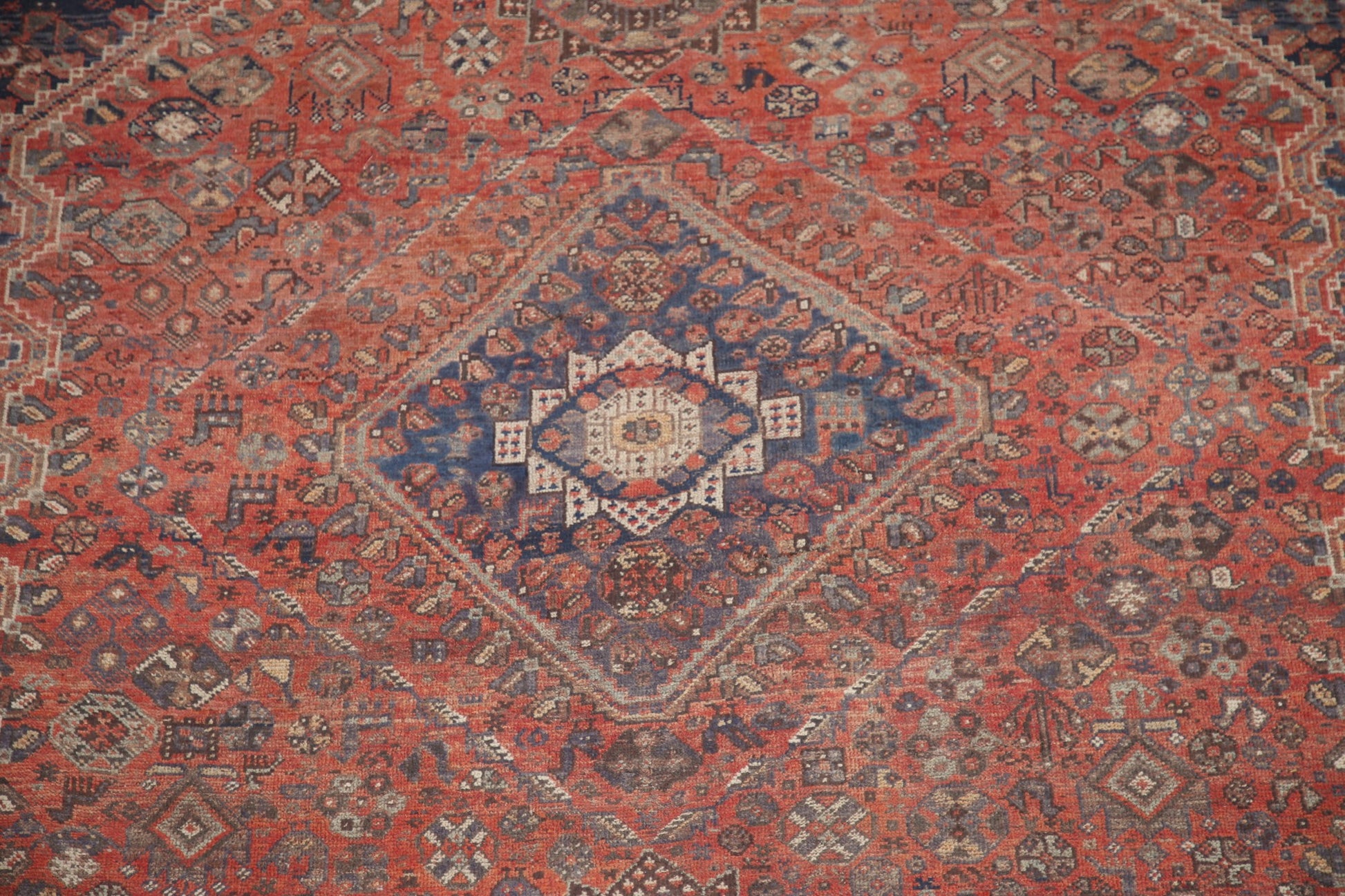 A Beautiful Genuine Persia ( Persia ) Shiraz rug is Hand Knotted by skillful weavers in Persia ( Persia ) with 100% Wool Material. This rug is in Very Good (Evenly Low Pile-Repair) condition. dimensions are 9' 11'' X 5' 10'' in foot and 302 X 178 in centimeter. the primary color is Red.