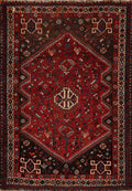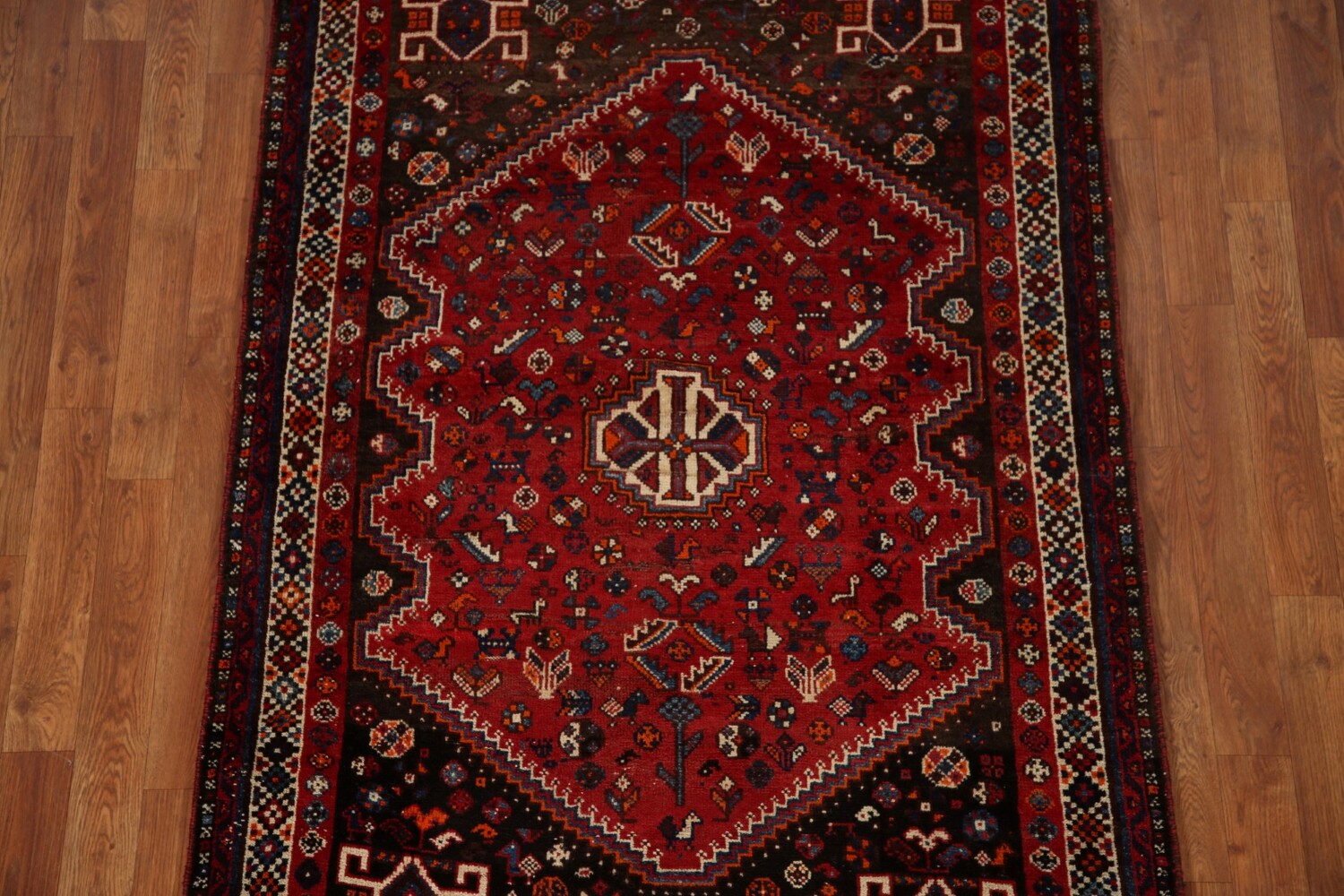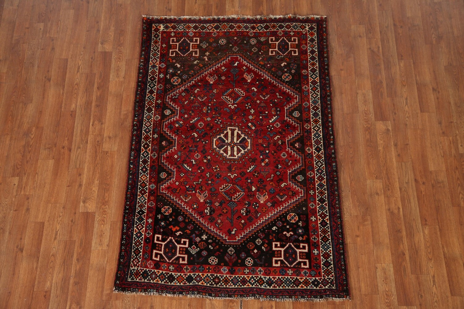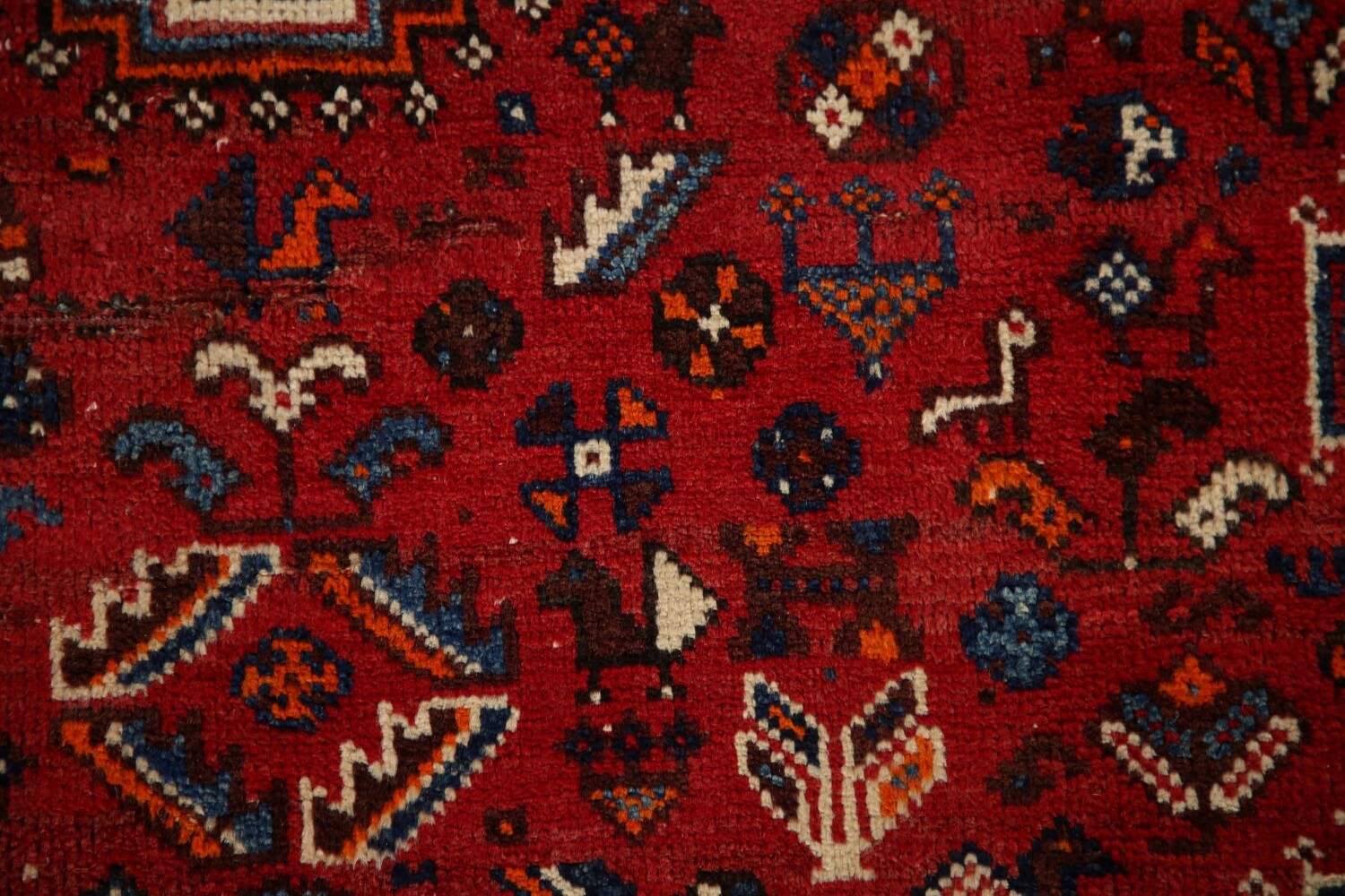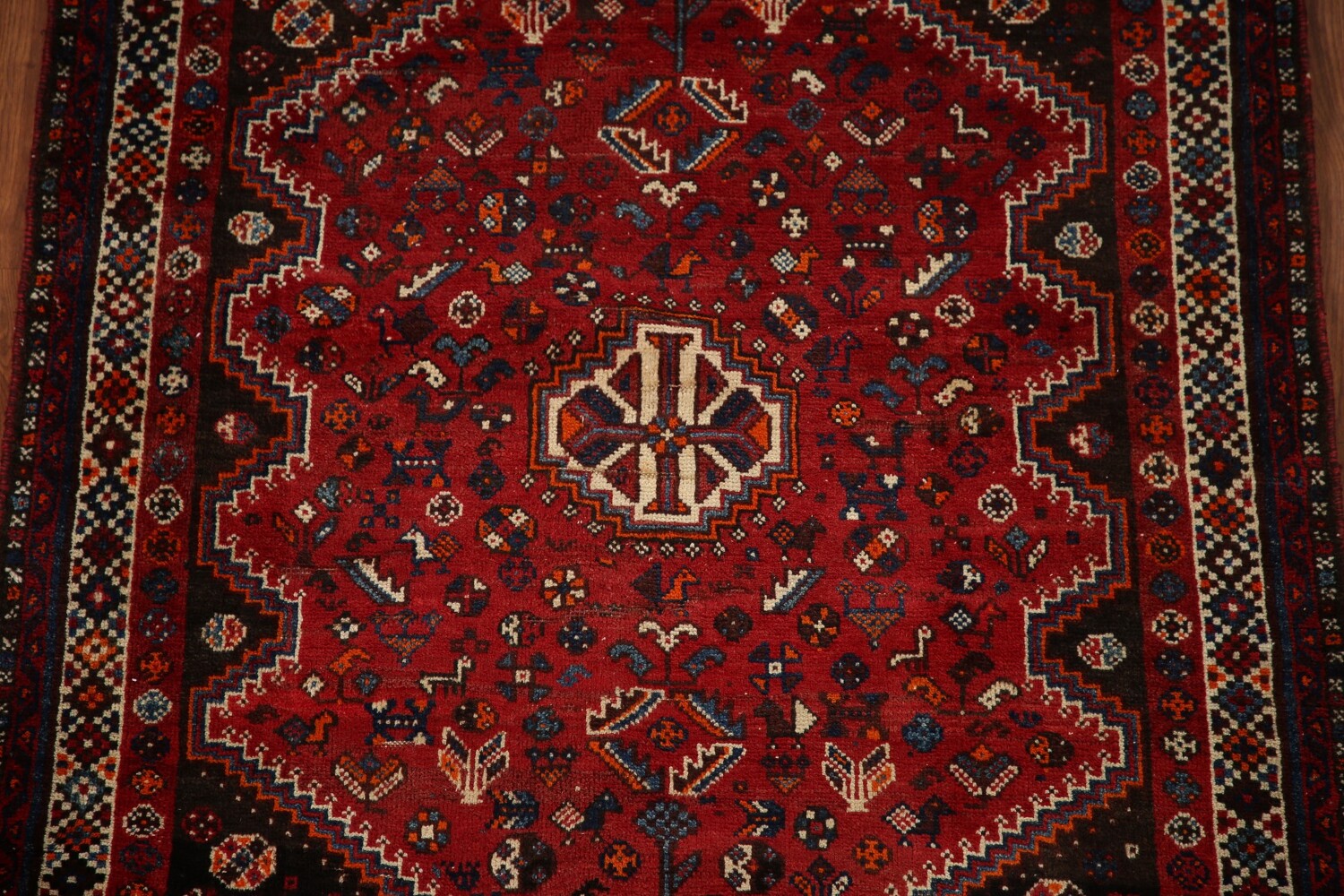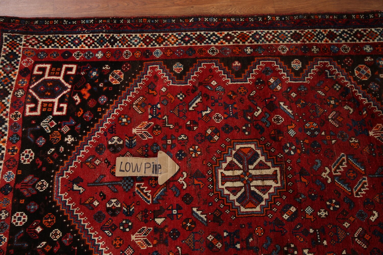 A Beautiful Genuine Persia ( Persia ) Shiraz rug is Hand Knotted by skillful weavers in Persia ( Persia ) with 100% Wool Material. This rug is in Very Good (Low Pile-Abrash) condition. dimensions are 5' 7'' X 3' 8'' in foot and 170 X 112 in centimeter. the primary color is Red.