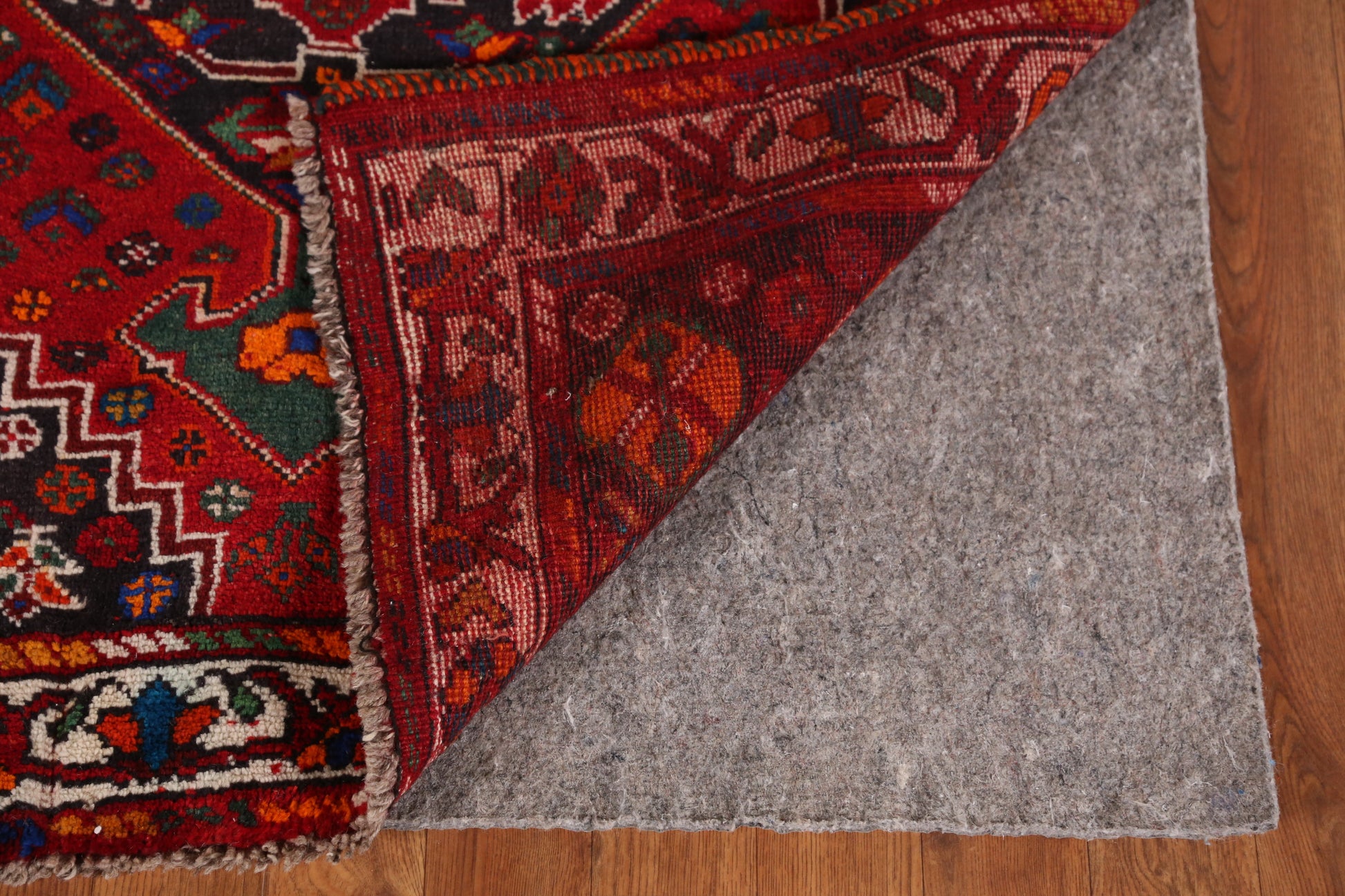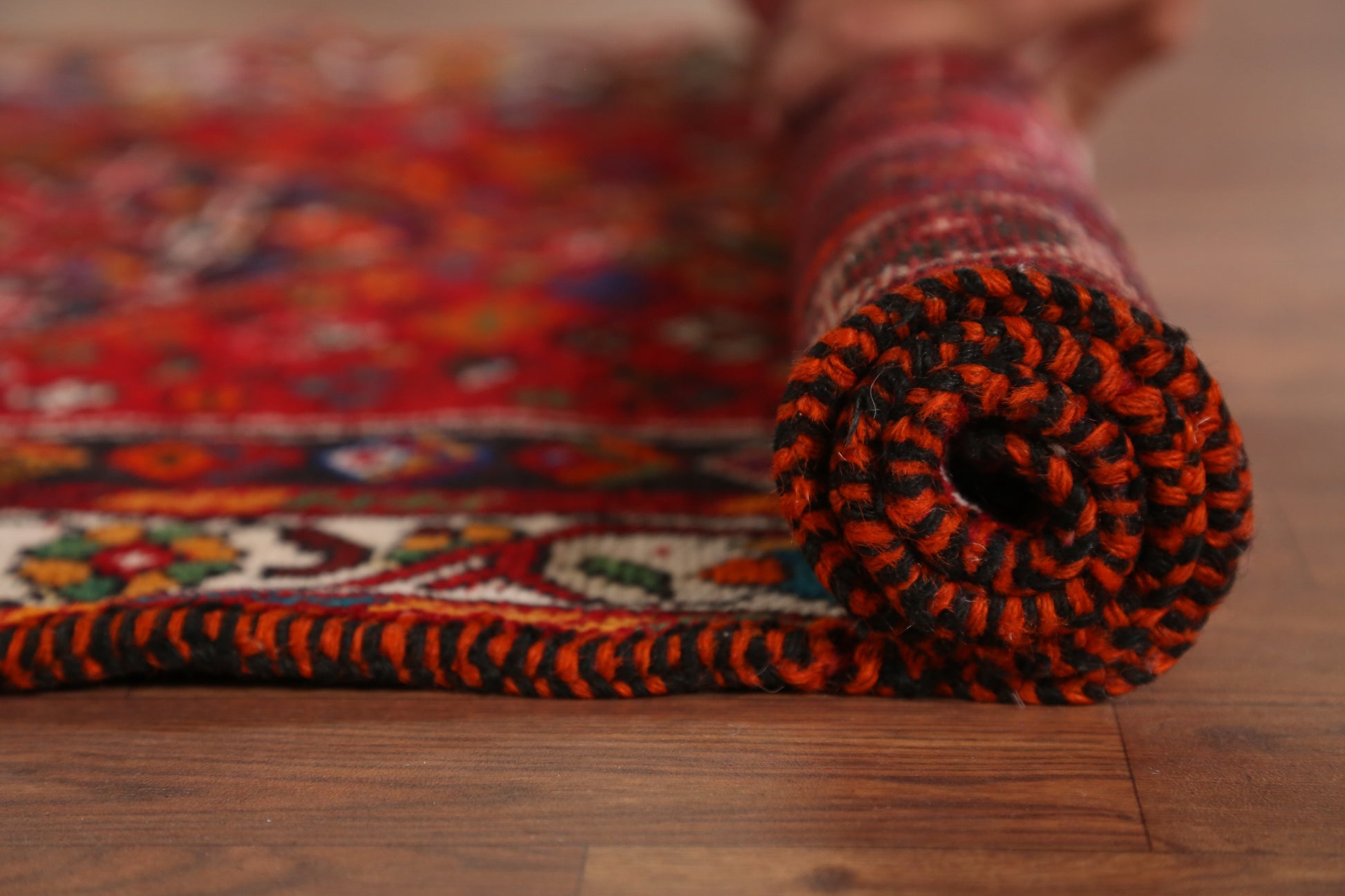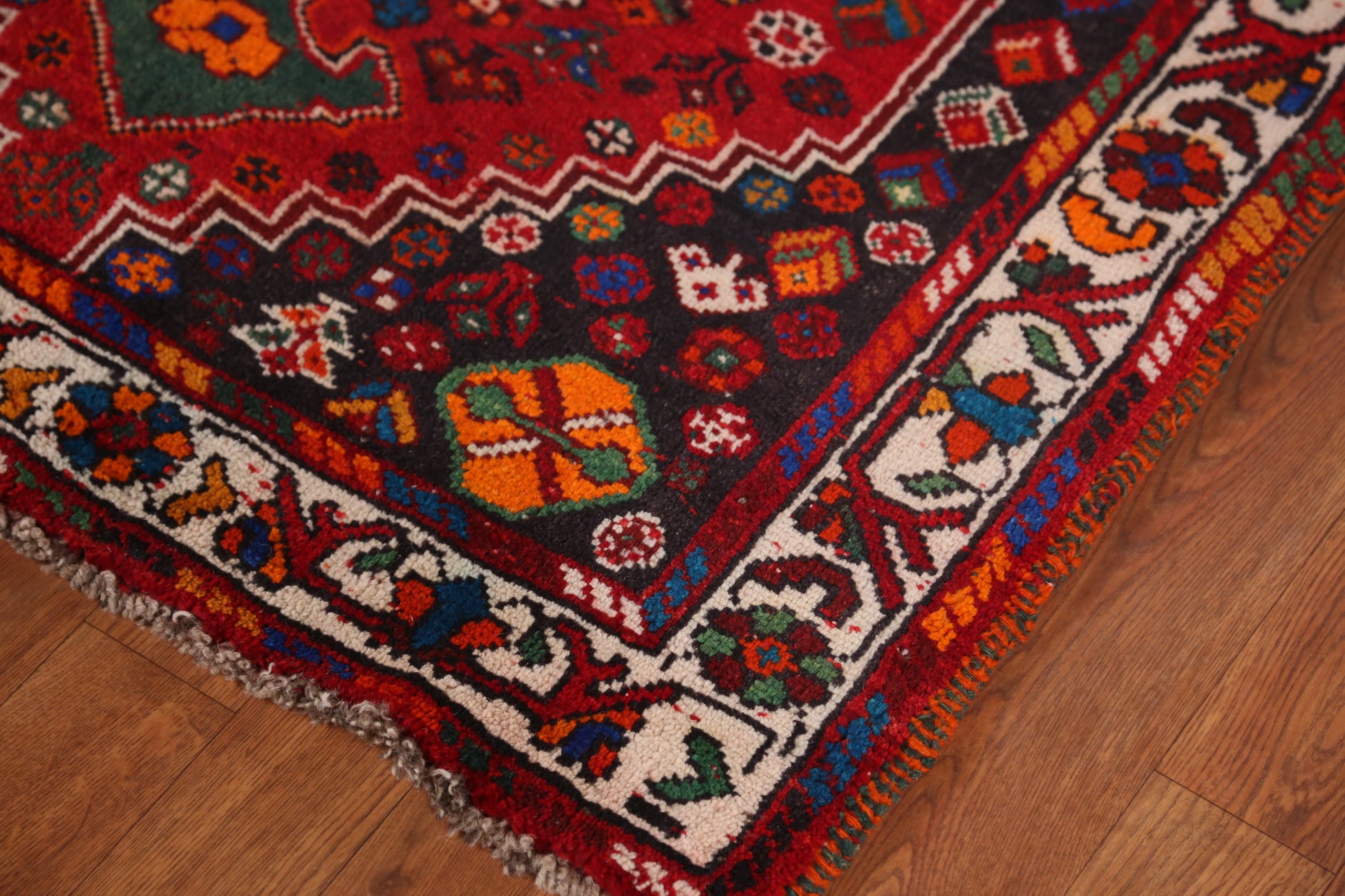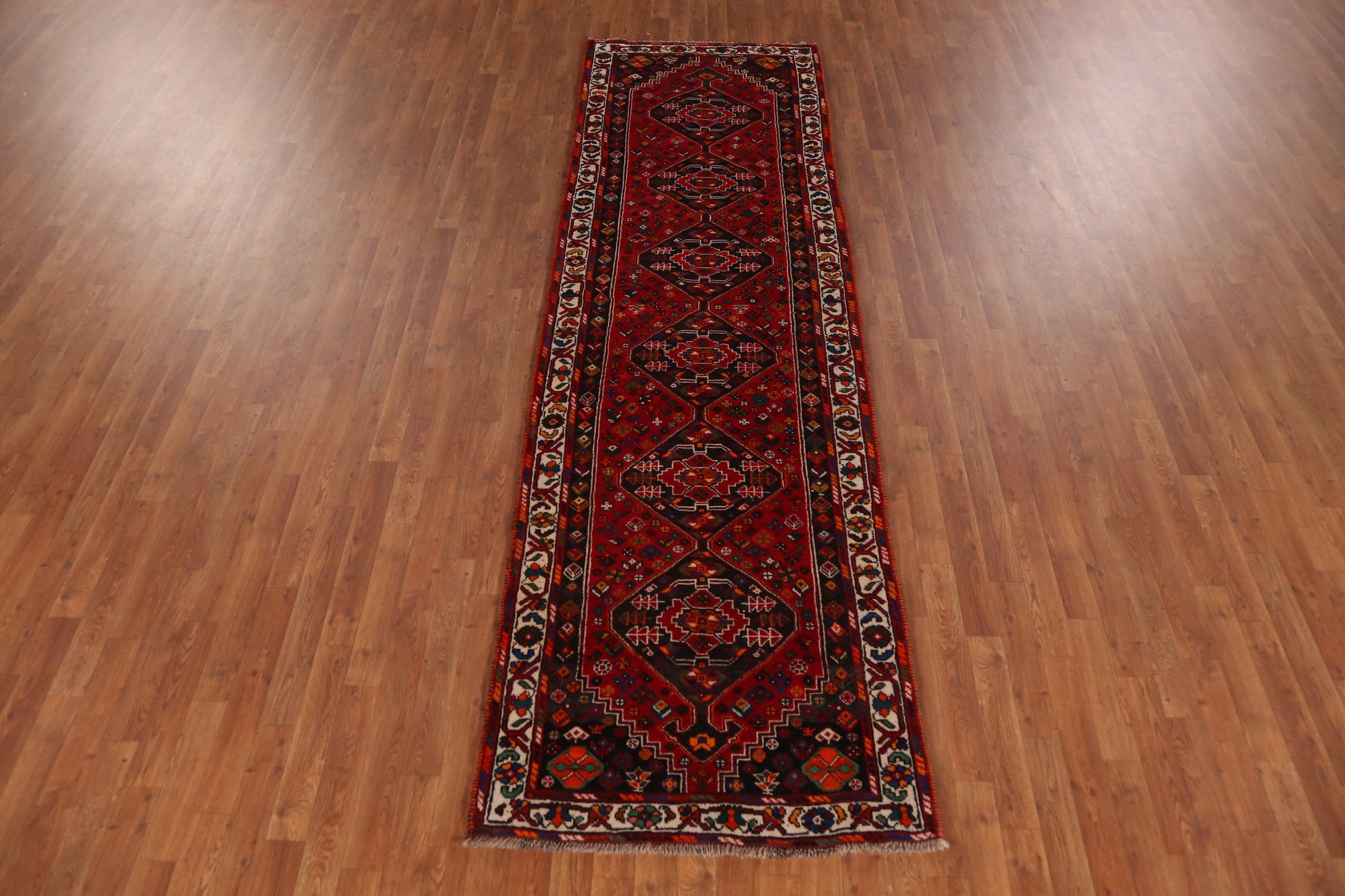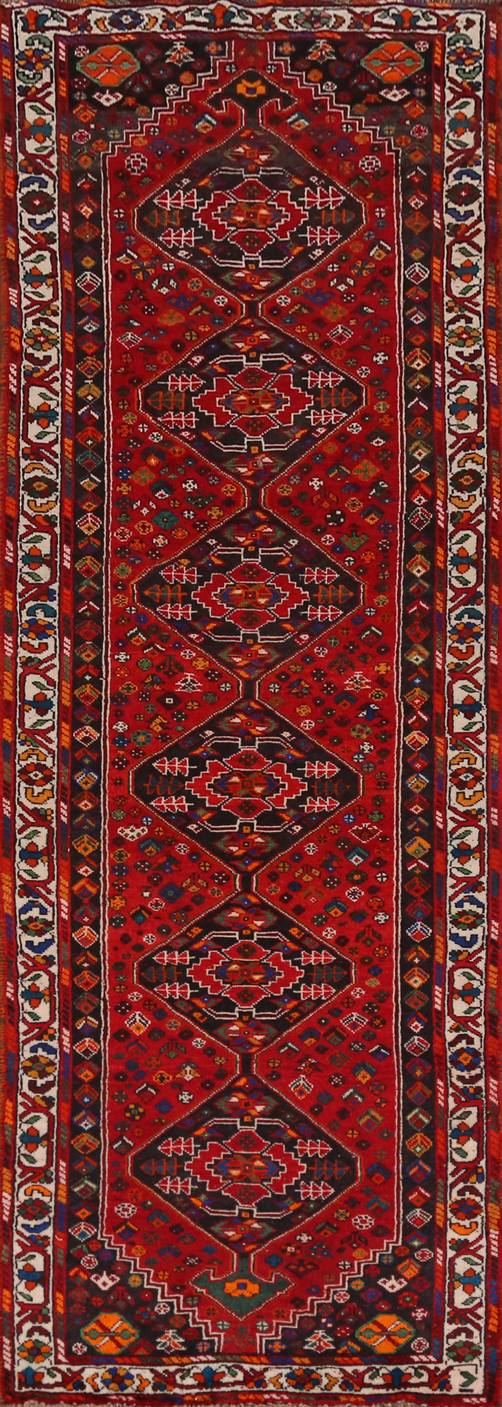 A Beautiful Genuine Persia ( Persia ) Shiraz rug is Hand Knotted by skillful weavers in Persia ( Persia ) with 100% Wool Material. This rug is in Very Good condition. dimensions are 10' 8'' X 3' 2'' in foot and 325 X 97 in centimeter. the primary color is Red.