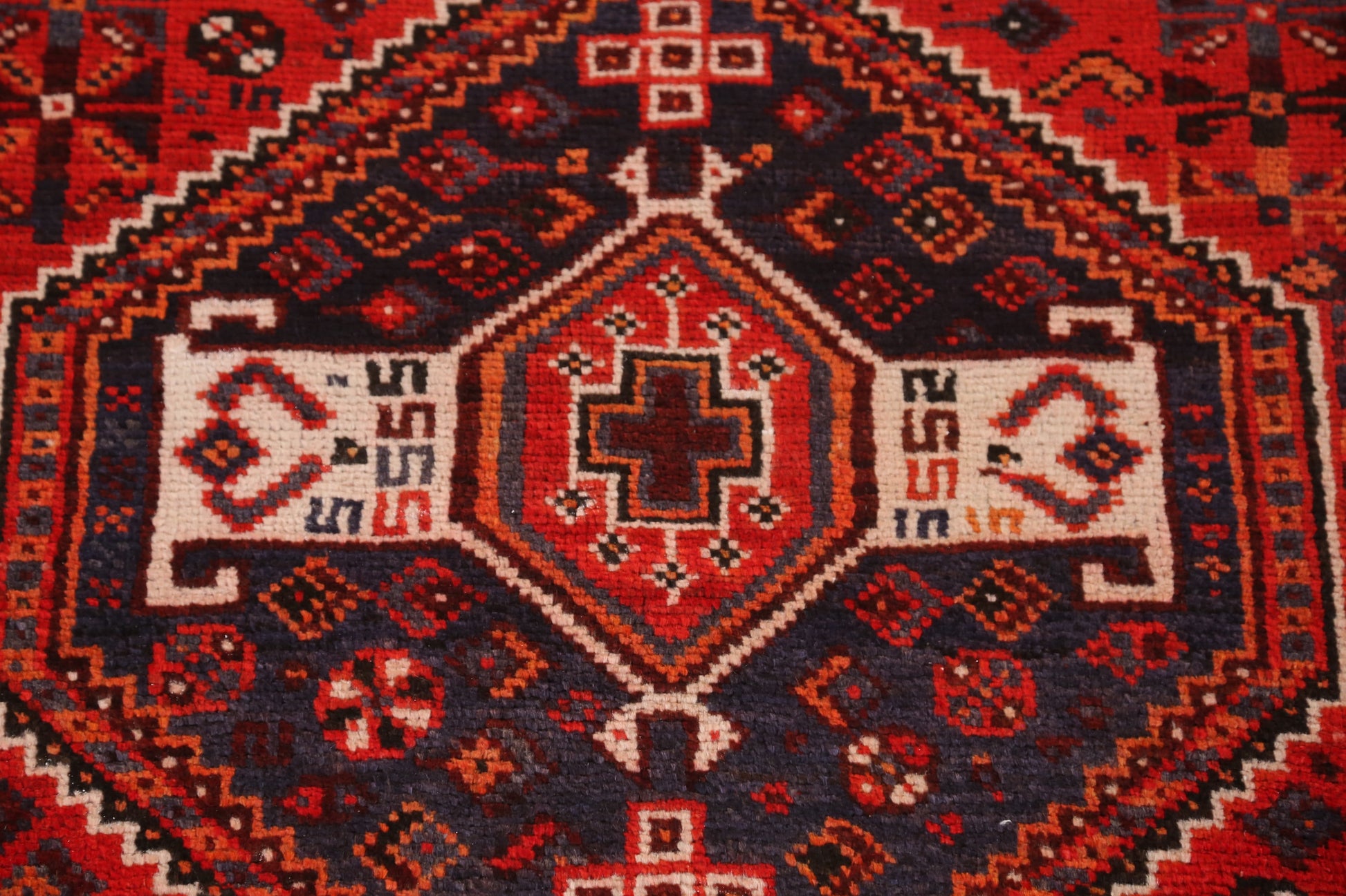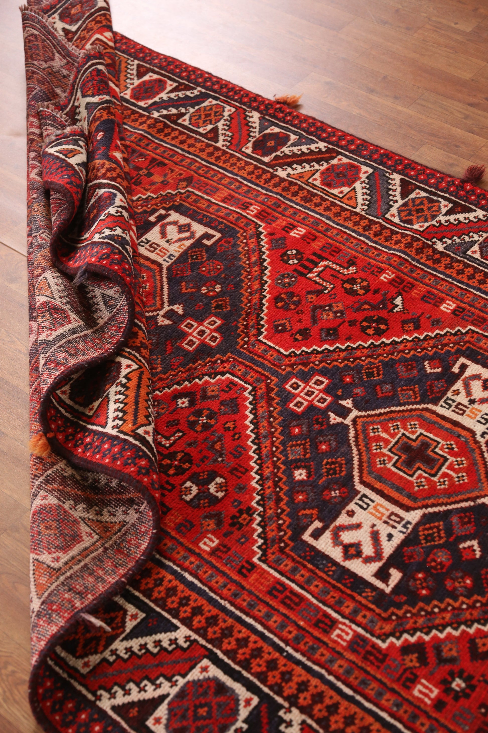 A Beautiful Genuine Persia ( Persia ) Shiraz rug is Hand Knotted by skillful weavers in Persia ( Persia ) with 100% Wool Material. This rug is in Very Good condition. dimensions are 9' 5'' X 4' 4'' in foot and 287 X 132 in centimeter. the primary color is Oranges & Rust.