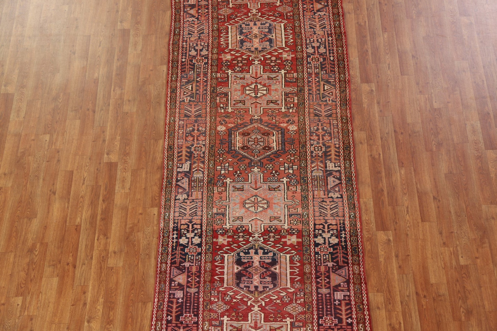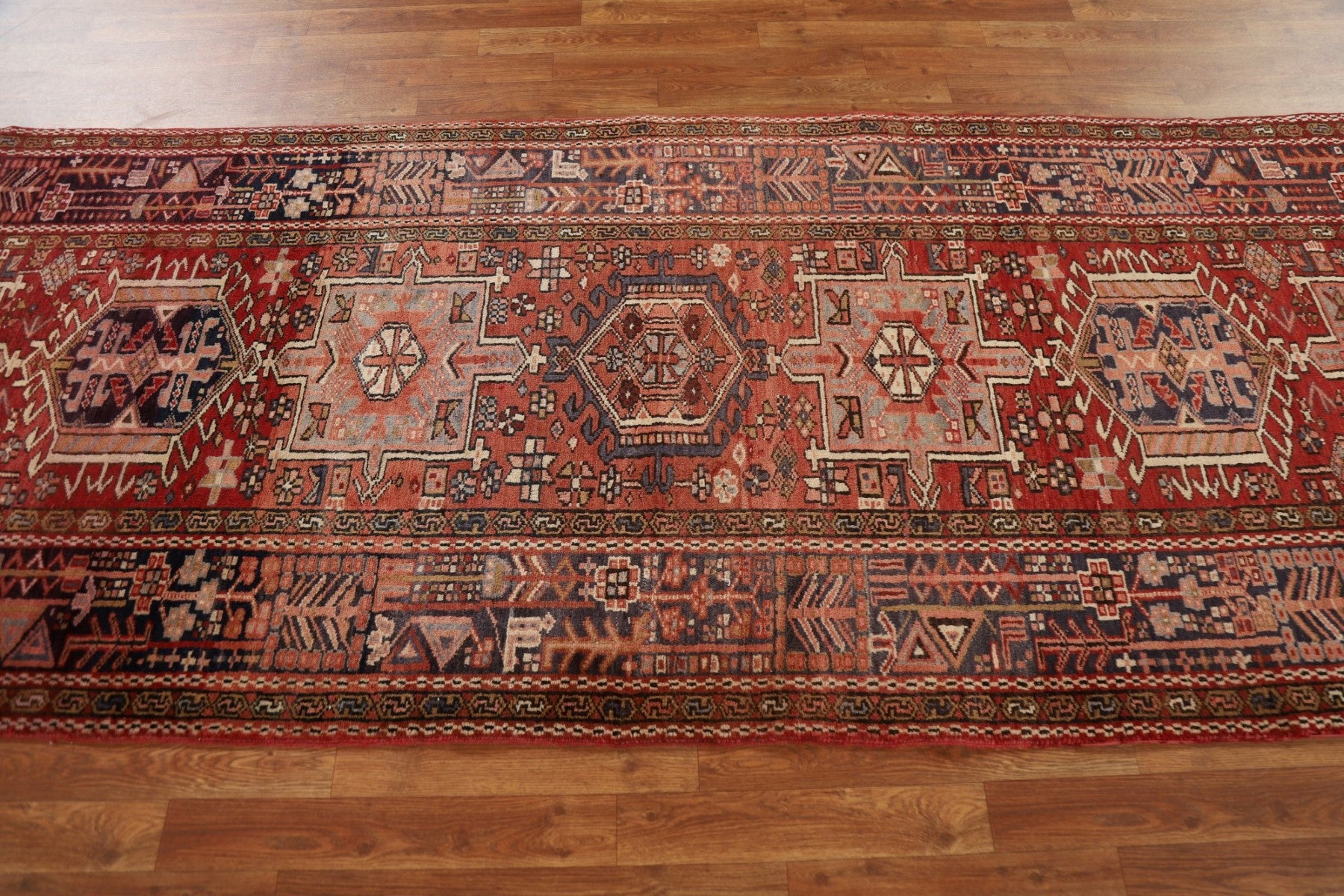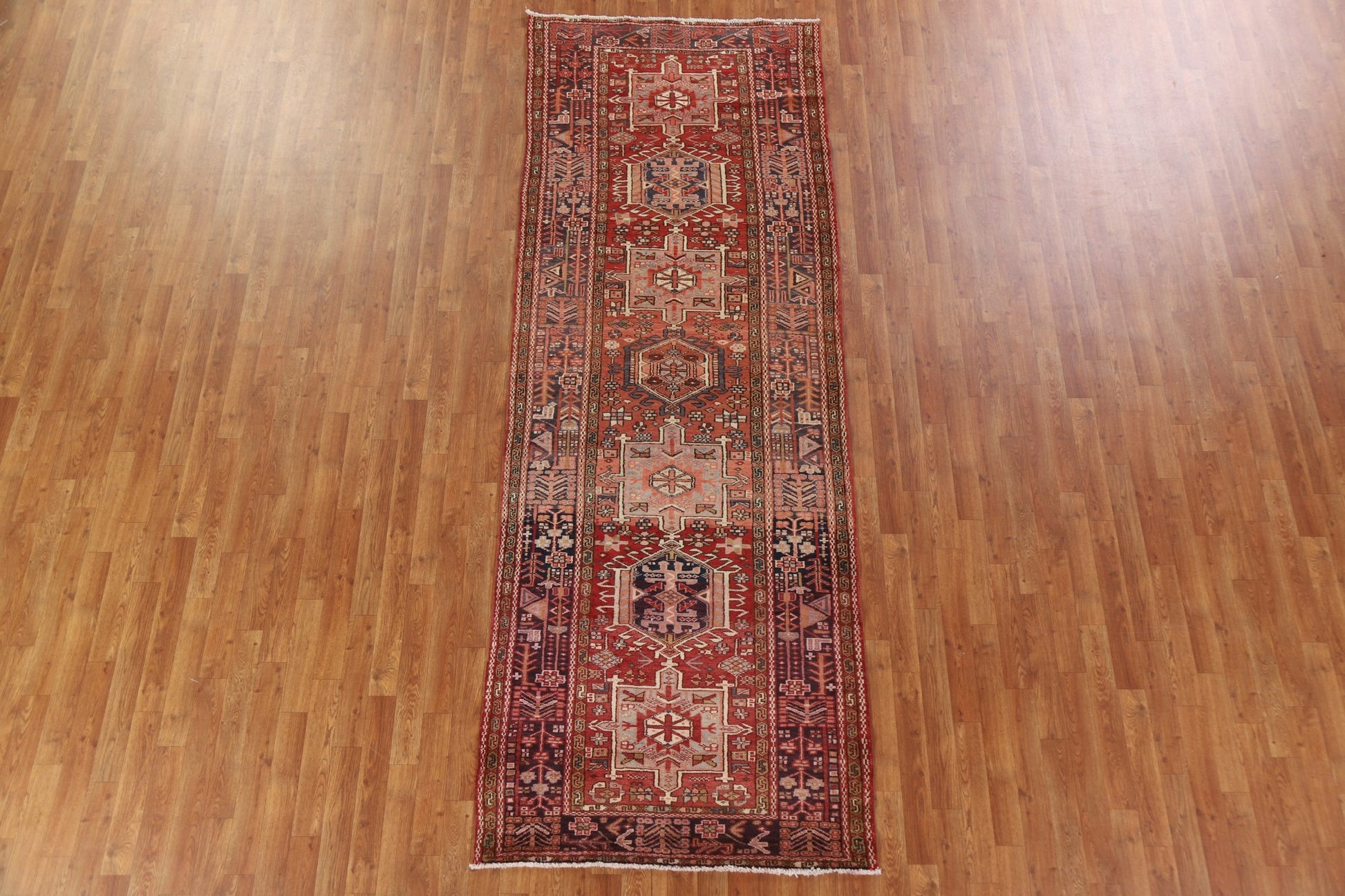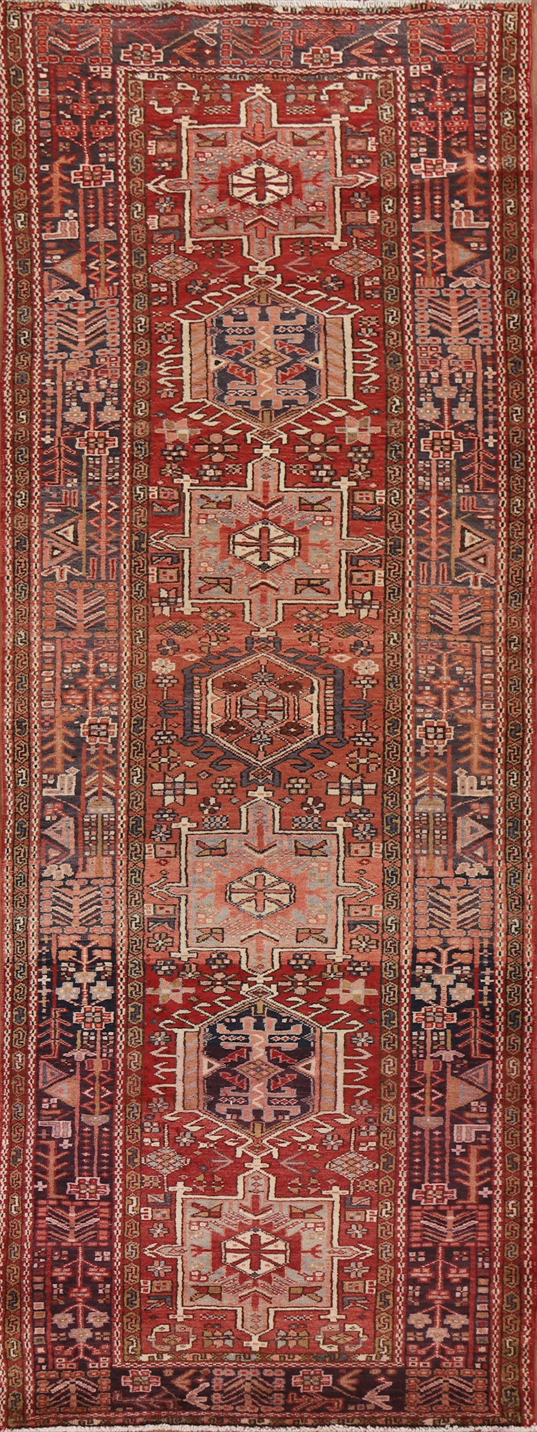 A Beautiful Genuine Persia ( Persia ) Gharajeh rug is Hand Knotted by skillful weavers in Persia ( Persia ) with 100% Wool Material. This rug is in Very Good condition. dimensions are 10' 7'' X 3' 10'' in foot and 323 X 117 in centimeter. the primary color is Red.