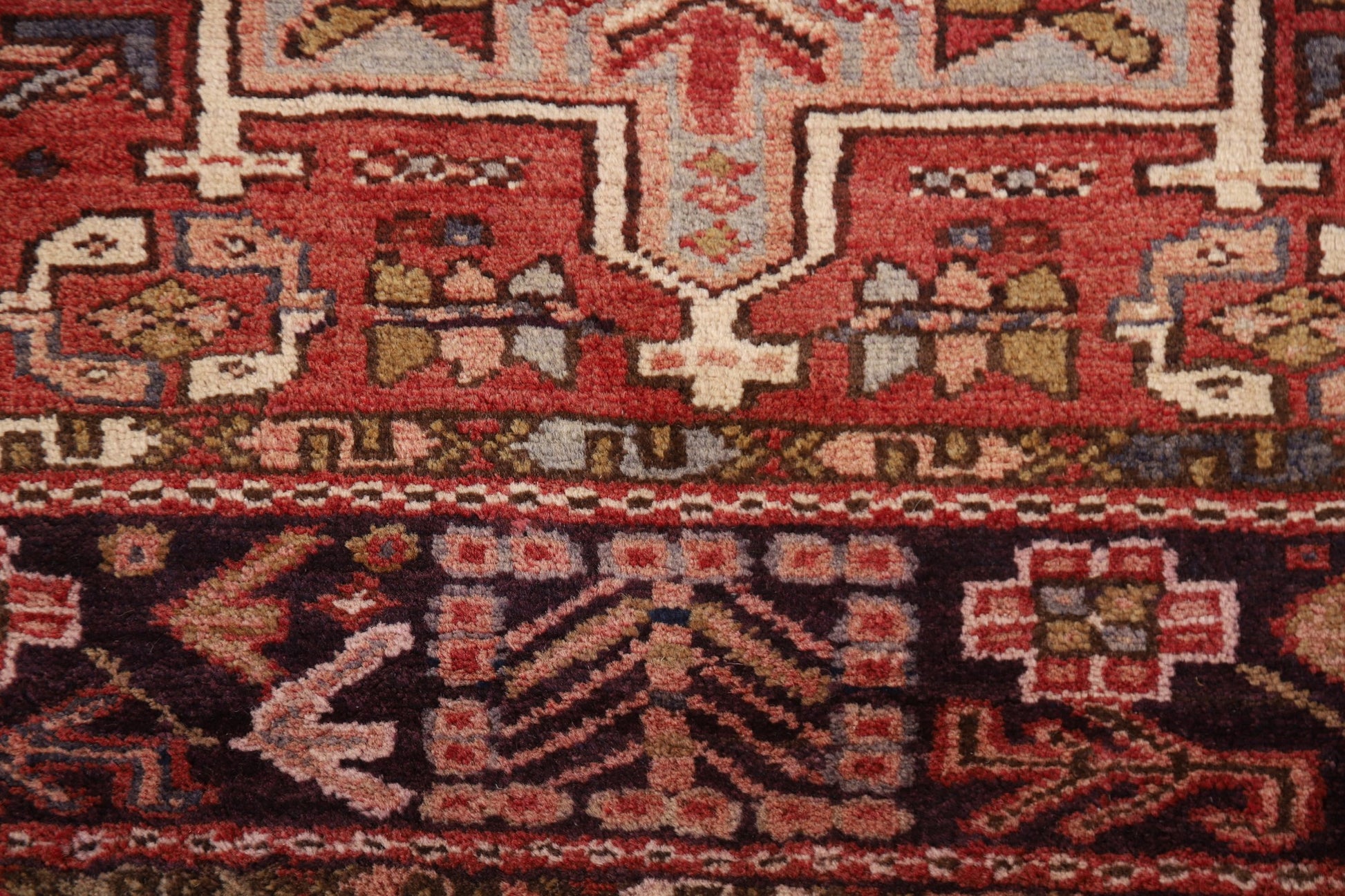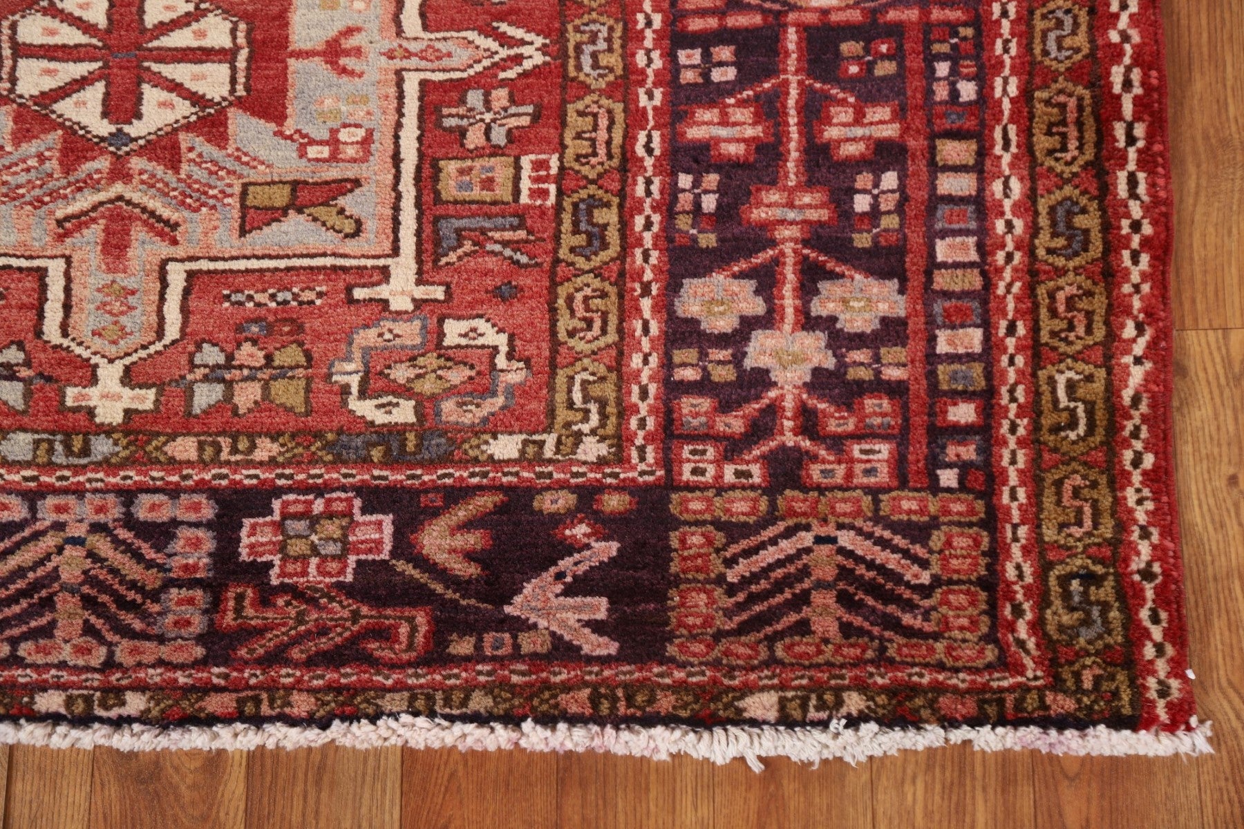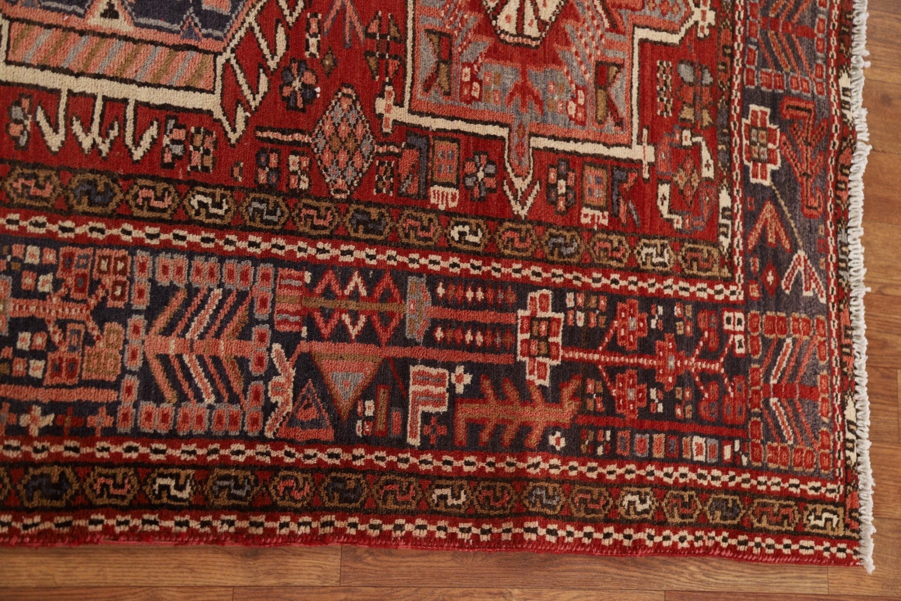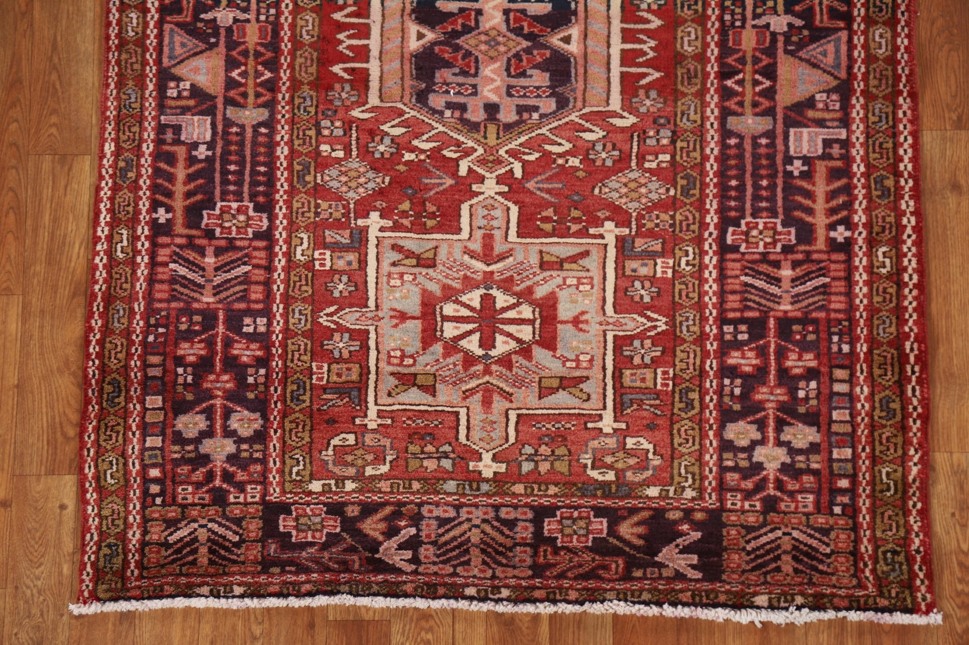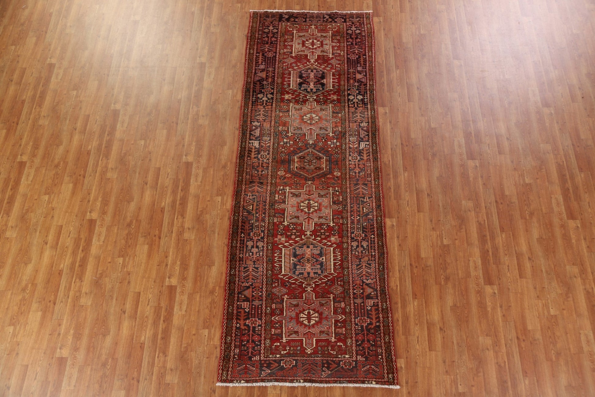 A Beautiful Genuine Persia ( Persia ) Gharajeh rug is Hand Knotted by skillful weavers in Persia ( Persia ) with 100% Wool Material. This rug is in Very Good condition. dimensions are 10' 7'' X 3' 10'' in foot and 323 X 117 in centimeter. the primary color is Red.