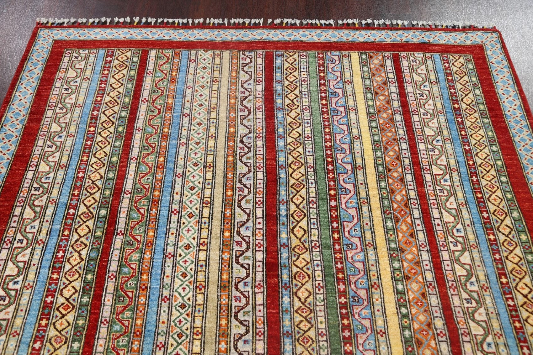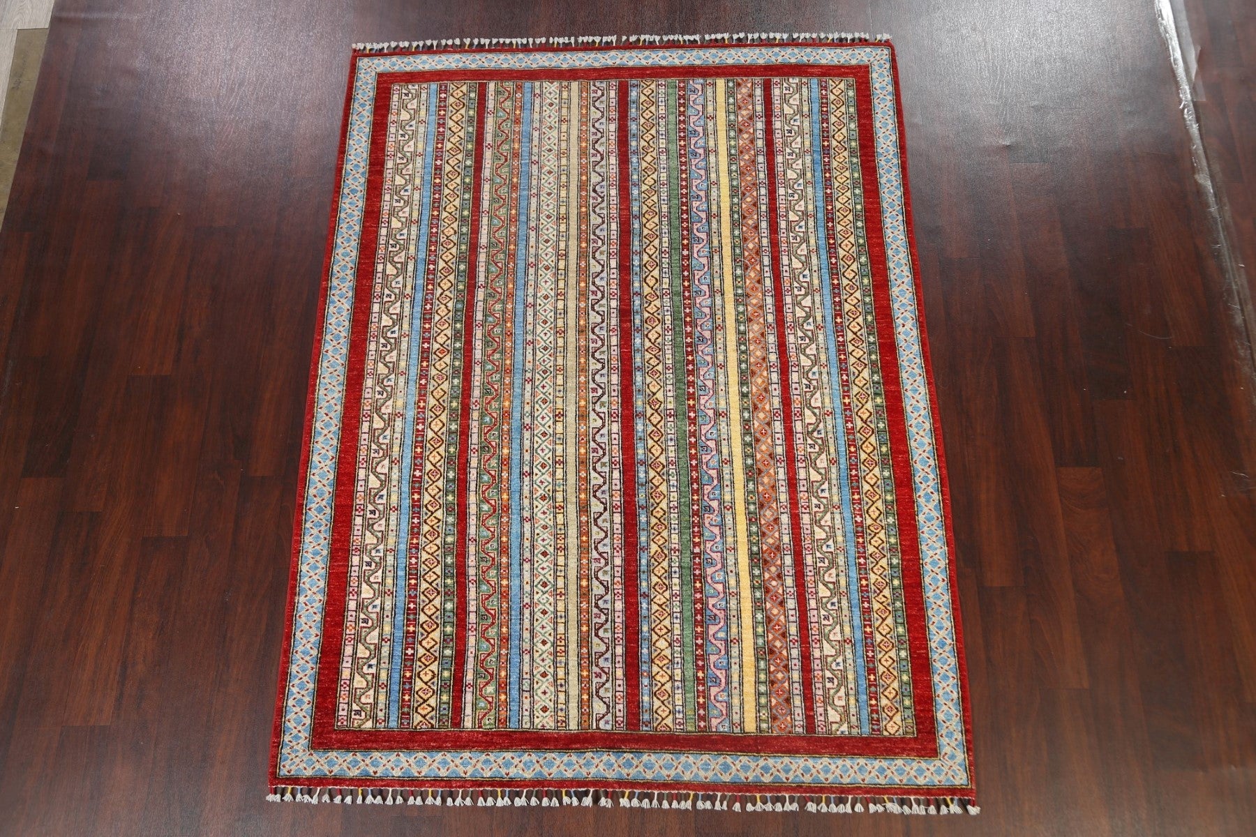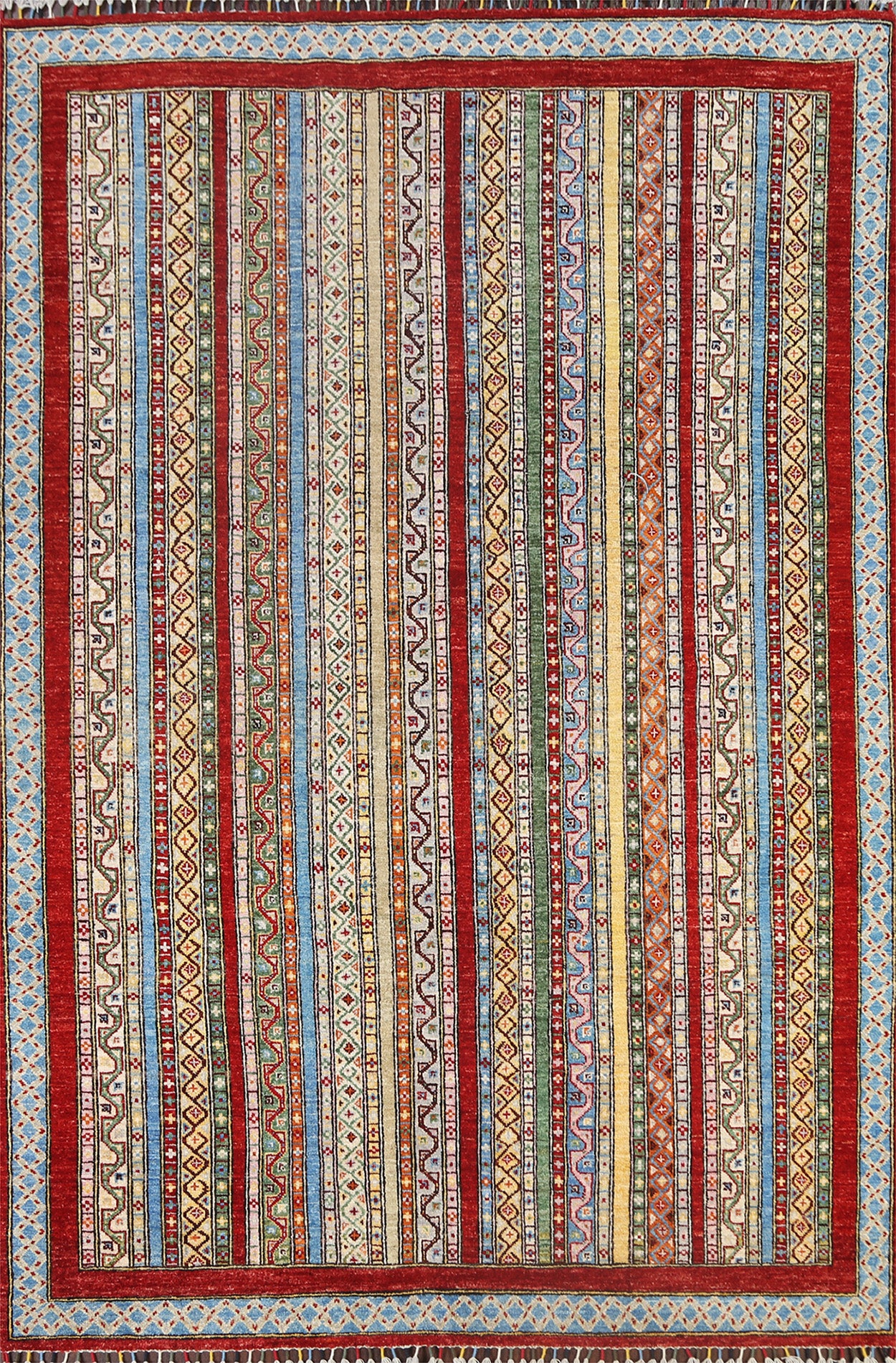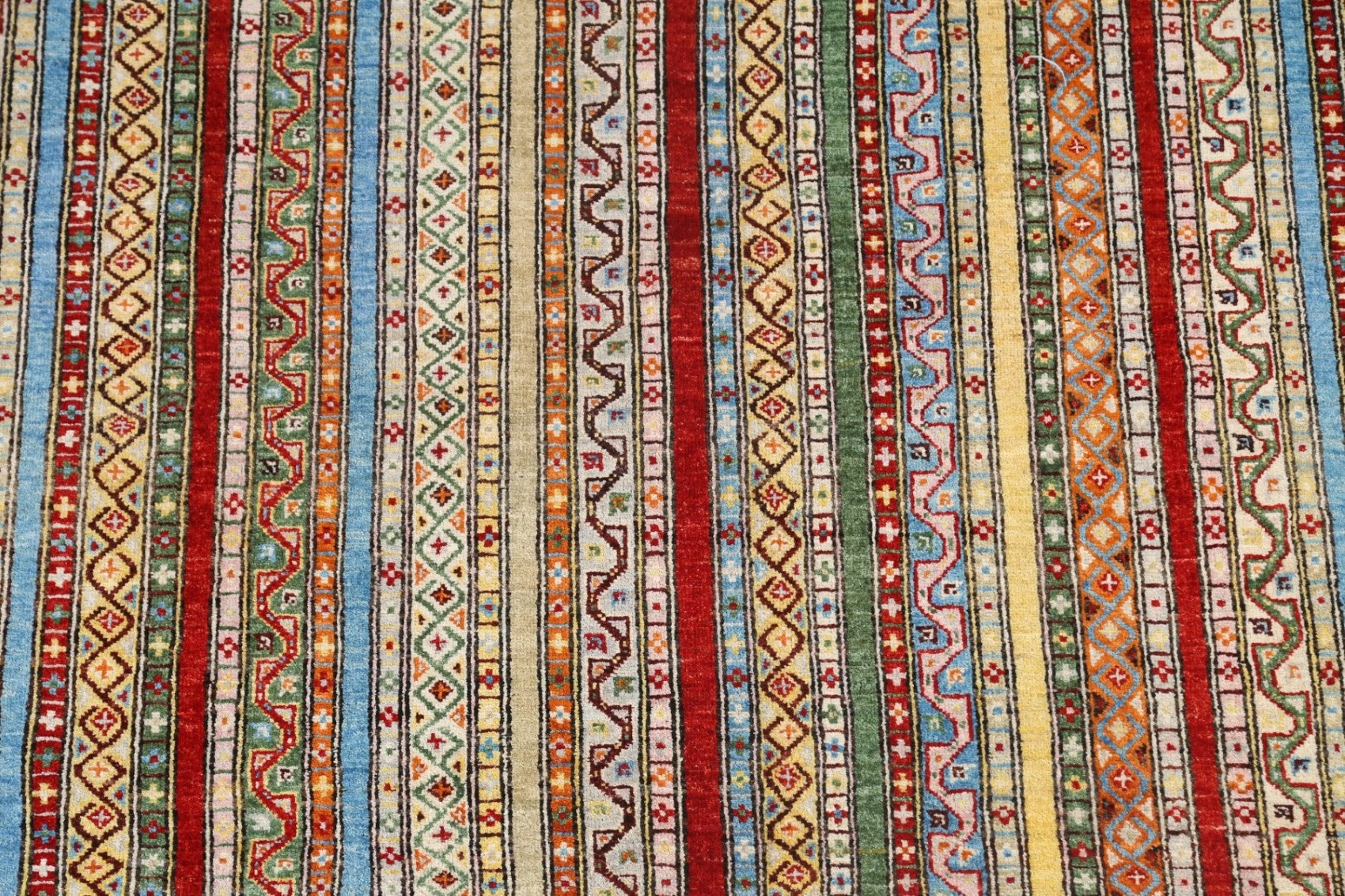 A Beautiful Genuine Pakistan Kazak rug is Hand Knotted by skillful weavers in Pakistan with 100% Wool Material. This rug is in New, First Quality condition. dimensions are 7' 8'' X 5' 10'' in foot and 234 X 178 in centimeter. the primary color is Multi-Colored.