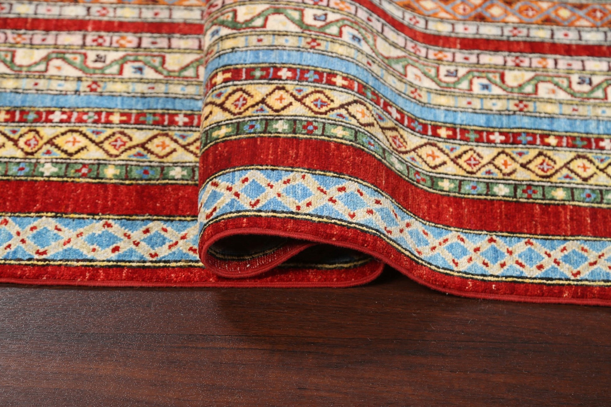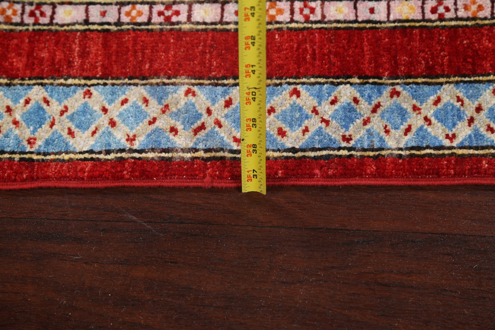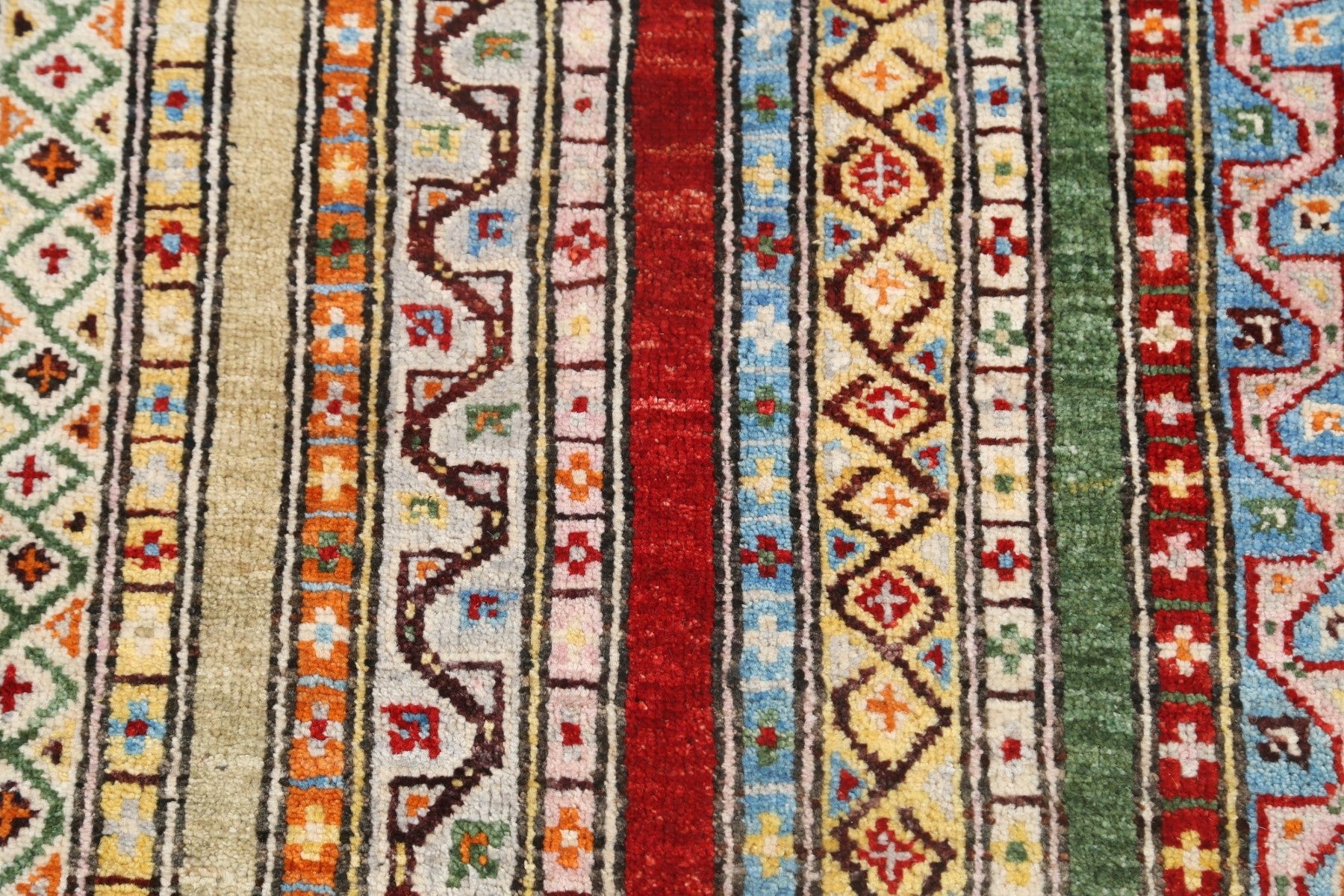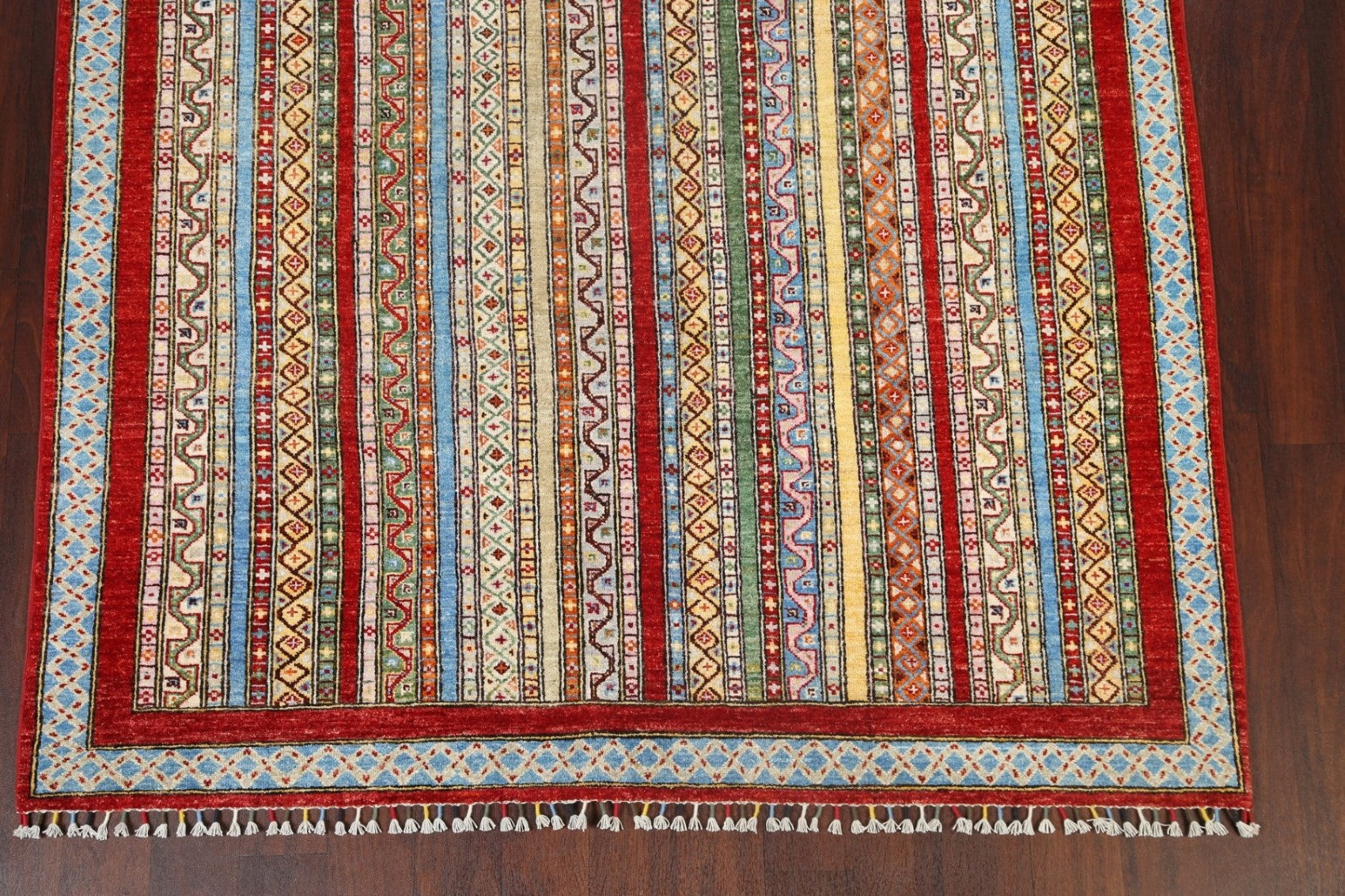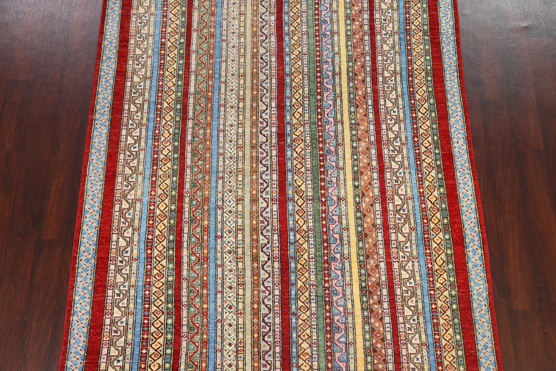 A Beautiful Genuine Pakistan Kazak rug is Hand Knotted by skillful weavers in Pakistan with 100% Wool Material. This rug is in New, First Quality condition. dimensions are 7' 8'' X 5' 10'' in foot and 234 X 178 in centimeter. the primary color is Multi-Colored.