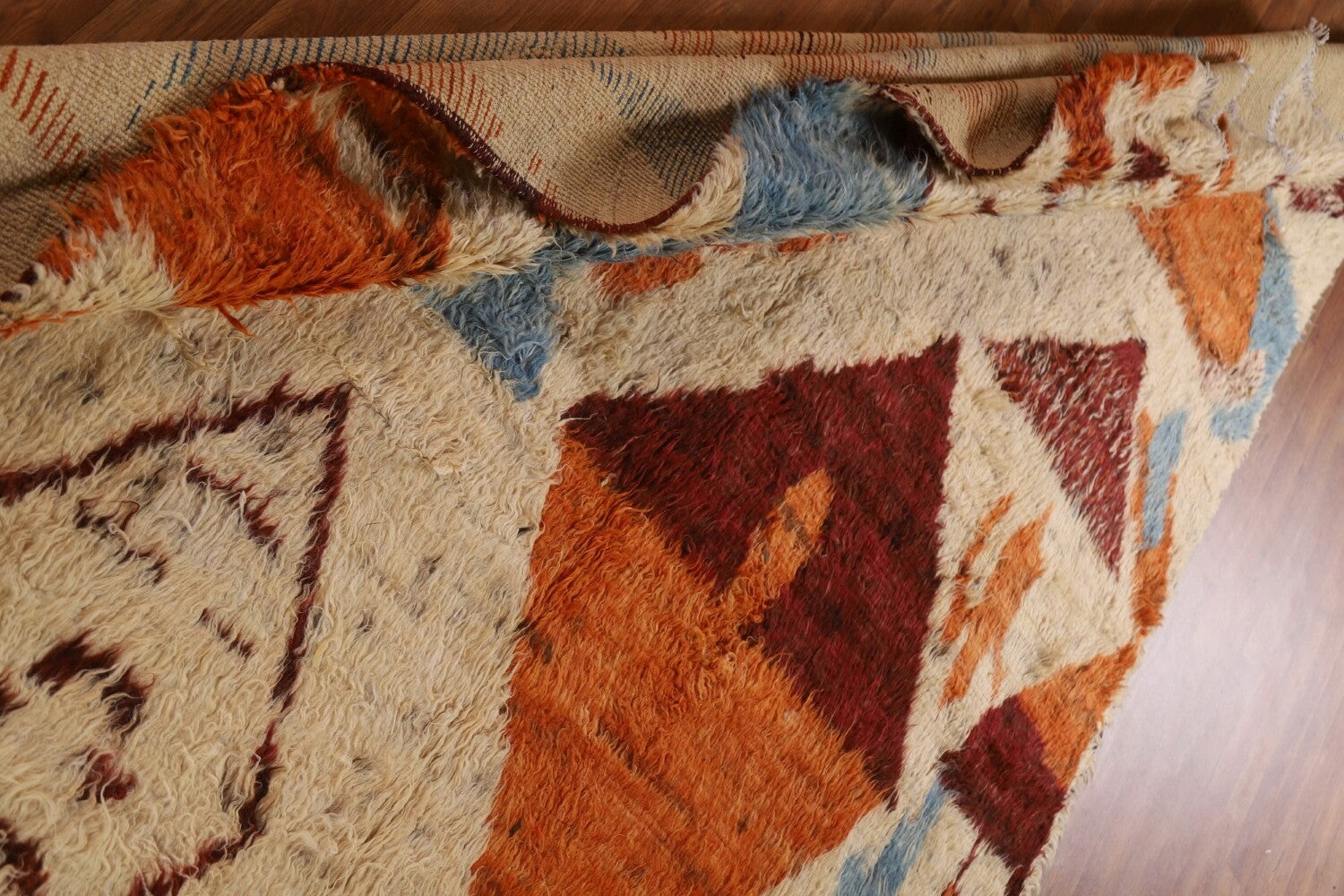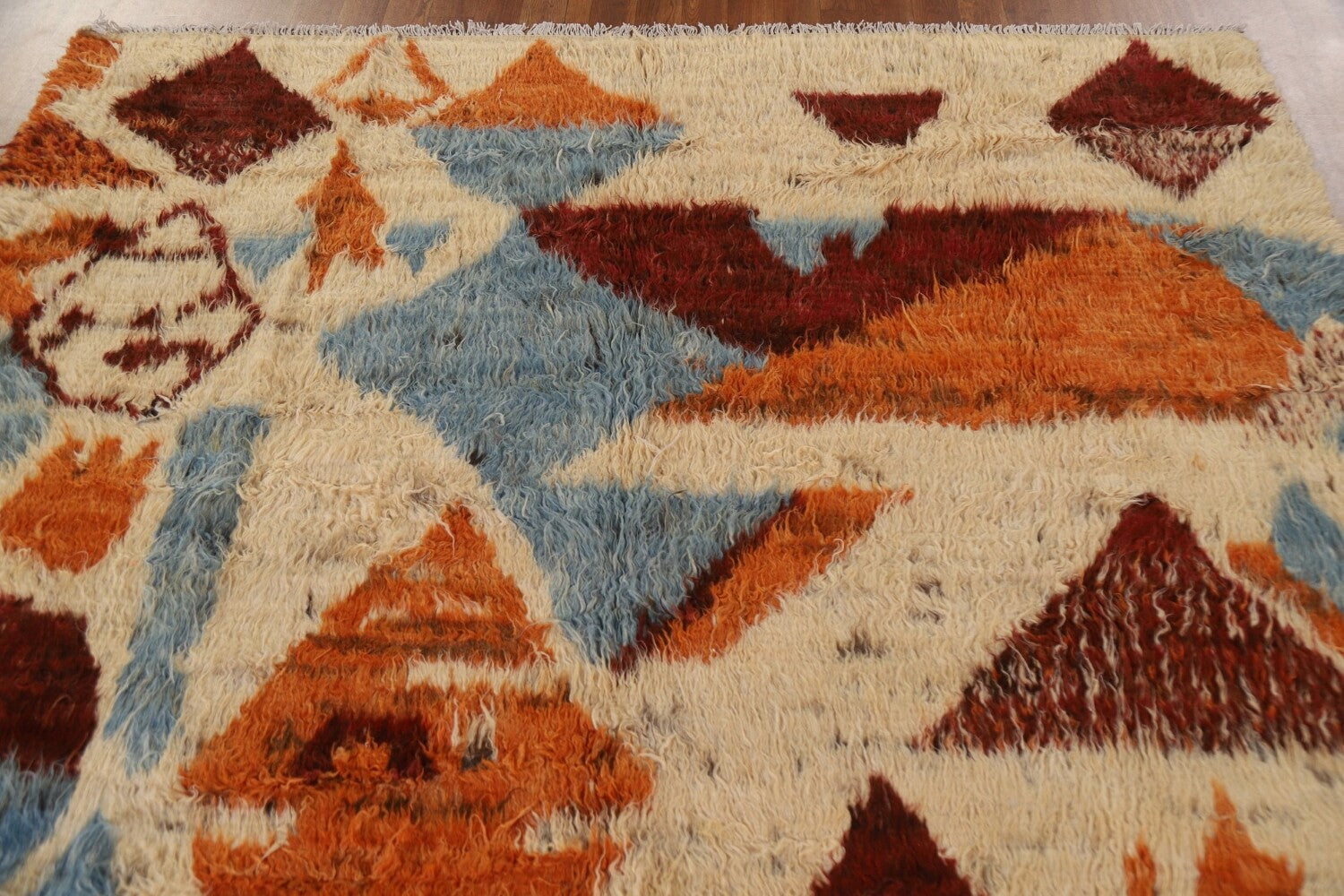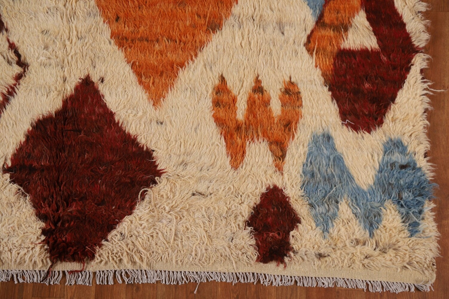 A Beautiful Genuine Pakistan Moroccan rug is Hand Knotted by skillful weavers in Pakistan with 100% Wool Material. This rug is in condition. dimensions are 9' 11'' X 6' 9'' in foot and 302 X 206 in centimeter. the primary color is Beige & Ivories.