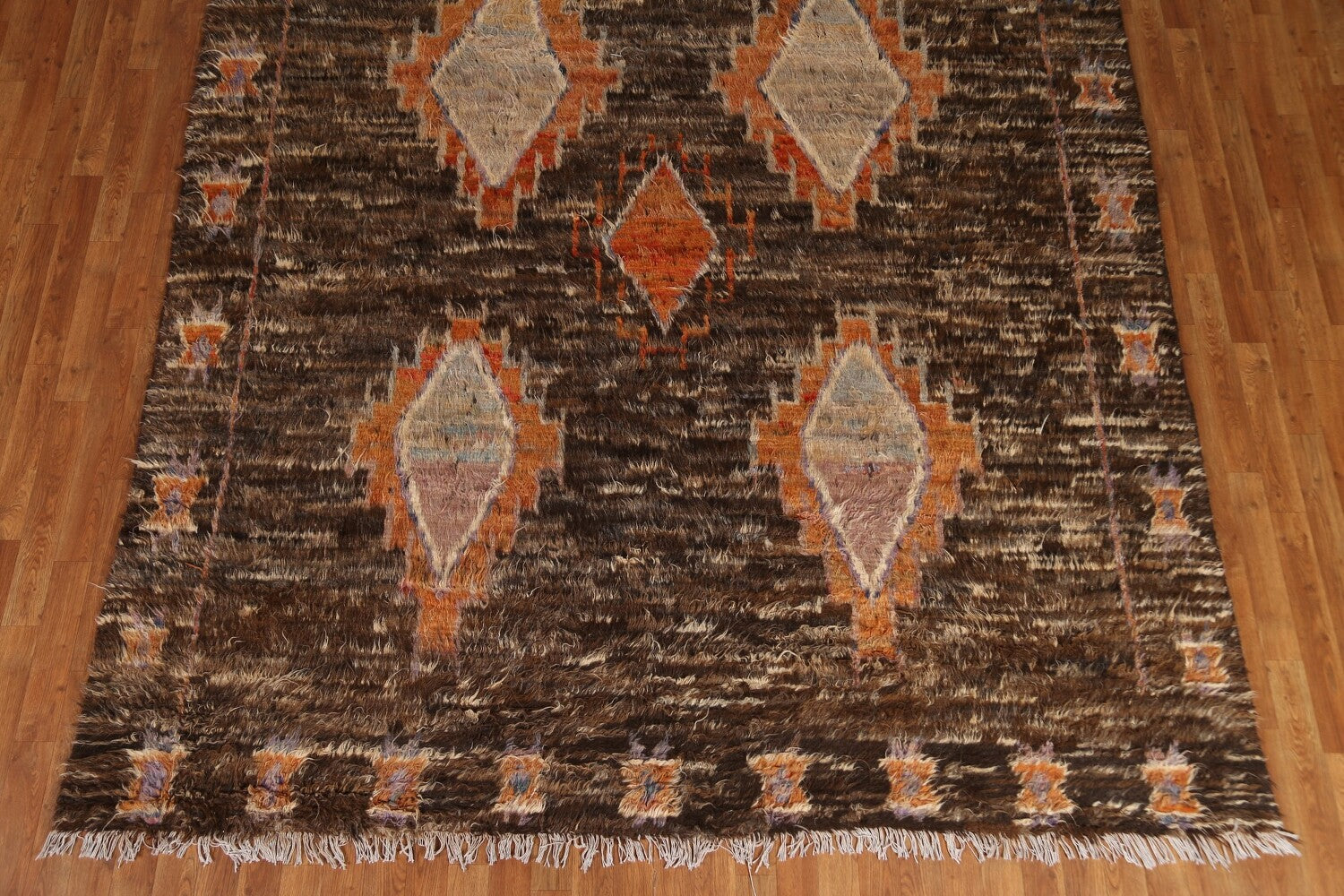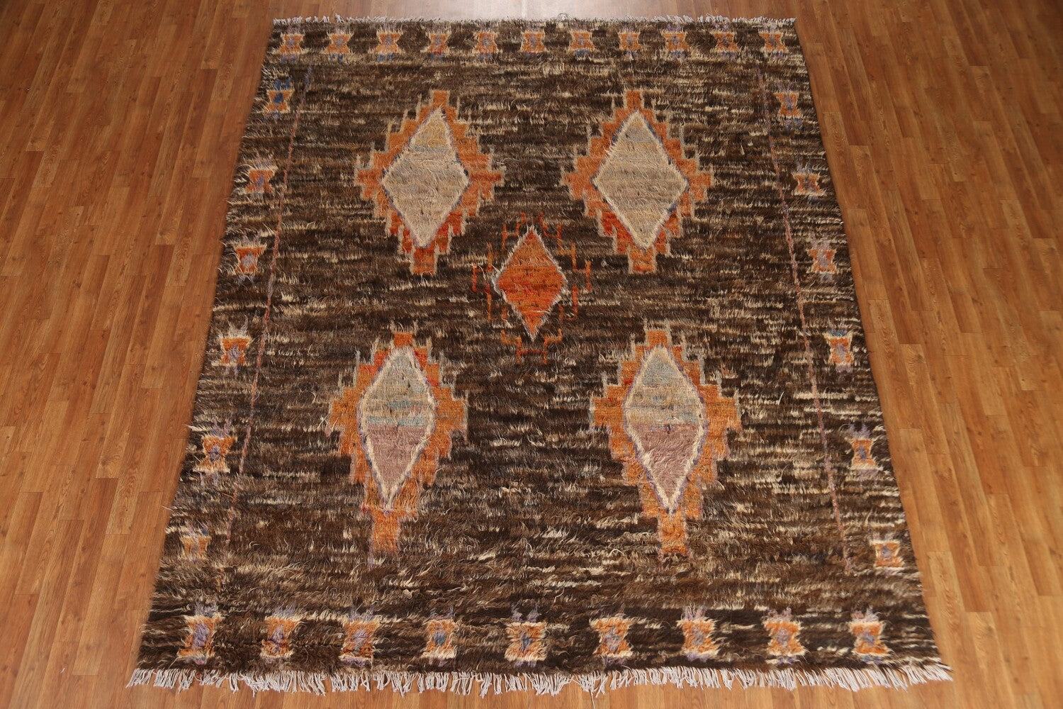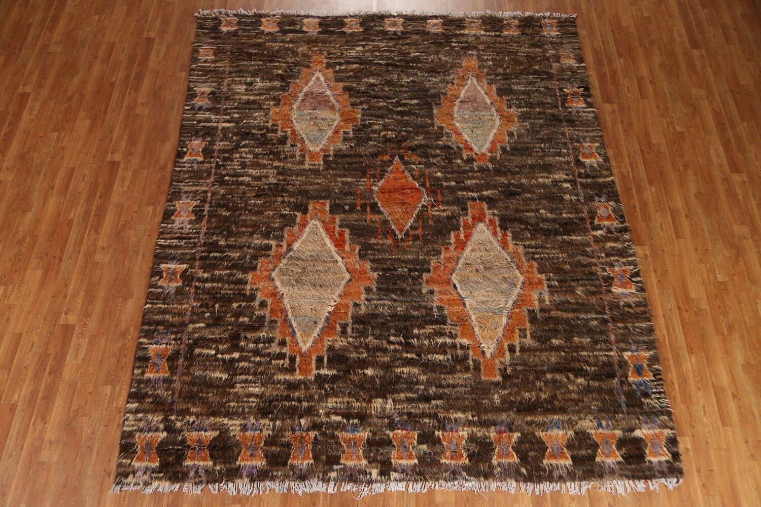 A Beautiful Genuine Pakistan Moroccan rug is Hand Knotted by skillful weavers in Pakistan with 100% Wool Material. This rug is in New, First Quality condition. dimensions are 9' 6'' X 8' 3'' in foot and 290 X 251 in centimeter. the primary color is Brown.