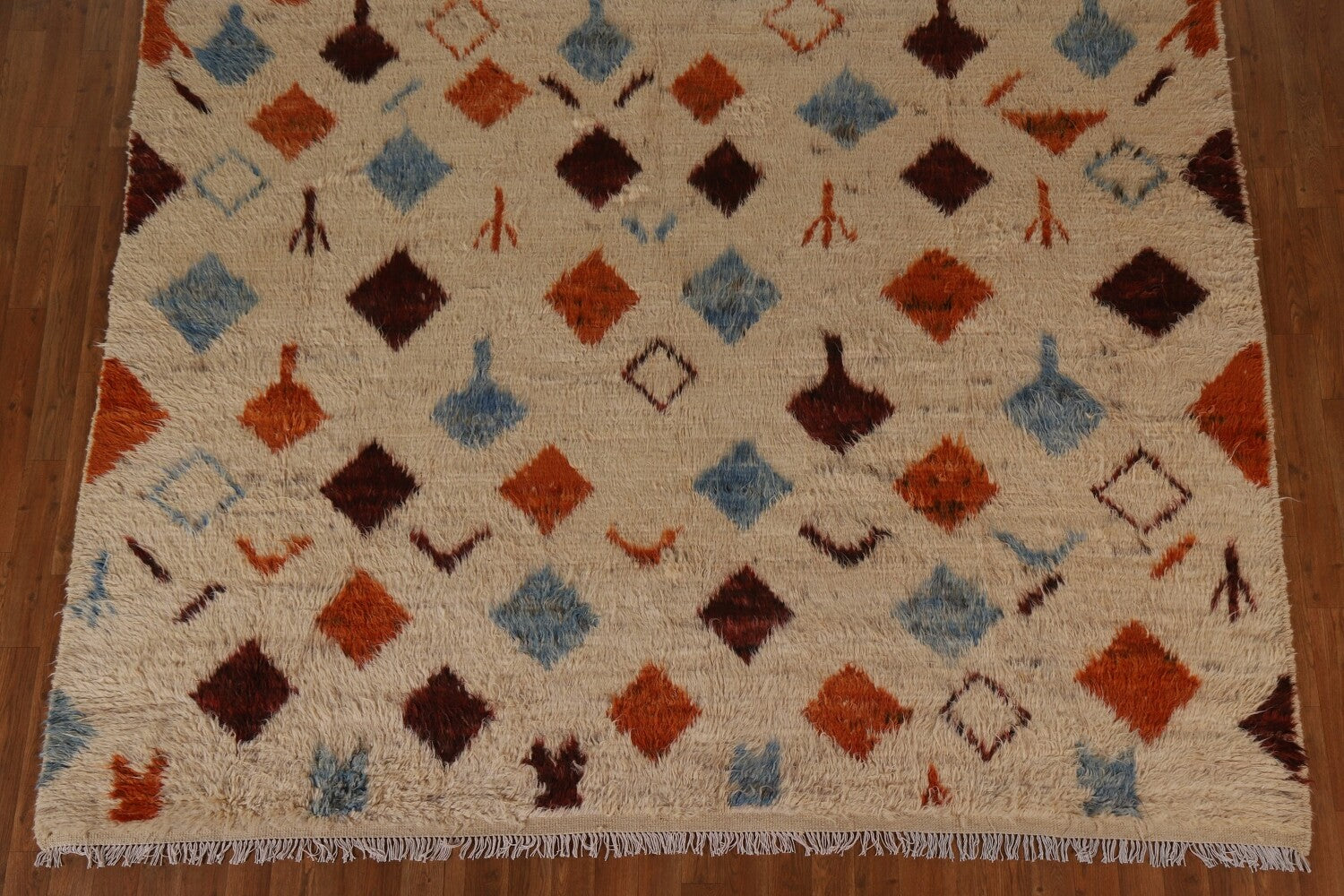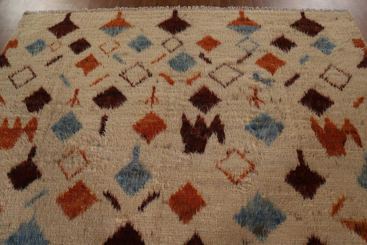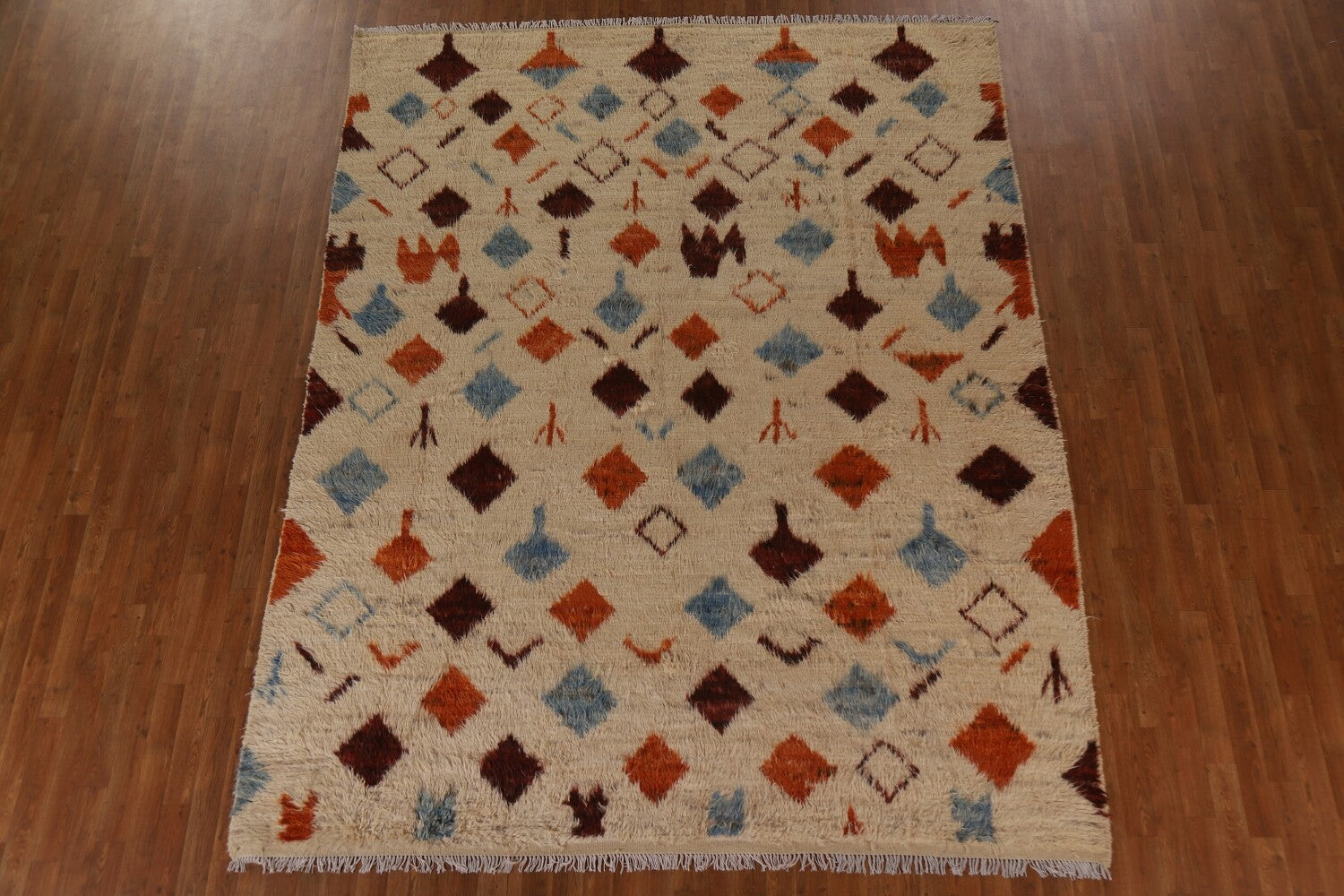 A Beautiful Genuine Pakistan Moroccan rug is Hand Knotted by skillful weavers in Pakistan with 100% Wool Material. This rug is in condition. dimensions are 10' 3'' X 8' 1'' in foot and 312 X 246 in centimeter. the primary color is Beige & Ivories.