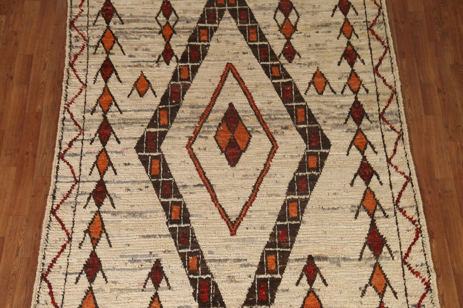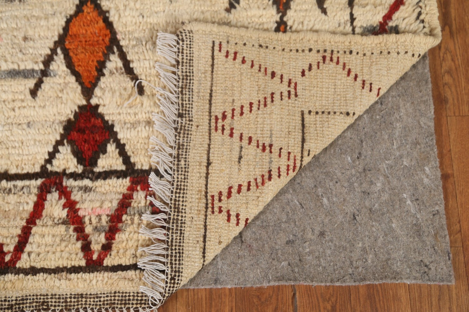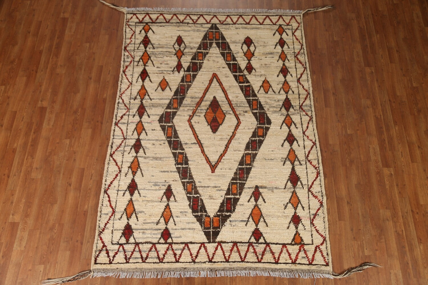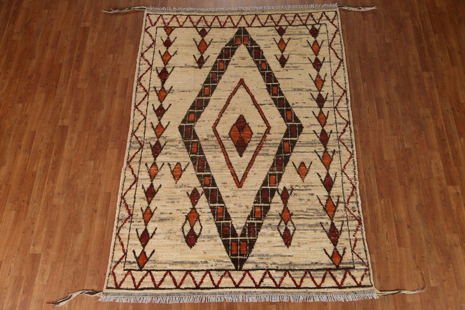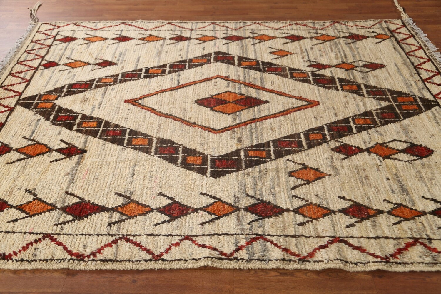 A Beautiful Genuine Pakistan Moroccan rug is Hand Knotted by skillful weavers in Pakistan with 100% Wool Material. This rug is in condition. dimensions are 8' 0'' X 5' 8'' in foot and 244 X 173 in centimeter. the primary color is Beige & Ivories.