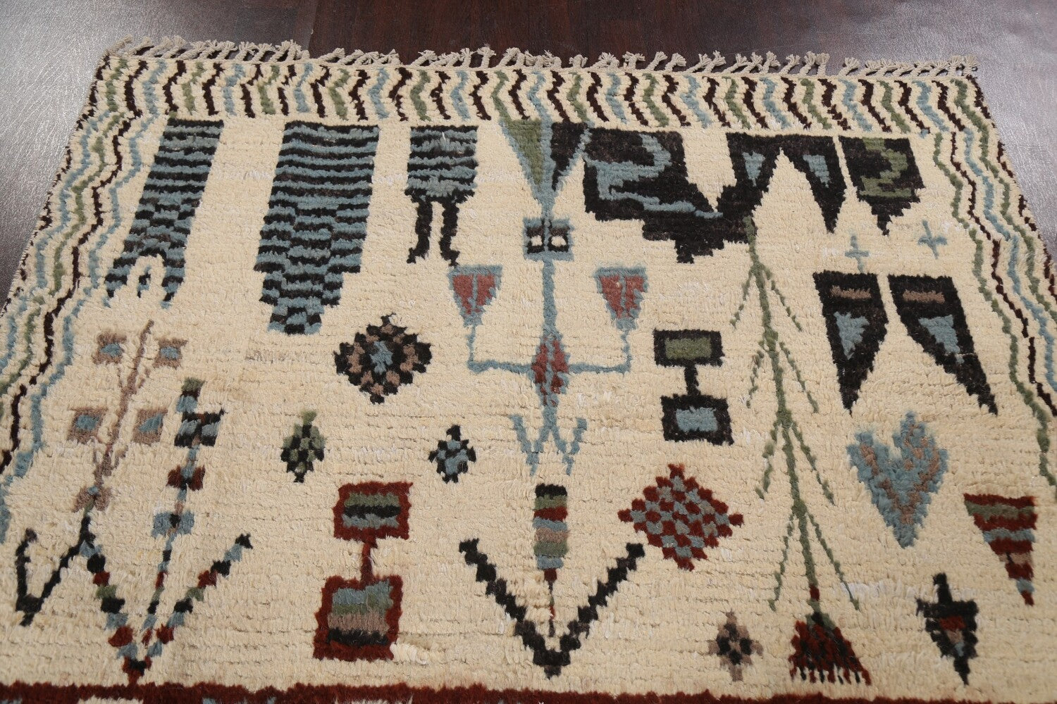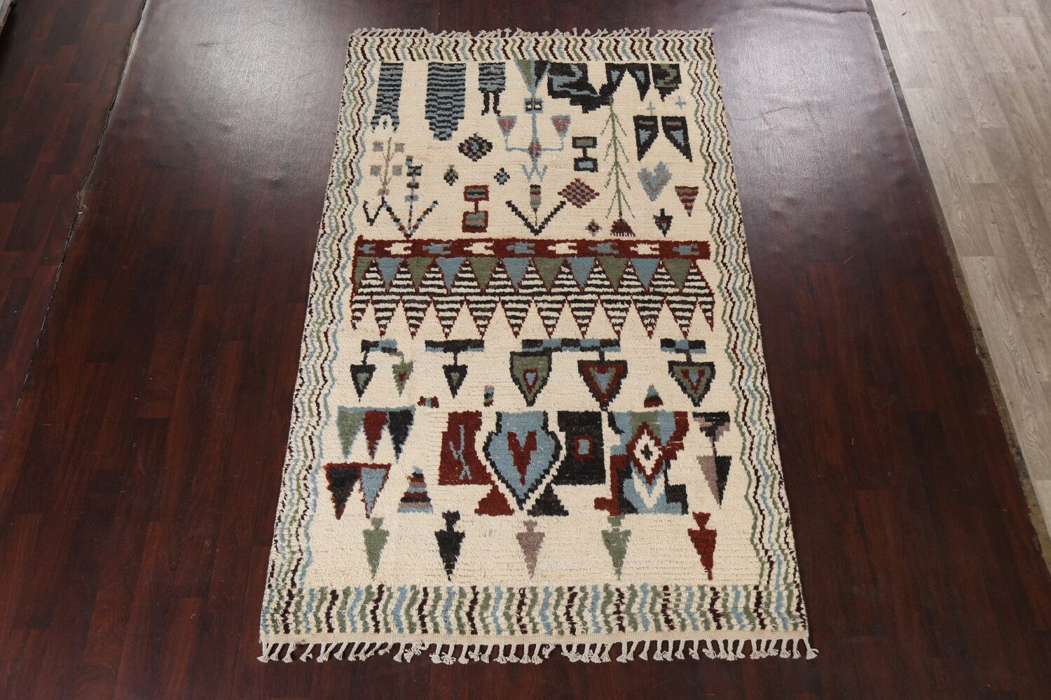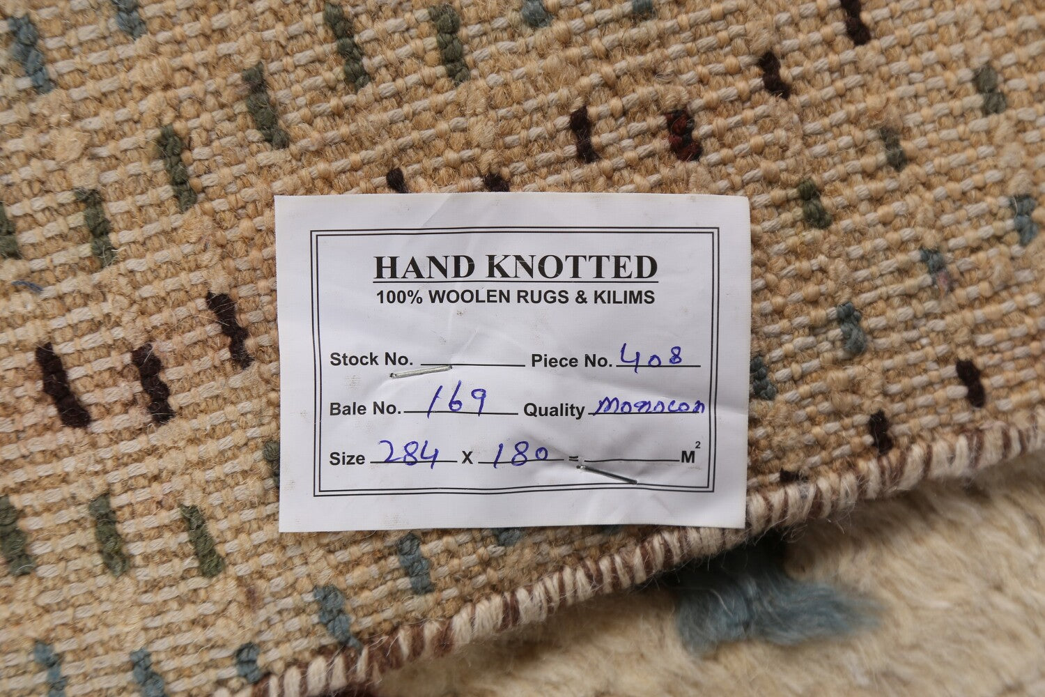A Beautiful Genuine Morocco Moroccan rug is Hand Knotted by skillful weavers in Morocco with 100% Wool Material. This rug is in New, First Quality condition. dimensions are 9' 6'' X 5' 11'' in foot and 290 X 180 in centimeter. the primary color is Beige & Ivories.