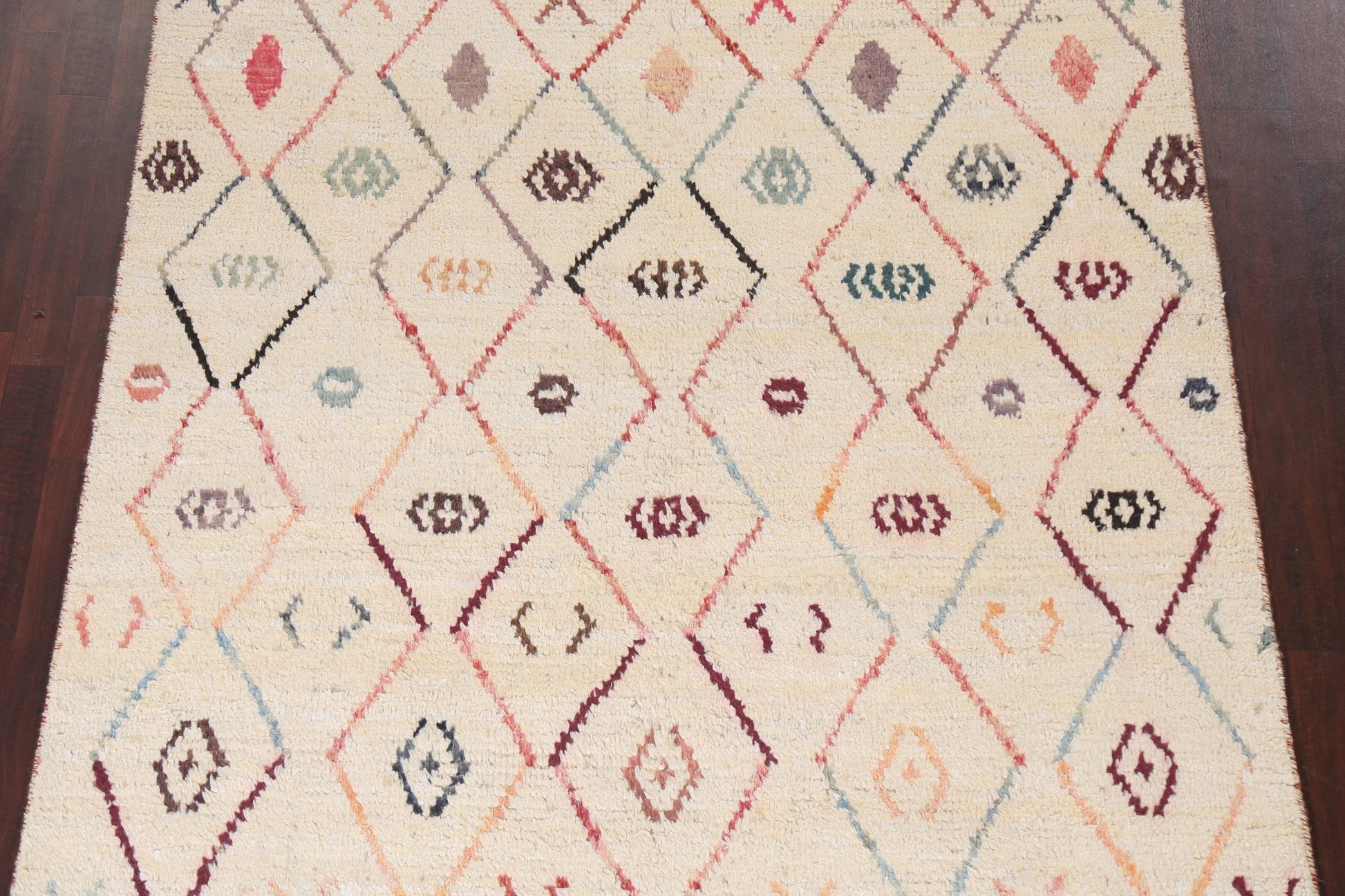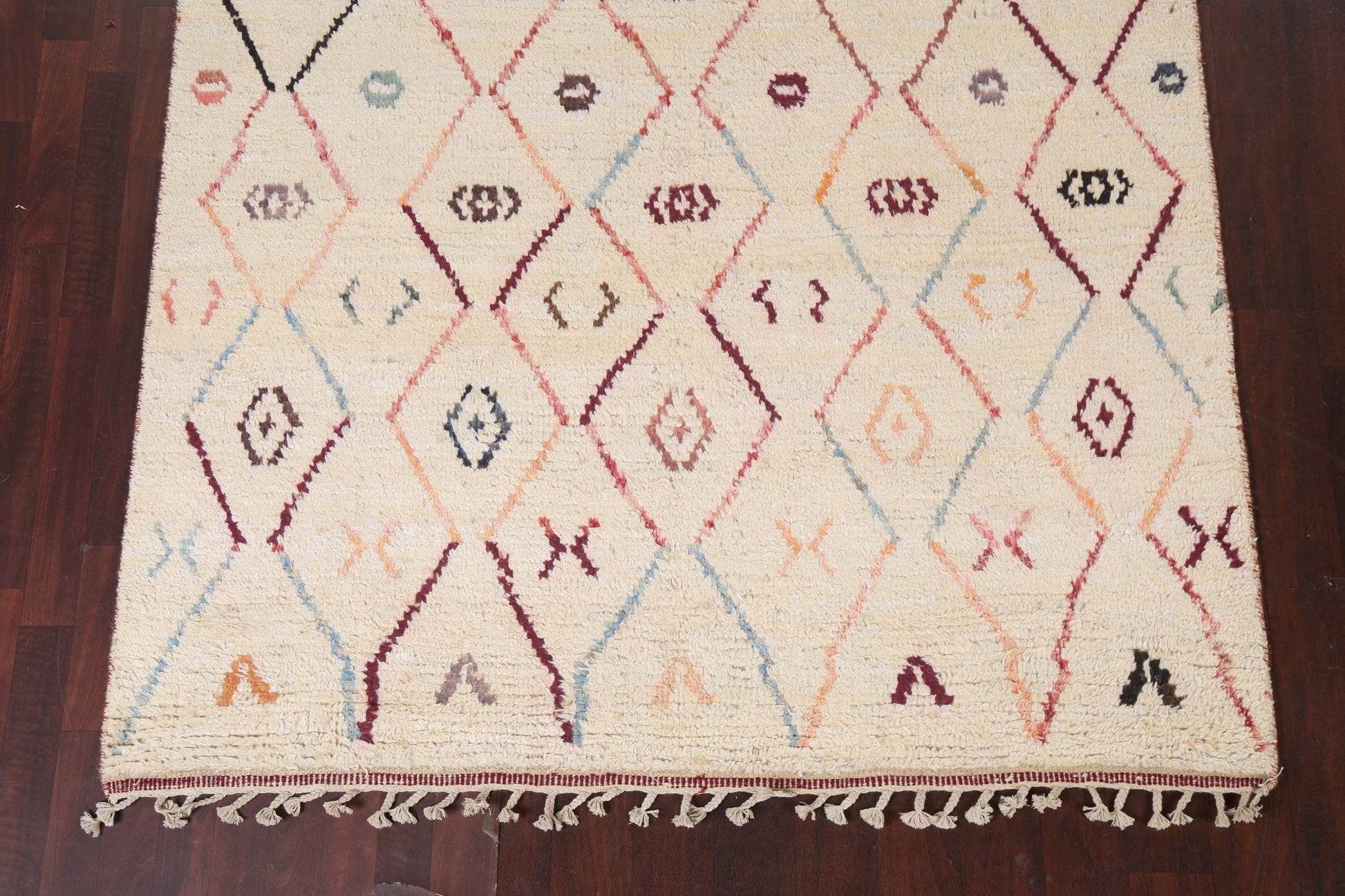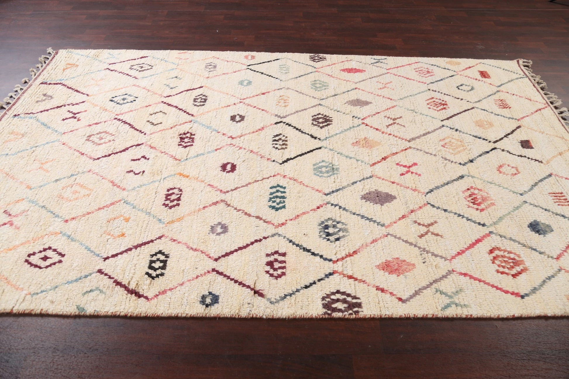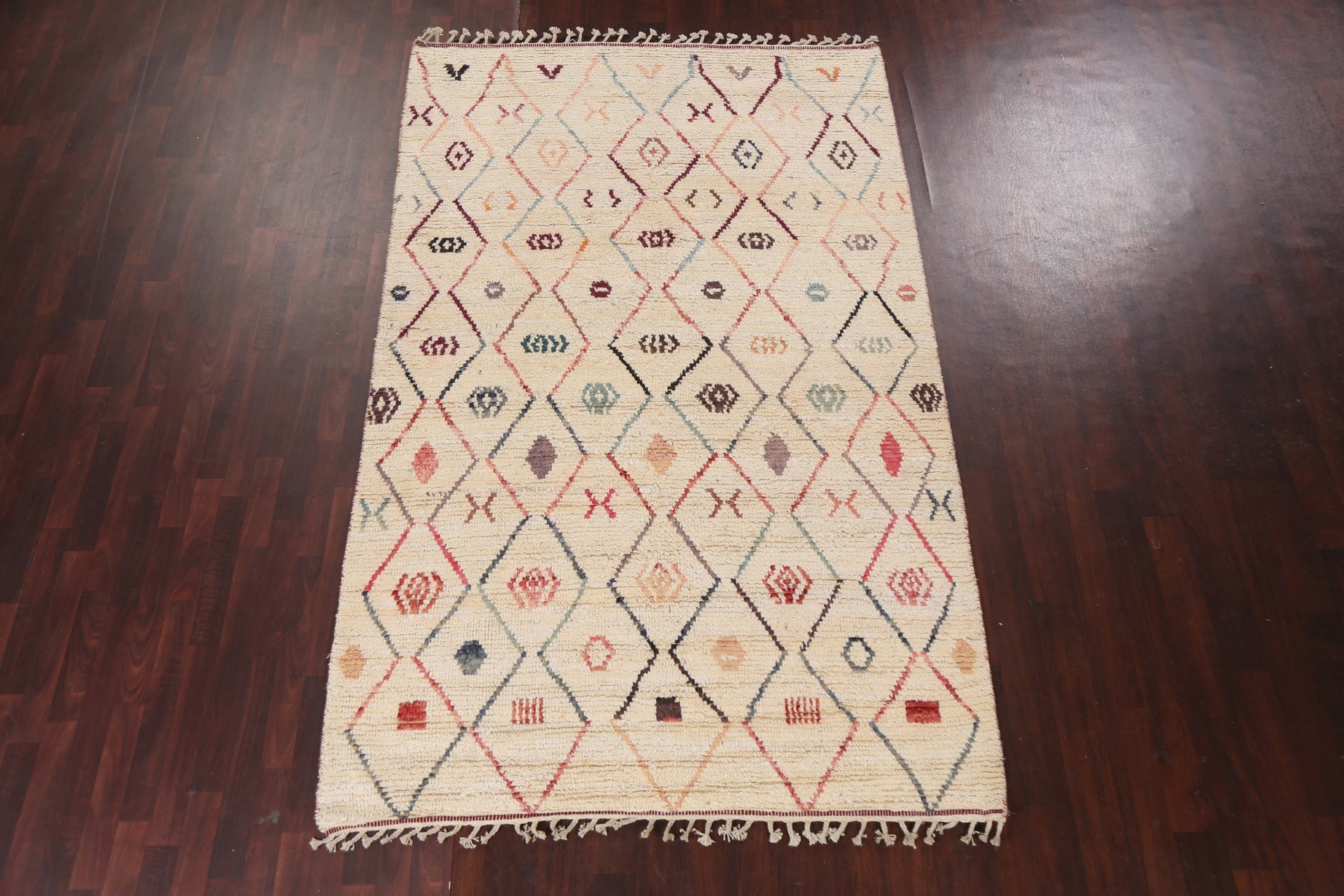 A Beautiful Genuine Morocco Moroccan rug is Hand Knotted by skillful weavers in Morocco with 100% Wool Material. This rug is in New, First Quality condition. dimensions are 9' 6'' X 5' 11'' in foot and 290 X 180 in centimeter. the primary color is Beige & Ivories.