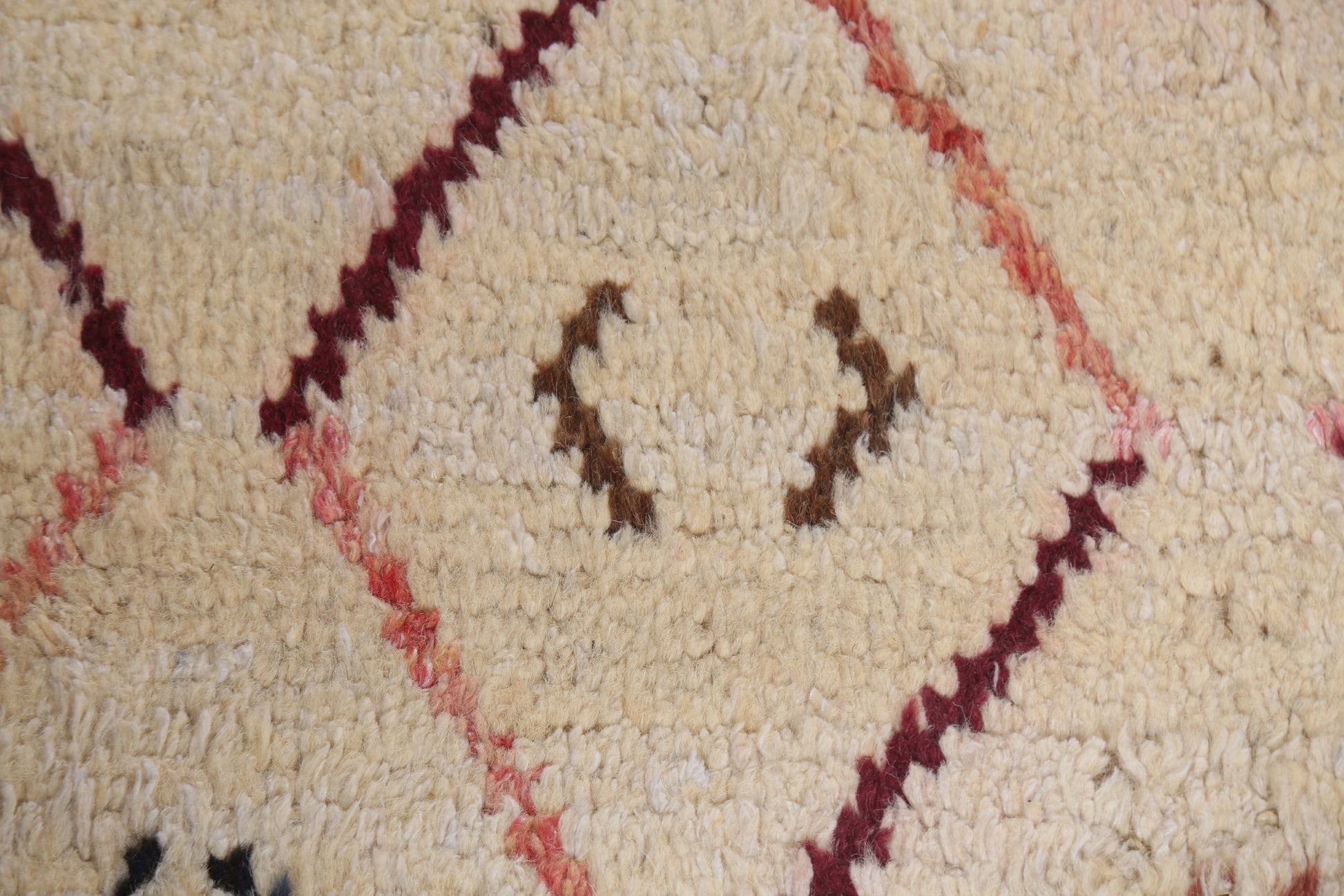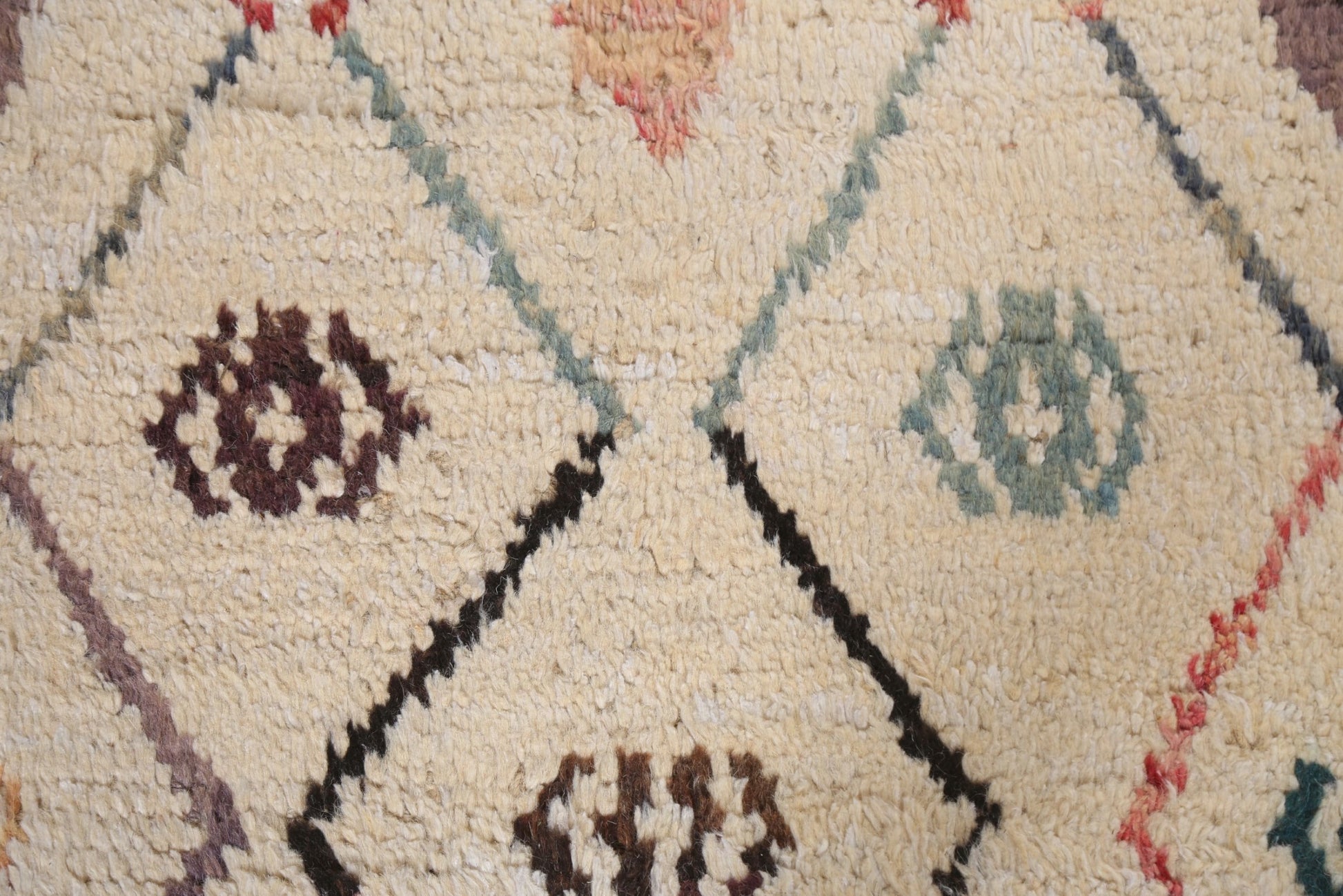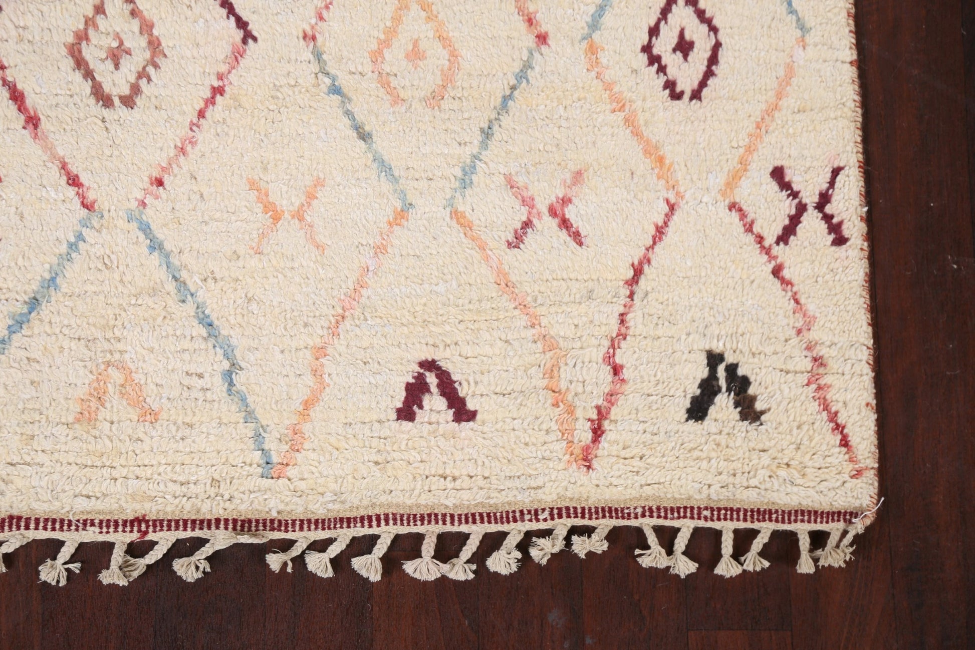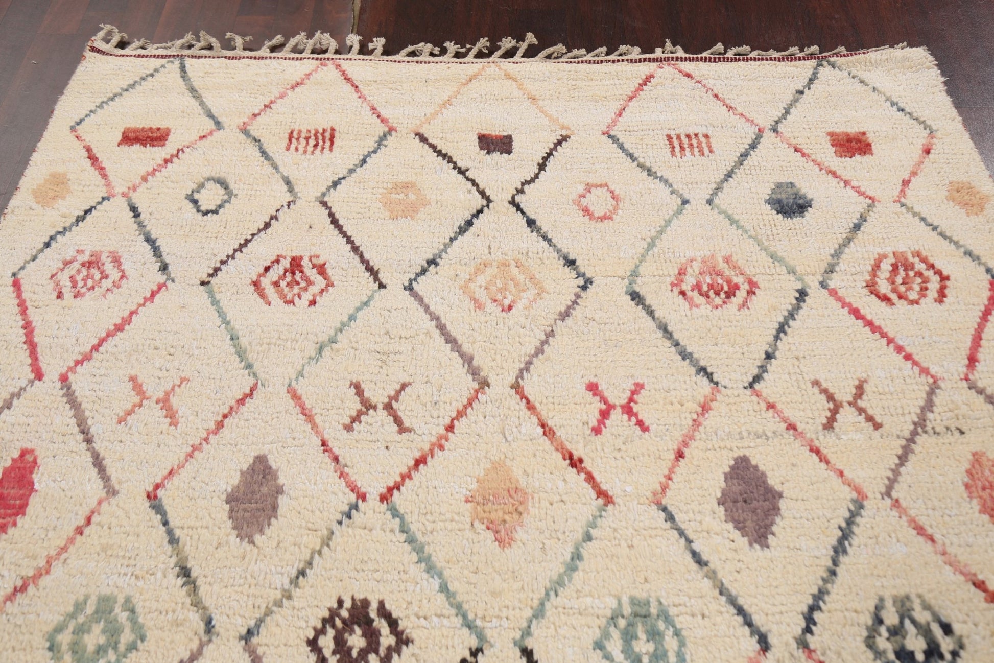 A Beautiful Genuine Morocco Moroccan rug is Hand Knotted by skillful weavers in Morocco with 100% Wool Material. This rug is in New, First Quality condition. dimensions are 9' 6'' X 5' 11'' in foot and 290 X 180 in centimeter. the primary color is Beige & Ivories.