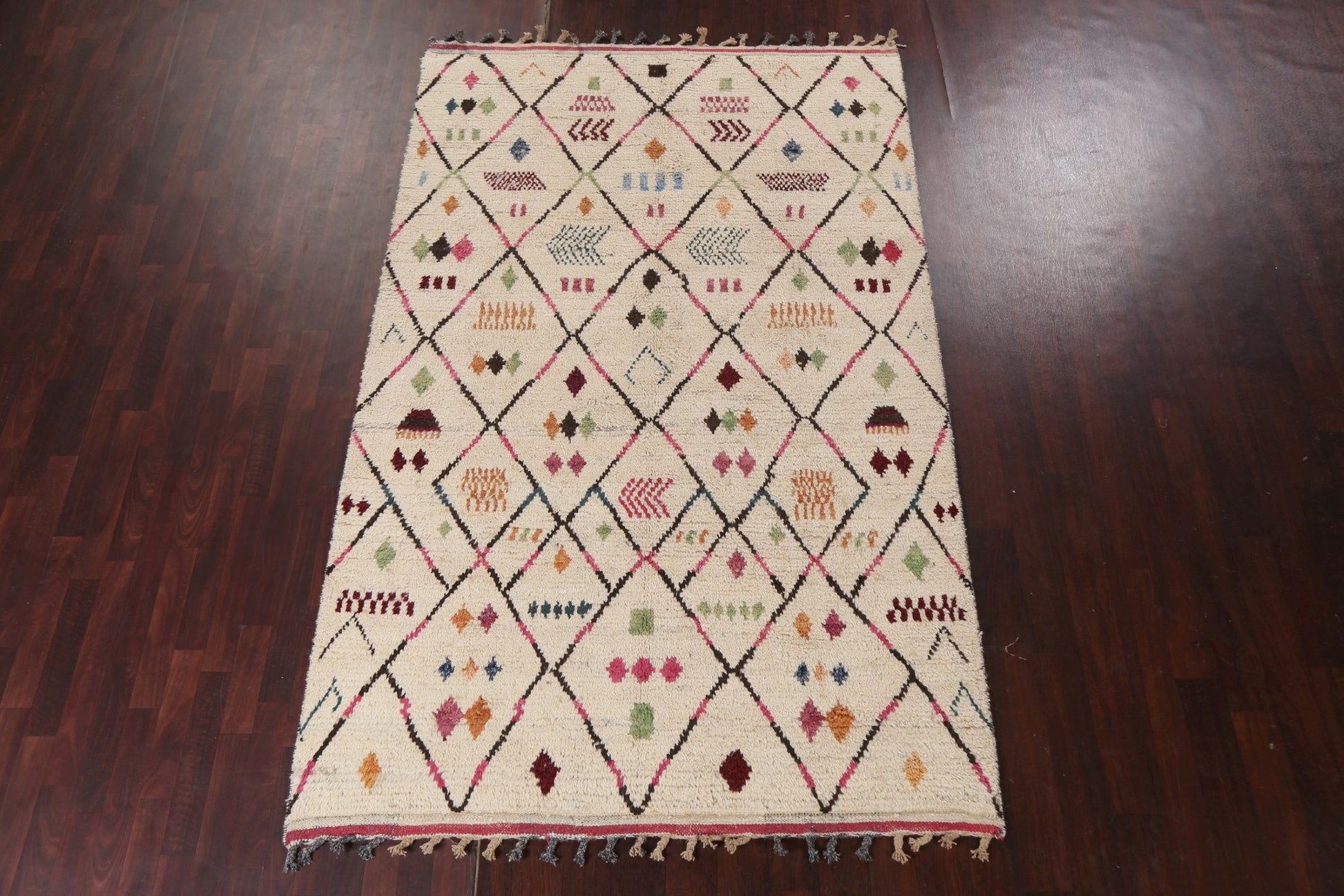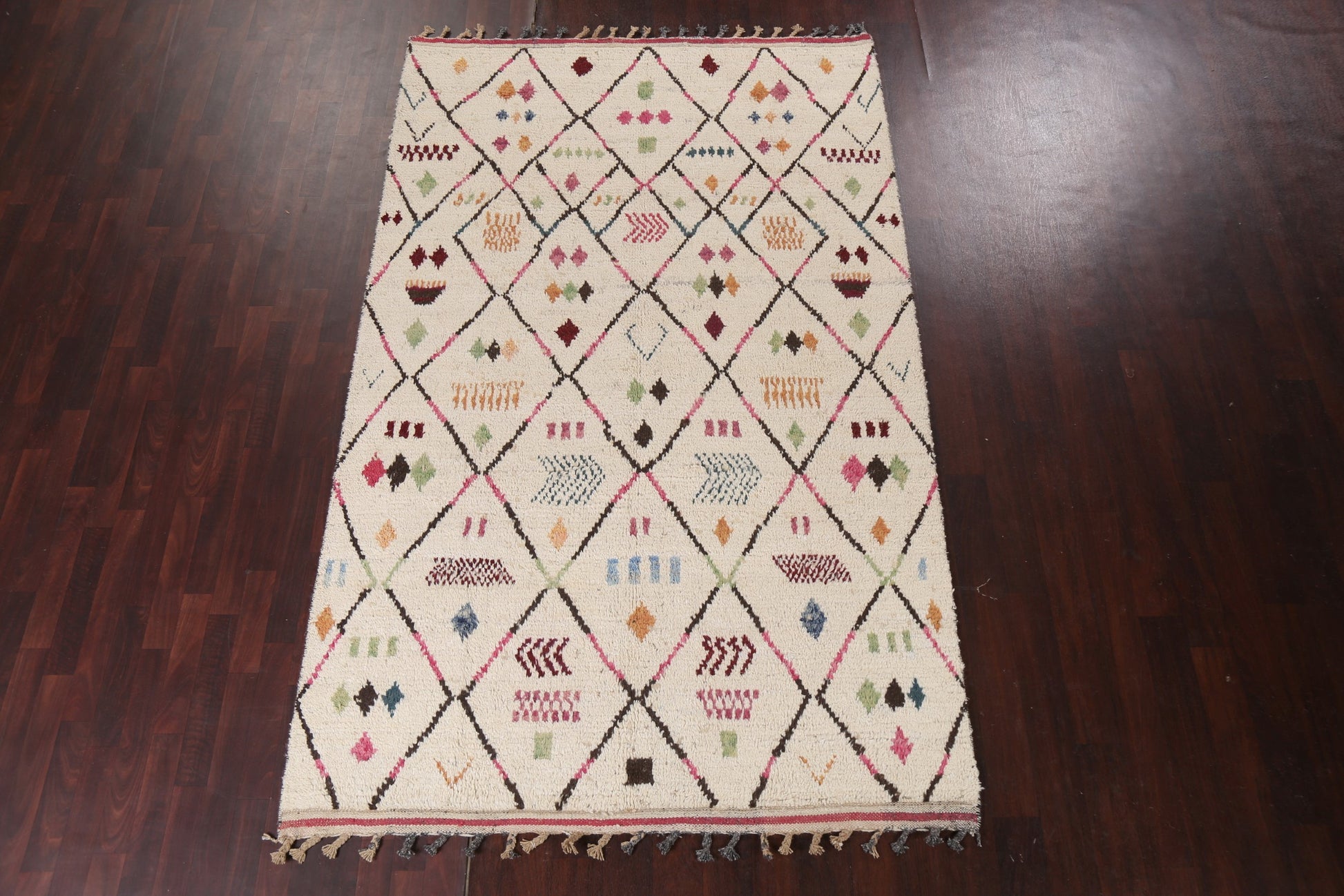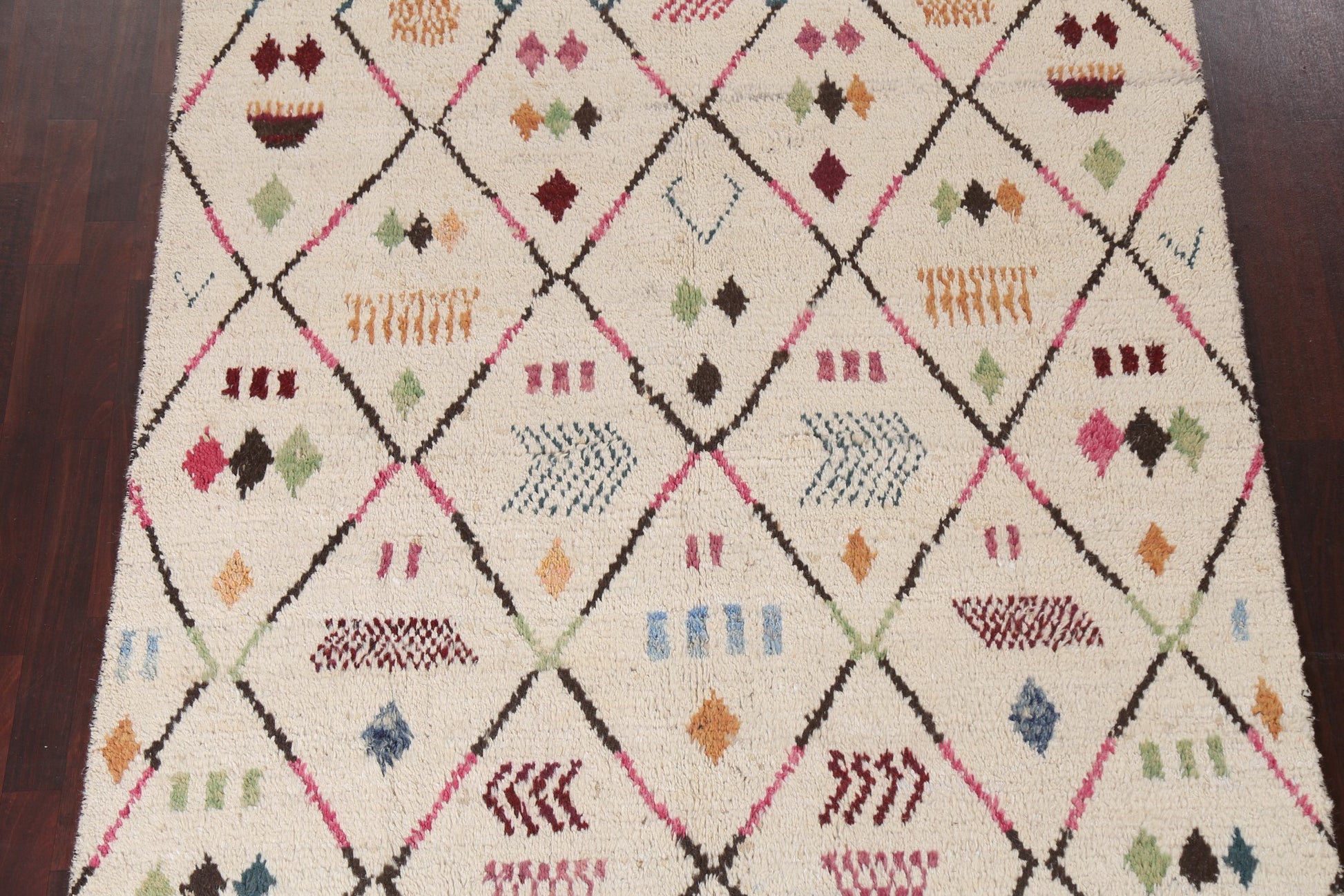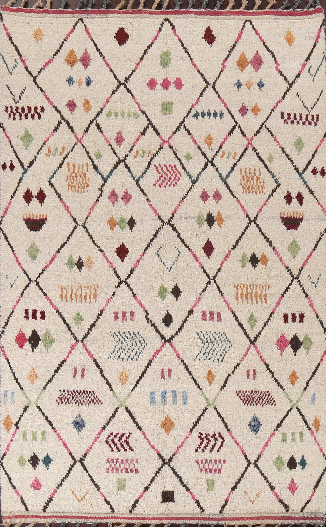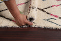 A Beautiful Genuine Morocco Moroccan rug is Hand Knotted by skillful weavers in Morocco with 100% Wool Material. This rug is in New, First Quality condition. dimensions are 9' 8'' X 5' 11'' in foot and 295 X 180 in centimeter. the primary color is Beige & Ivories.