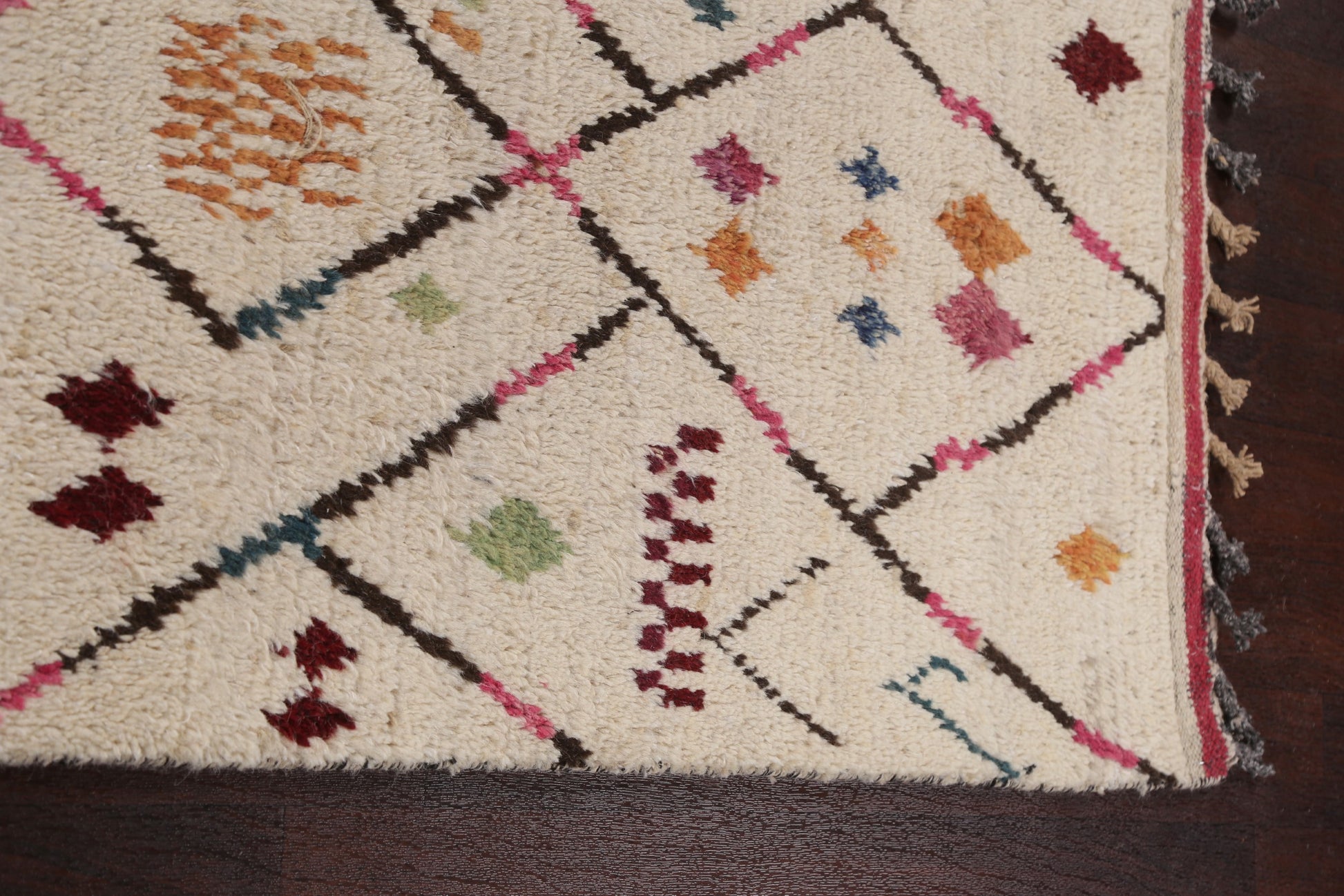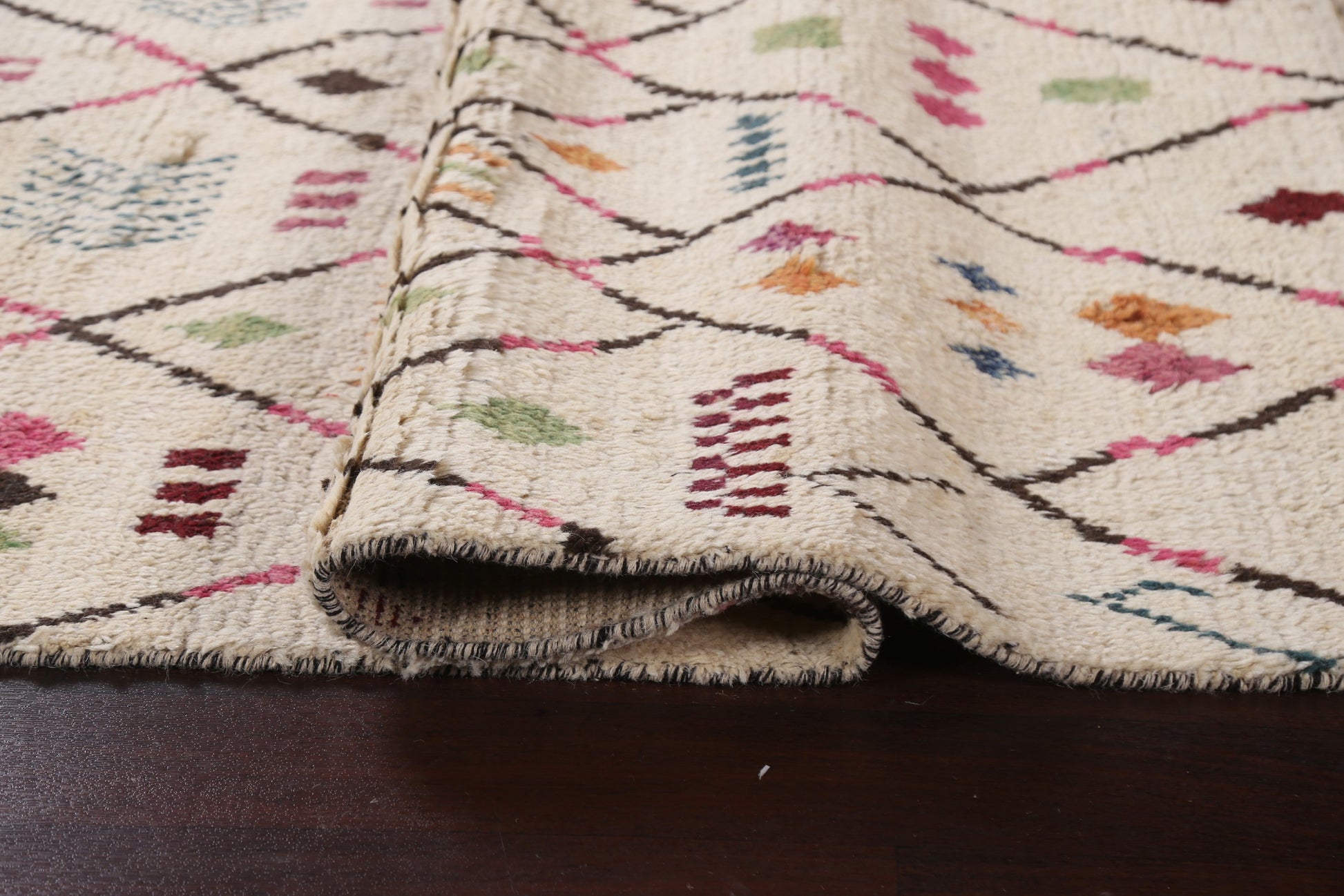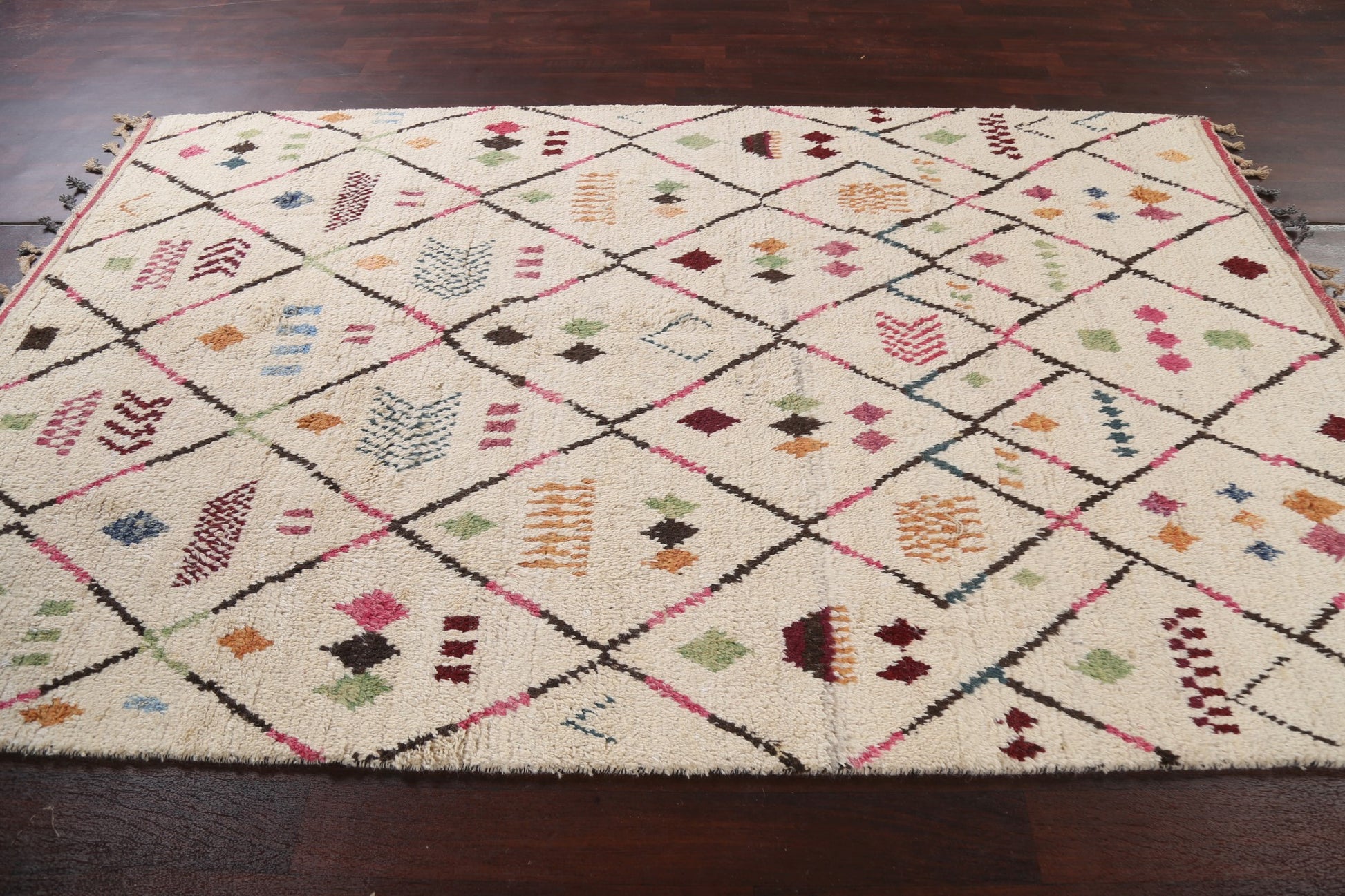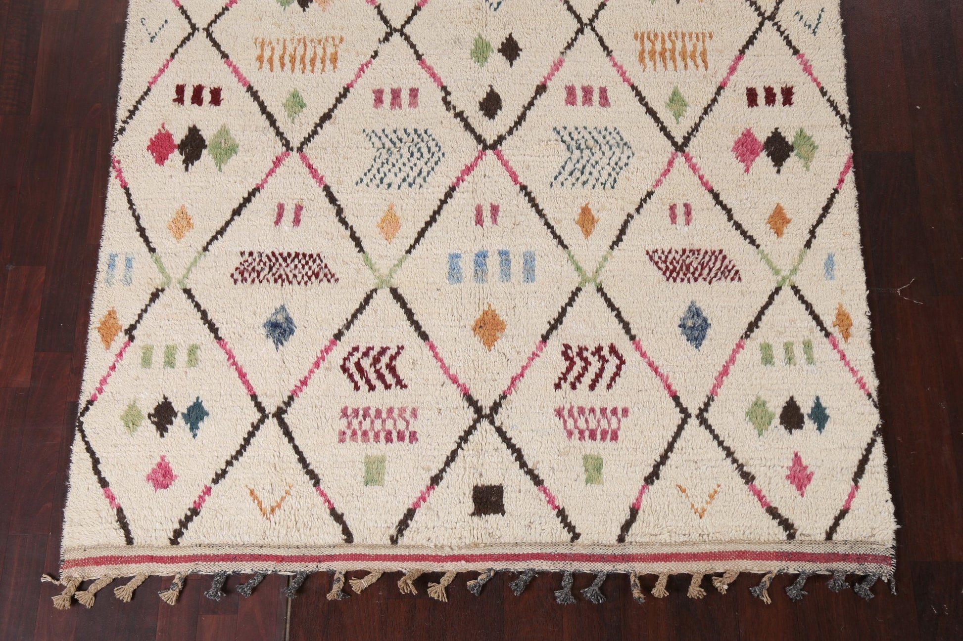 A Beautiful Genuine Morocco Moroccan rug is Hand Knotted by skillful weavers in Morocco with 100% Wool Material. This rug is in New, First Quality condition. dimensions are 9' 8'' X 5' 11'' in foot and 295 X 180 in centimeter. the primary color is Beige & Ivories.