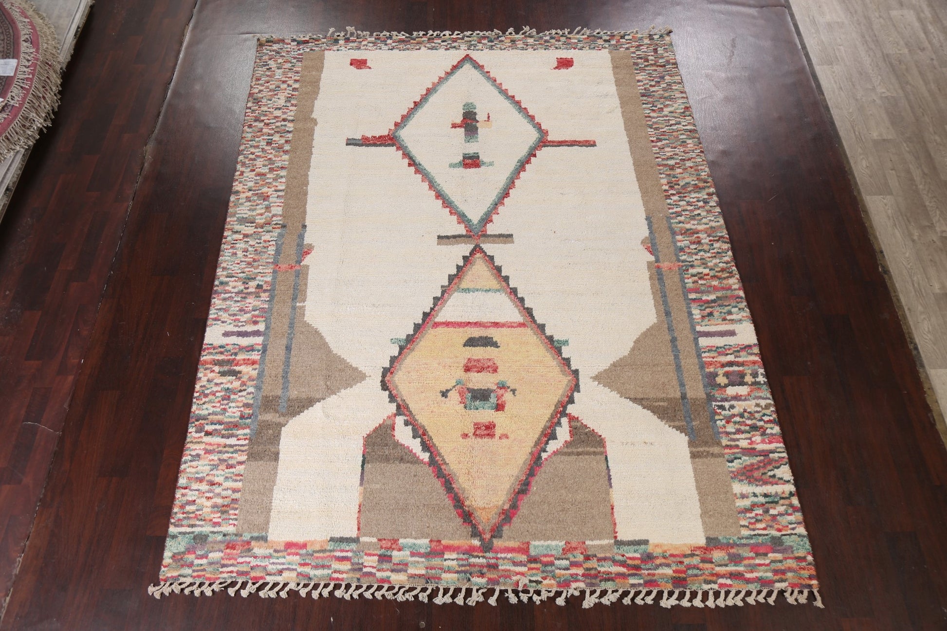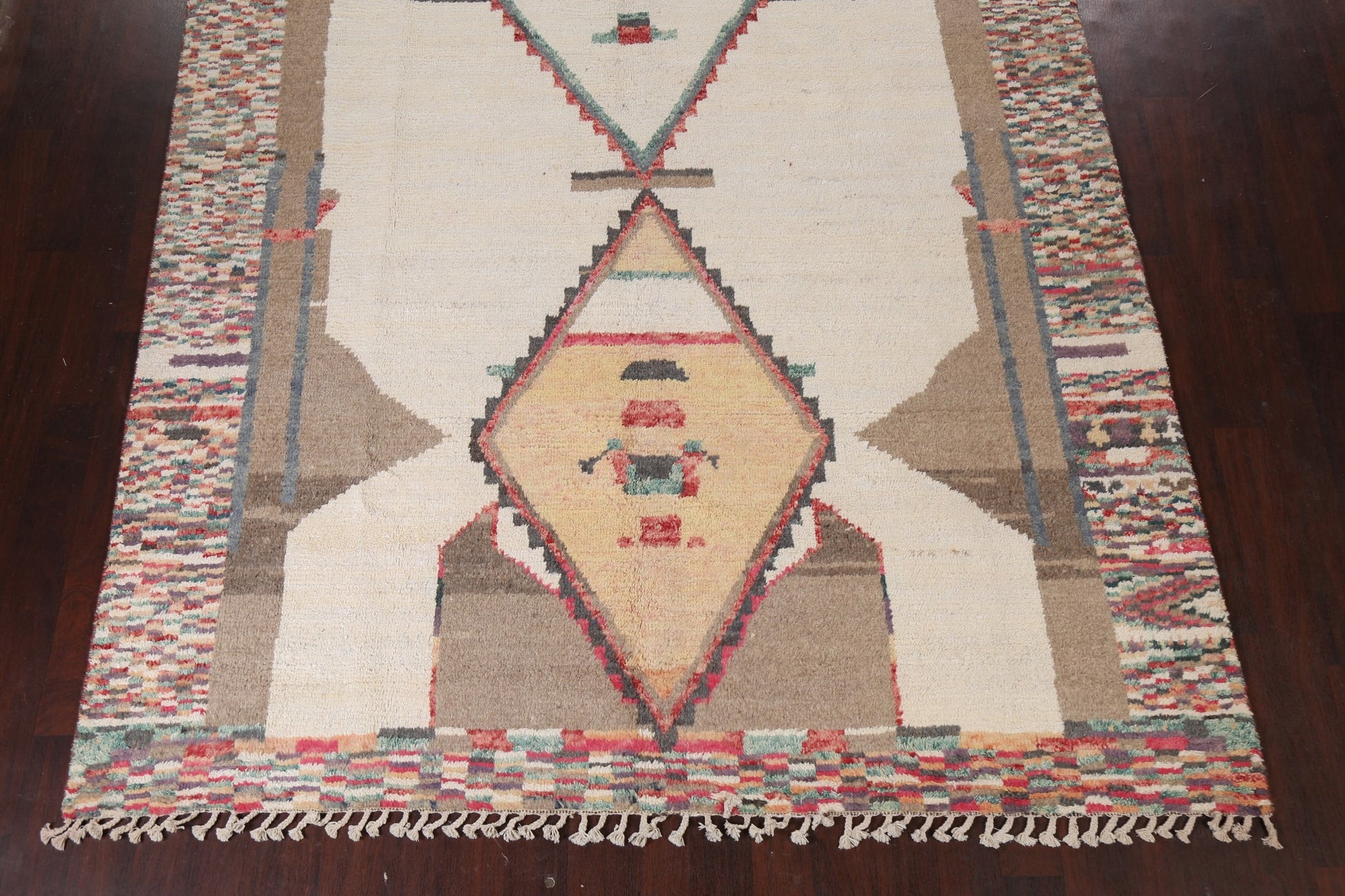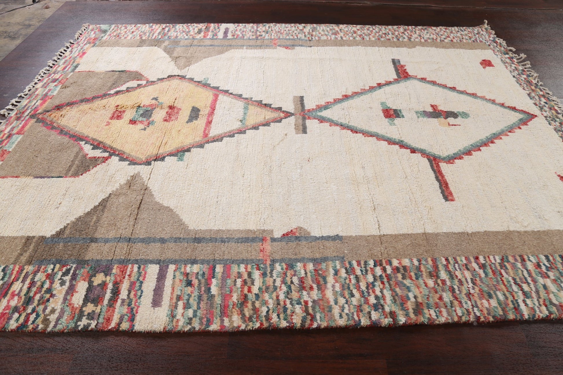 A Beautiful Genuine Morocco Moroccan rug is Hand Knotted by skillful weavers in Morocco with 100% Wool Material. This rug is in New, First Quality condition. dimensions are 10' 4'' X 8' 1'' in foot and 315 X 246 in centimeter. the primary color is Beige & Ivories.