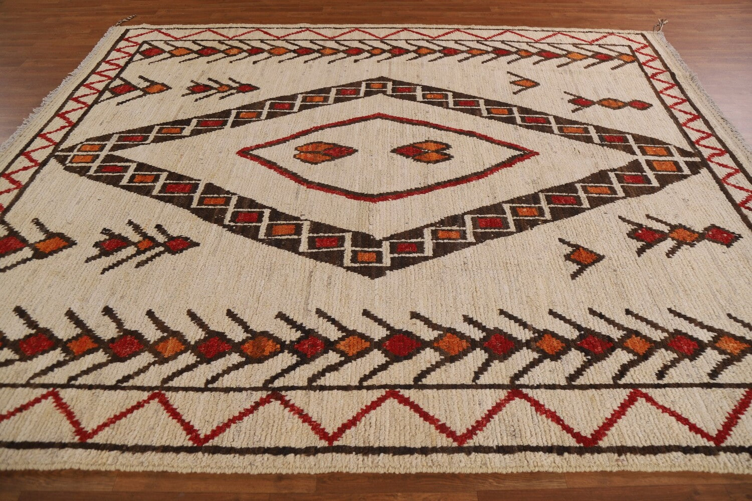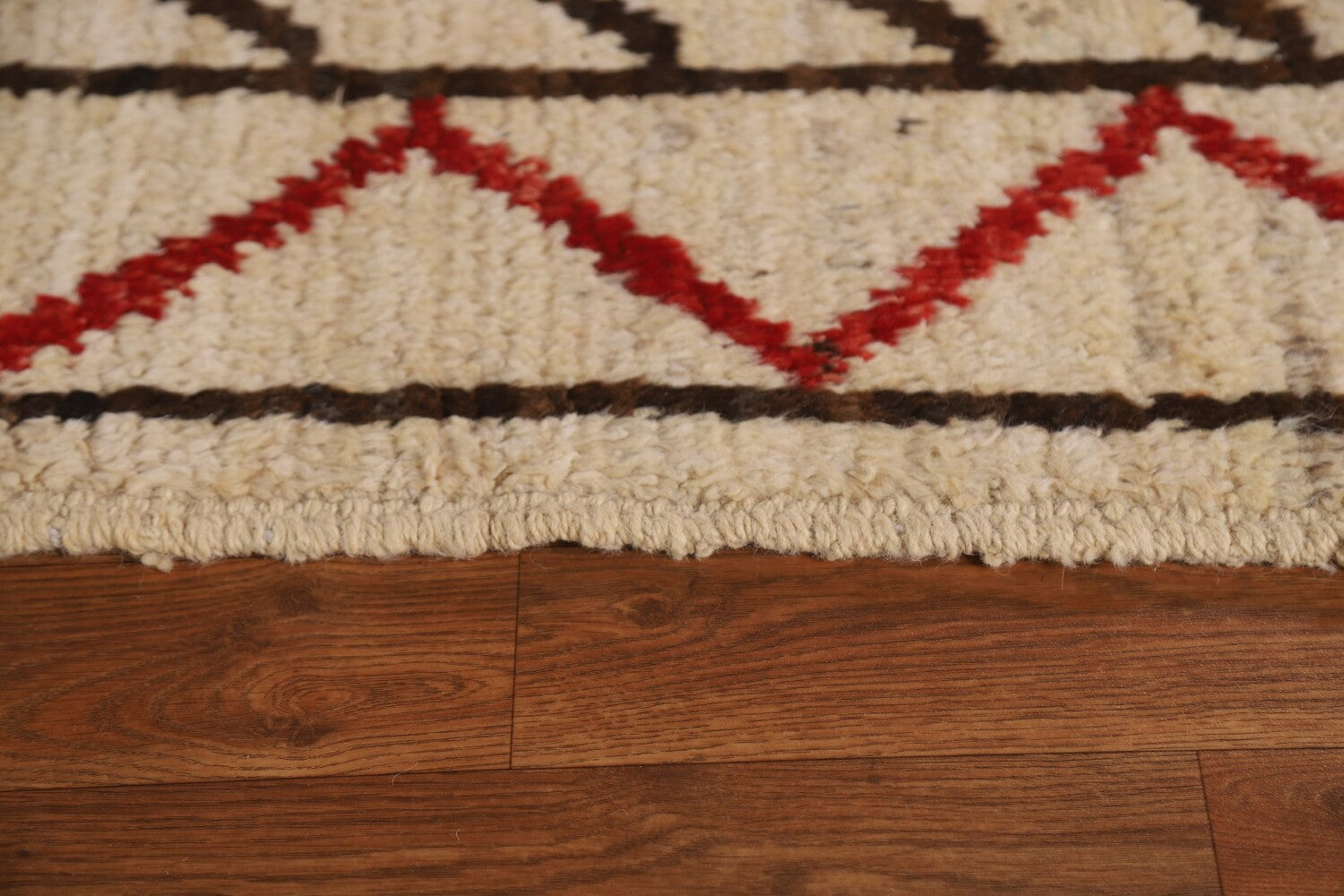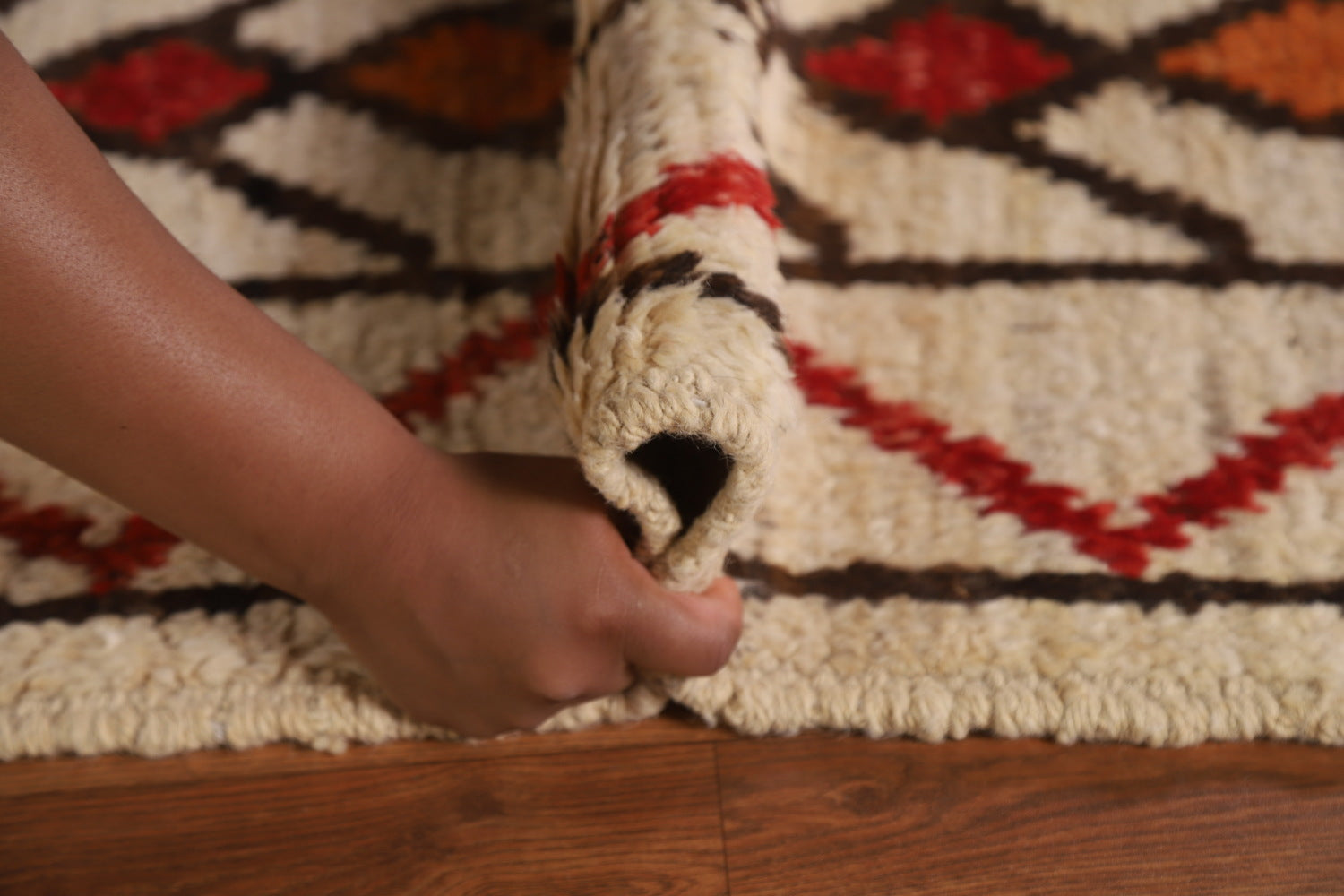 A Beautiful Genuine Pakistan Moroccan rug is Hand Knotted by skillful weavers in Pakistan with 100% Wool Material. This rug is in condition. dimensions are 9' 9'' X 8' 4'' in foot and 297 X 254 in centimeter. the primary color is Beige & Ivories.