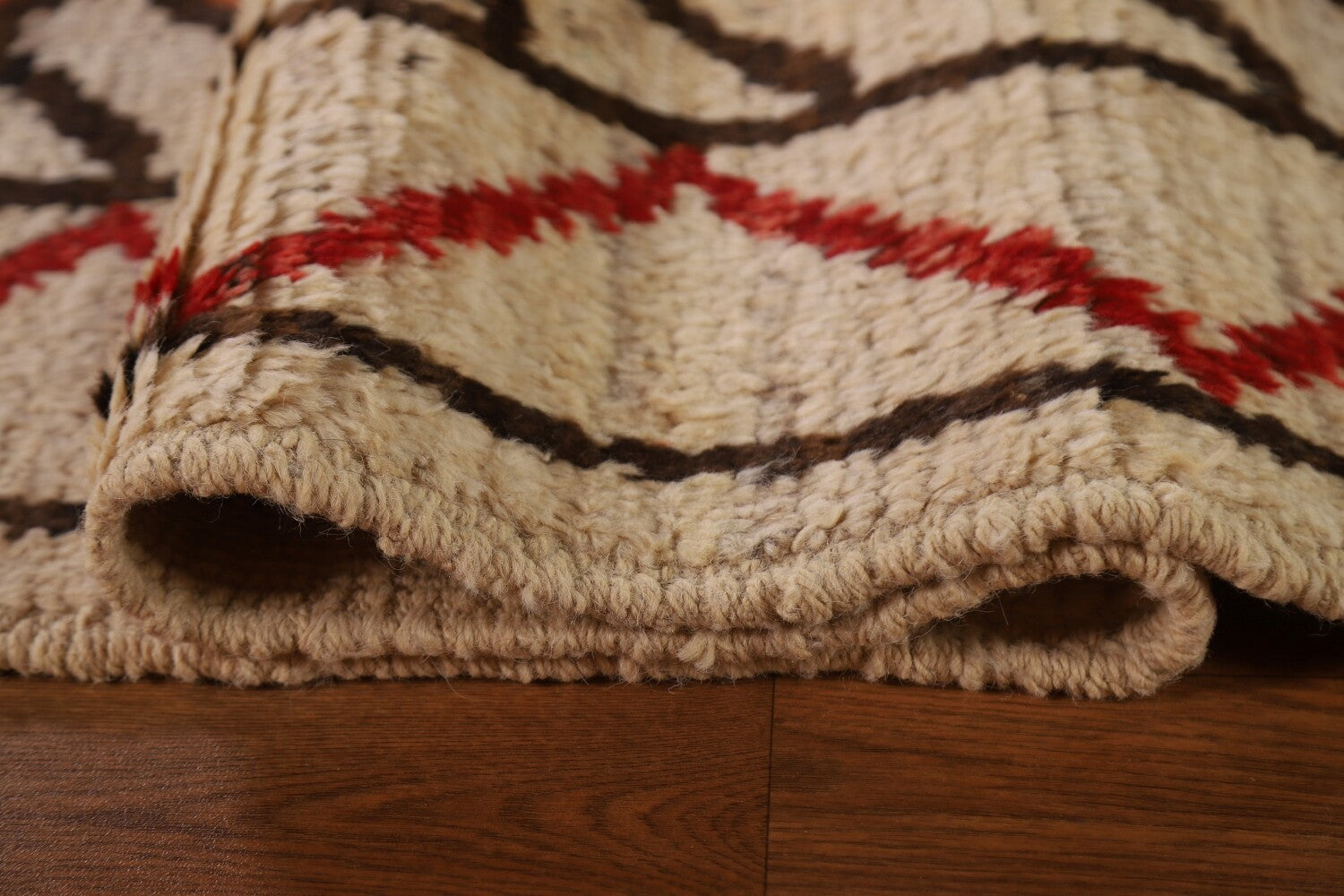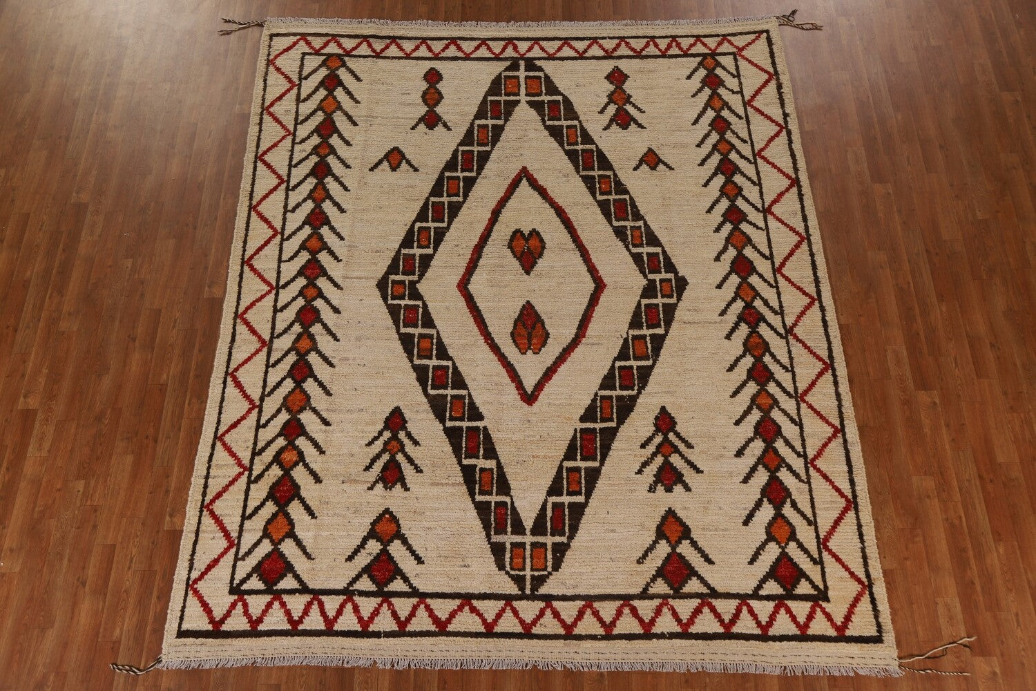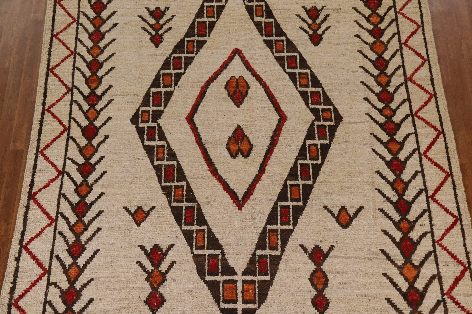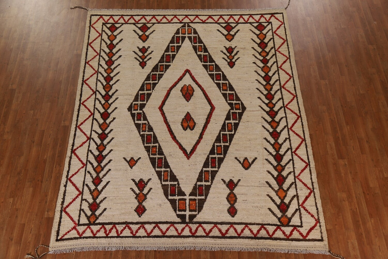 A Beautiful Genuine Pakistan Moroccan rug is Hand Knotted by skillful weavers in Pakistan with 100% Wool Material. This rug is in condition. dimensions are 9' 9'' X 8' 4'' in foot and 297 X 254 in centimeter. the primary color is Beige & Ivories.