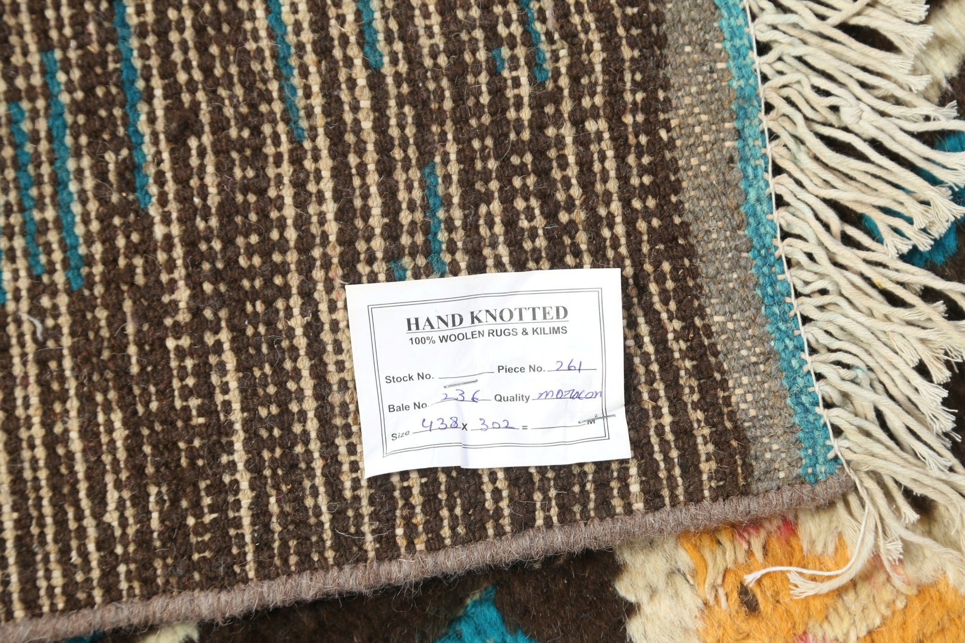 A Beautiful Genuine Morocco Moroccan rug is Hand Knotted by skillful weavers in Morocco with 100% Wool Material. This rug is in New, First Quality condition. dimensions are 14' 9'' X 9' 11'' in foot and 450 X 302 in centimeter. the primary color is Brown.