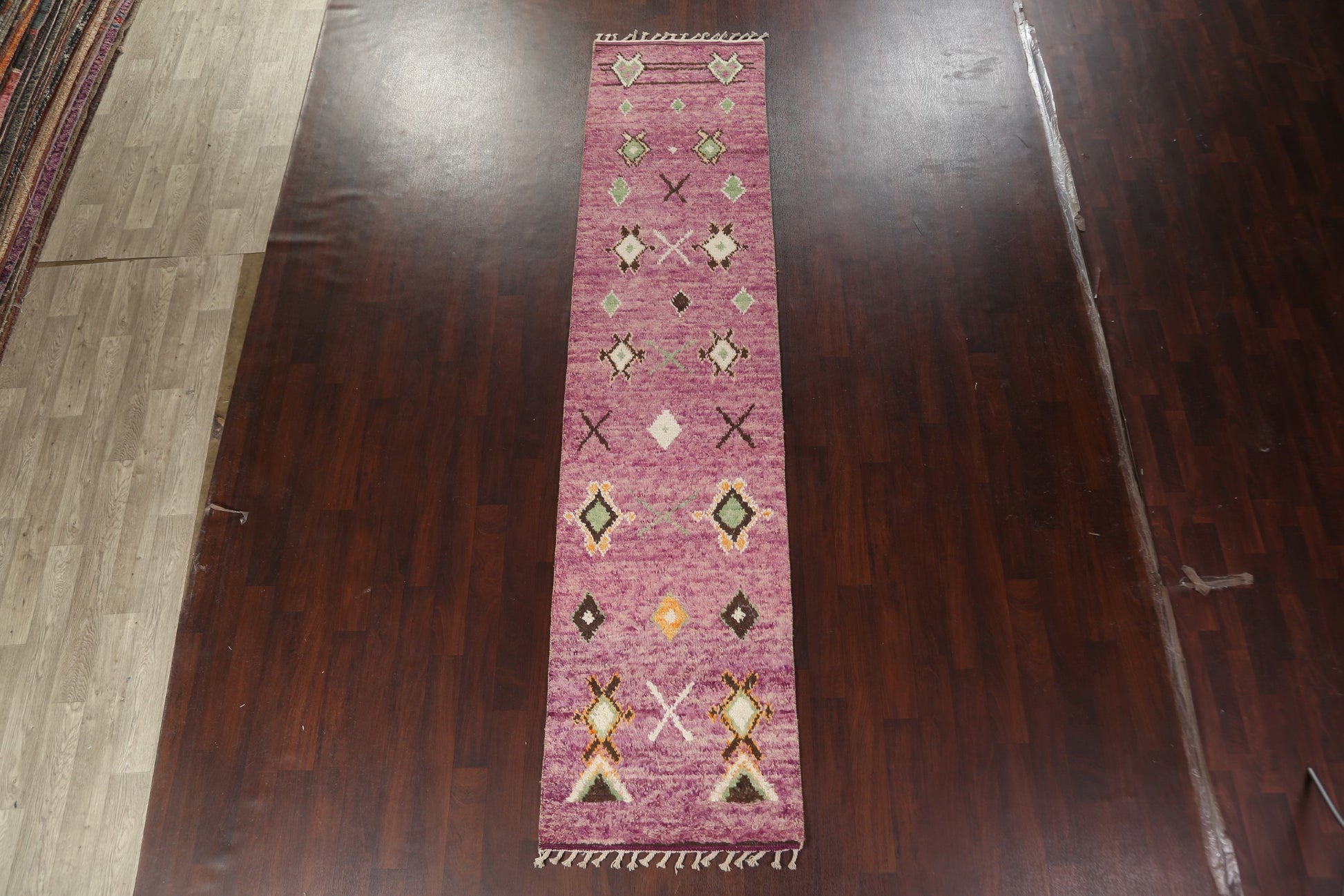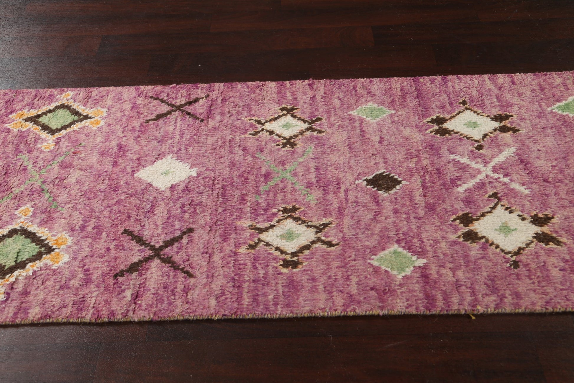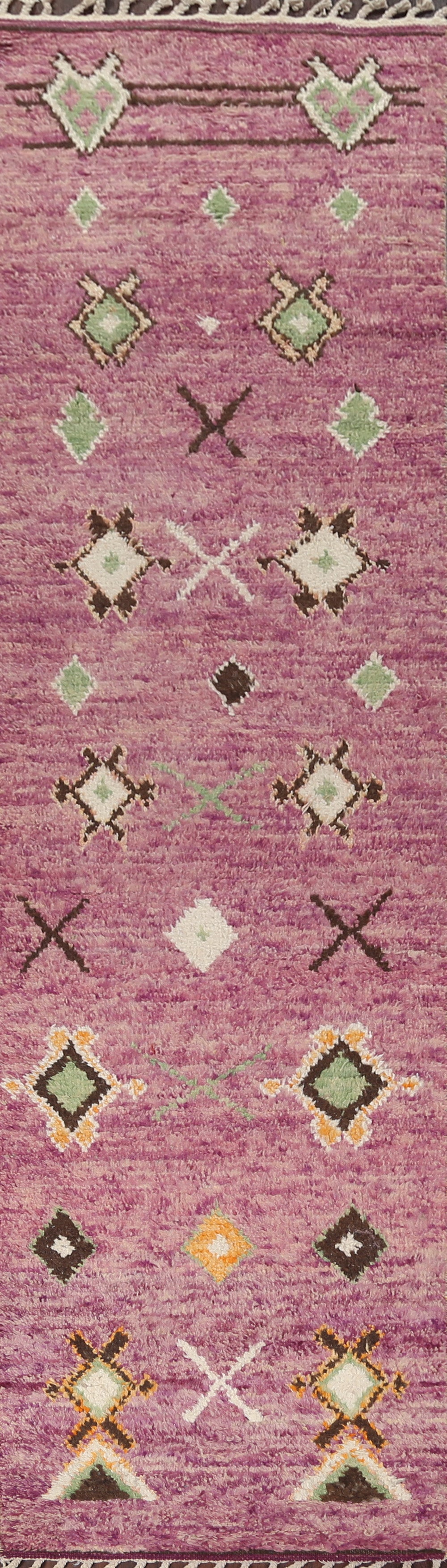 A Beautiful Genuine Morocco Moroccan rug is Hand Knotted by skillful weavers in Morocco with 100% Wool Material. This rug is in New, First Quality condition. dimensions are 12' 9'' X 2' 11'' in foot and 389 X 89 in centimeter. the primary color is Purples.