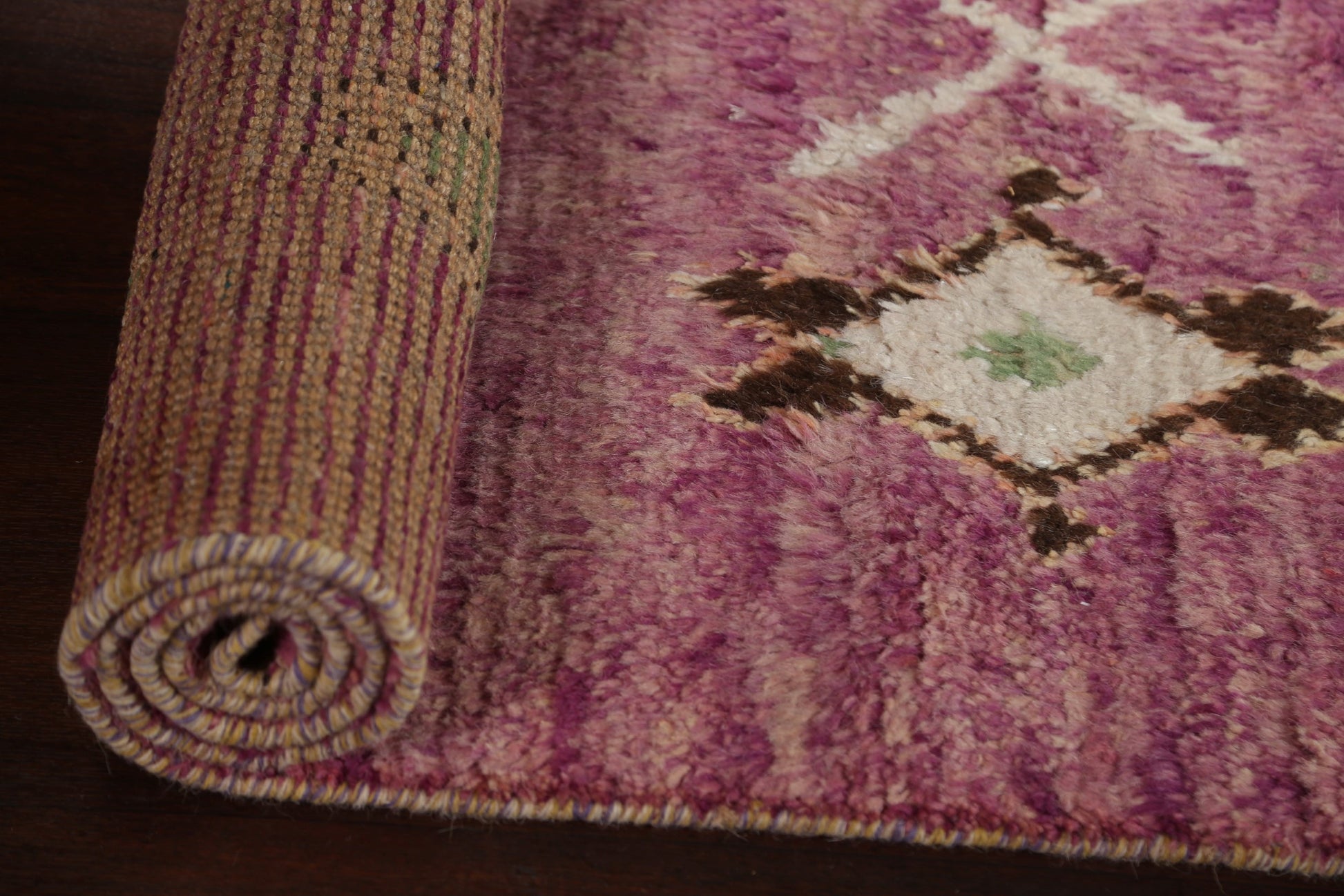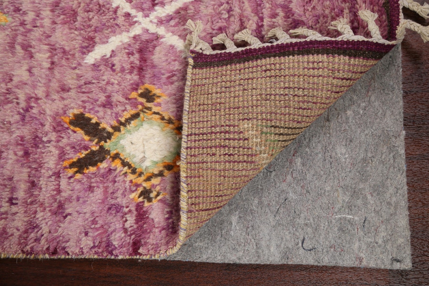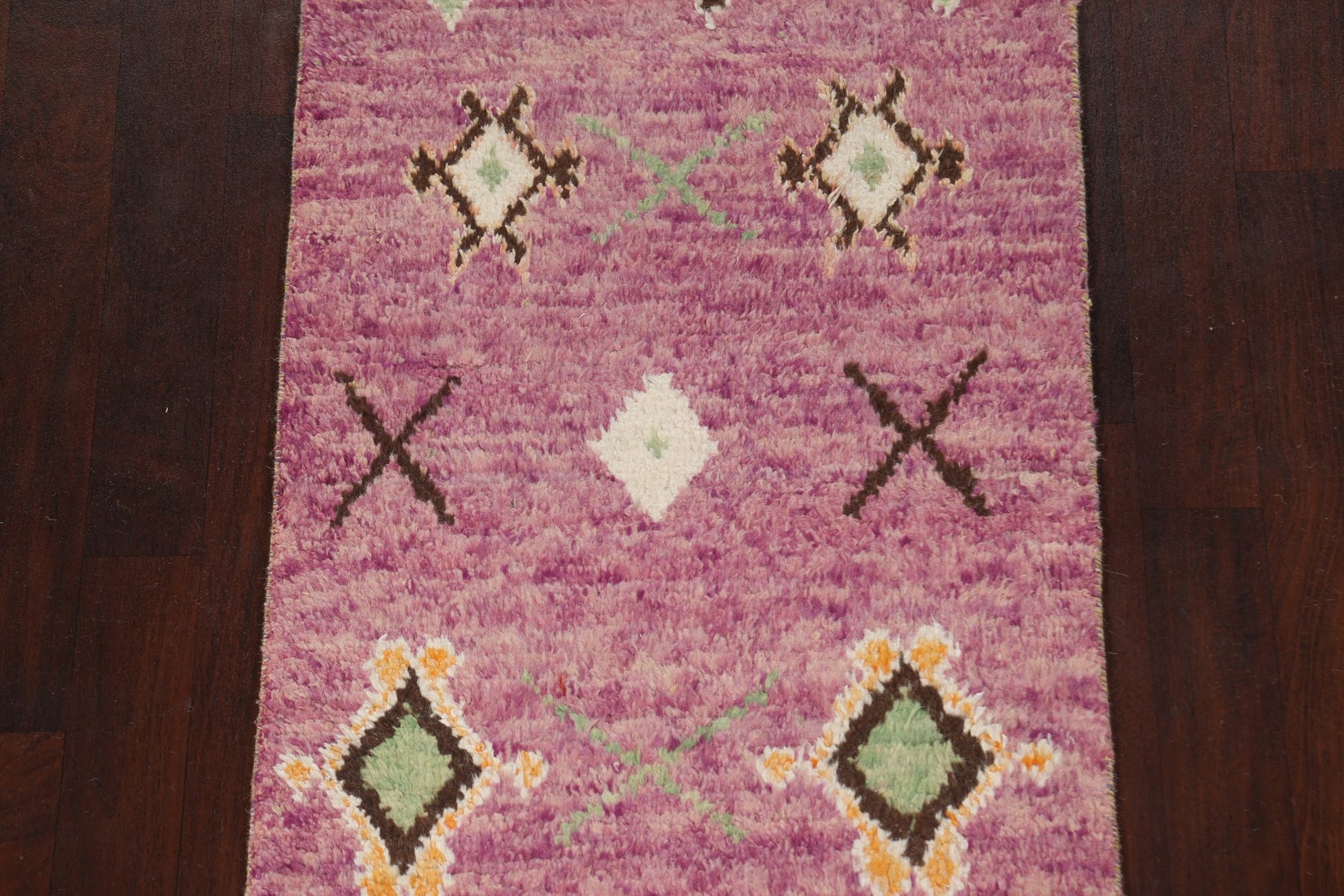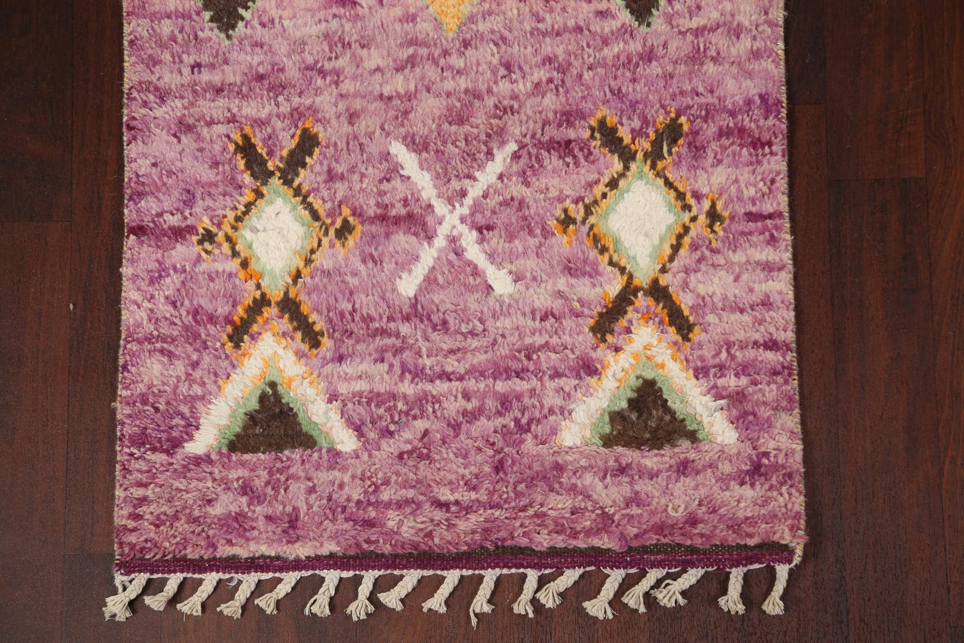 A Beautiful Genuine Morocco Moroccan rug is Hand Knotted by skillful weavers in Morocco with 100% Wool Material. This rug is in New, First Quality condition. dimensions are 12' 9'' X 2' 11'' in foot and 389 X 89 in centimeter. the primary color is Purples.