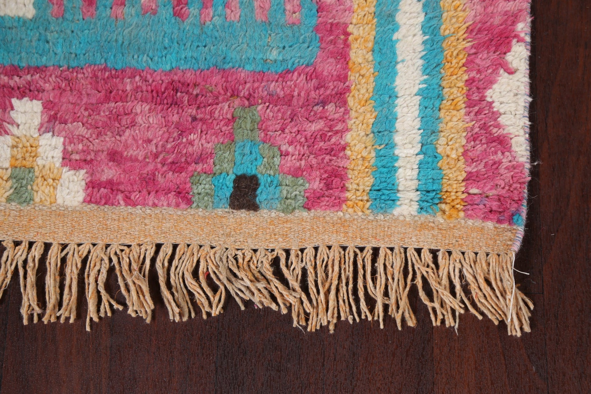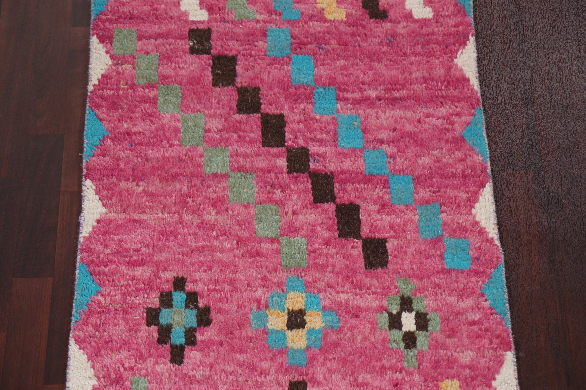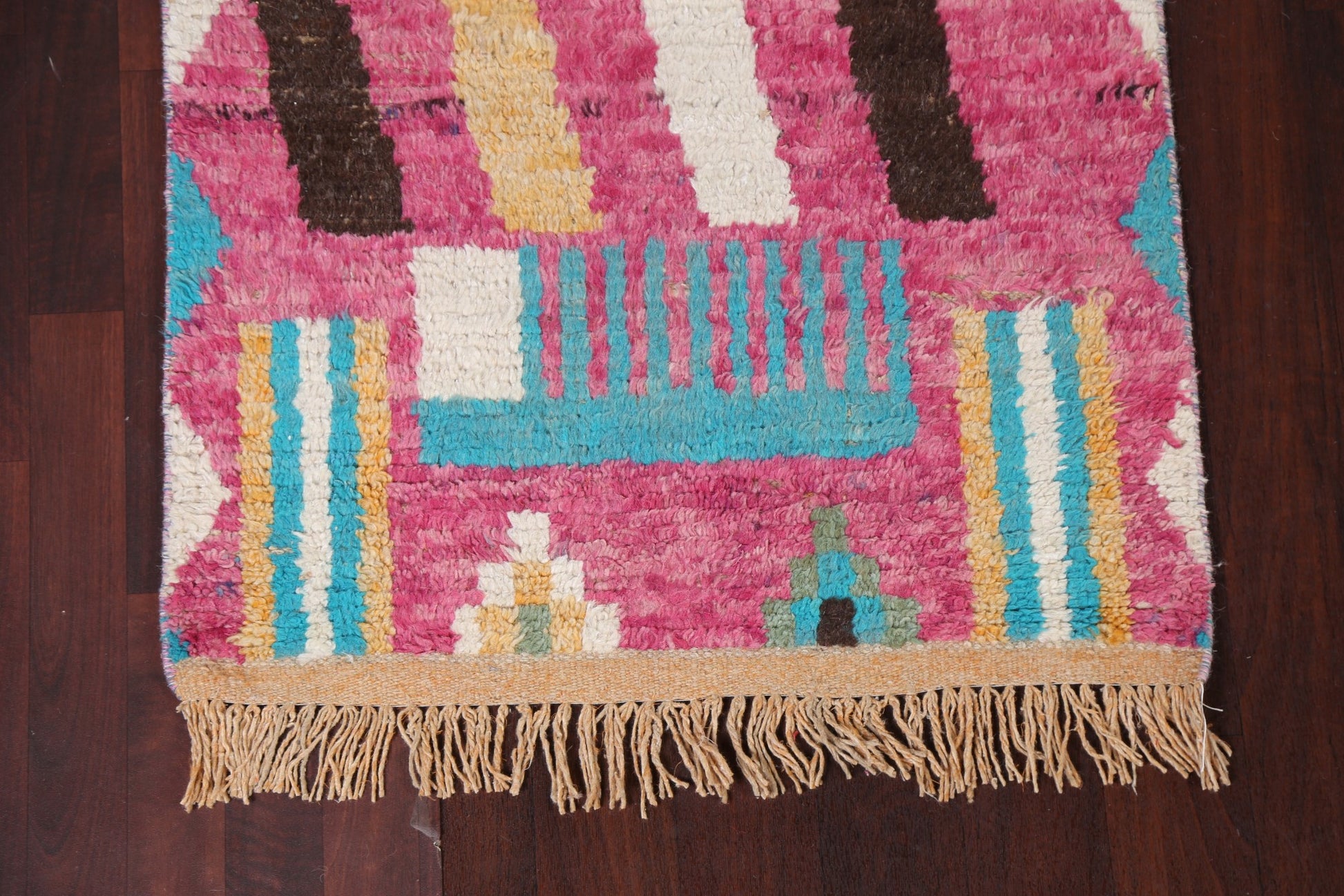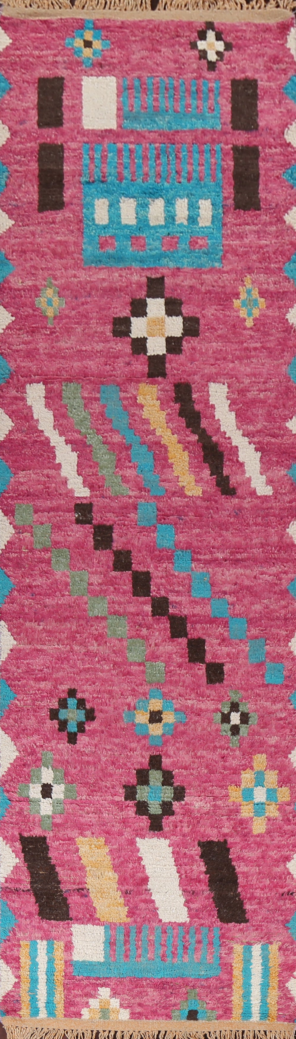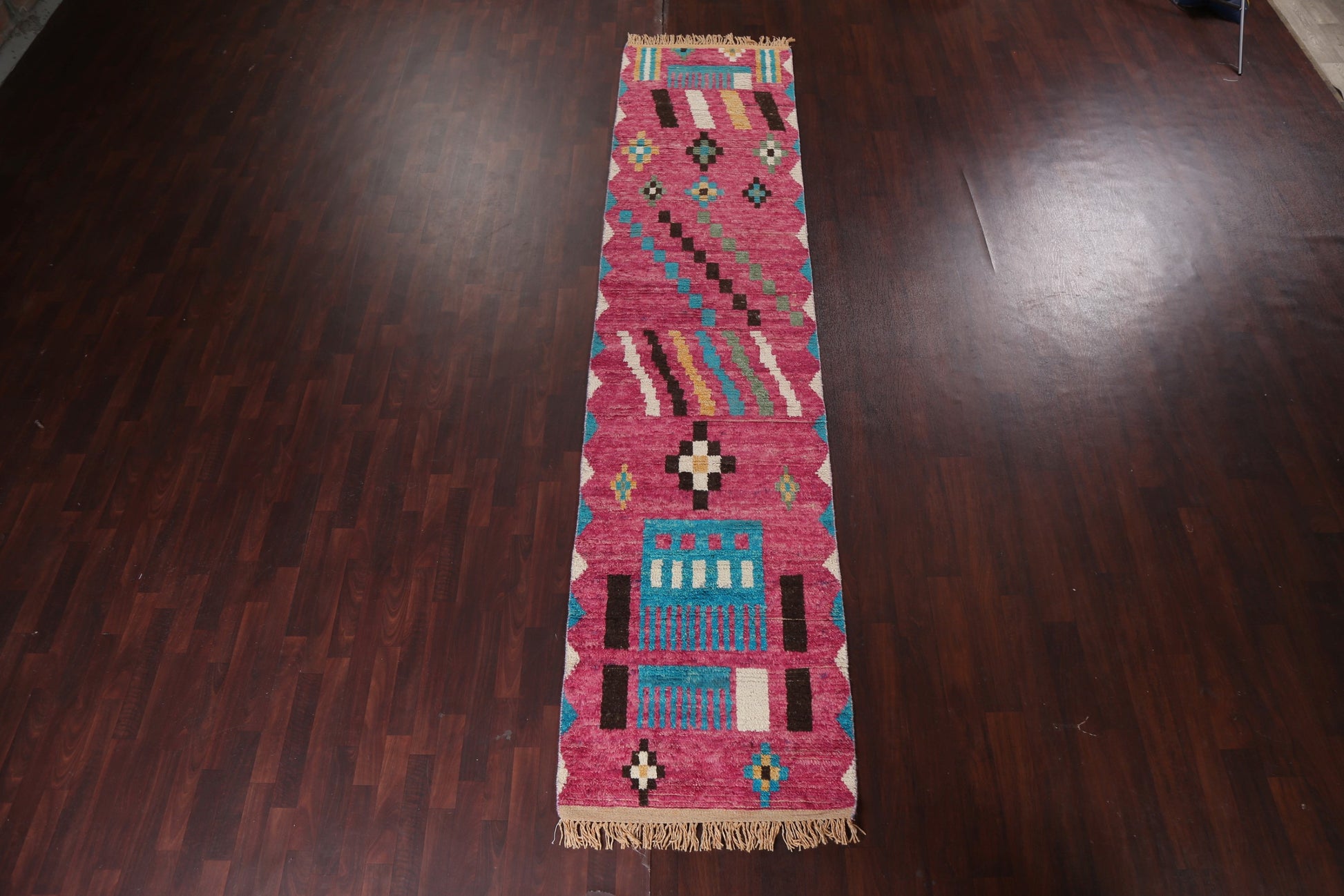 A Beautiful Genuine Morocco Moroccan rug is Hand Knotted by skillful weavers in Morocco with 100% Wool Material. This rug is in New, First Quality condition. dimensions are 13' 7'' X 3' 1'' in foot and 414 X 94 in centimeter. the primary color is Purples.