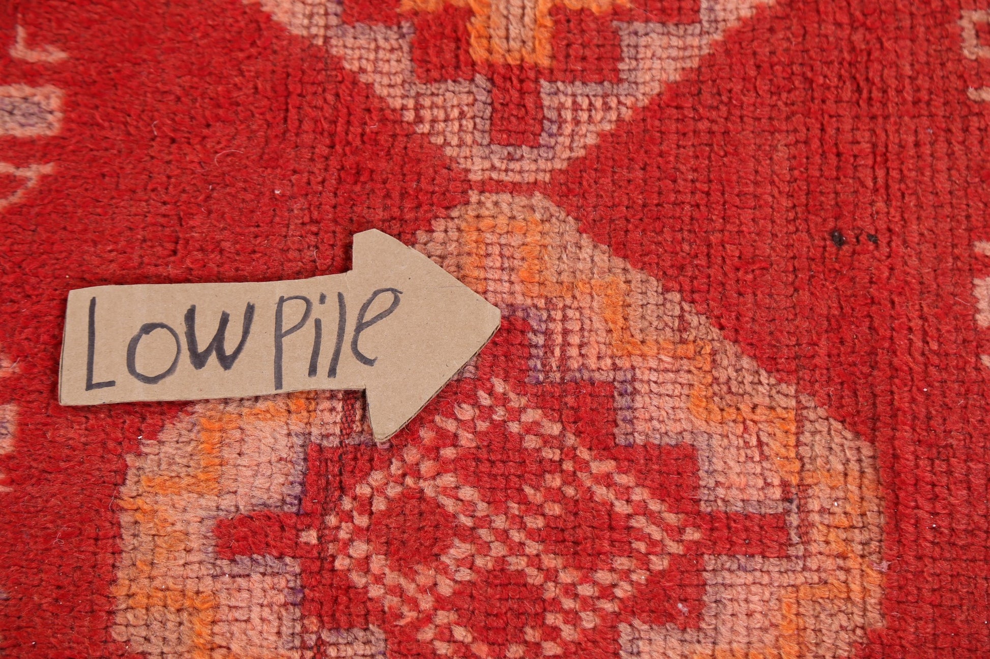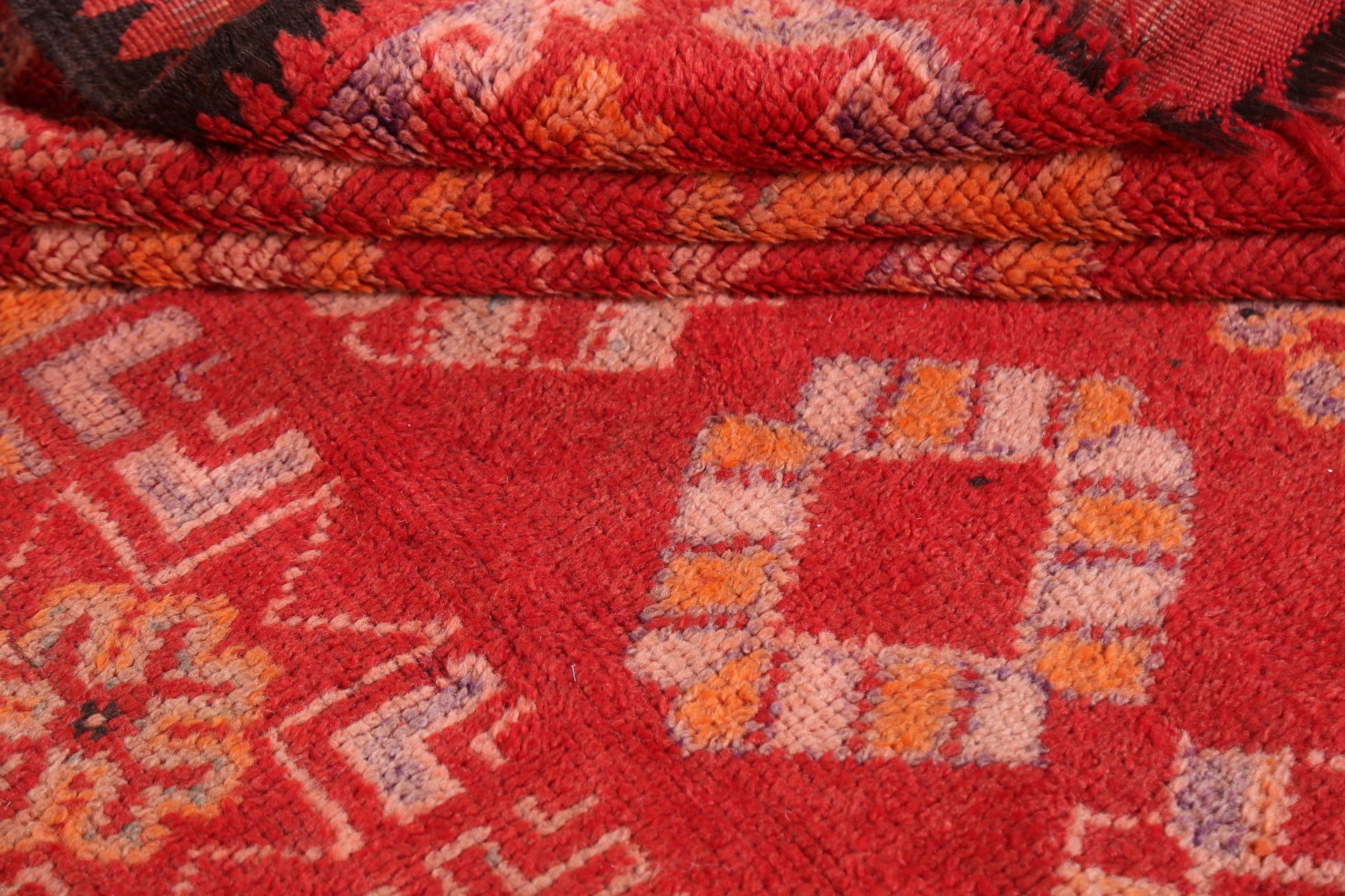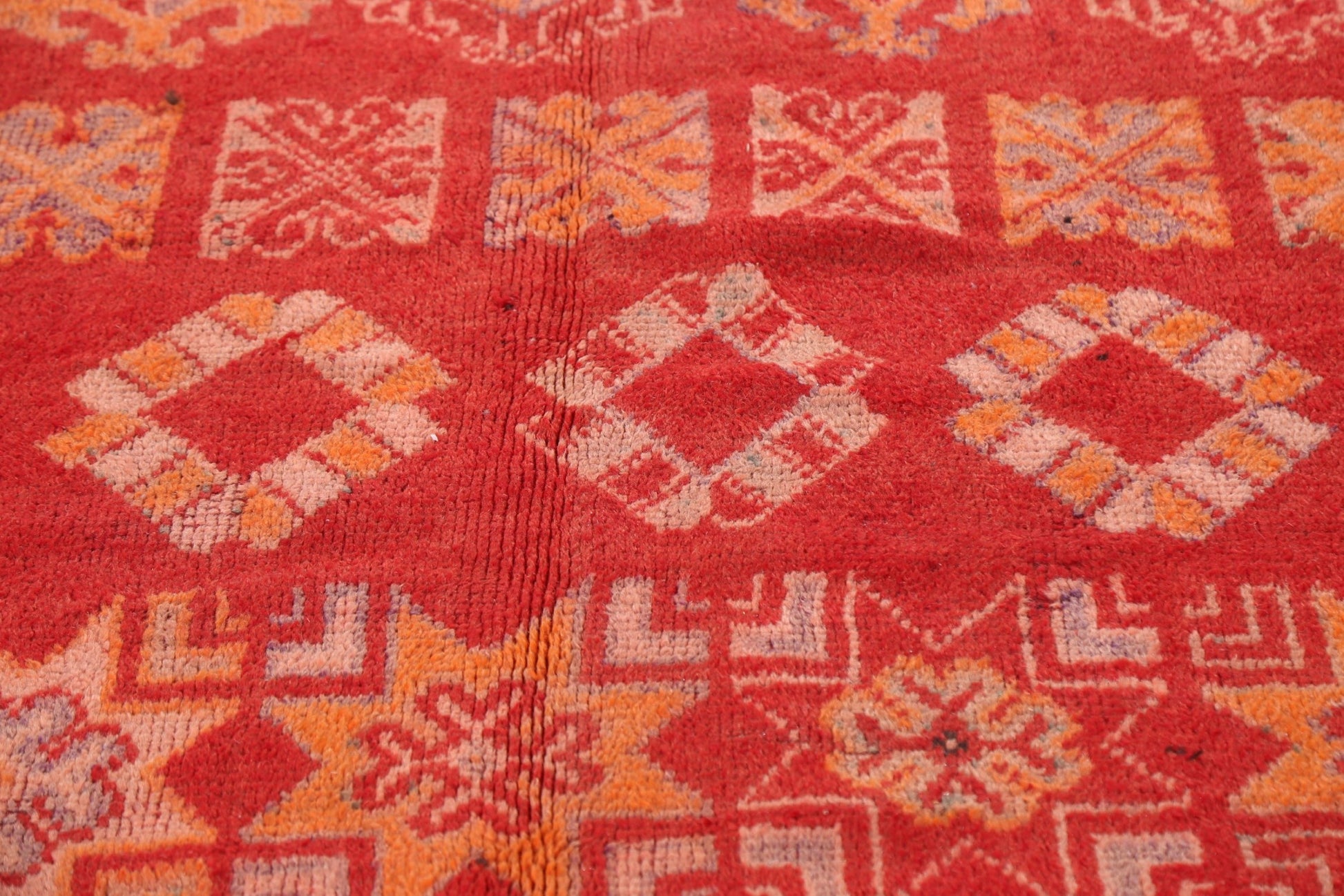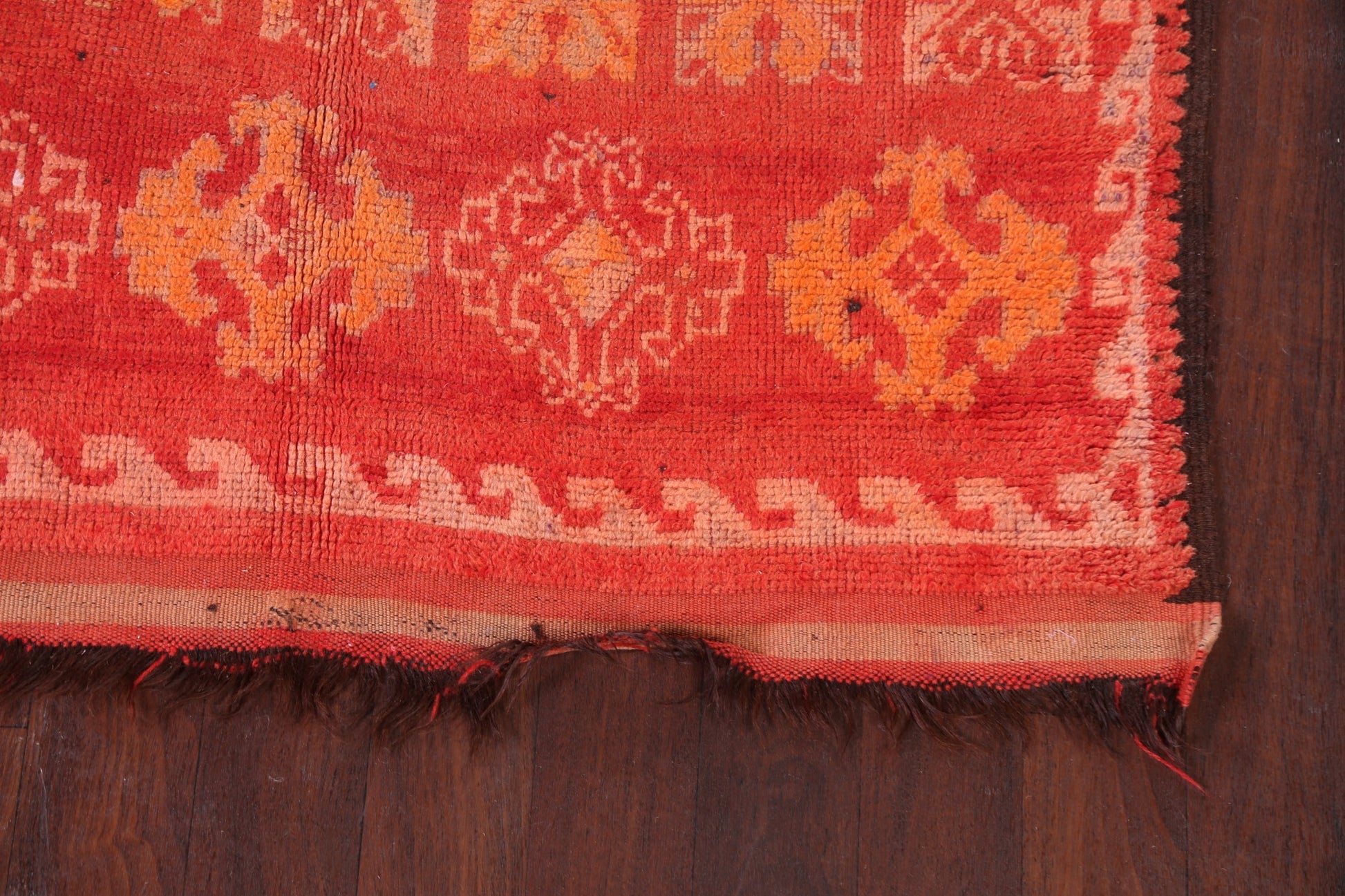 A Beautiful Genuine Morocco Moroccan rug is Hand Knotted by skillful weavers in Morocco with 100% Wool Material. This rug is in Very Good (Low Pile-Abrash) condition. dimensions are 10' 0'' X 4' 8'' in foot and 305 X 142 in centimeter. the primary color is Red.