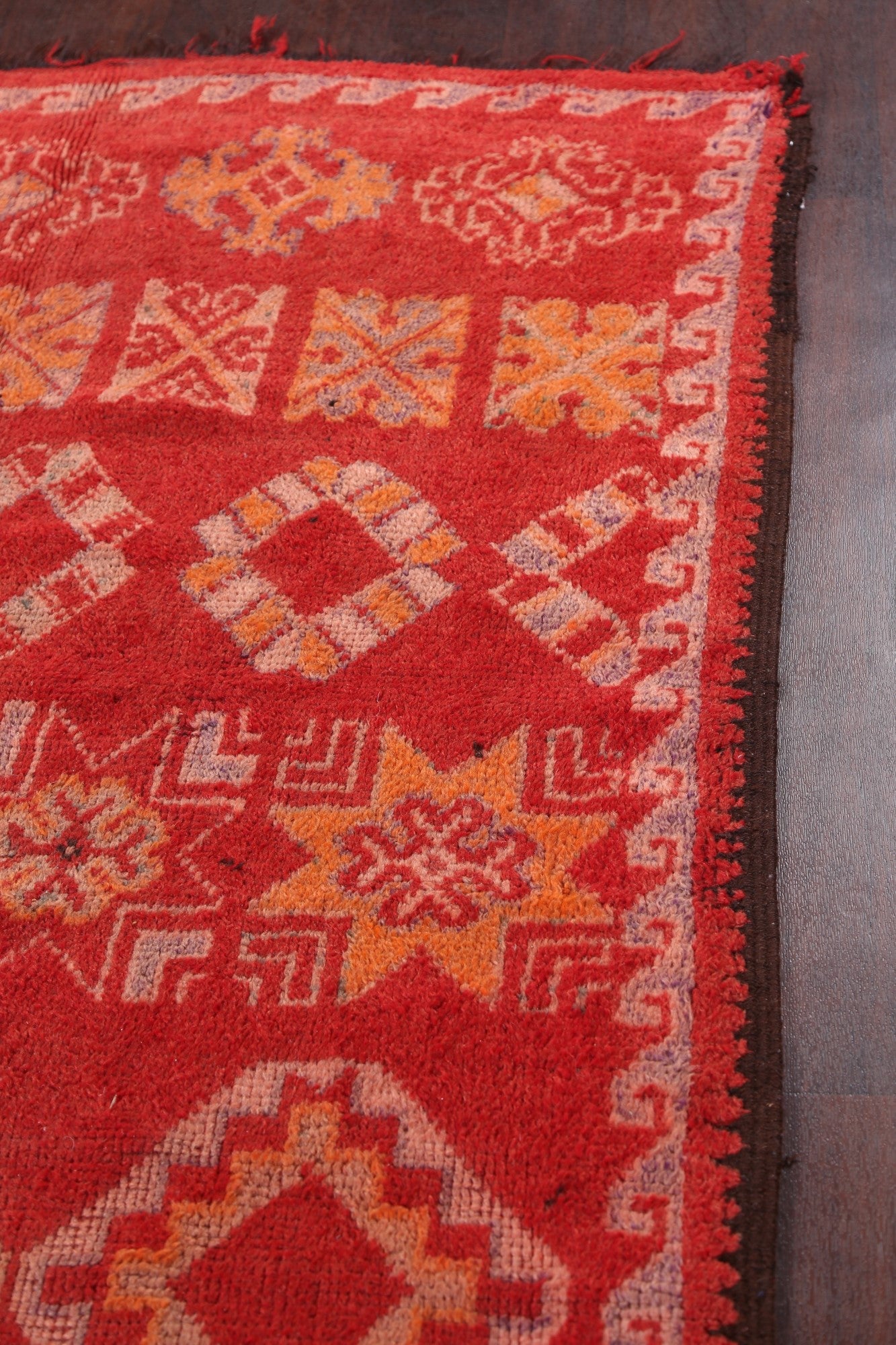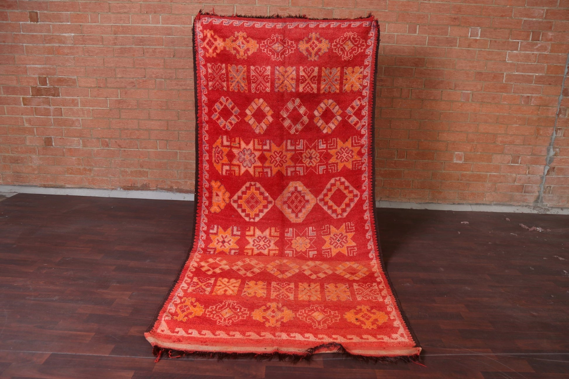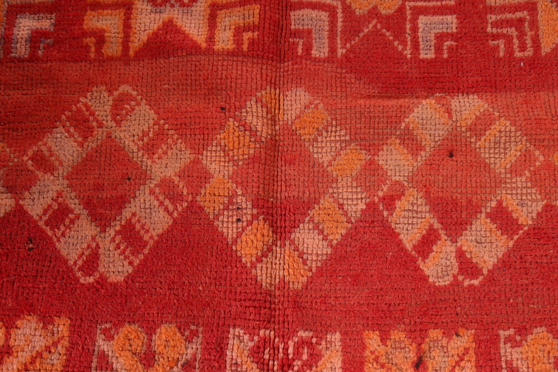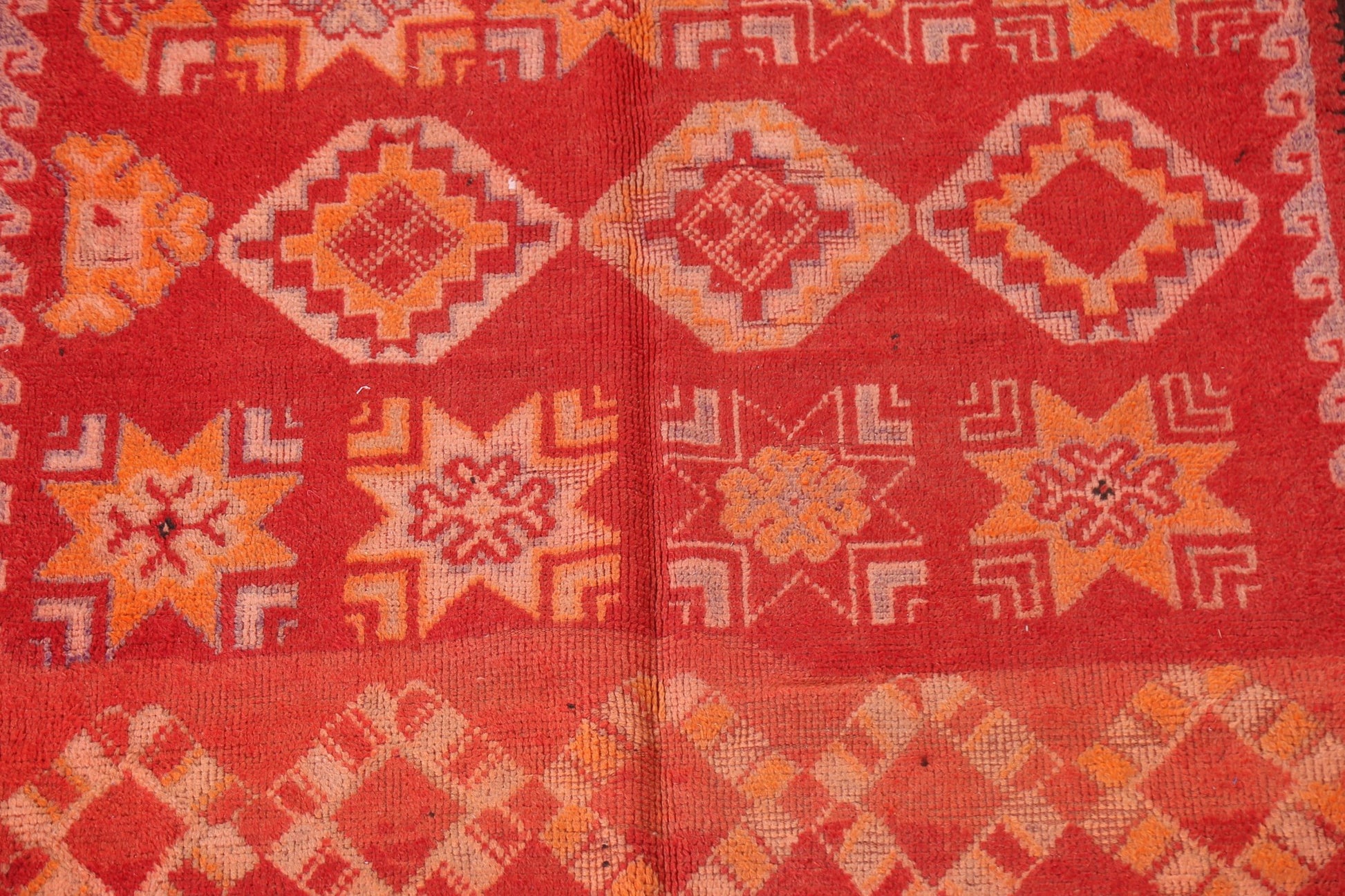 A Beautiful Genuine Morocco Moroccan rug is Hand Knotted by skillful weavers in Morocco with 100% Wool Material. This rug is in Very Good (Low Pile-Abrash) condition. dimensions are 10' 0'' X 4' 8'' in foot and 305 X 142 in centimeter. the primary color is Red.