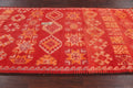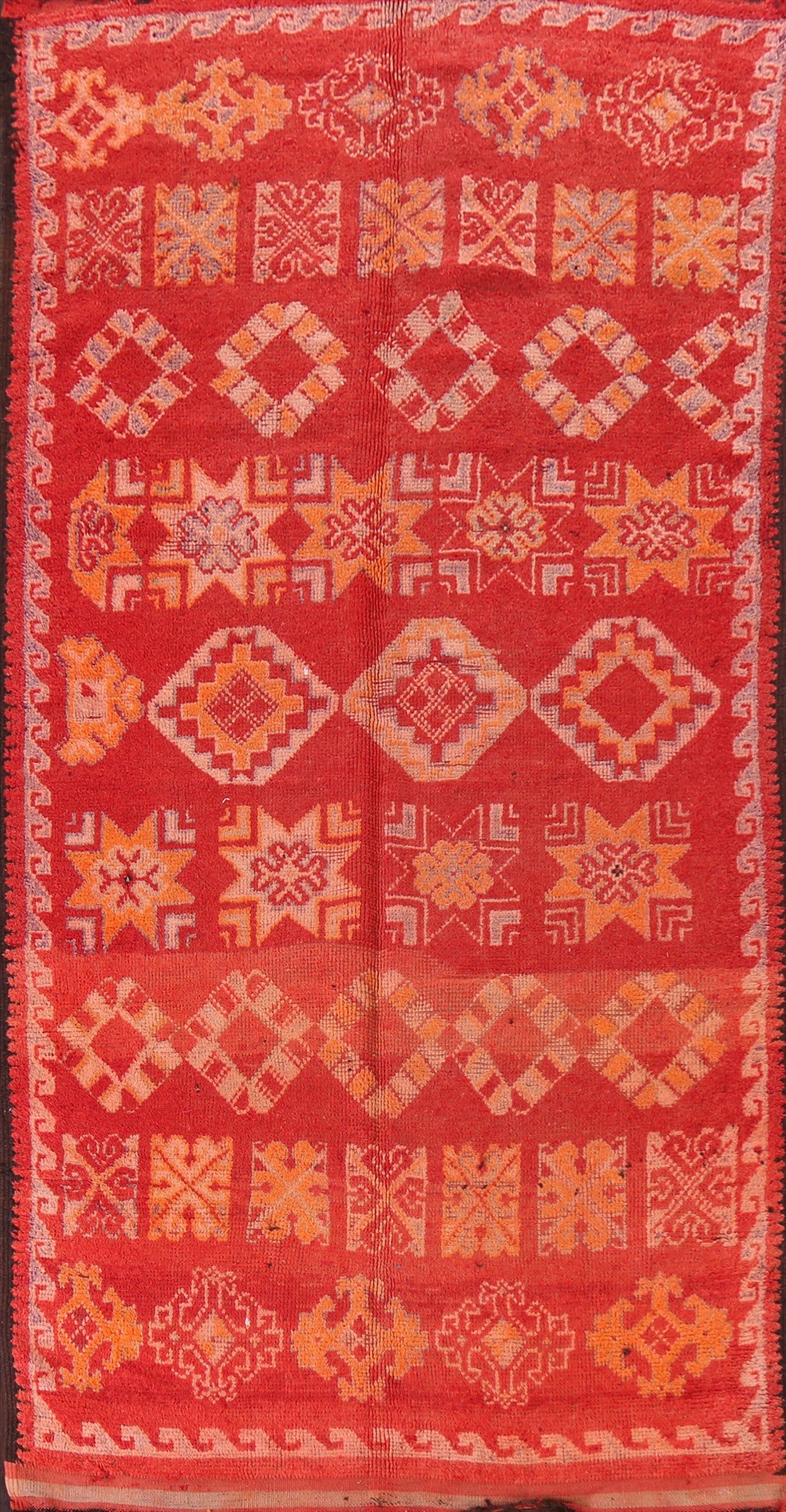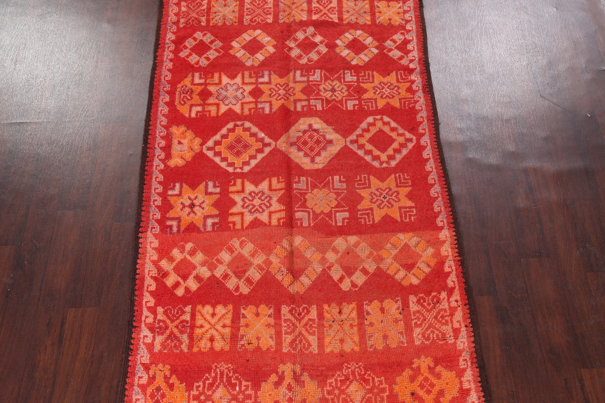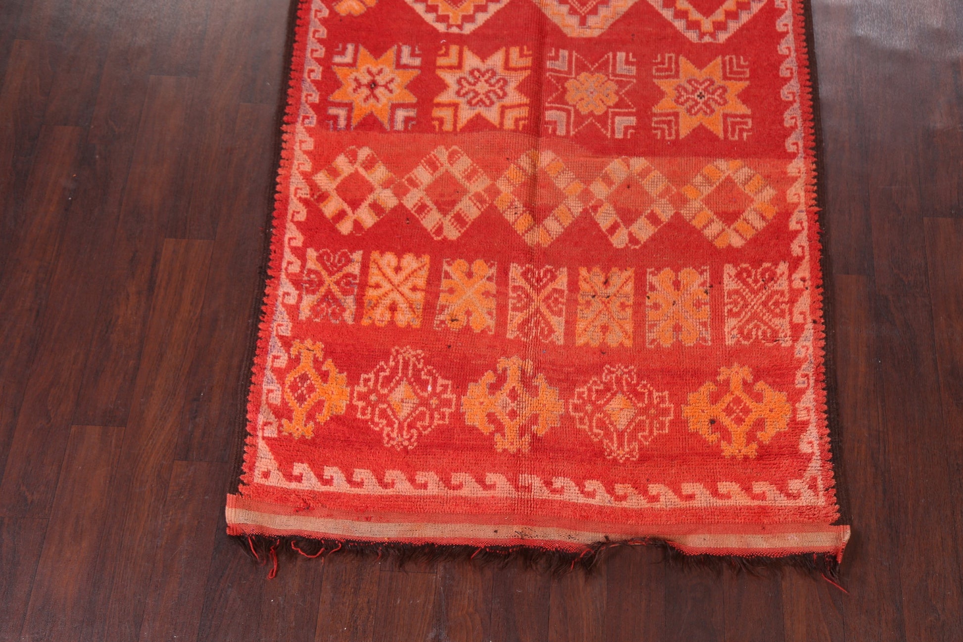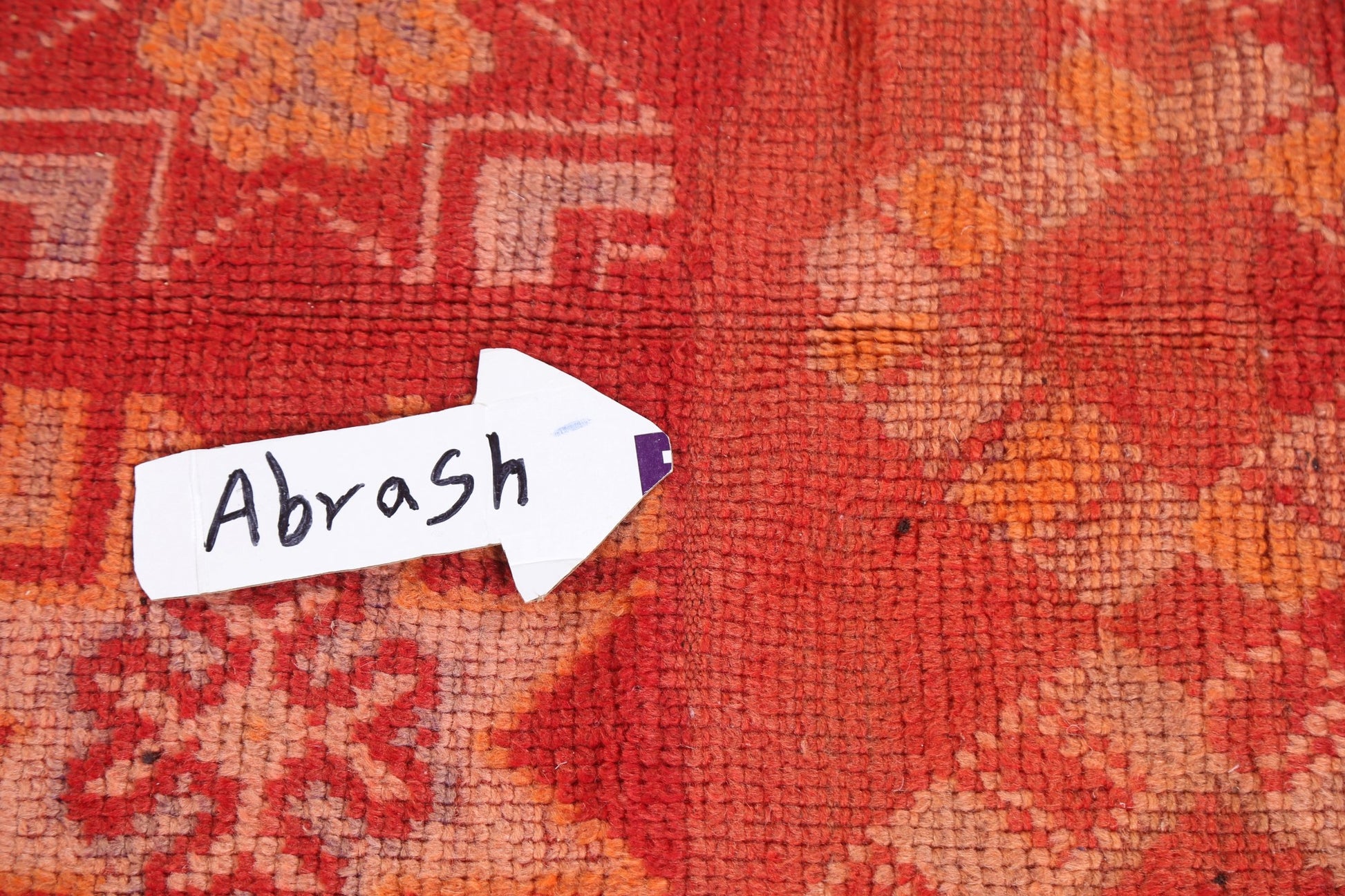 A Beautiful Genuine Morocco Moroccan rug is Hand Knotted by skillful weavers in Morocco with 100% Wool Material. This rug is in Very Good (Low Pile-Abrash) condition. dimensions are 10' 0'' X 4' 8'' in foot and 305 X 142 in centimeter. the primary color is Red.