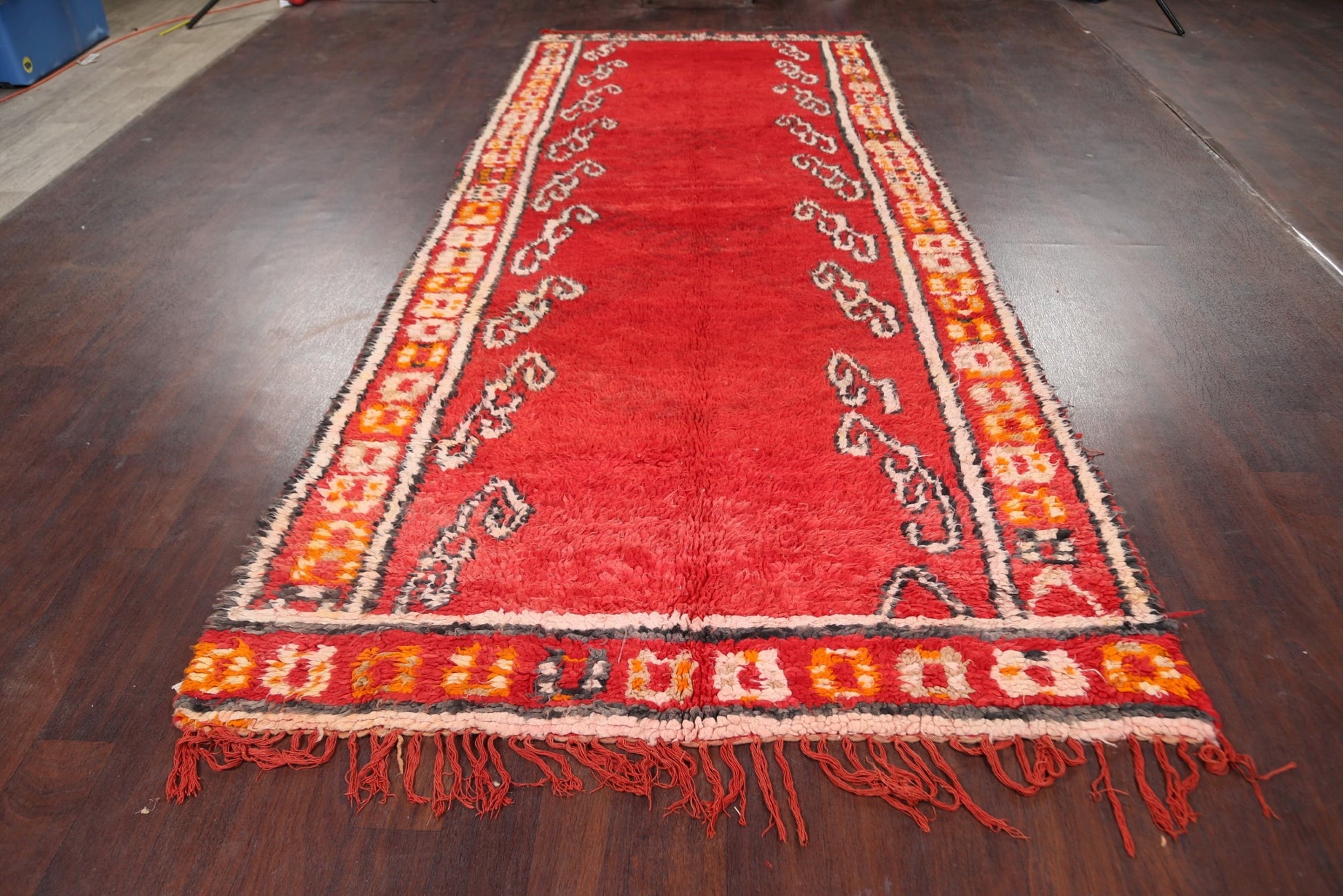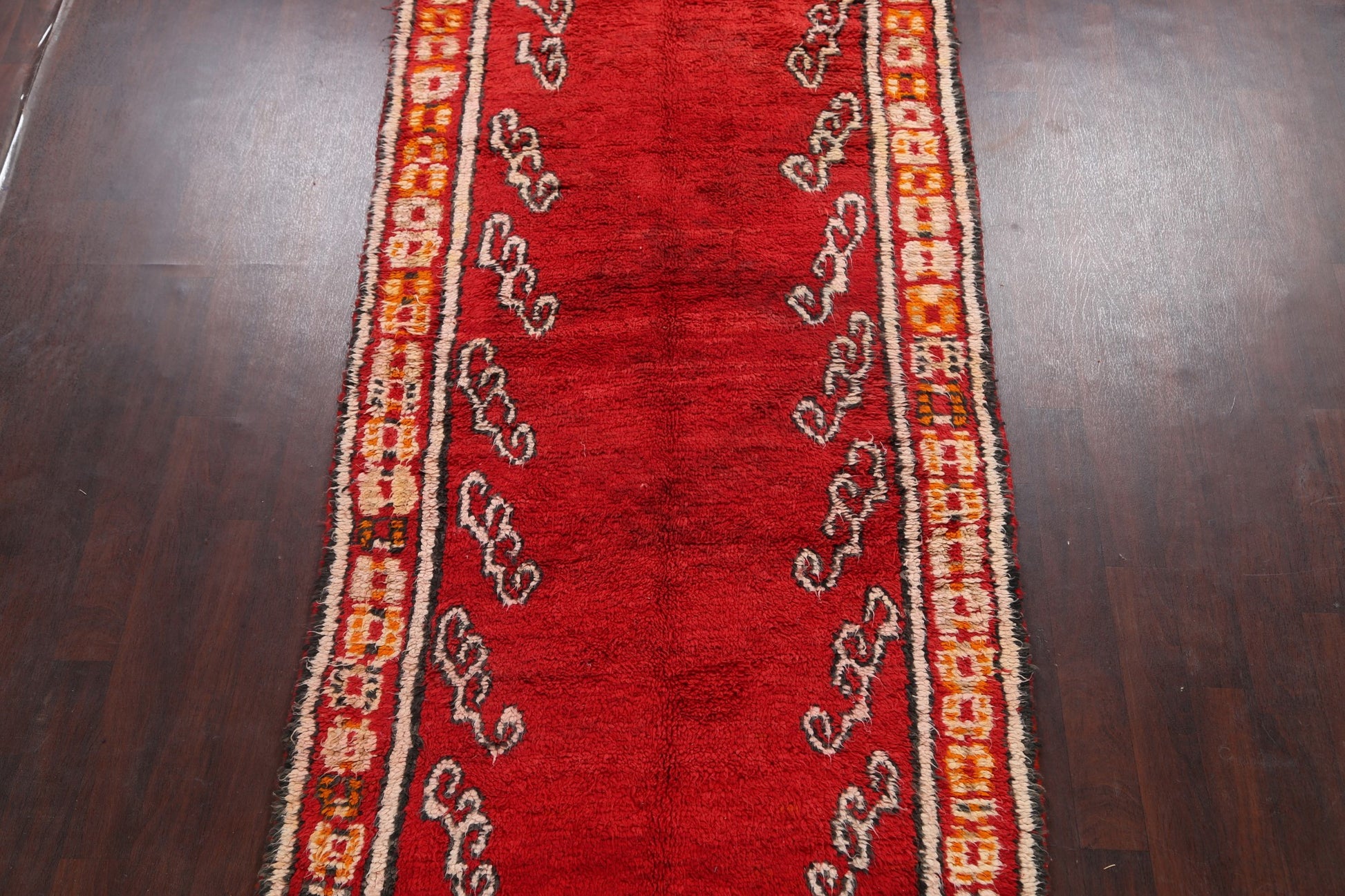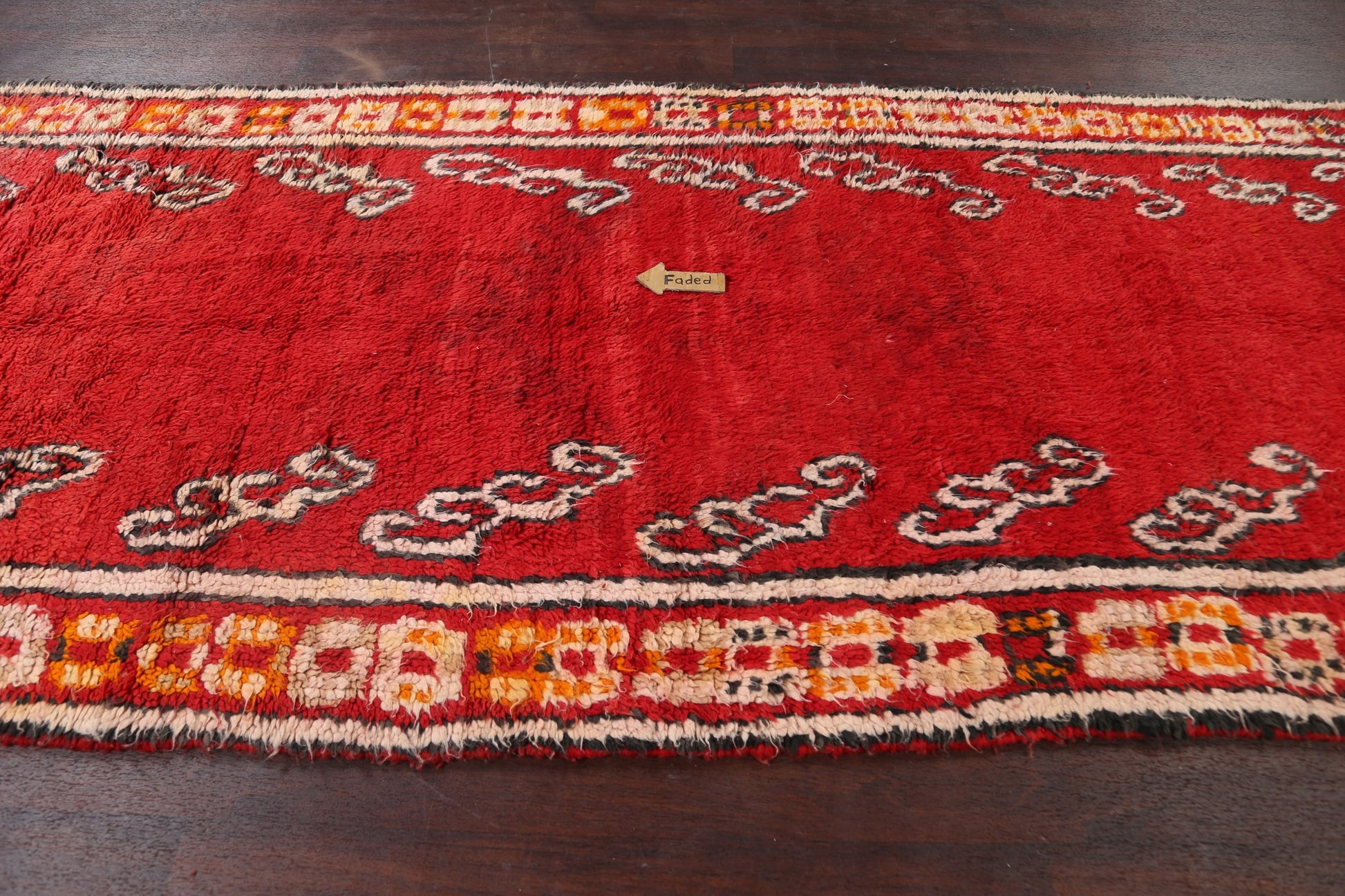 A Beautiful Genuine Morocco Moroccan rug is Hand Knotted by skillful weavers in Morocco with 100% Wool Material. This rug is in Very Good (Faded Color) condition. dimensions are 11' 7'' X 4' 10'' in foot and 353 X 147 in centimeter. the primary color is Red.