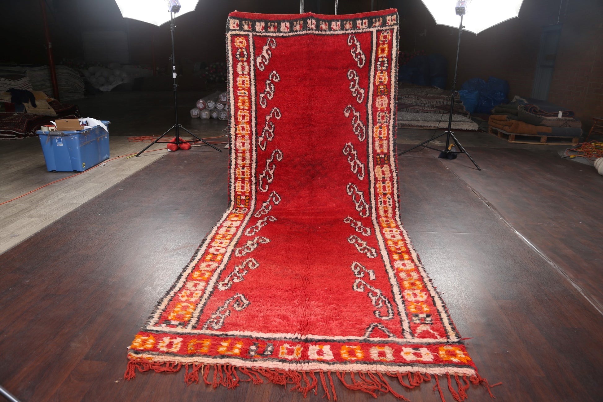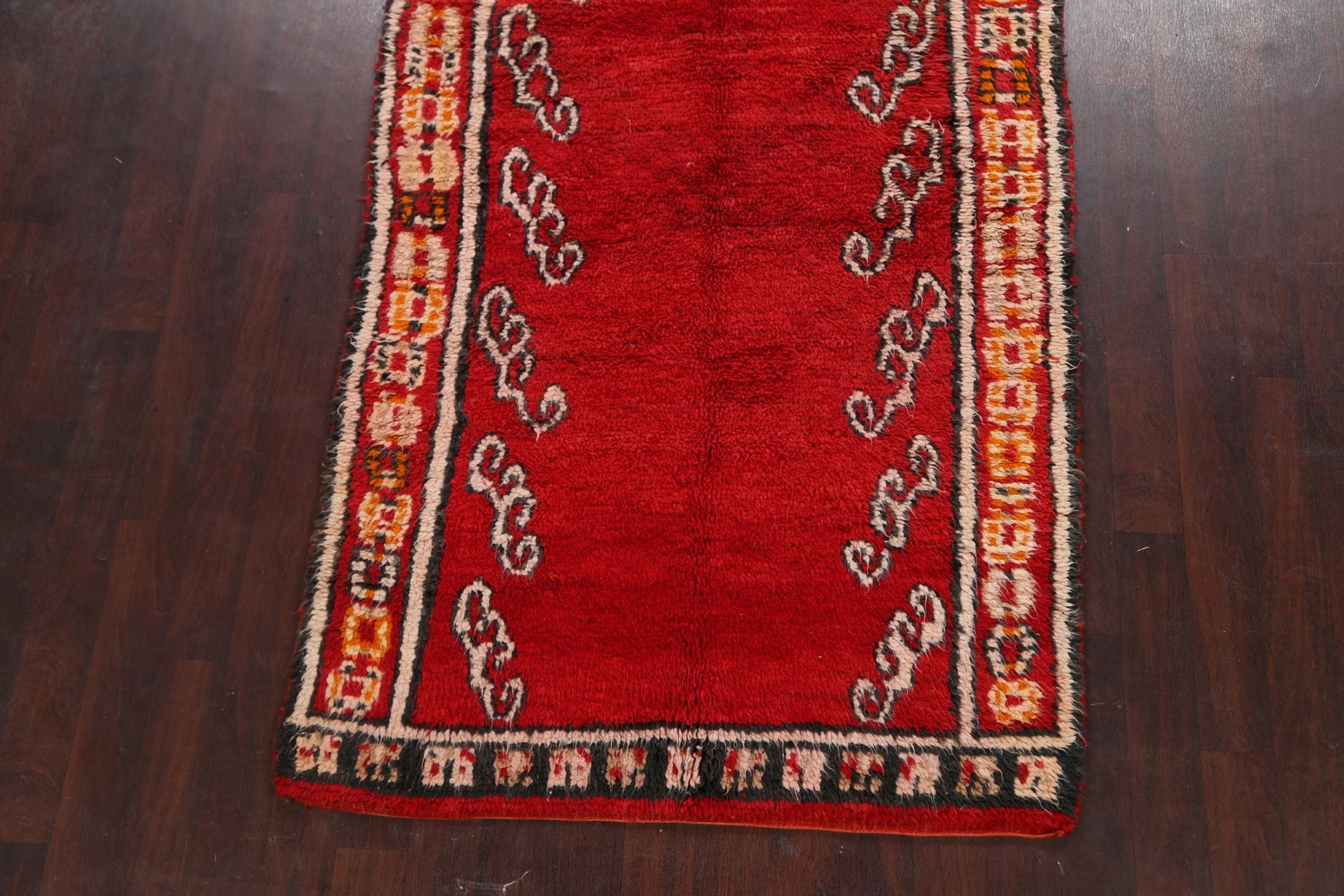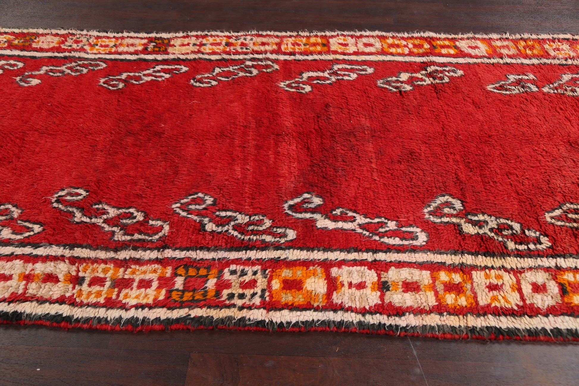 A Beautiful Genuine Morocco Moroccan rug is Hand Knotted by skillful weavers in Morocco with 100% Wool Material. This rug is in Very Good (Faded Color) condition. dimensions are 11' 7'' X 4' 10'' in foot and 353 X 147 in centimeter. the primary color is Red.
