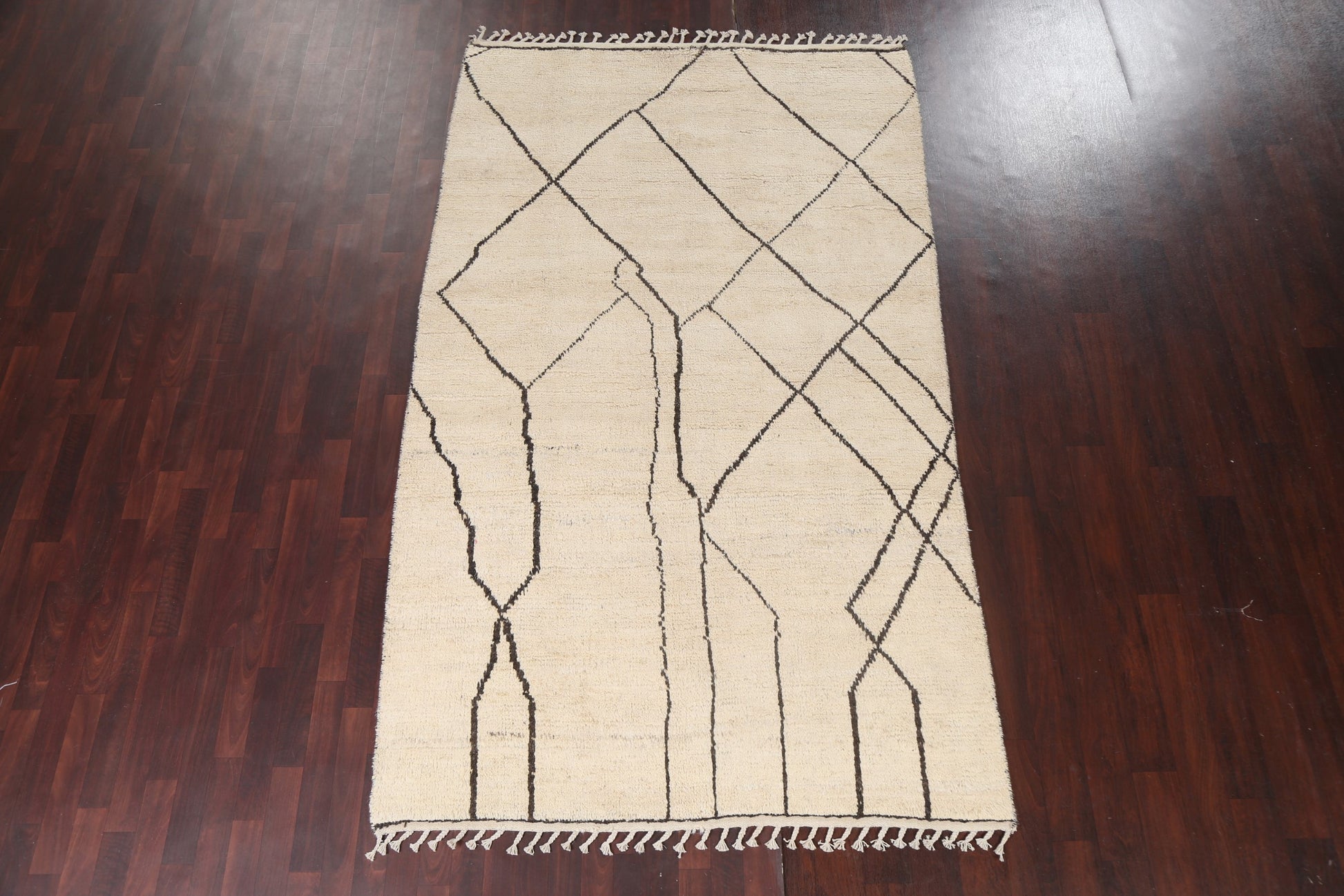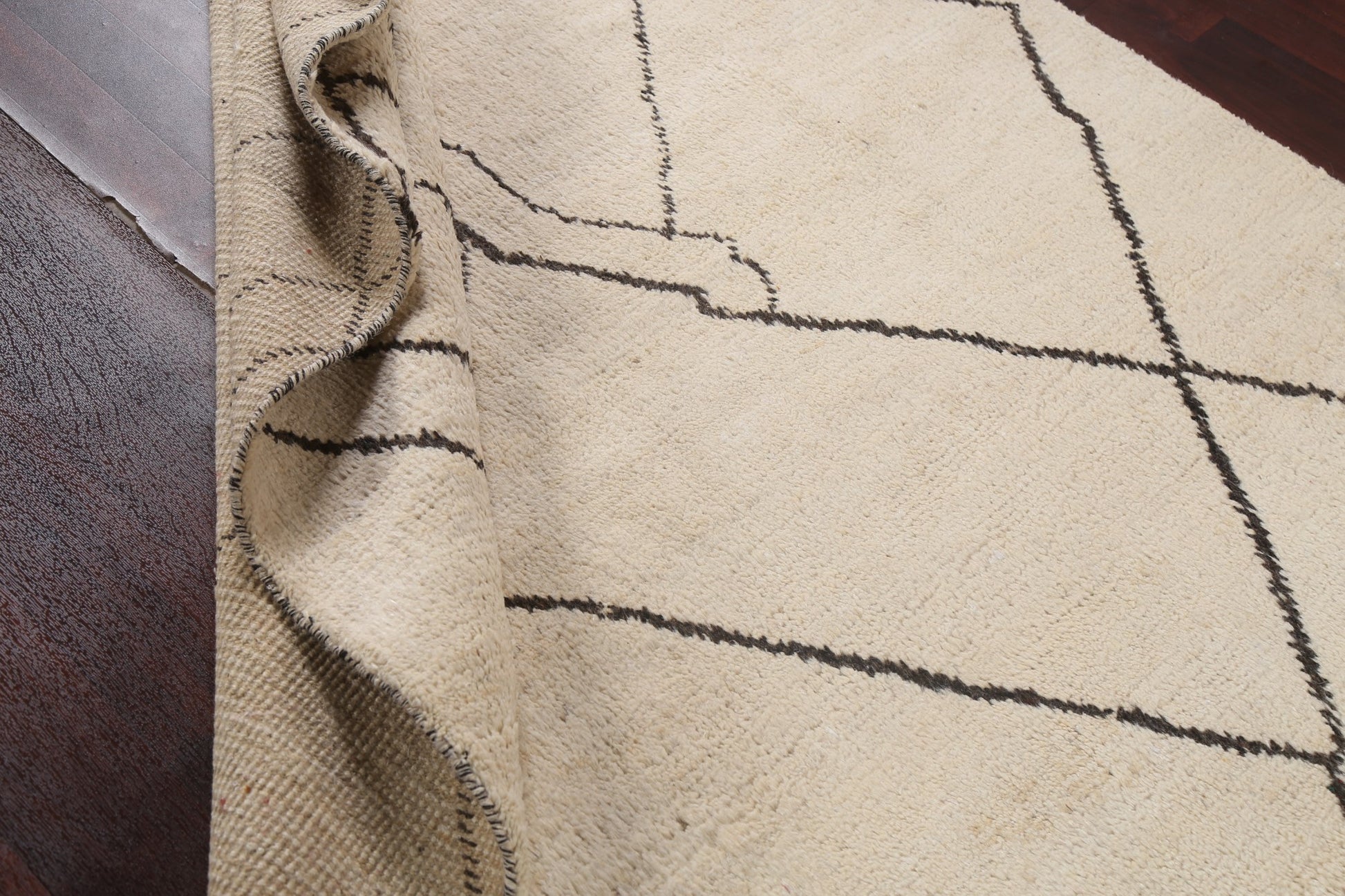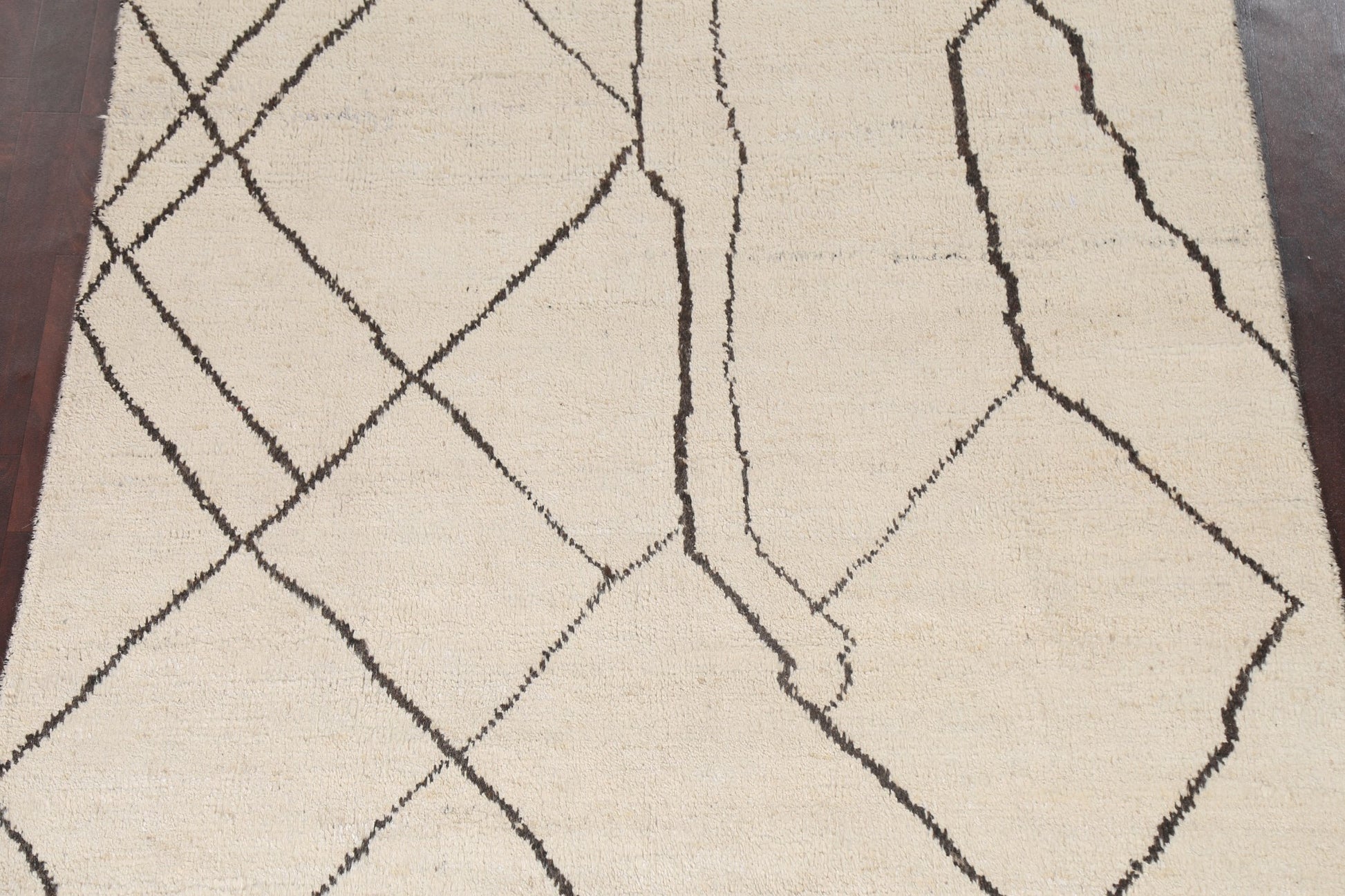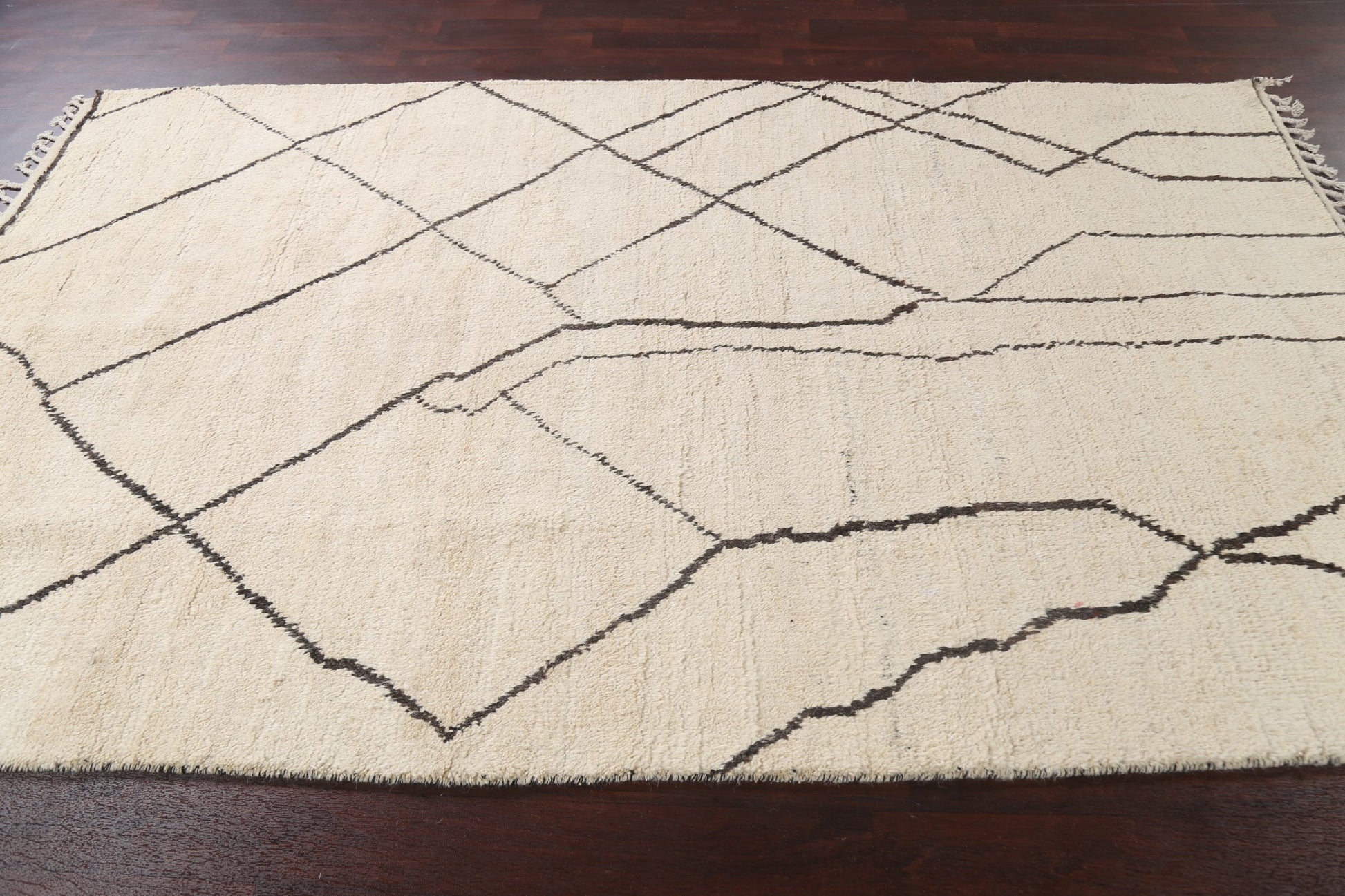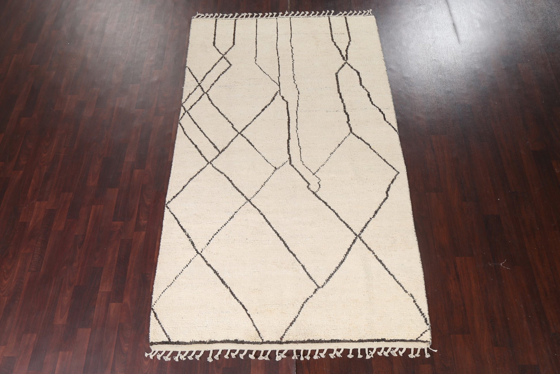 A Beautiful Genuine Pakistan Moroccan rug is Hand Knotted by skillful weavers in Pakistan with 100% Wool Material. This rug is in New, First Quality condition. dimensions are 9' 8'' X 5' 9'' in foot and 295 X 175 in centimeter. the primary color is Beige & Ivories.