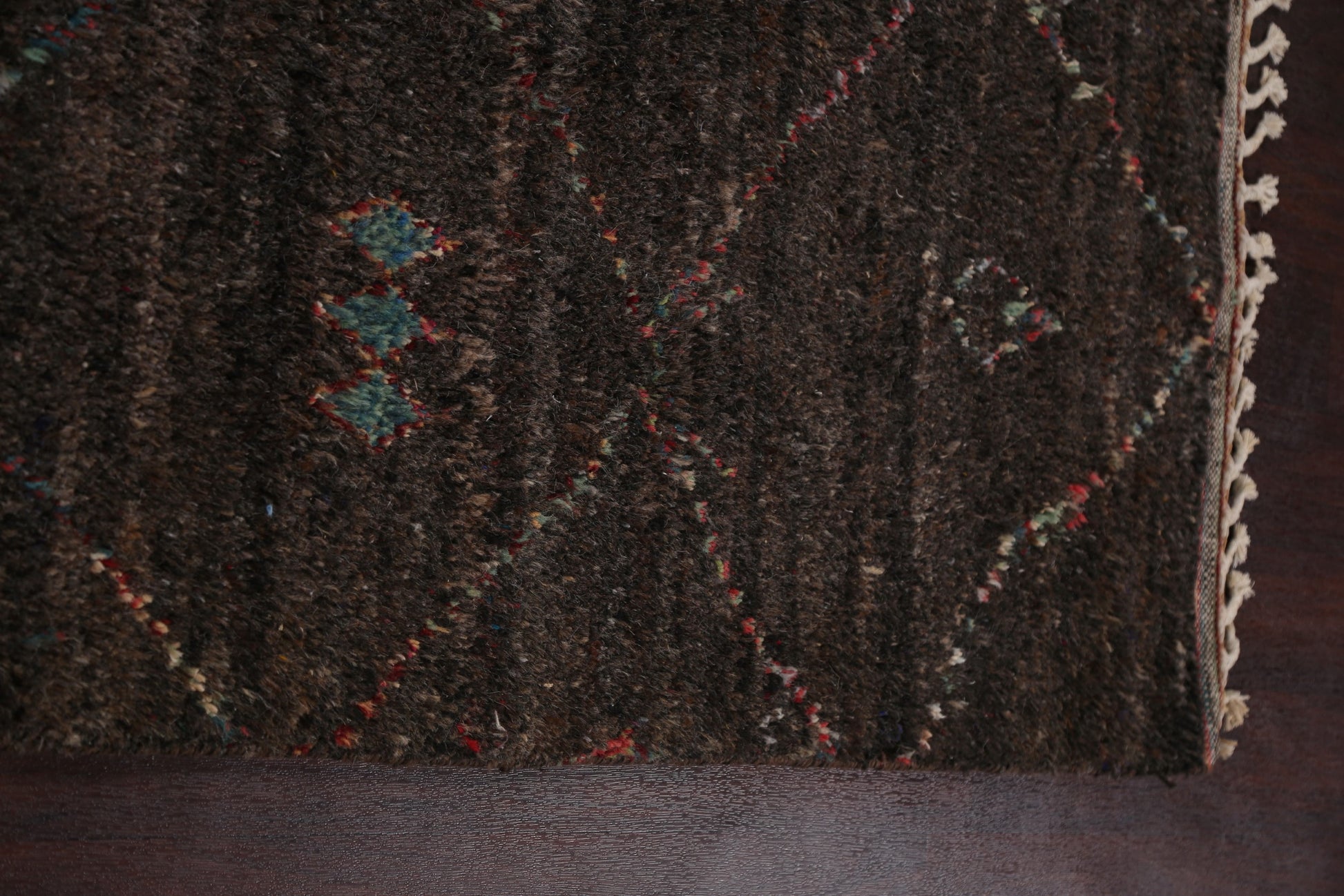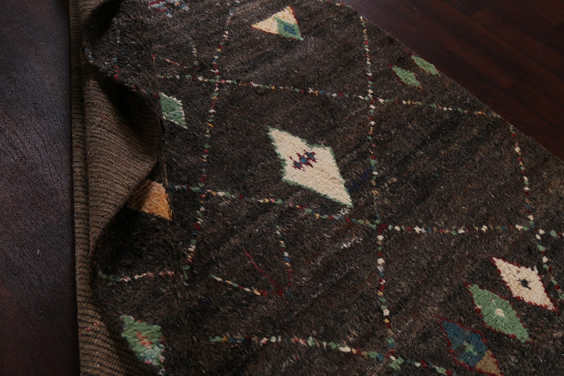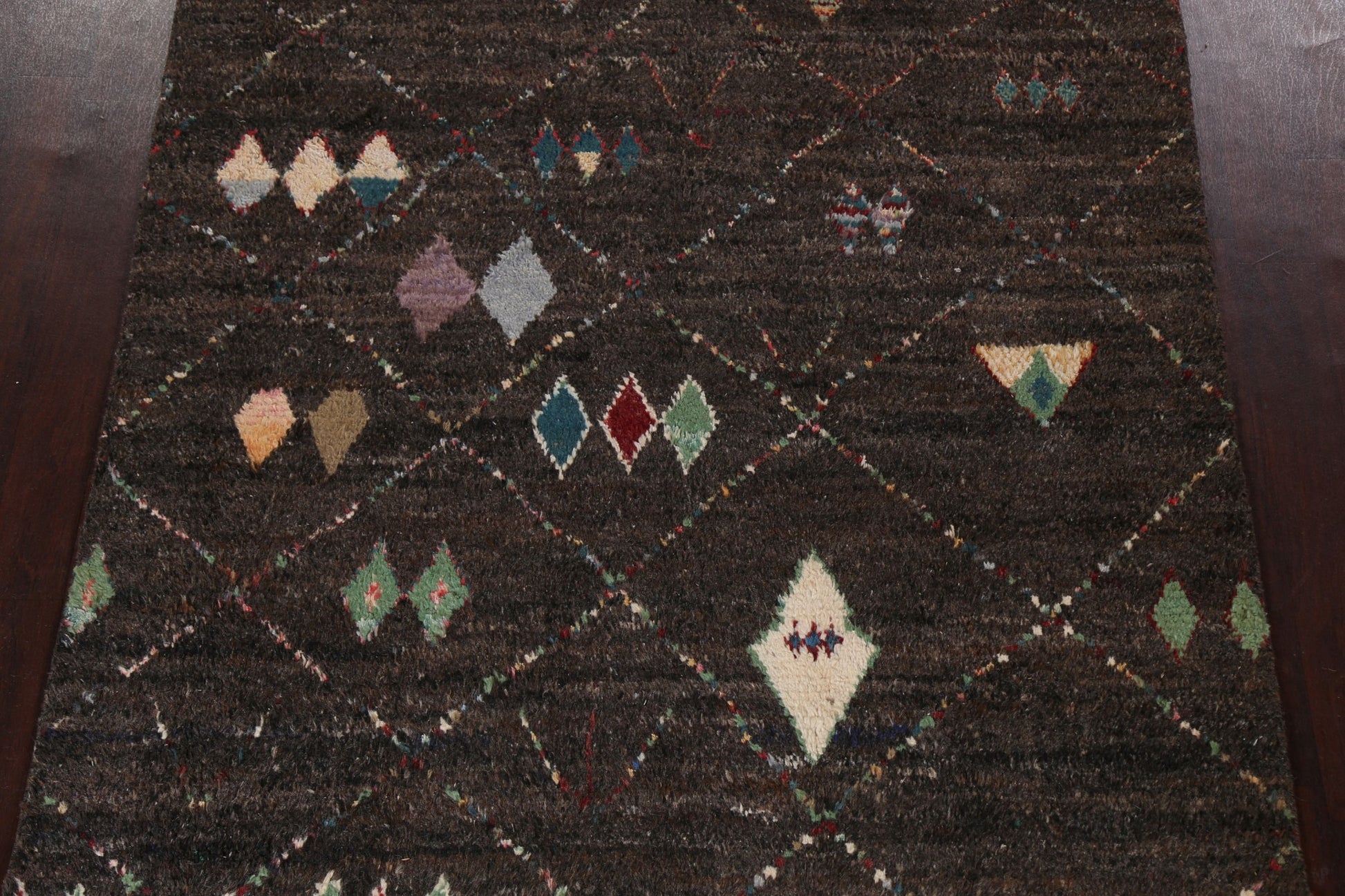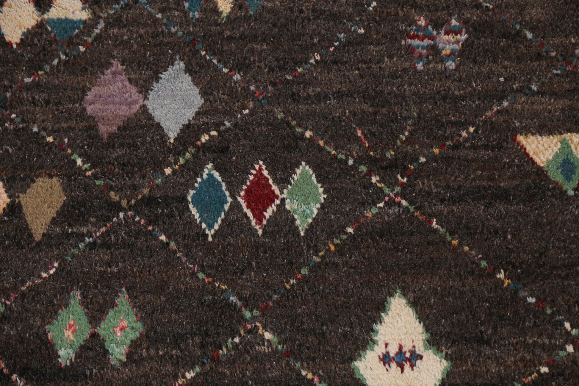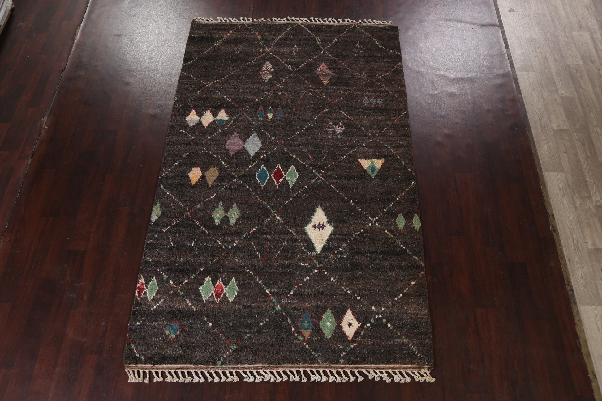A Beautiful Genuine Morocco Moroccan rug is Hand Knotted by skillful weavers in Morocco with 100% Wool Material. This rug is in New, First Quality condition. dimensions are 9' 9'' X 6' 0'' in foot and 297 X 183 in centimeter. the primary color is Black.
