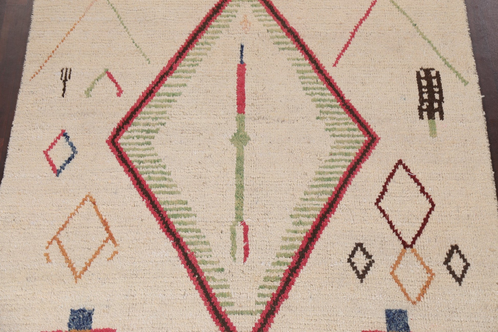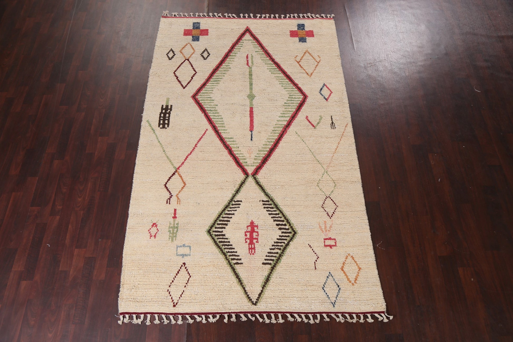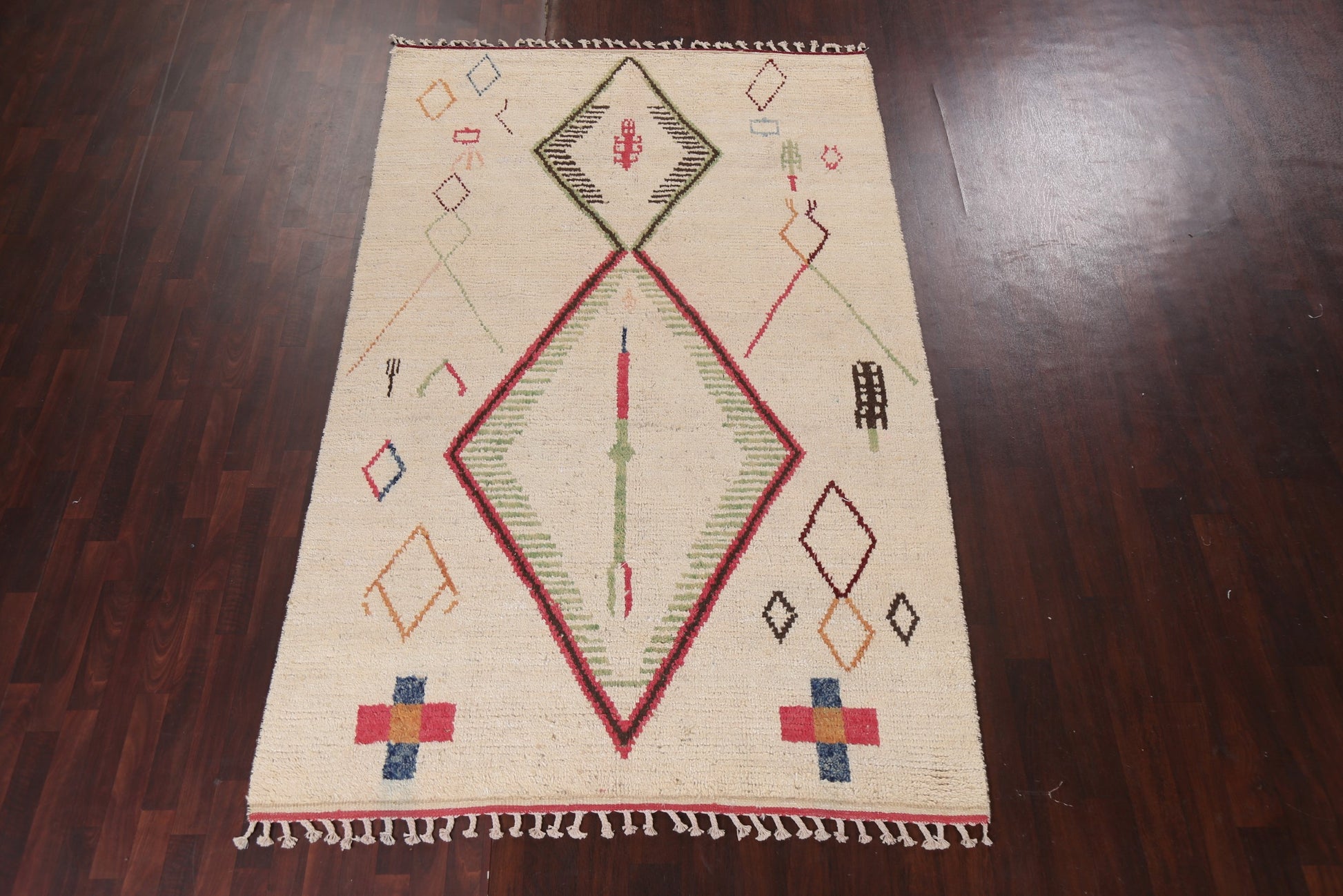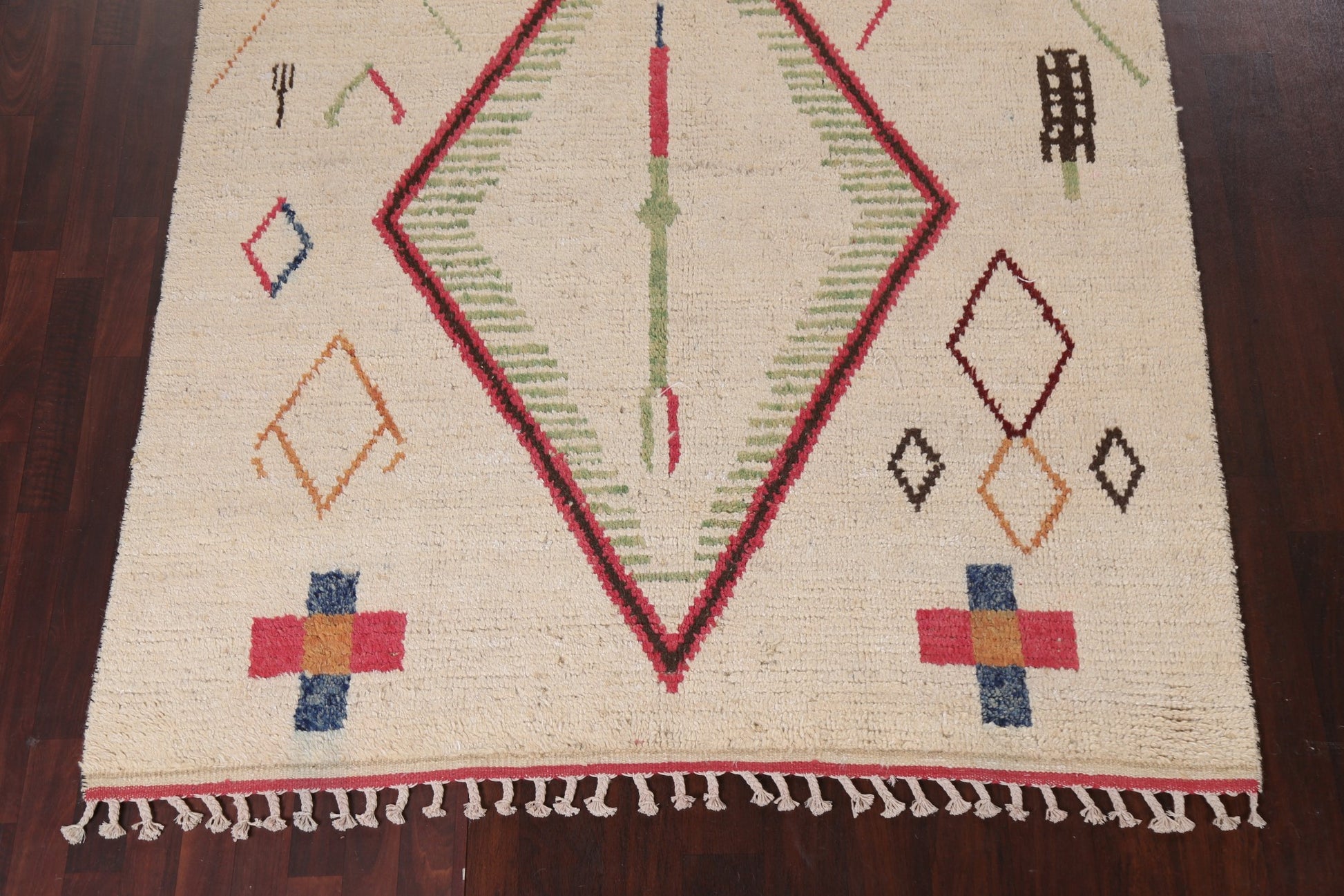 A Beautiful Genuine Morocco Moroccan rug is Hand Knotted by skillful weavers in Morocco with 100% Wool Material. This rug is in New, First Quality condition. dimensions are 9' 9'' X 6' 1'' in foot and 297 X 185 in centimeter. the primary color is Beige & Ivories.