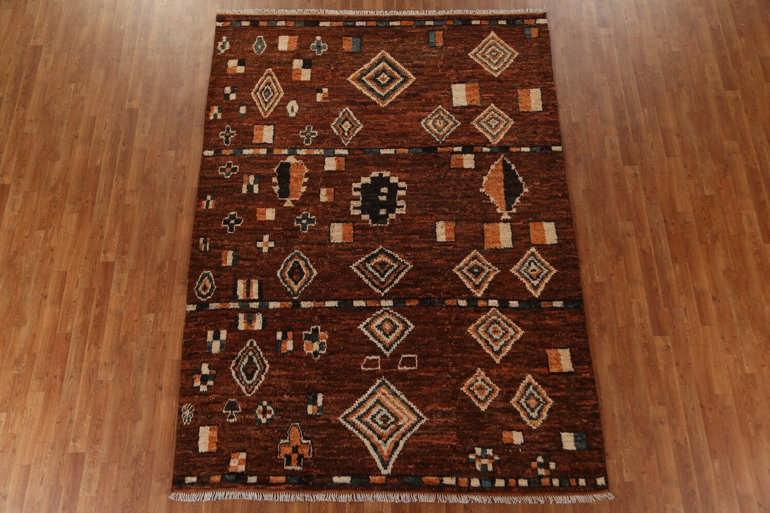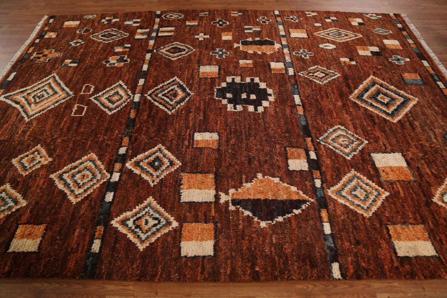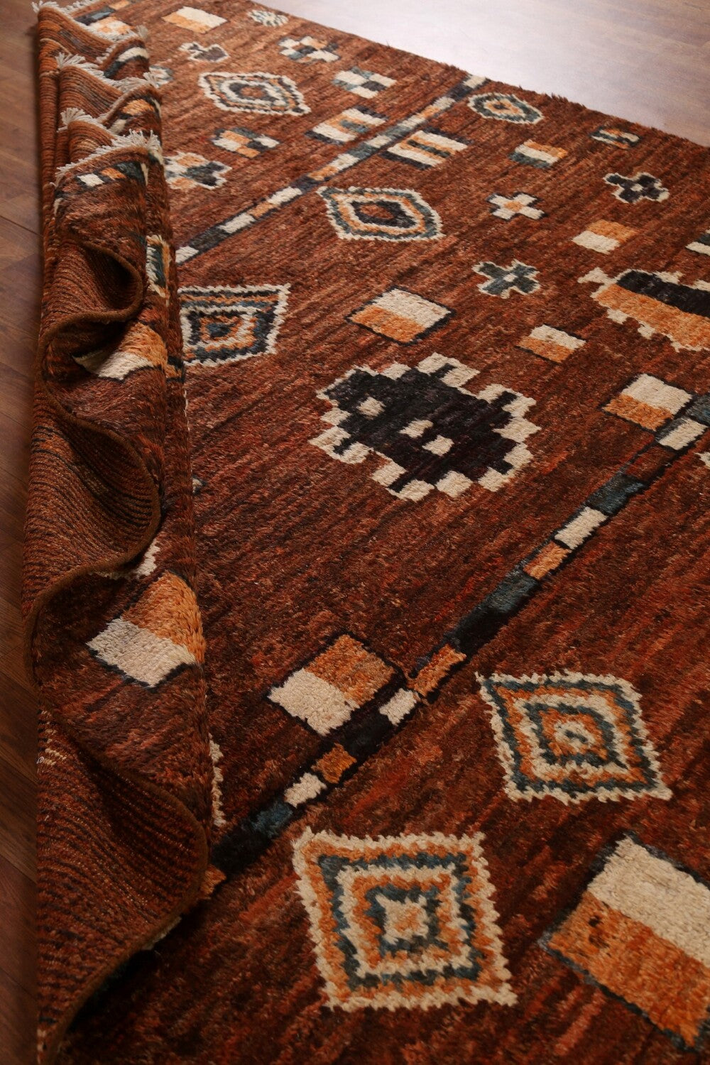 A Beautiful Genuine Pakistan Moroccan rug is Hand Knotted by skillful weavers in Pakistan with 100% Wool Material. This rug is in condition. dimensions are 9' 6'' X 6' 9'' in foot and 290 X 206 in centimeter. the primary color is Brown.