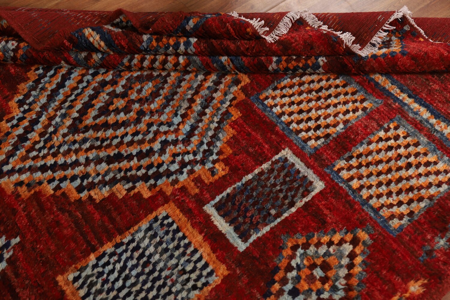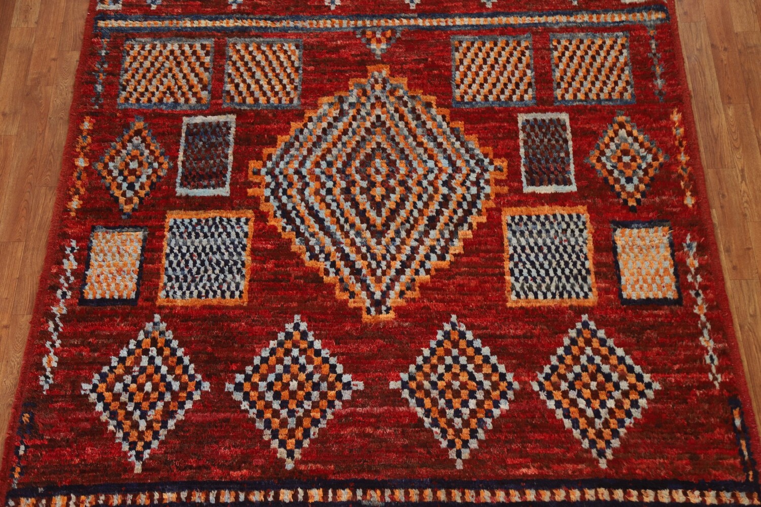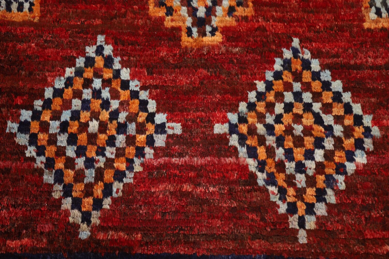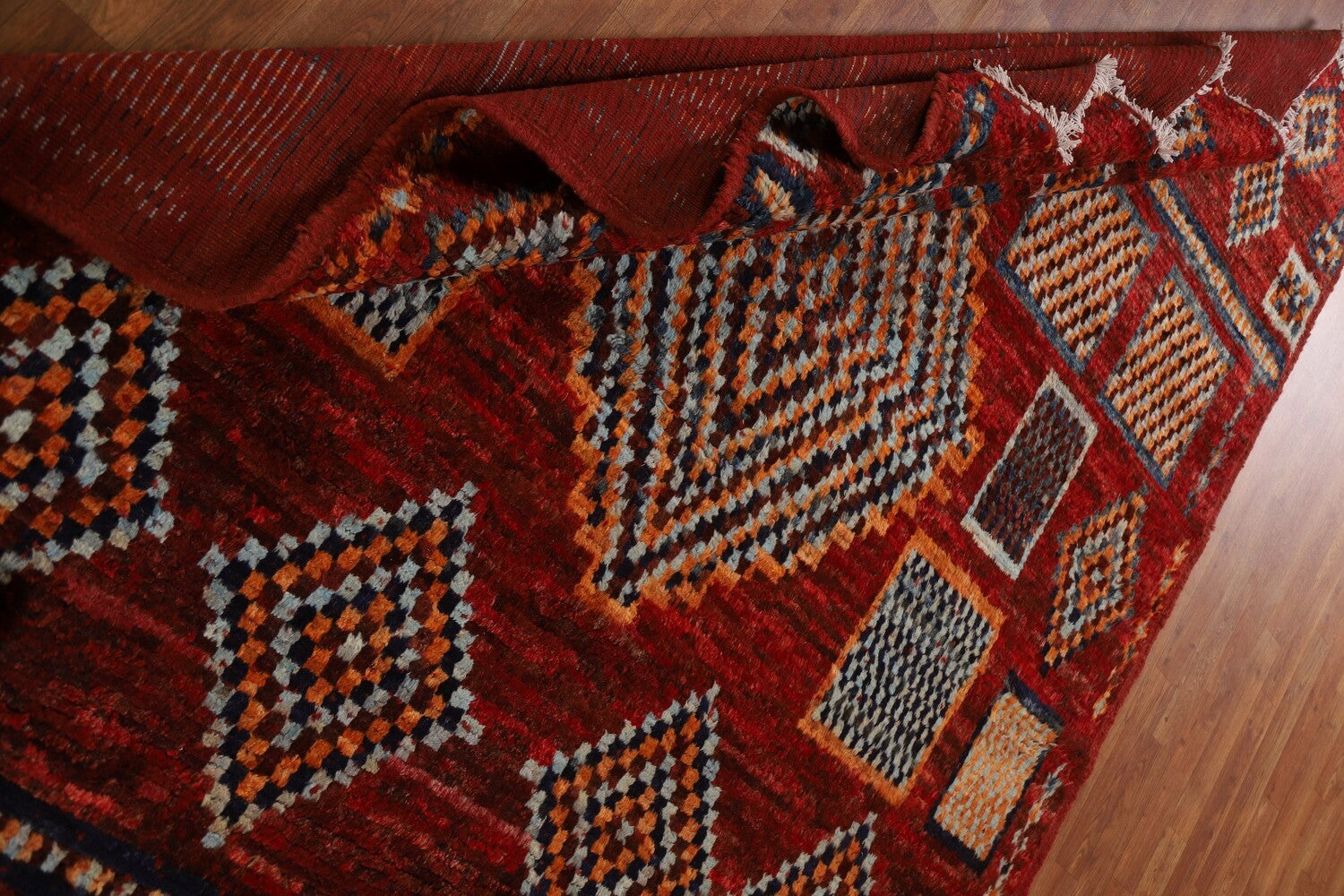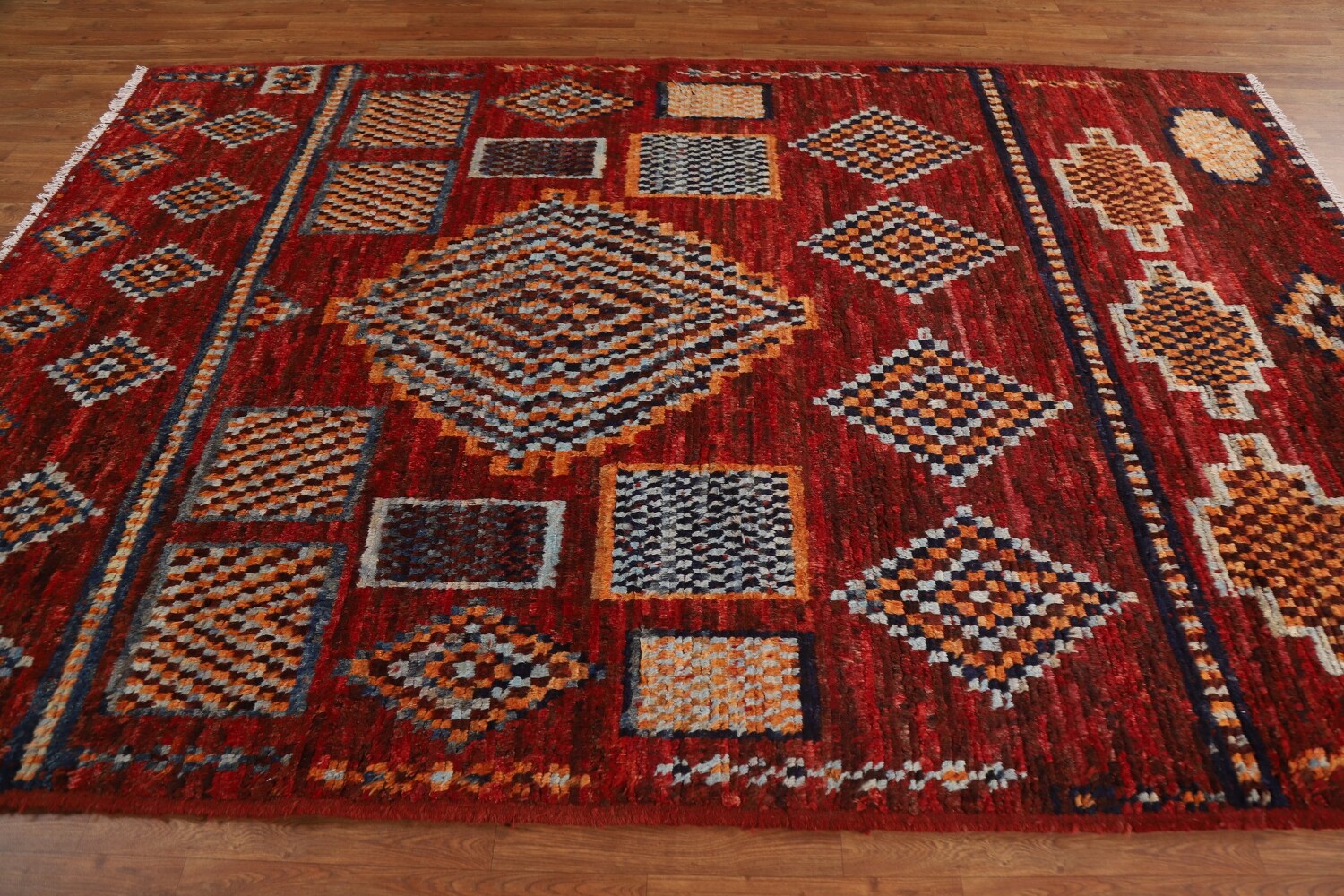 A Beautiful Genuine Pakistan Moroccan rug is Hand Knotted by skillful weavers in Pakistan with 100% Wool Material. This rug is in condition. dimensions are 9' 7'' X 6' 7'' in foot and 292 X 201 in centimeter. the primary color is Red.
