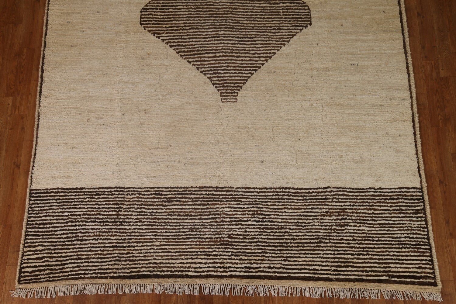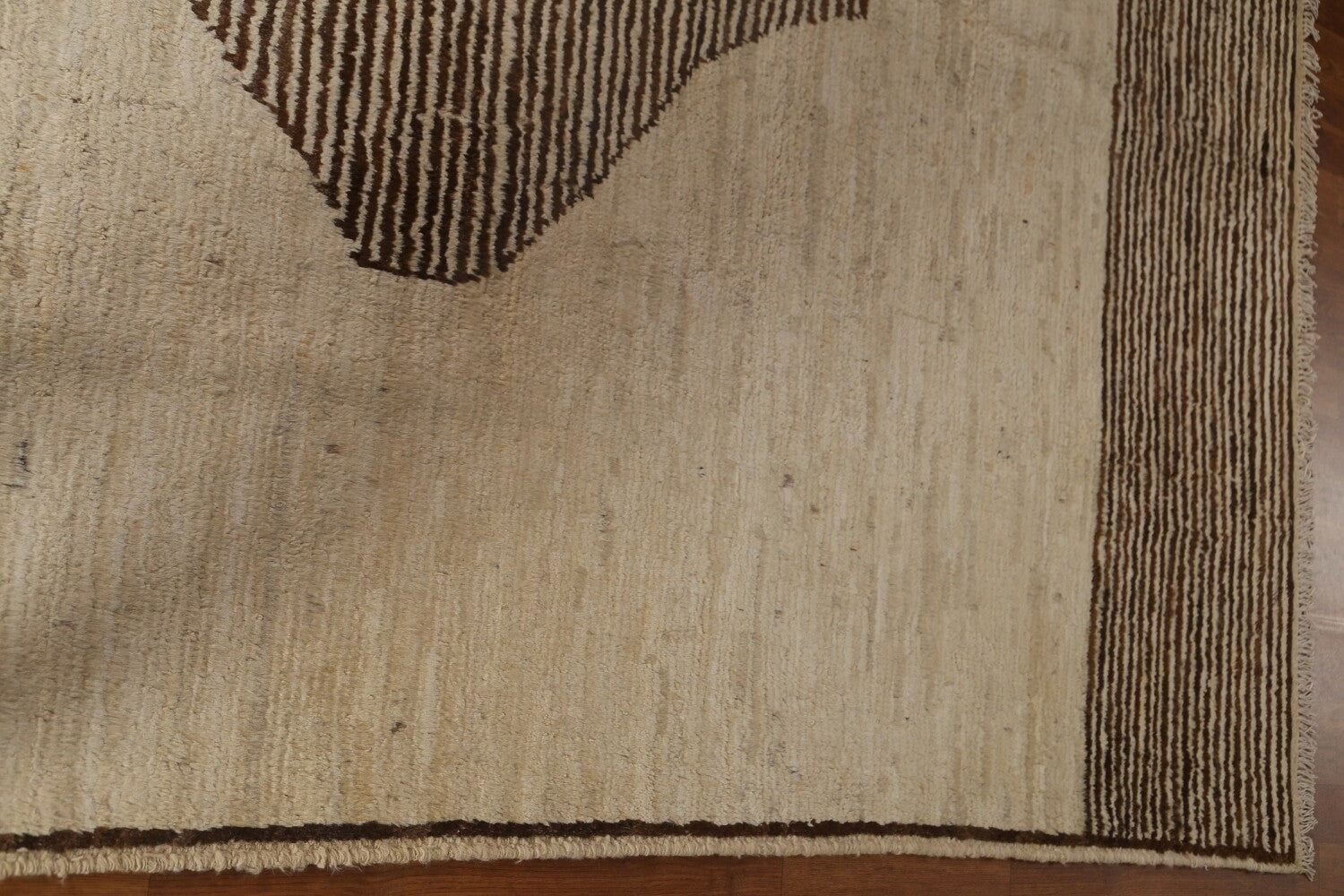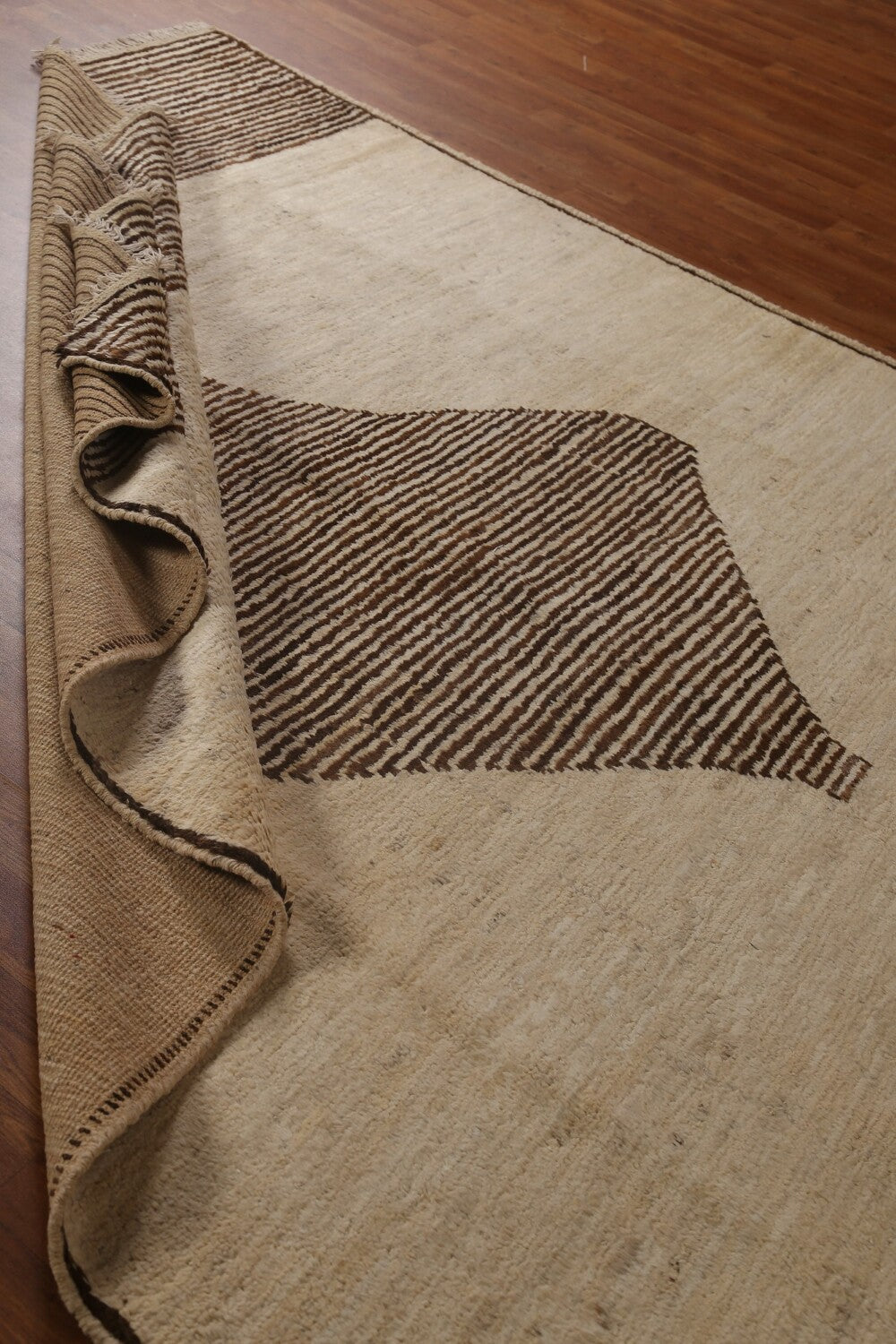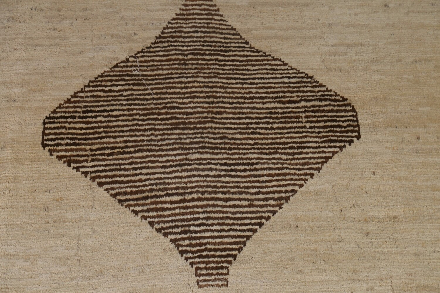 A Beautiful Genuine Pakistan Moroccan rug is Hand Knotted by skillful weavers in Pakistan with 100% Wool Material. This rug is in condition. dimensions are 9' 10'' X 6' 9'' in foot and 300 X 206 in centimeter. the primary color is Beige & Ivories.