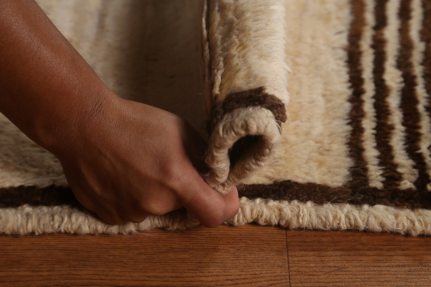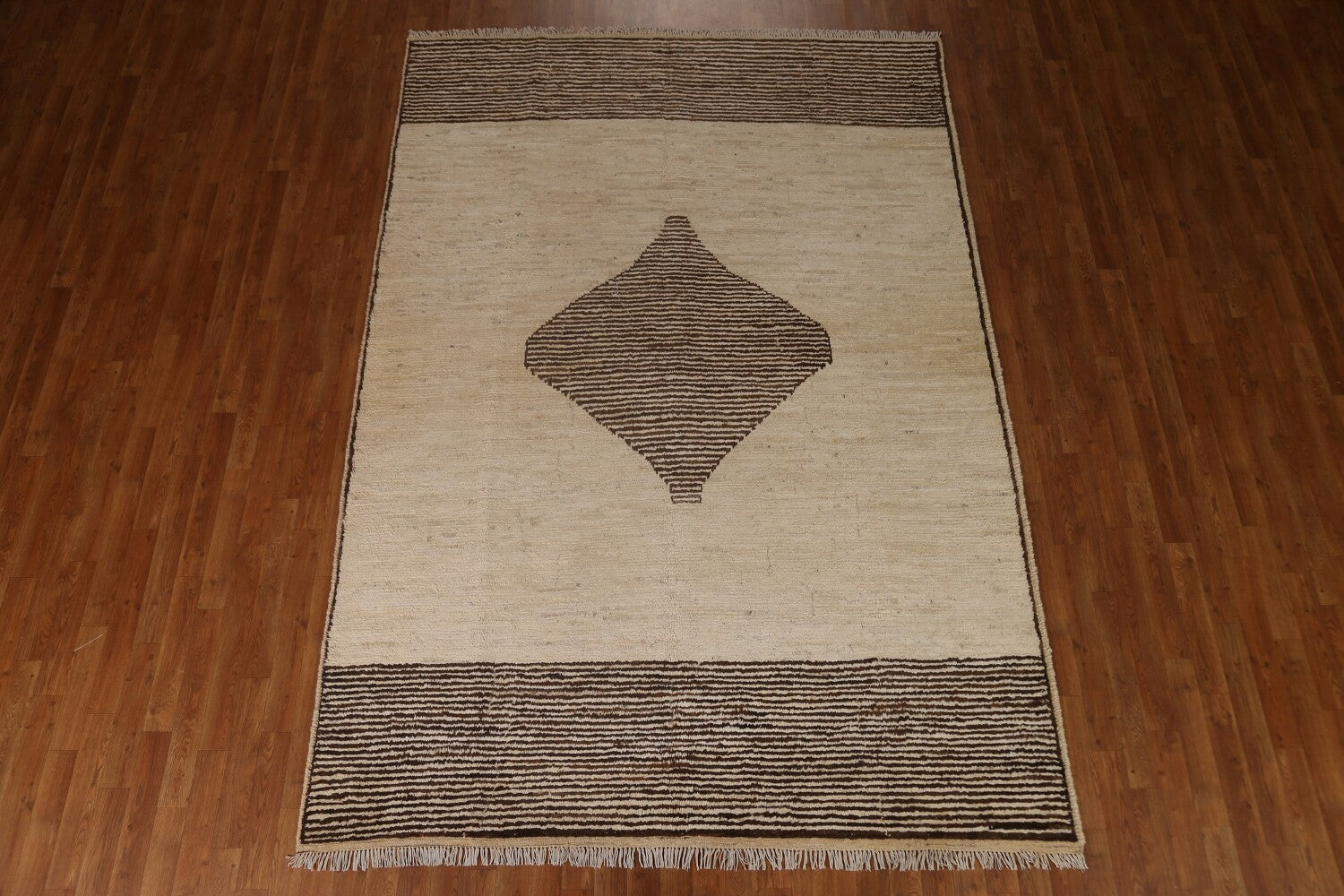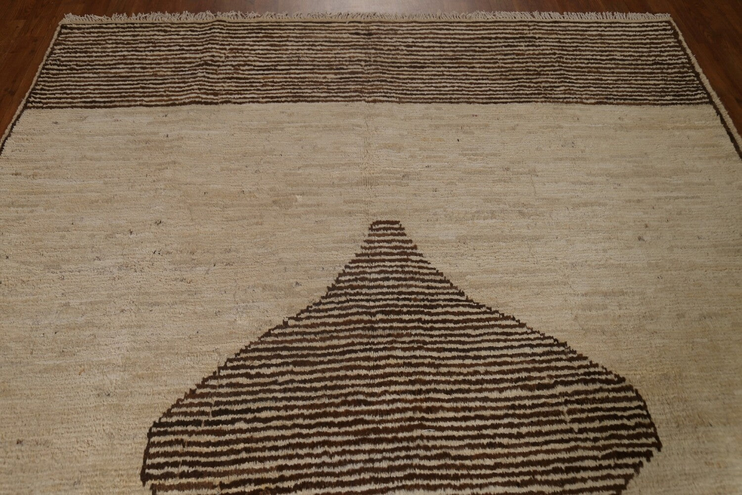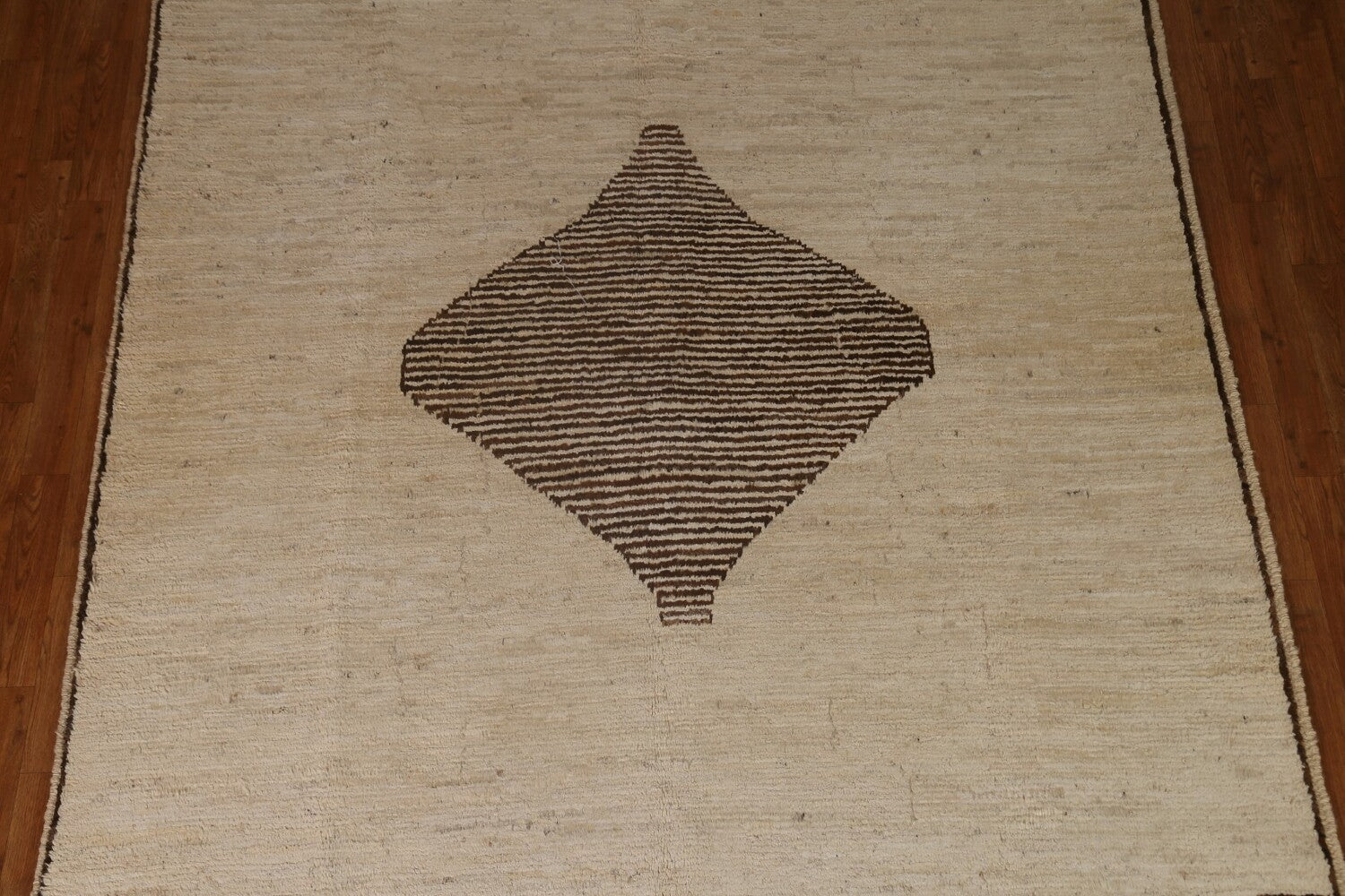 A Beautiful Genuine Pakistan Moroccan rug is Hand Knotted by skillful weavers in Pakistan with 100% Wool Material. This rug is in condition. dimensions are 9' 10'' X 6' 9'' in foot and 300 X 206 in centimeter. the primary color is Beige & Ivories.