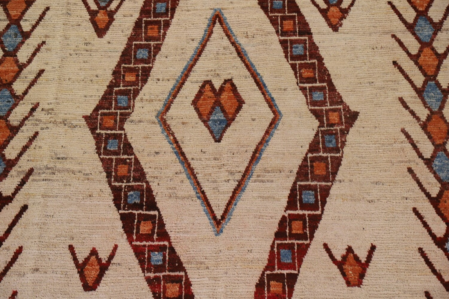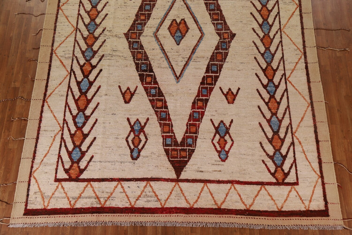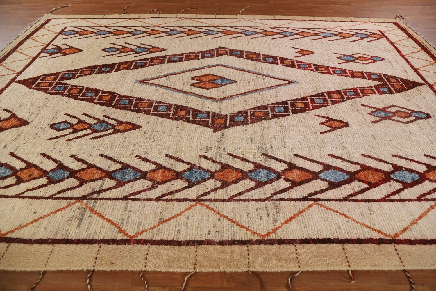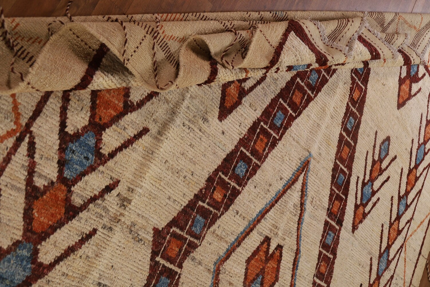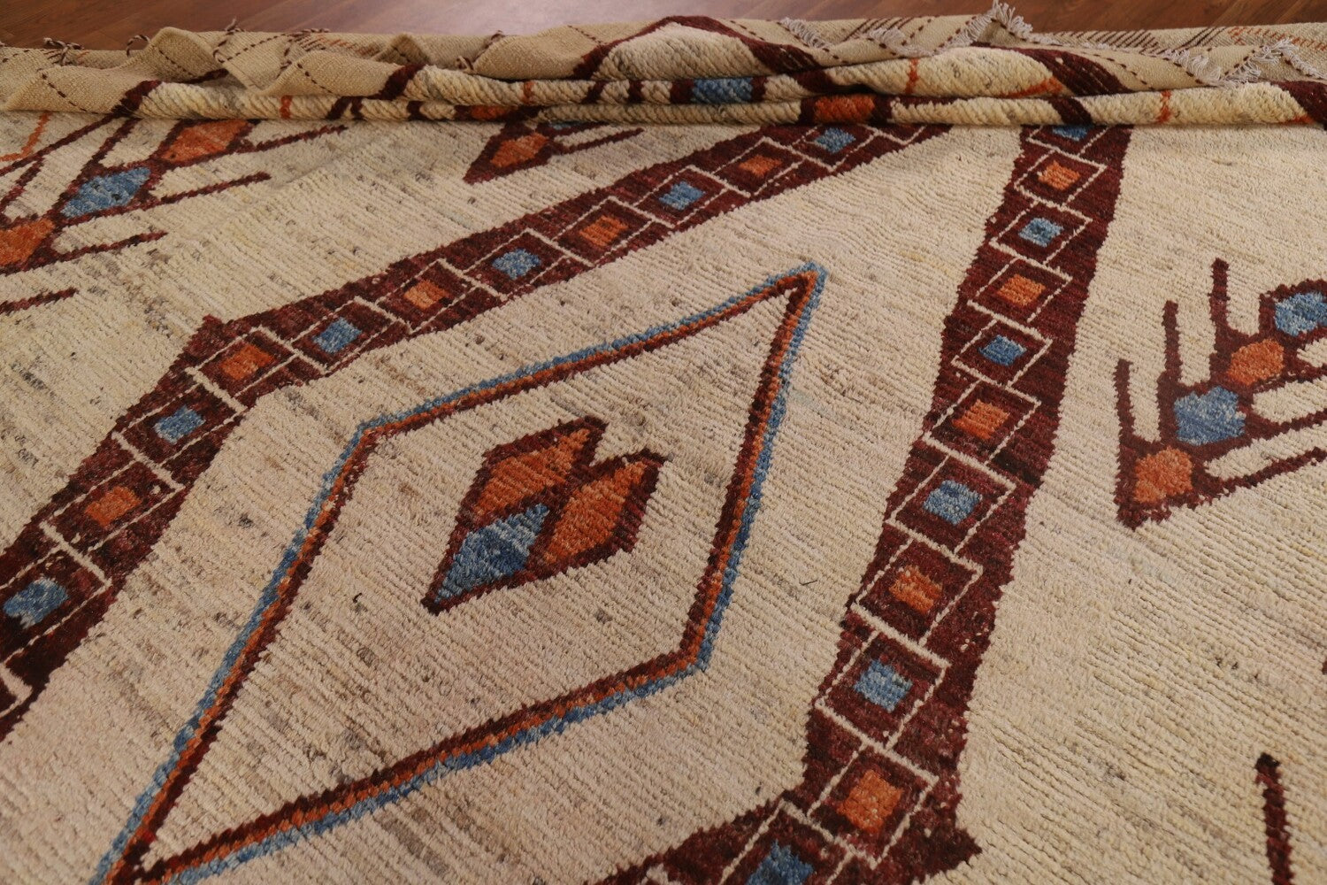 A Beautiful Genuine Pakistan Moroccan rug is Hand Knotted by skillful weavers in Pakistan with 100% Wool Material. This rug is in New, First Quality condition. dimensions are 12' 9'' X 9' 5'' in foot and 389 X 287 in centimeter. the primary color is Beige & Ivories.